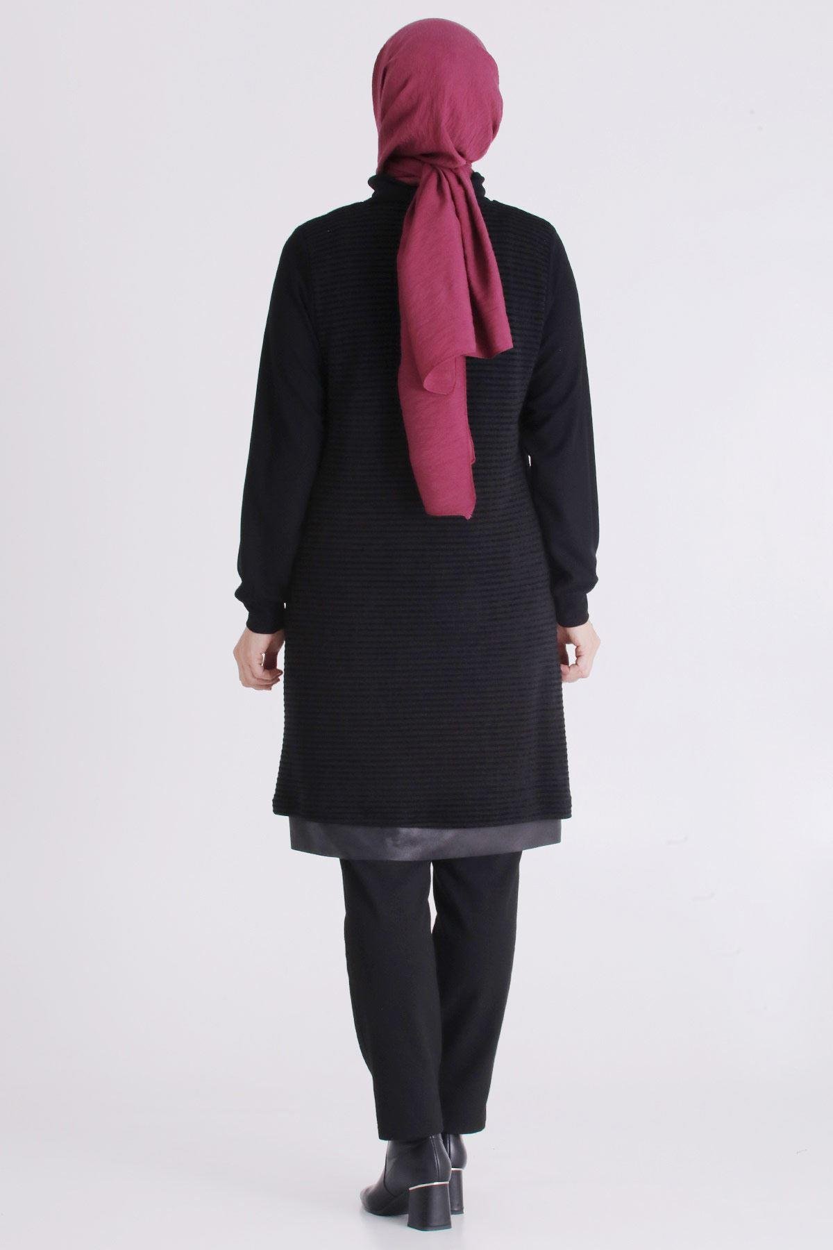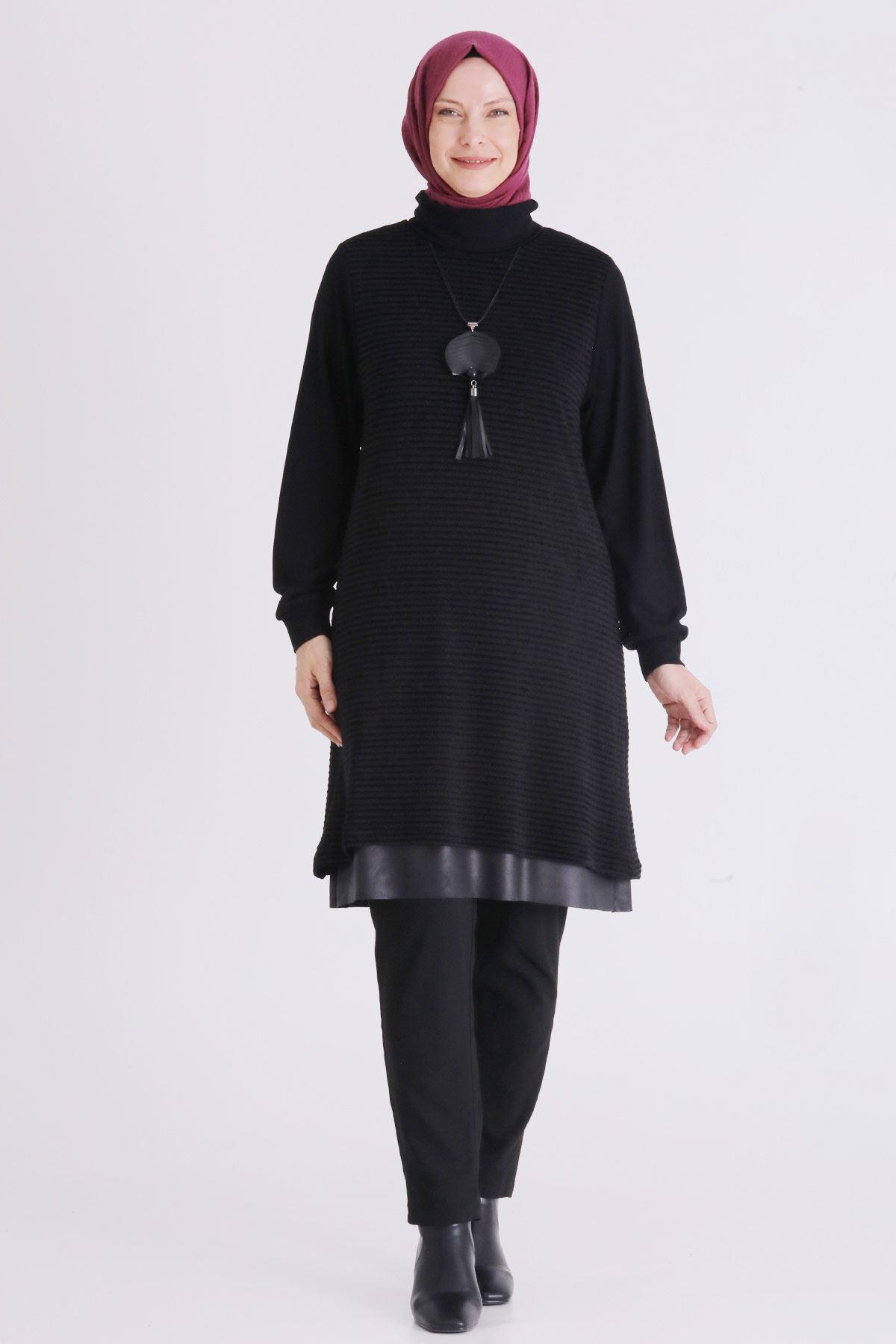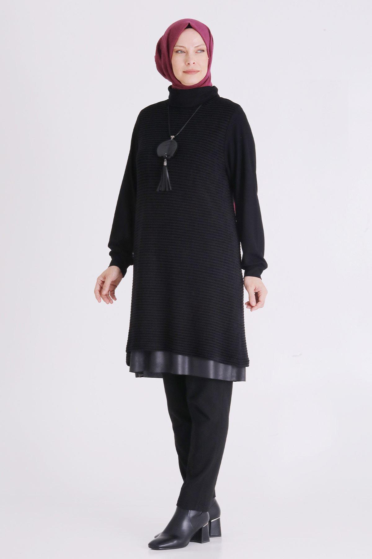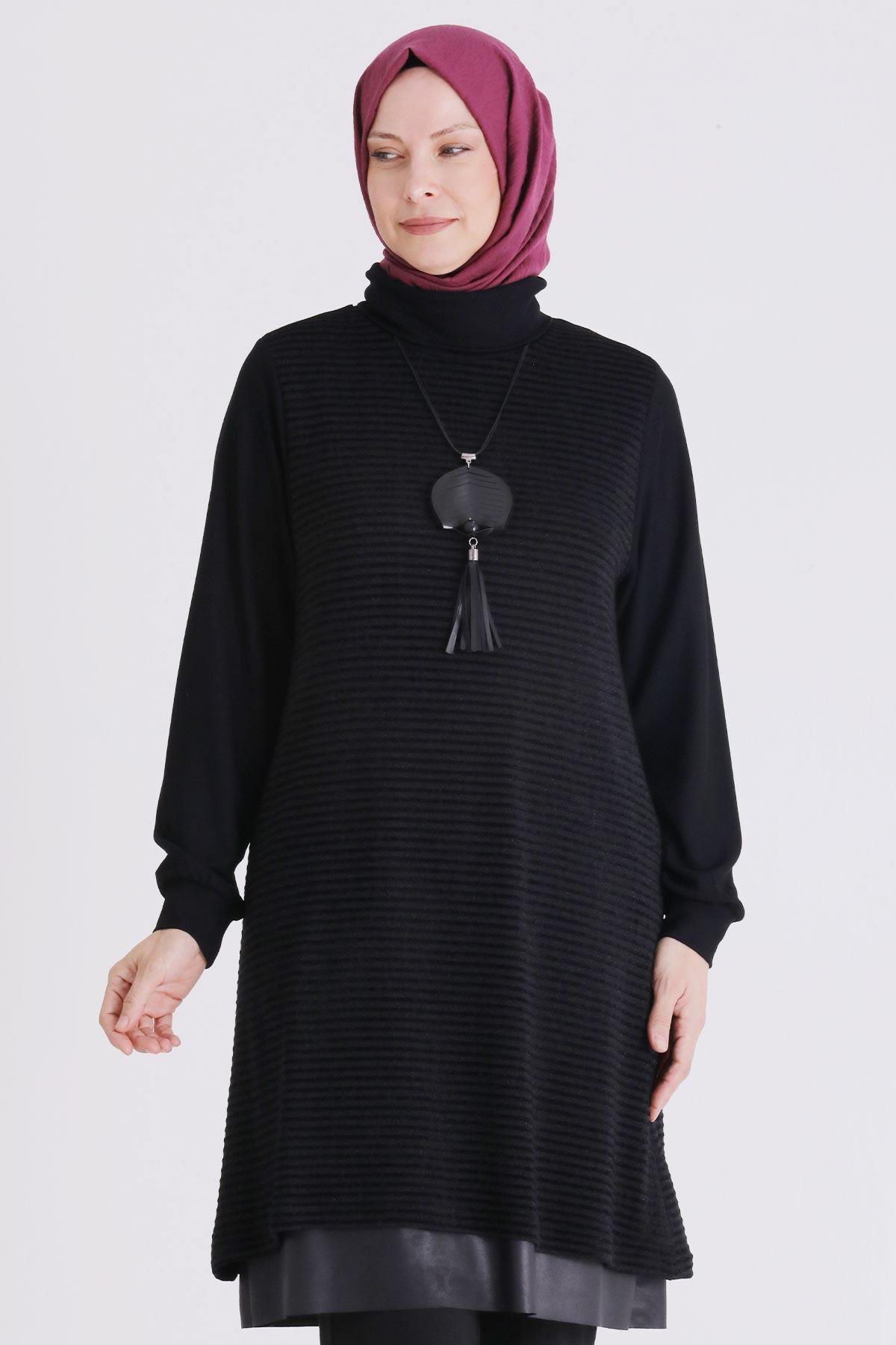 Ürün Detayları: Dik yakalı ürünümüz deri kombinlidir. Kolye aksesuarı ile hareketlendirilmiştir Kumaş Türü: Modal Triko