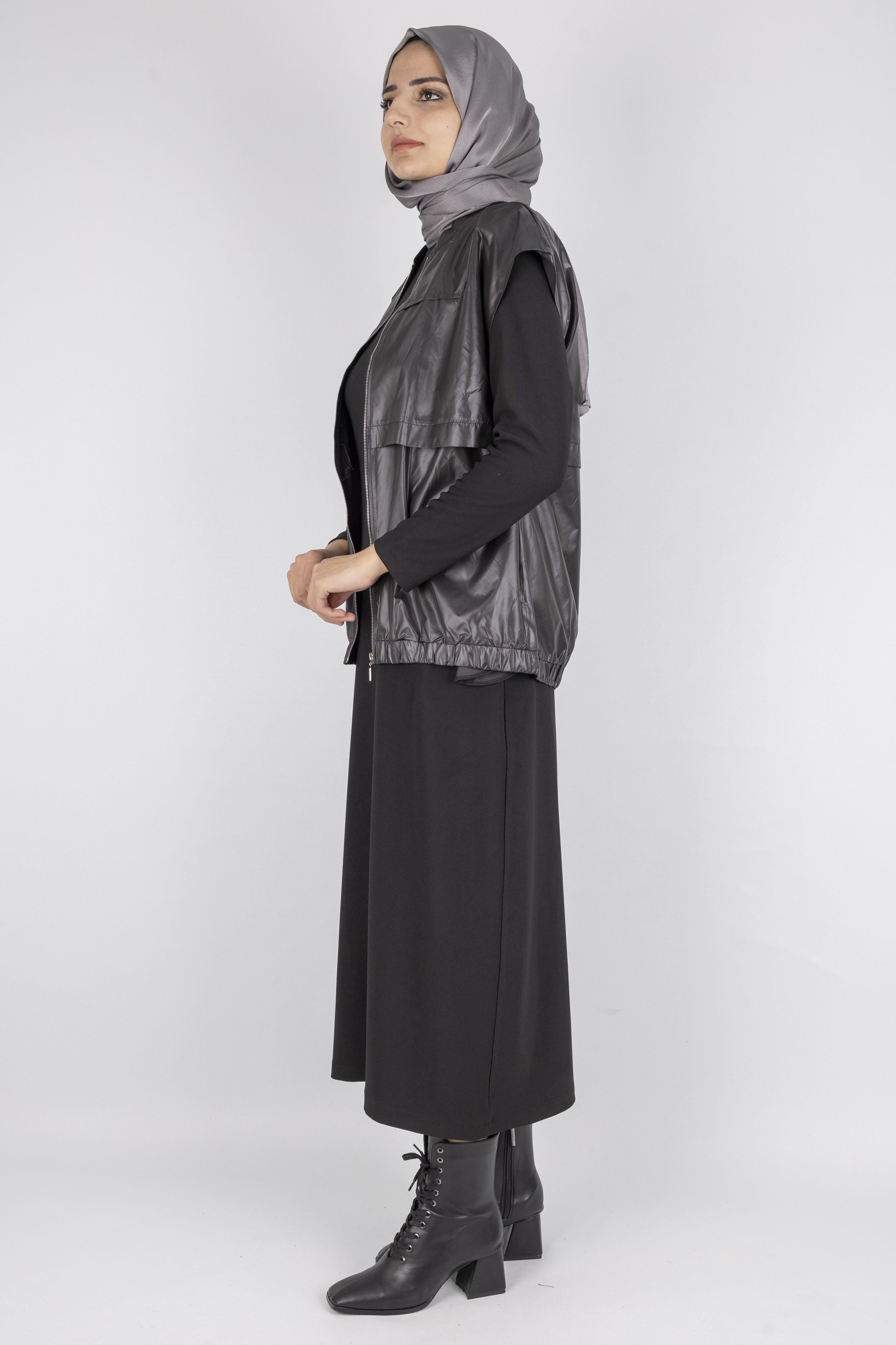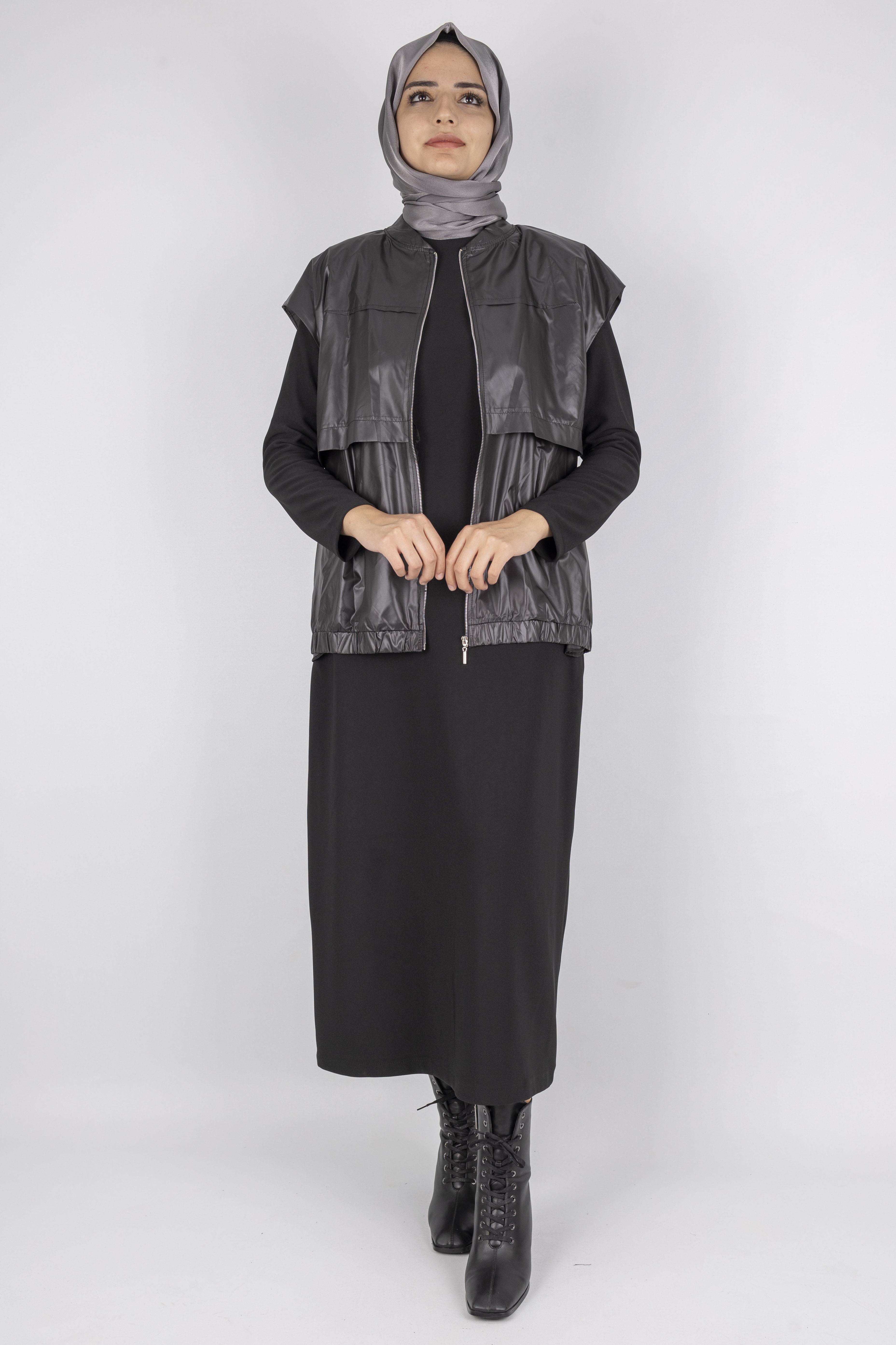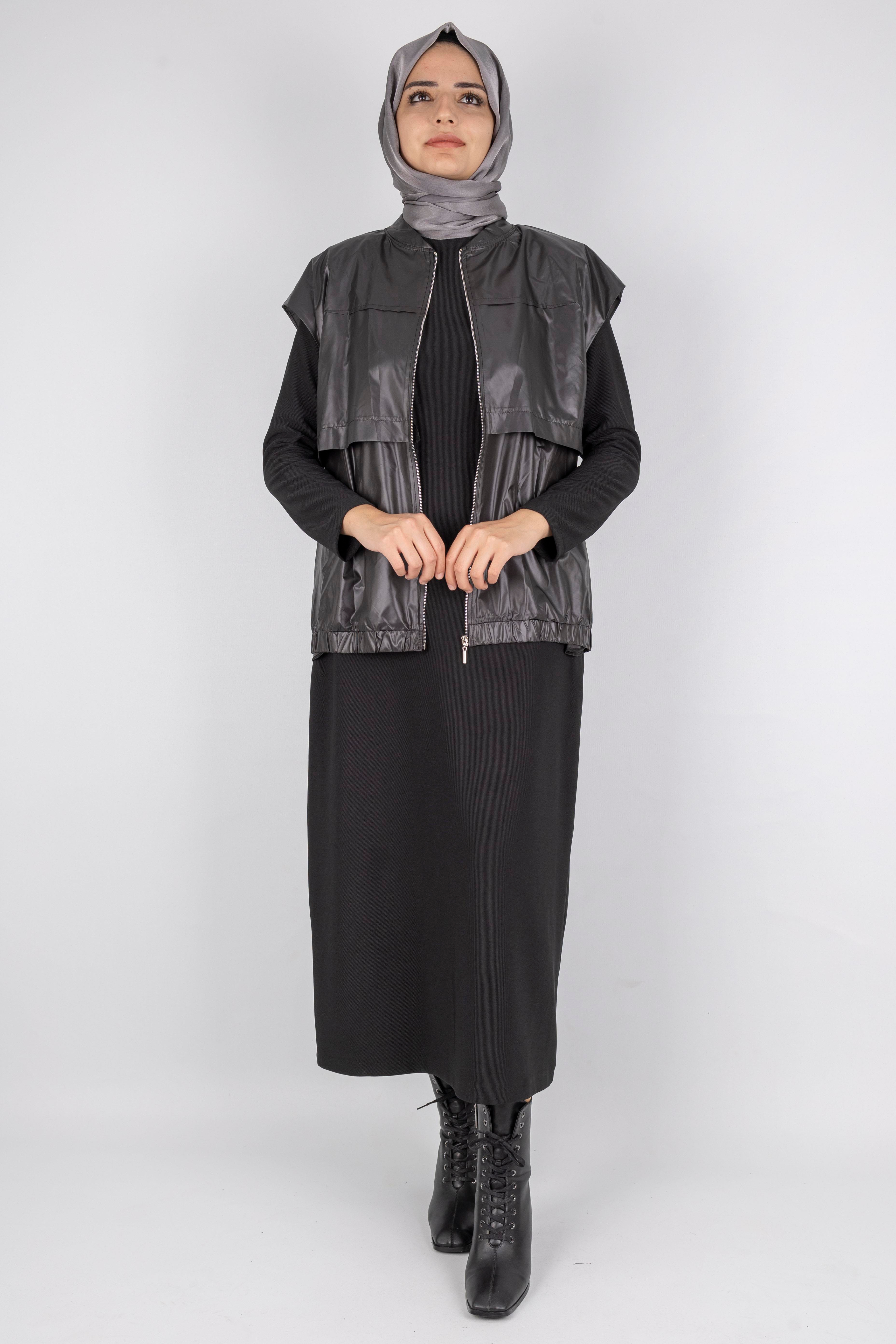 Yeleğin fermuarlı yapısı, düşük omuz kesimi ve lastikli etek ucu modern bir görünüm sağlarken, elbisenin sade tasarımı ile mükemmel bir denge oluşturur.