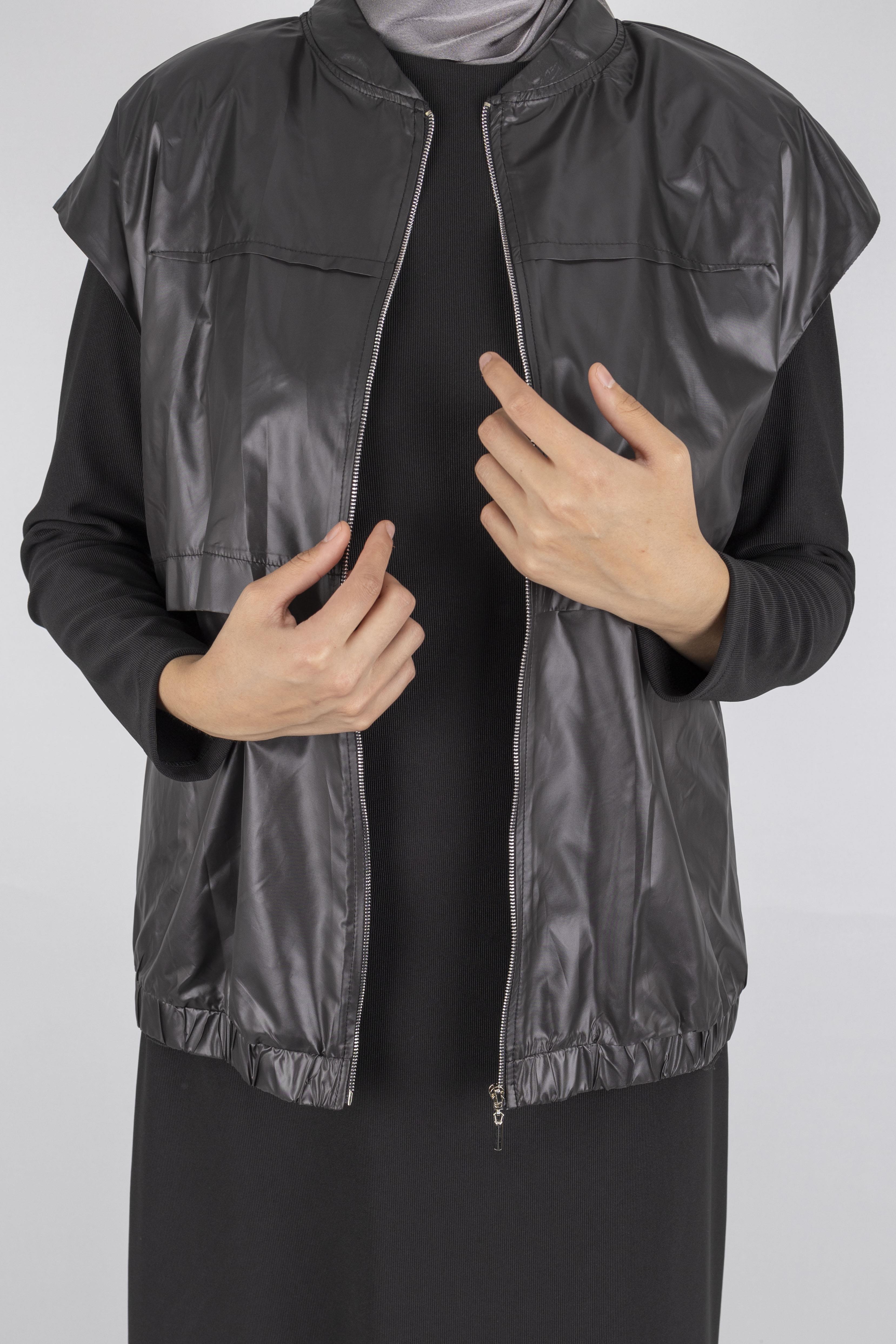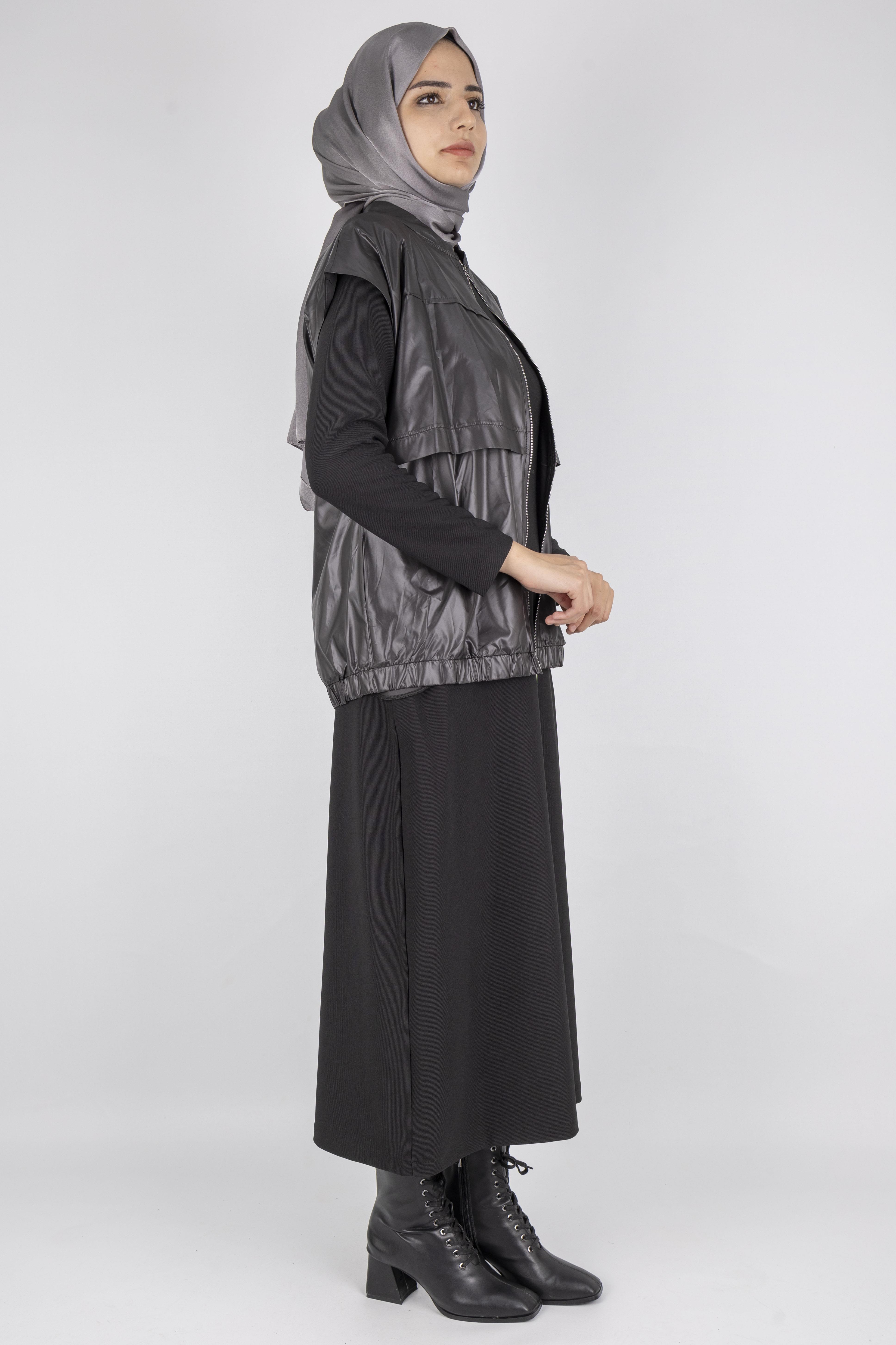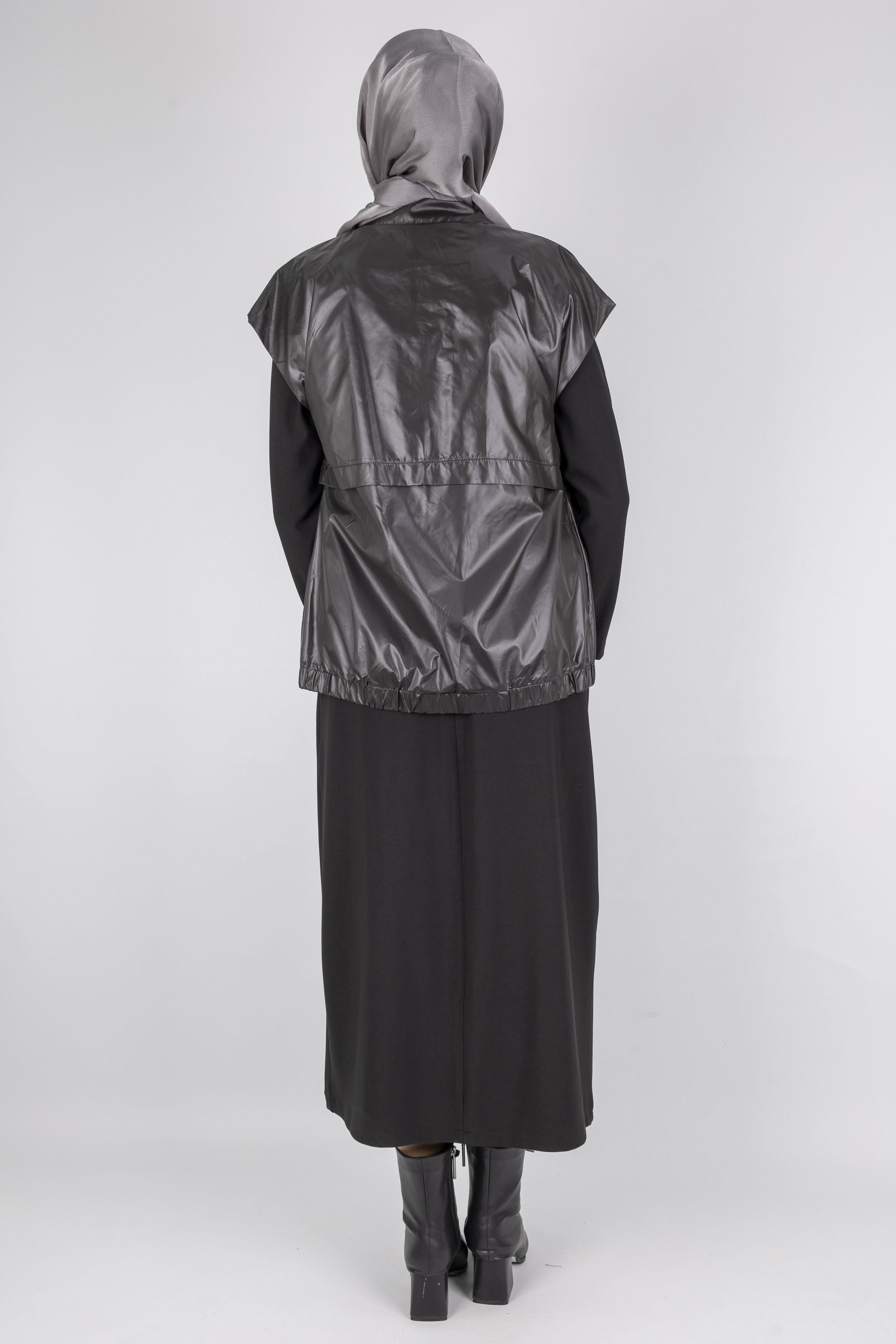 Yeleğin fermuarlı yapısı, düşük omuz kesimi ve lastikli etek ucu modern bir görünüm sağlarken, elbisenin sade tasarımı ile mükemmel bir denge oluşturur.