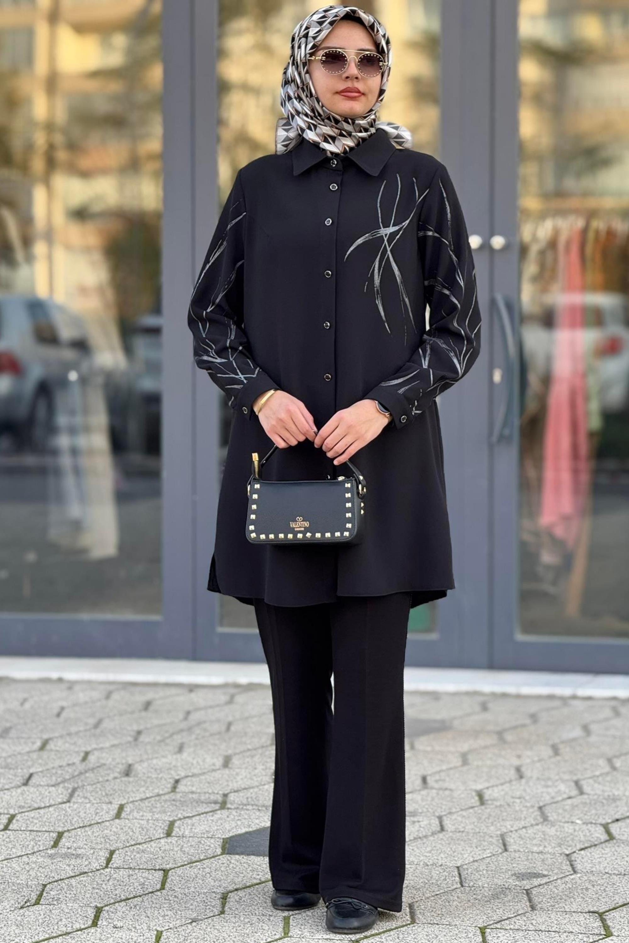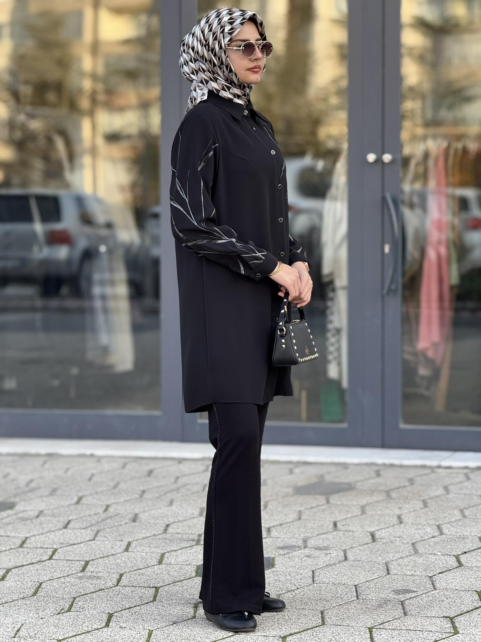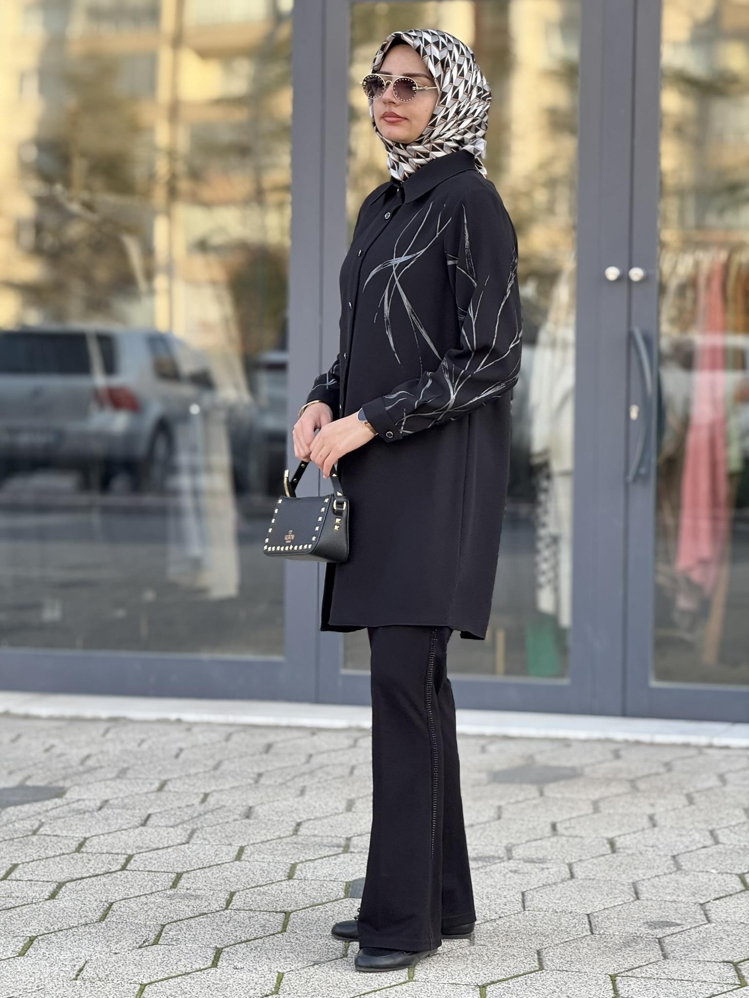 Modern çizgi desenleriyle tasarlanan bu krep tunik, zarif duruşu ve rahat kesimiyle günlük kombinlerden ofis stiline kadar birçok tarza uyum sağlar. Tok yapılı krep kumaşı formunu korurken dökümlü görünüm sunar. Düğmeli önü ve modern tasarımıyla sade şıklığı sevenler için ideal bir parçadır.