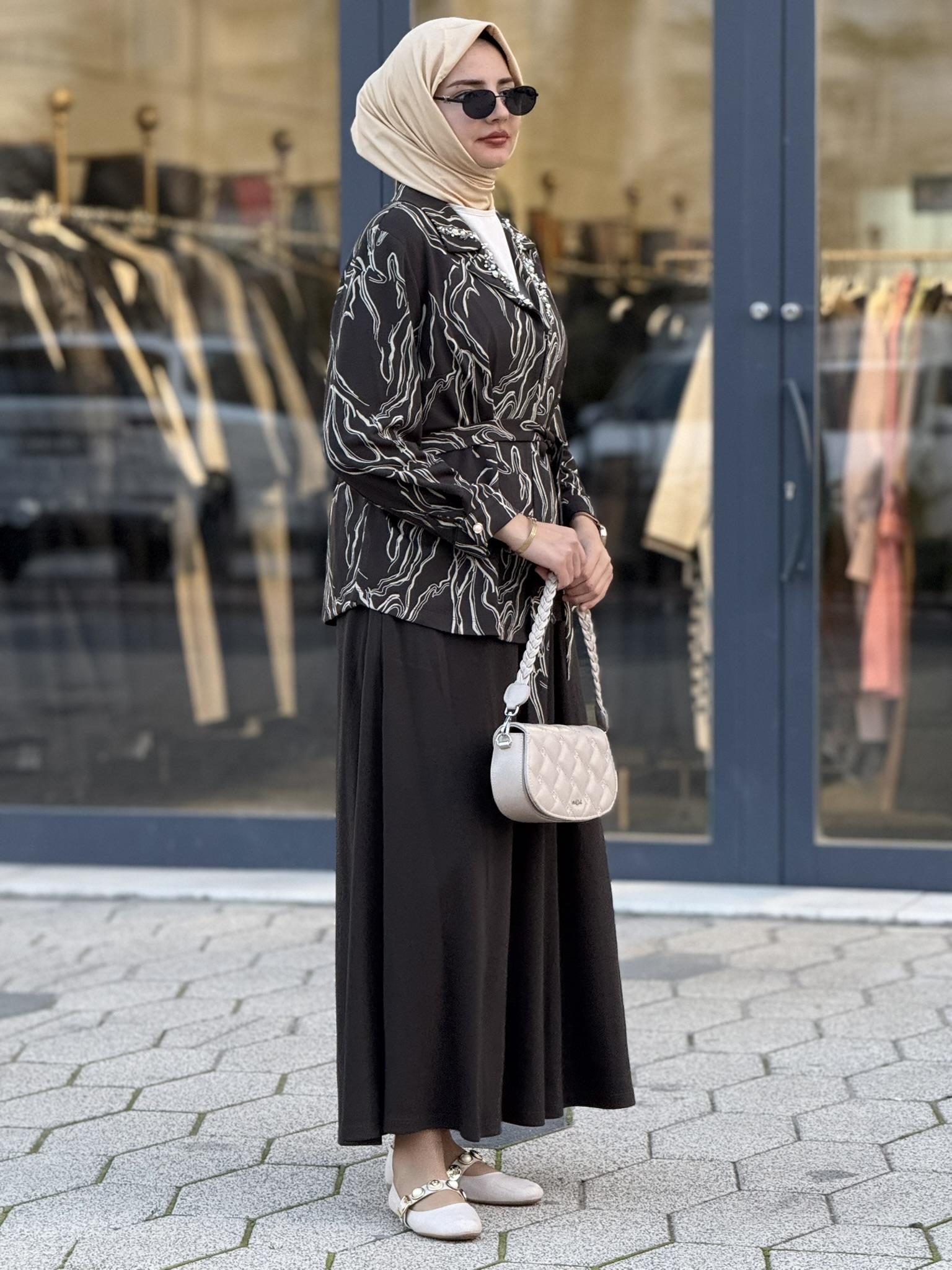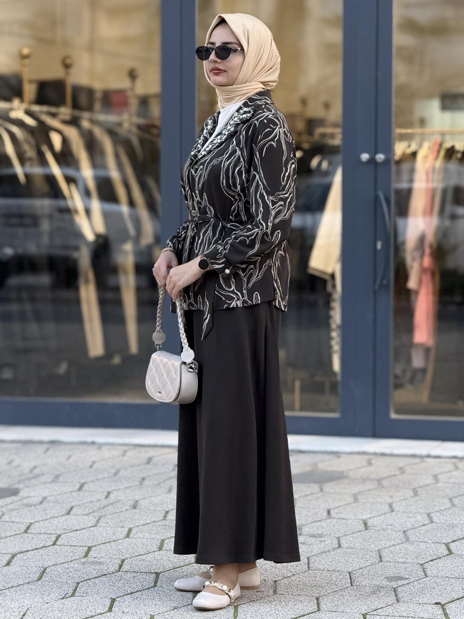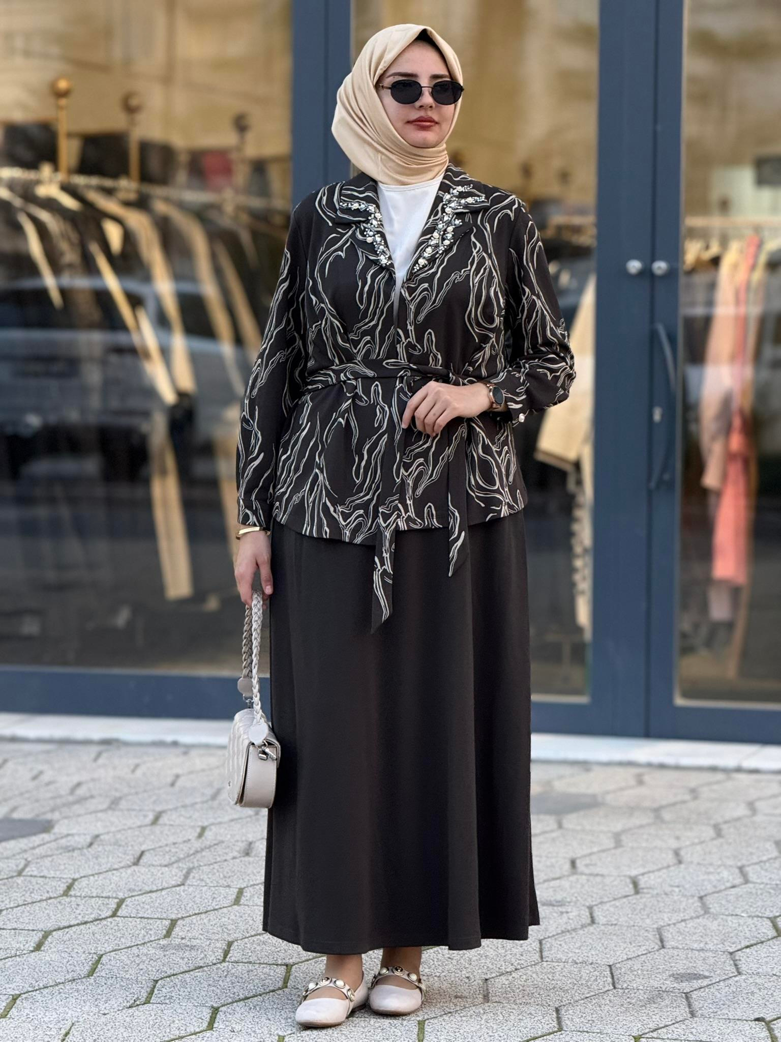 Modern çizgileri ve şık detaylarıyla dikkat çeken bu mermer desenli üçlü örme takım, ceket, içlik ve uzun etekten oluşuyor. Yumuşak örme kumaşı gün boyu rahatlık sağlarken, ceketin yakasında bulunan taş işlemeleri modele zarif bir ışıltı katıyor.