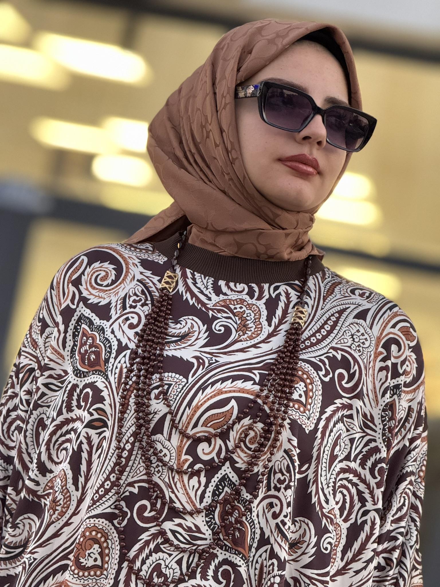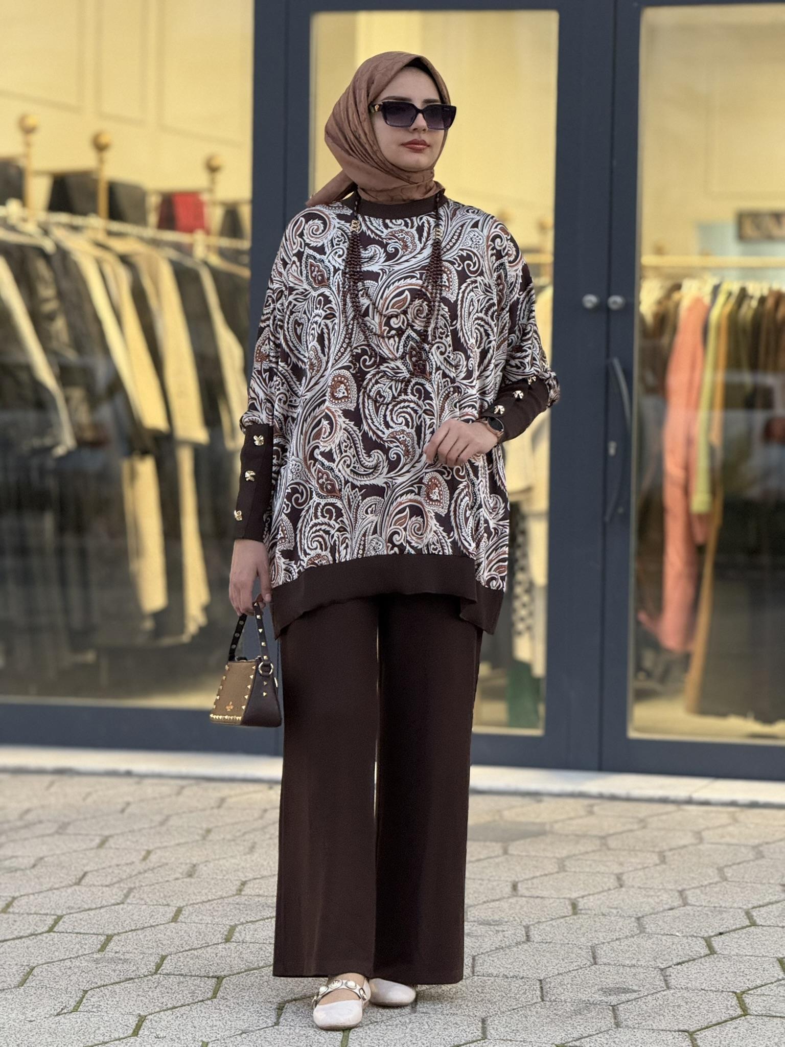 Desenli Yarasa Kol Tesettür Takım Kahve OTW45824