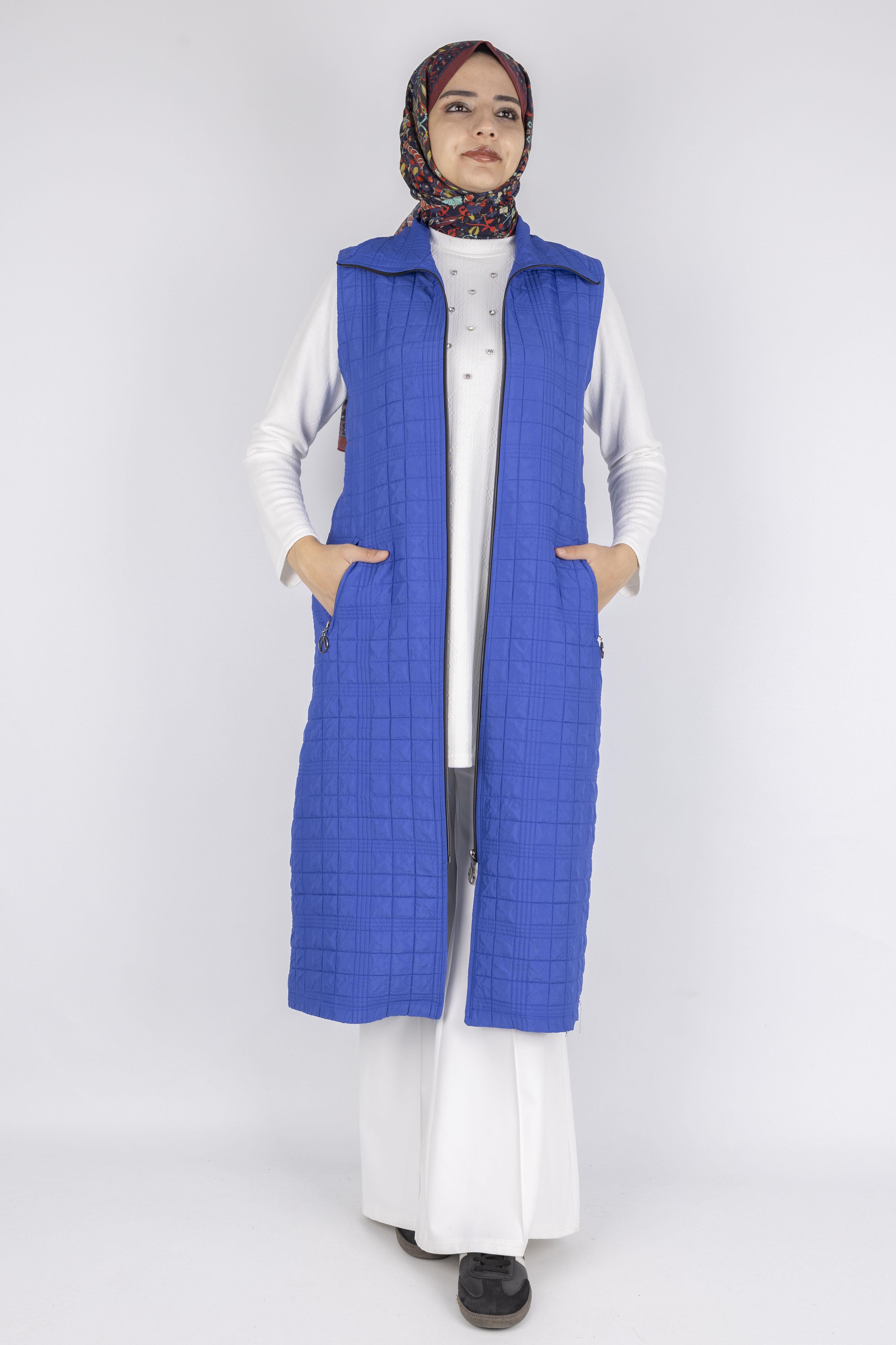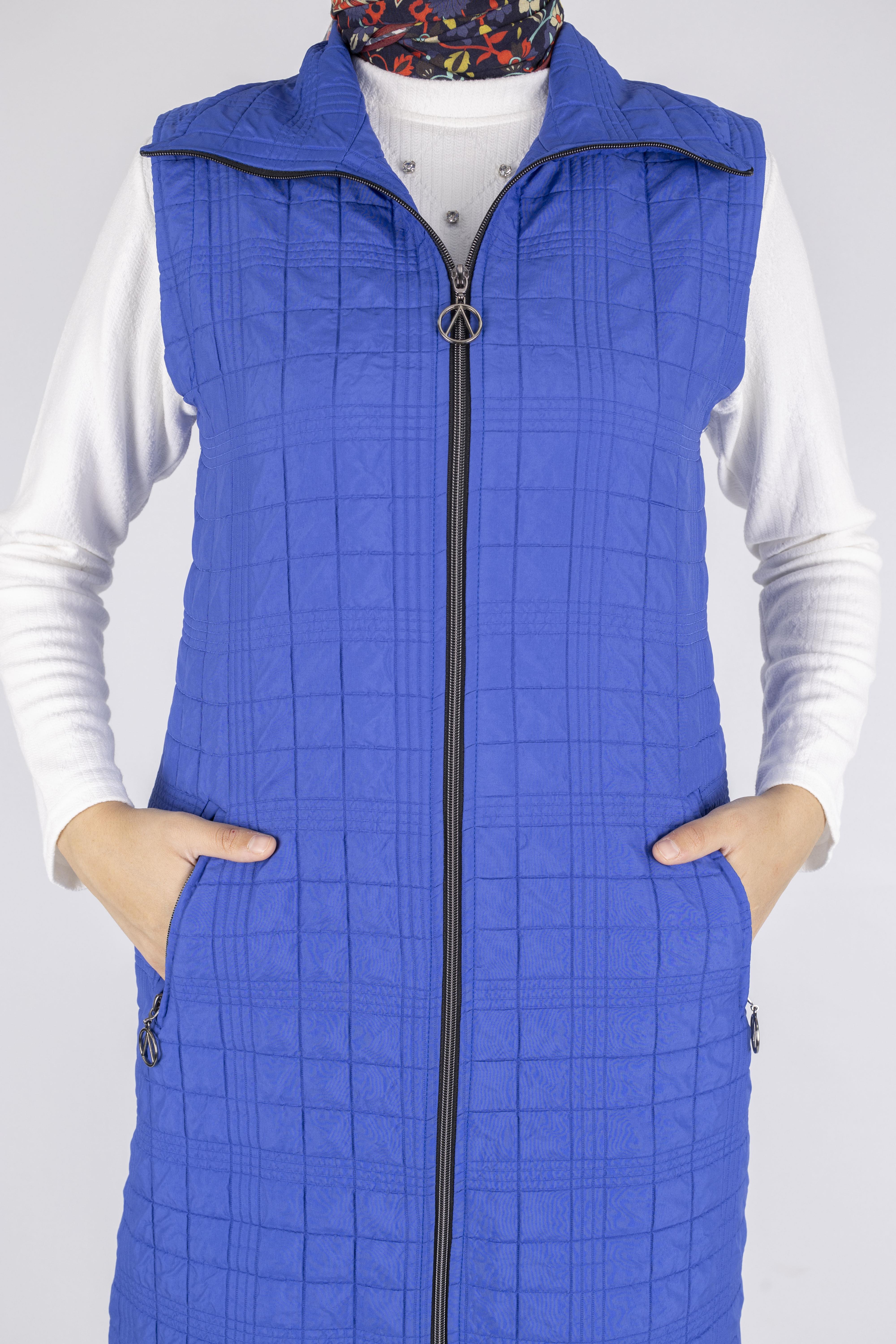 Dik Yaka Kapitone Uzun Kapüşonsuz Yelek Saks OTW4030
