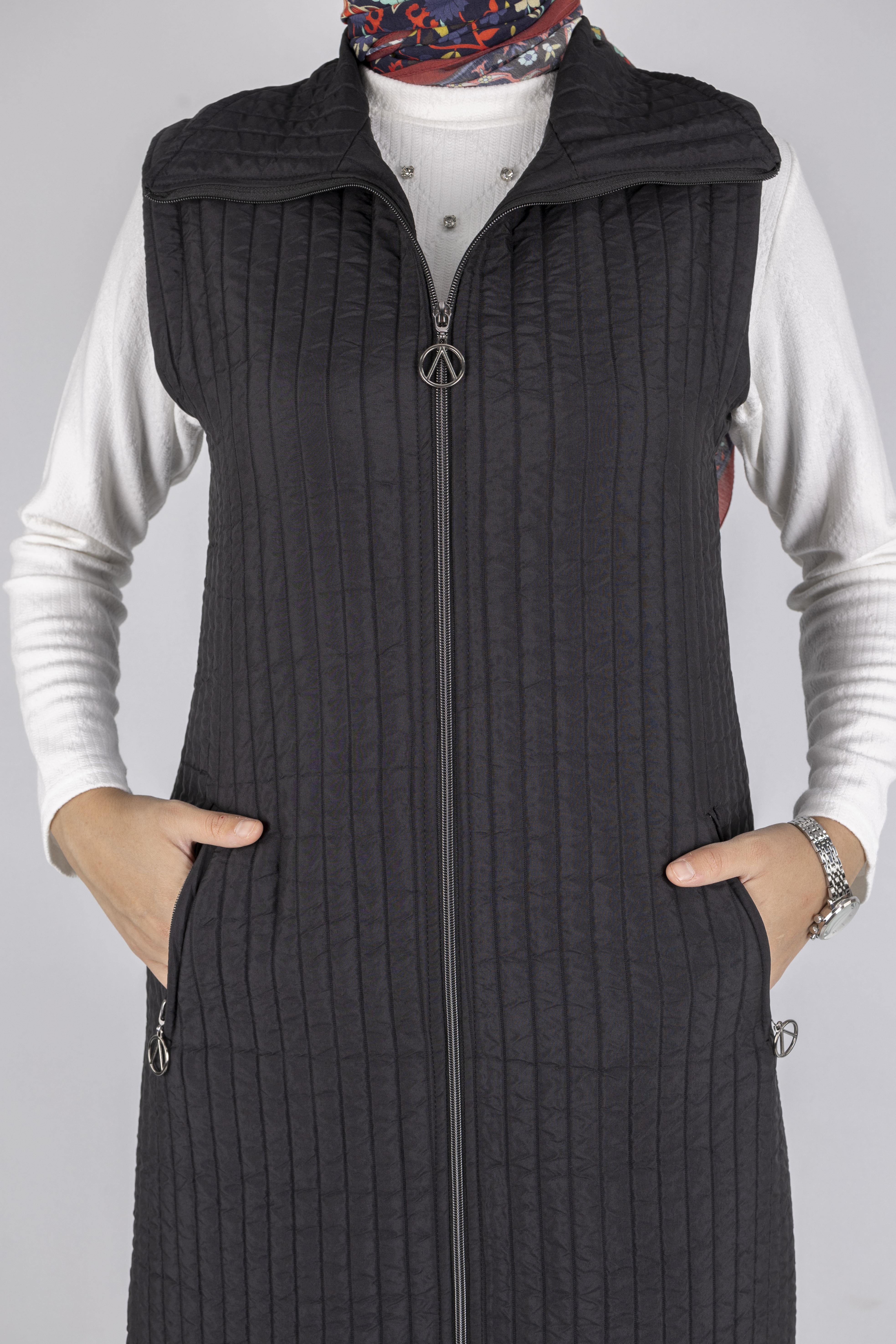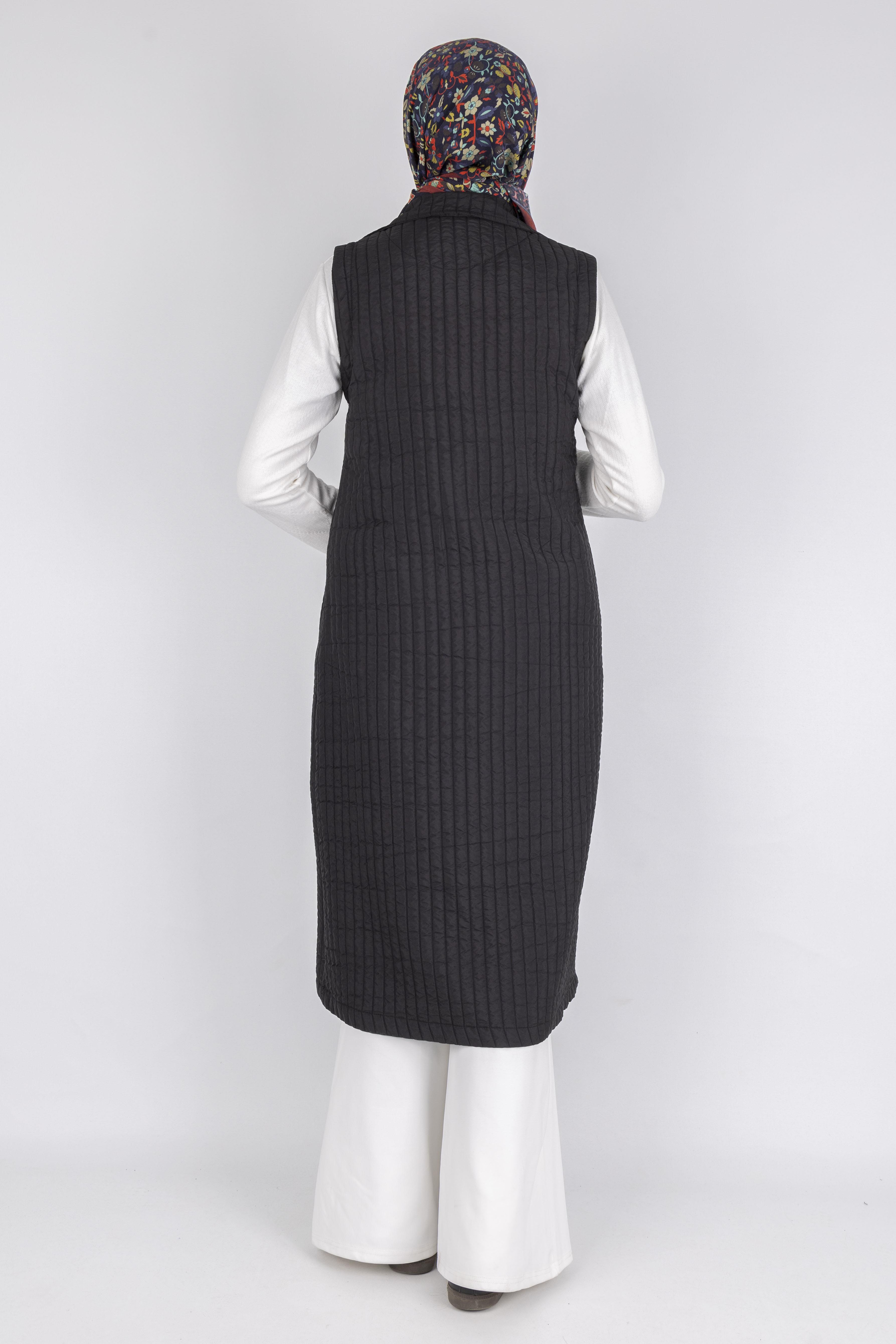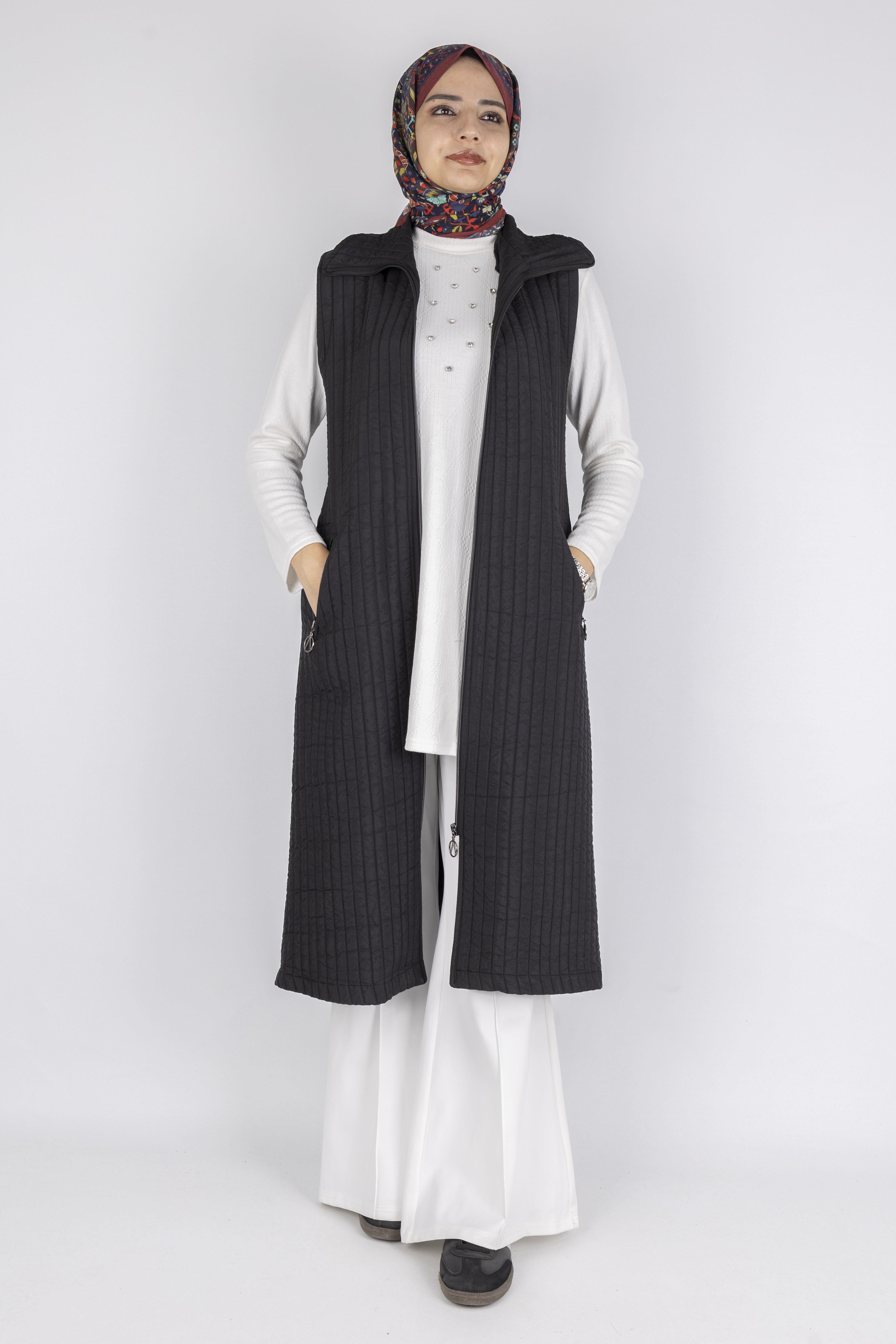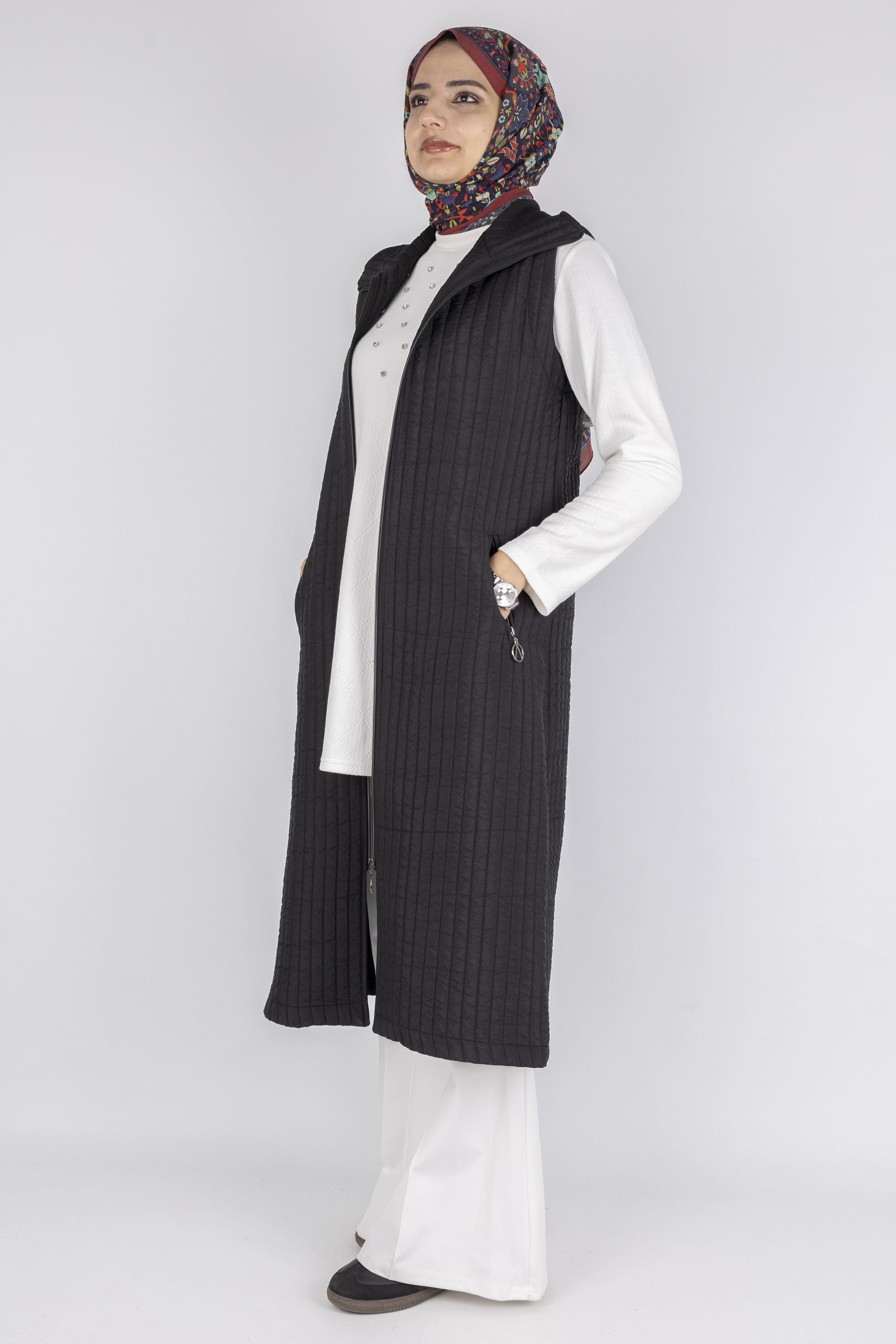 Dik Yaka Kapitone Uzun Kapüşonsuz Yelek Siyah OTW4030