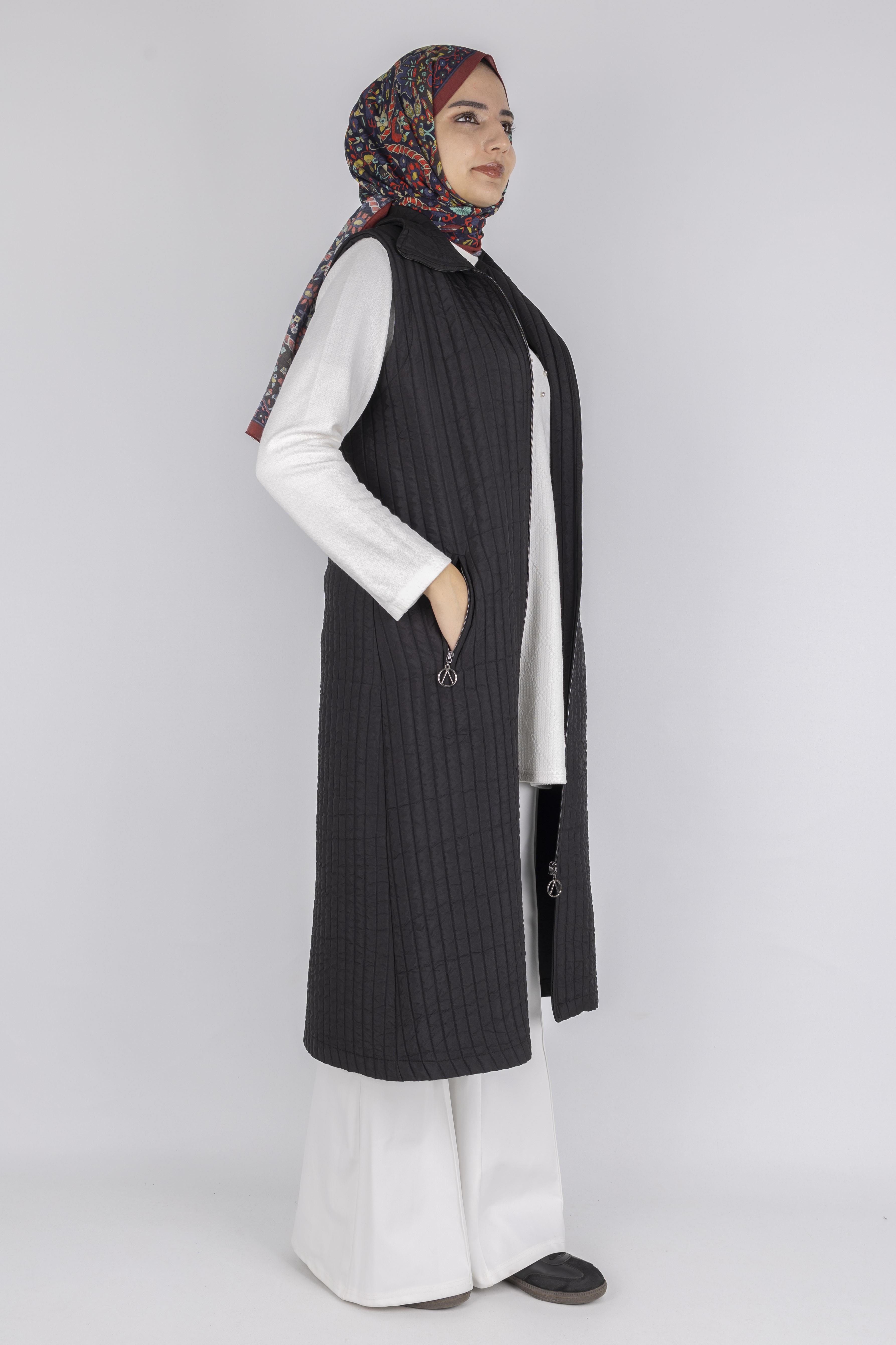 Dik Yaka Kapitone Uzun Yelek (Kapüşonsuz Siyah OTW4030