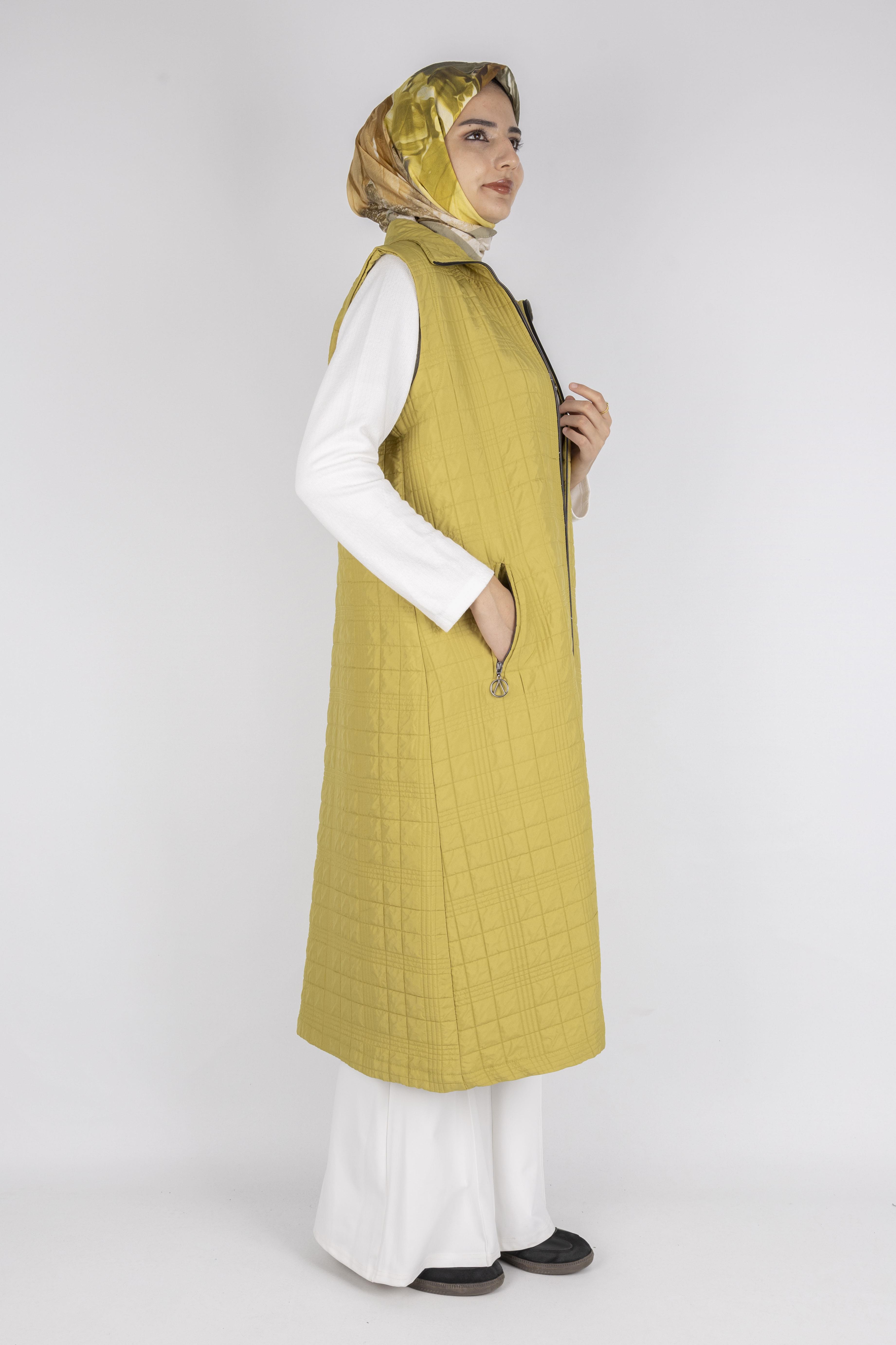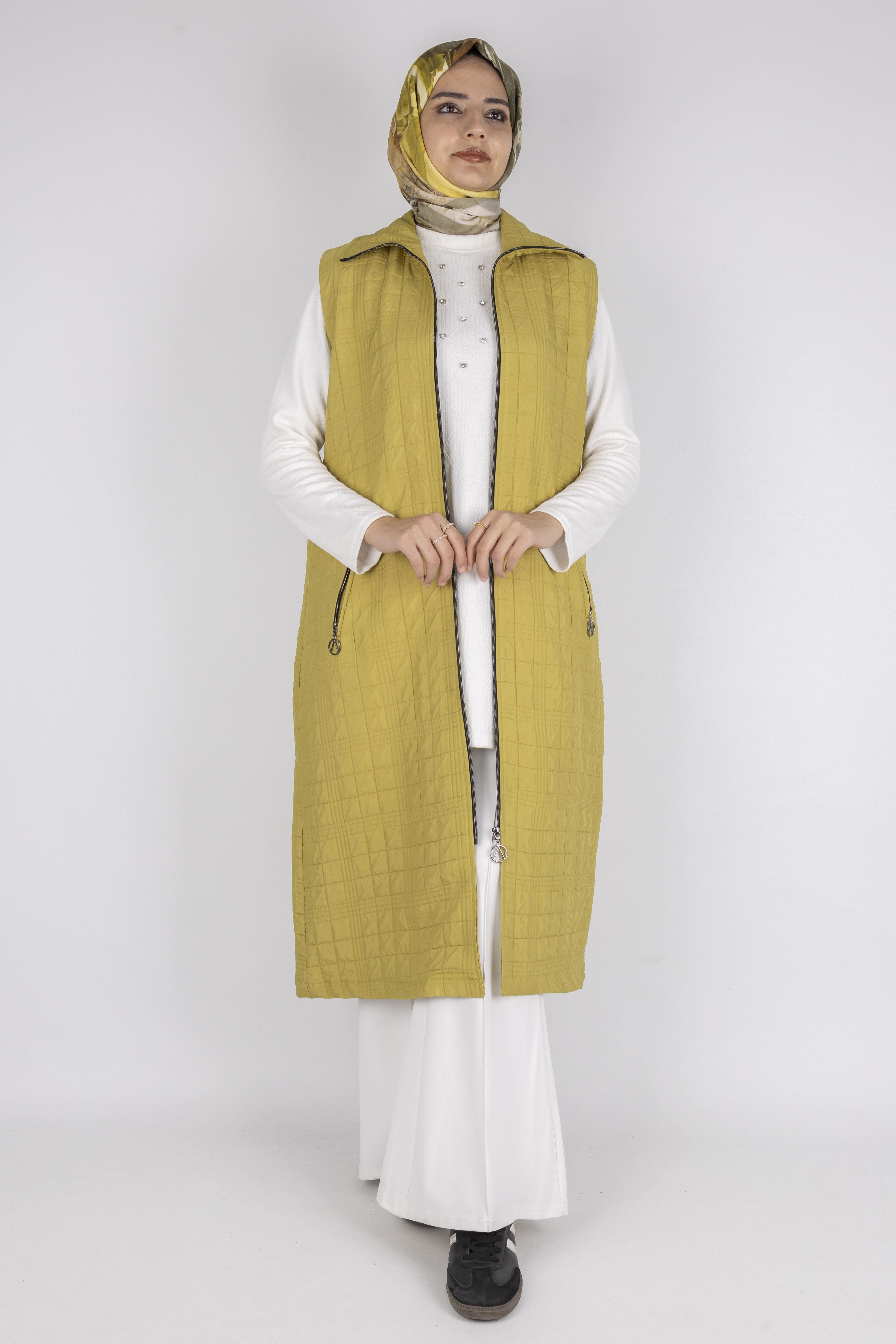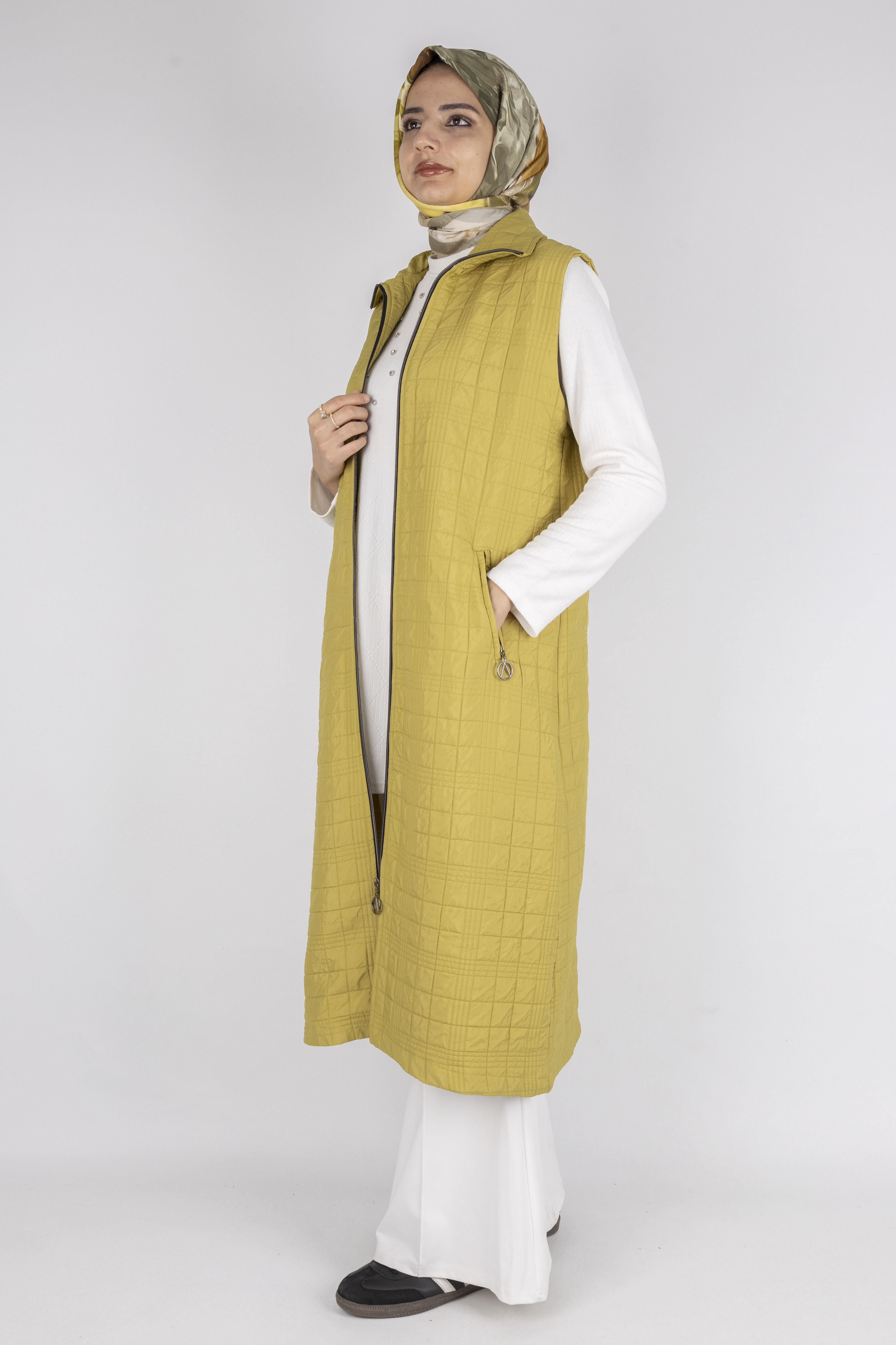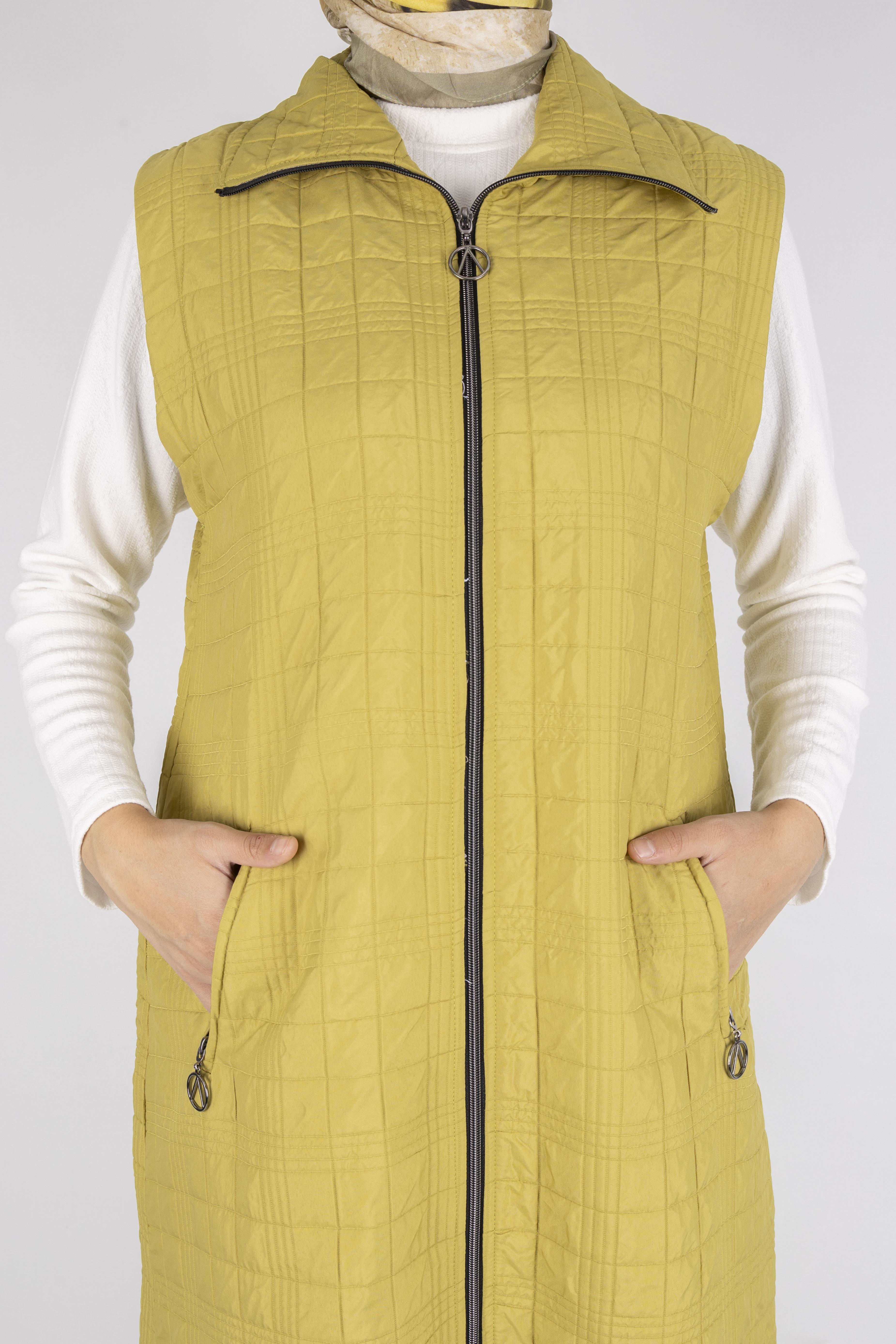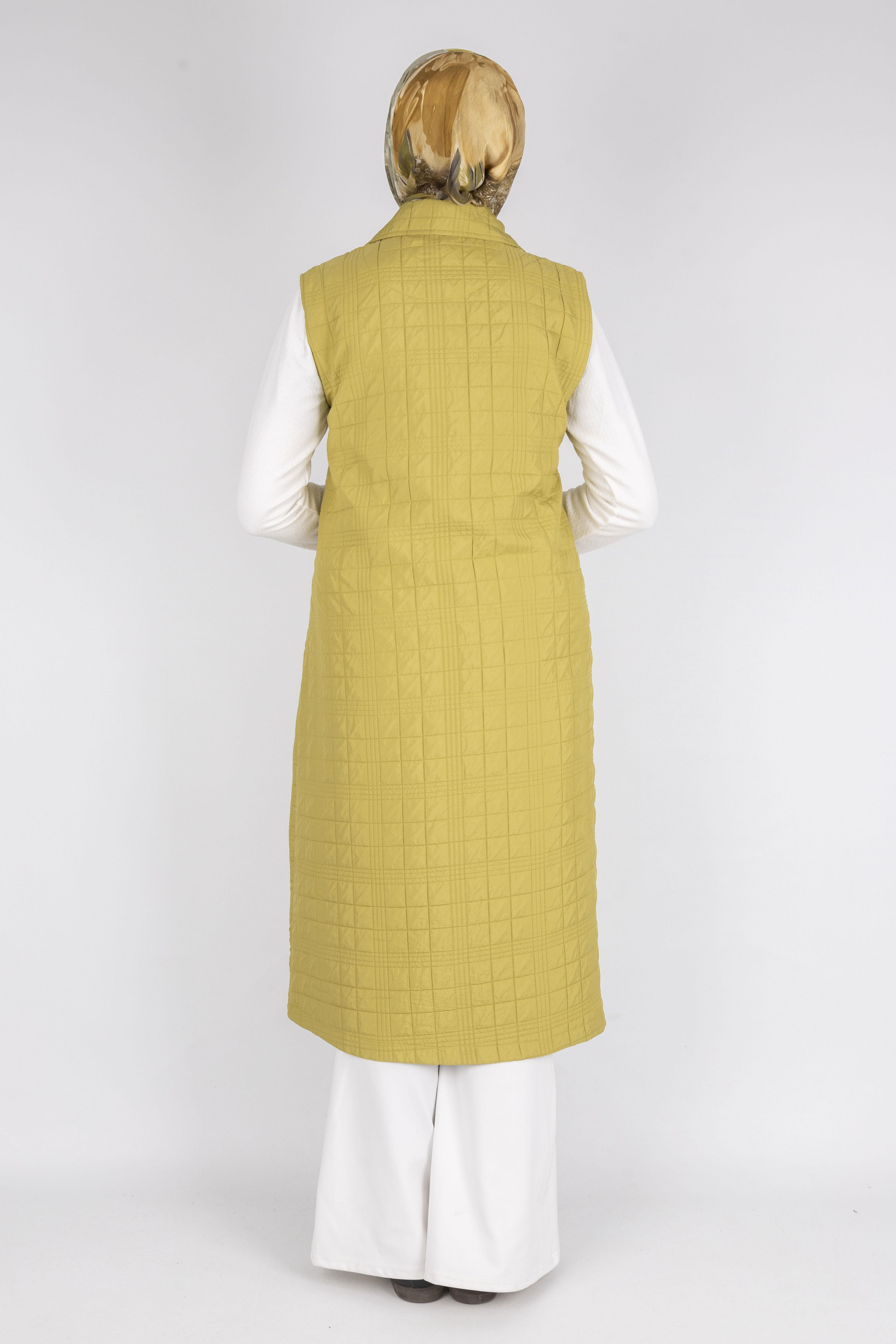 Dik Yaka Kapitone Uzun Kapüşonsuz Yelek Yağ Yeşili OTW4030