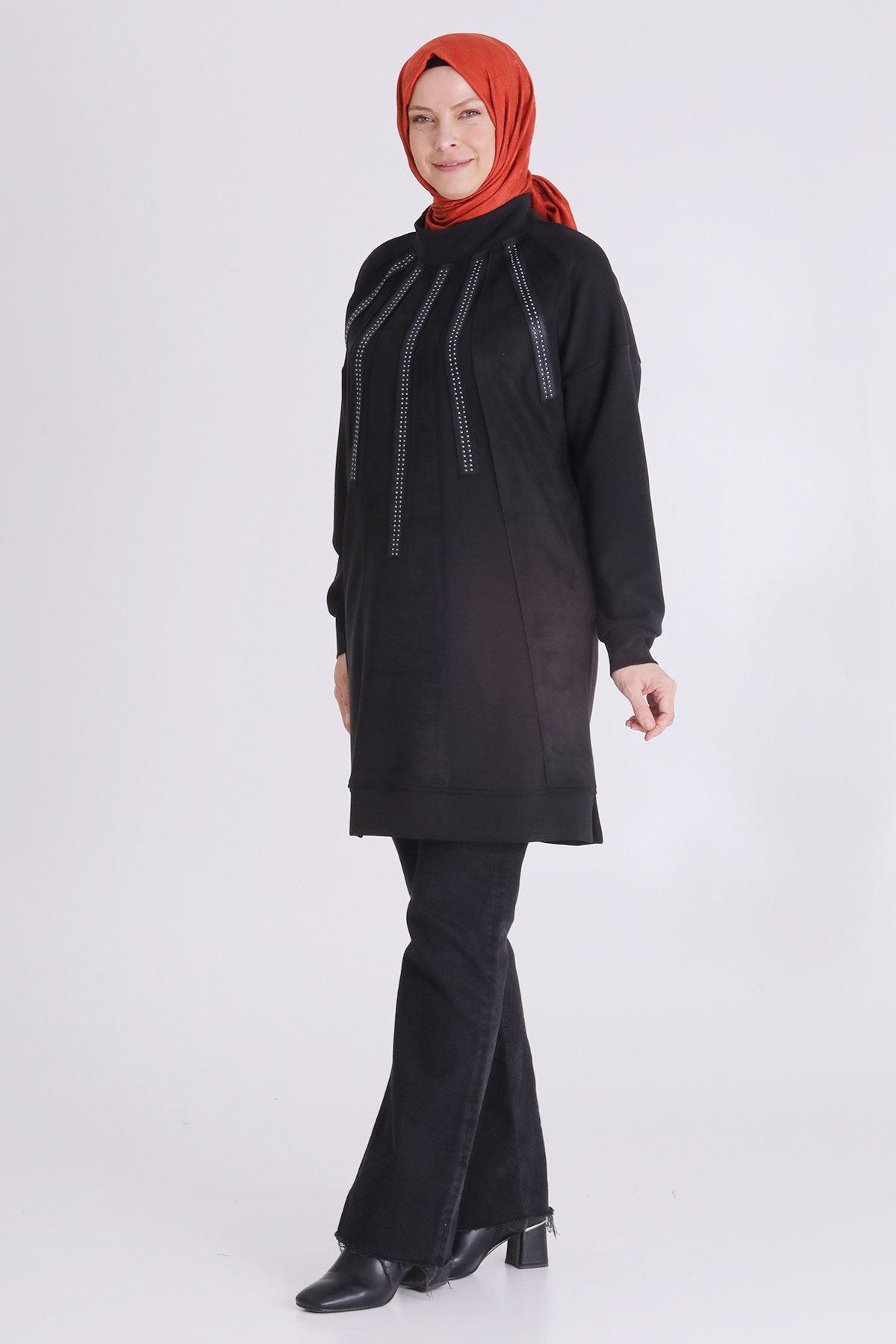 Behrem Dikey Taş Şerit Detaylı Tesettür Tunik Siyah OTW20124