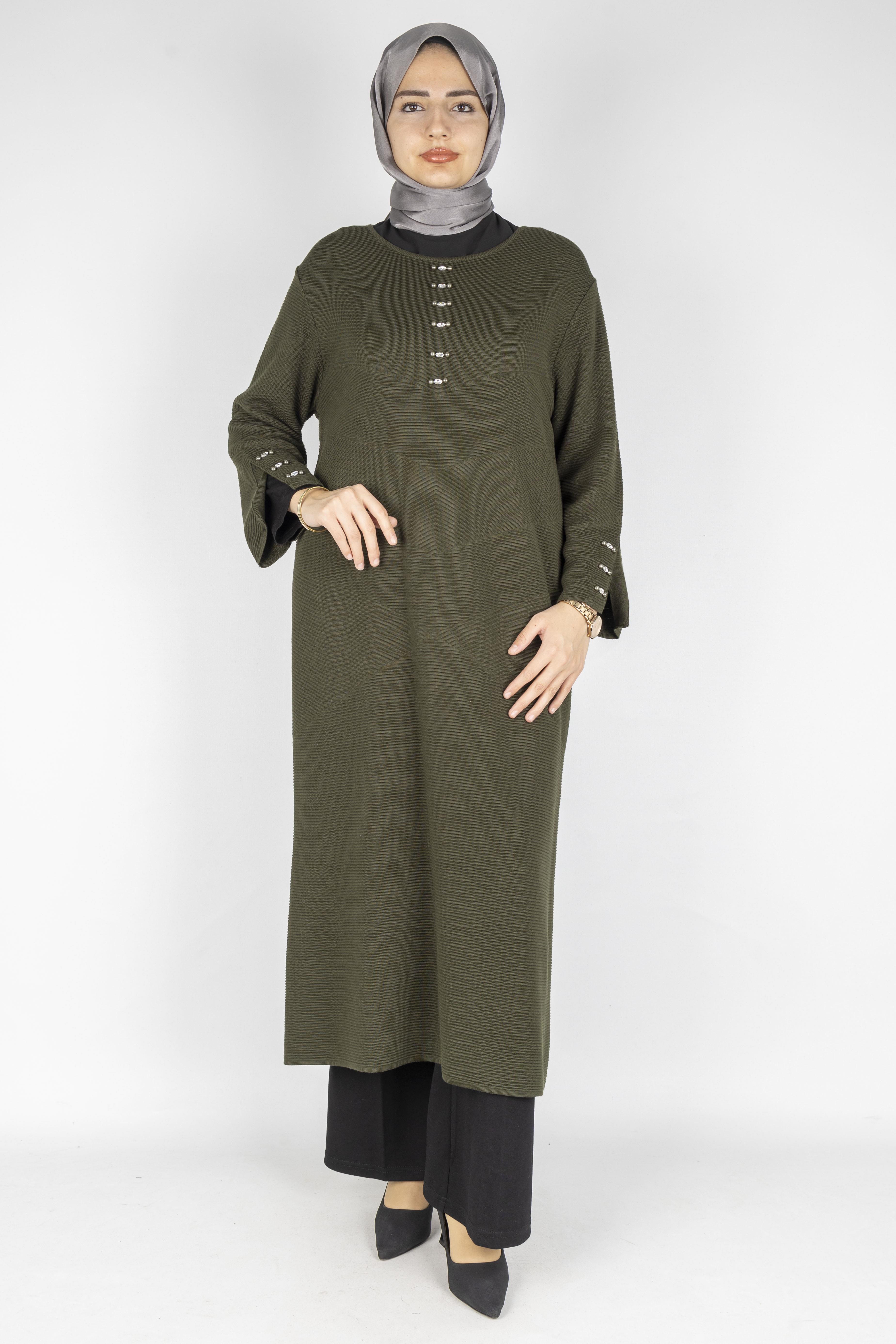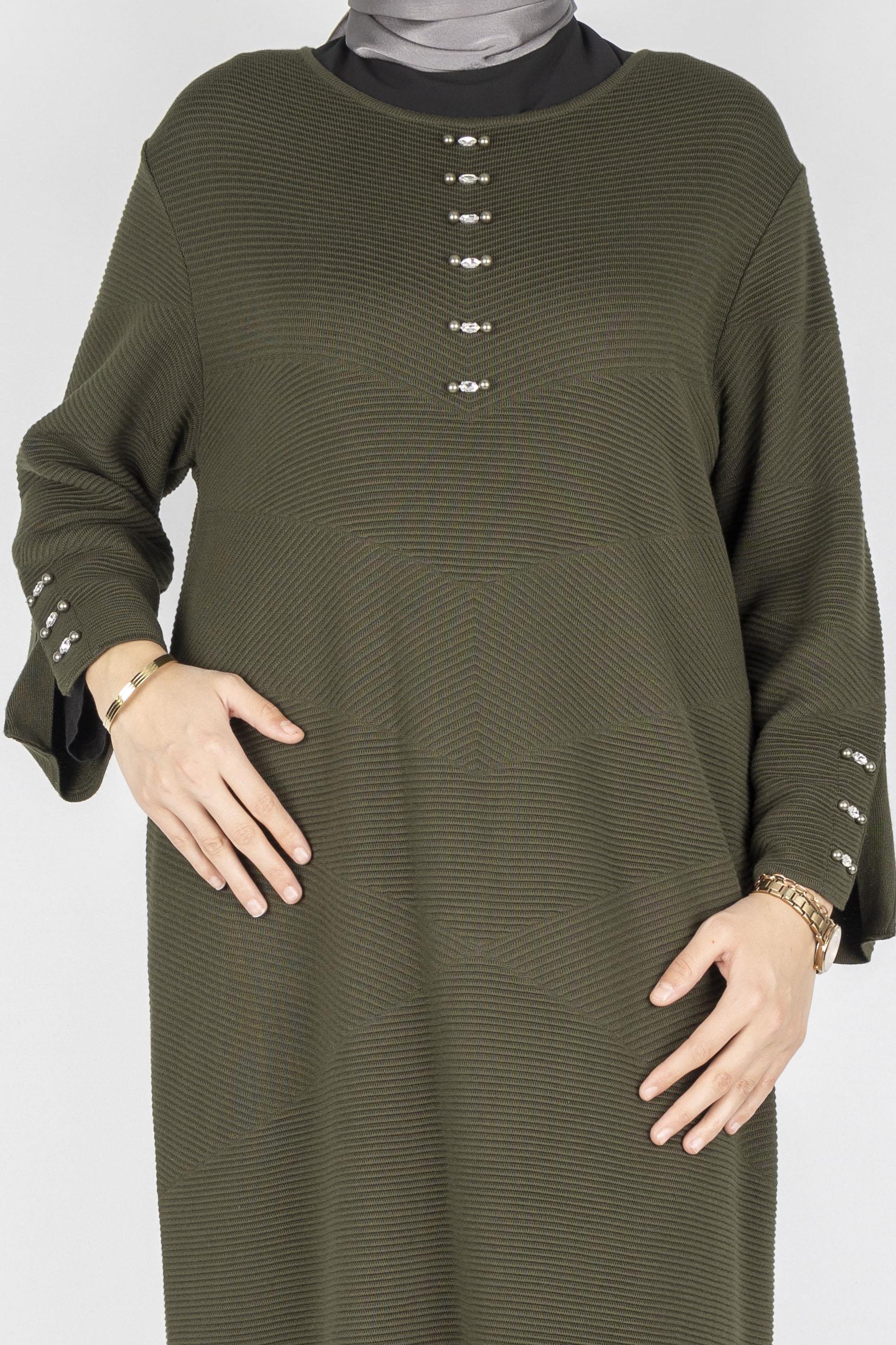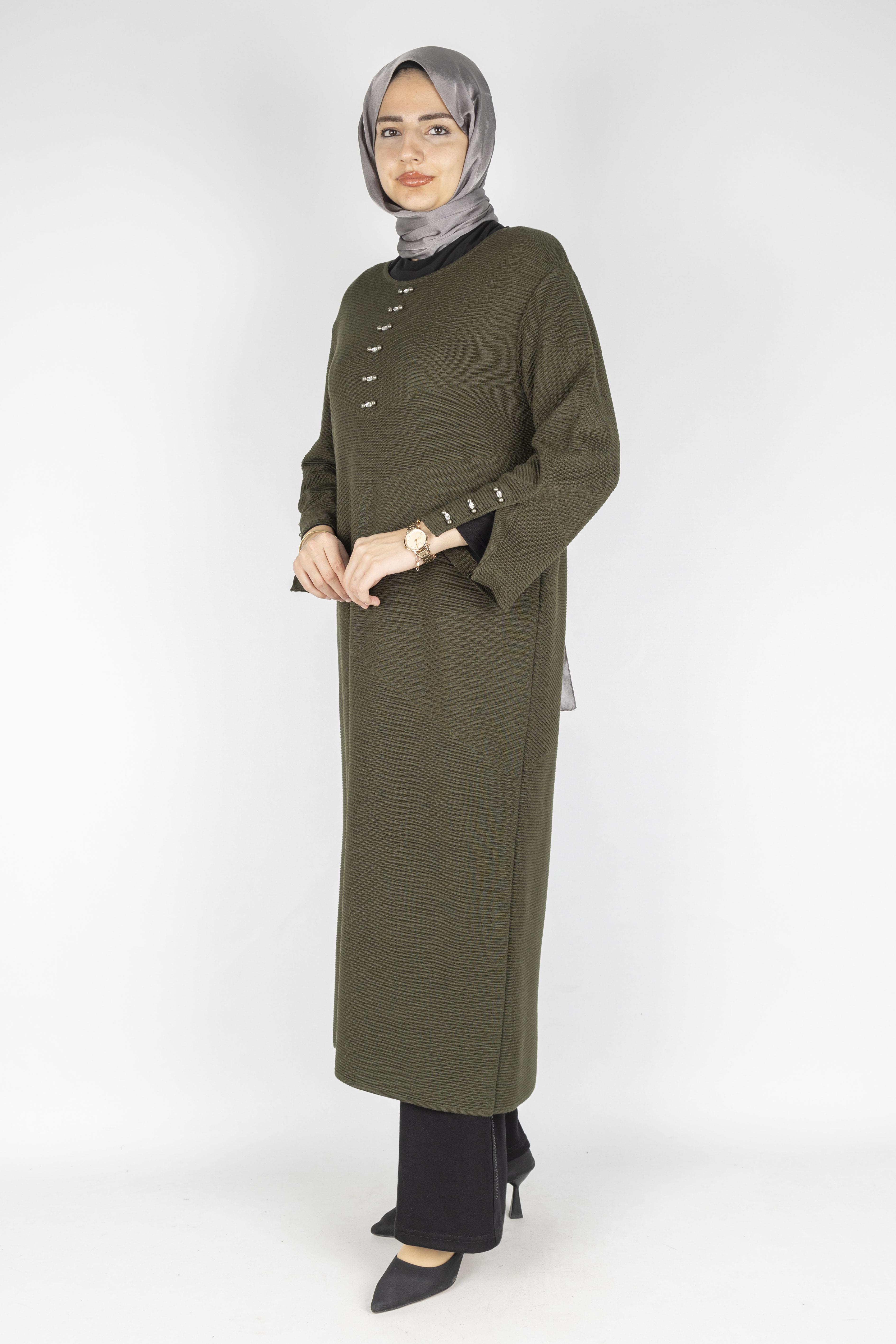 Düğme Detaylı Çelik Örme Uzun Büyük Beden Elbise&Tunik Haki OTW14436