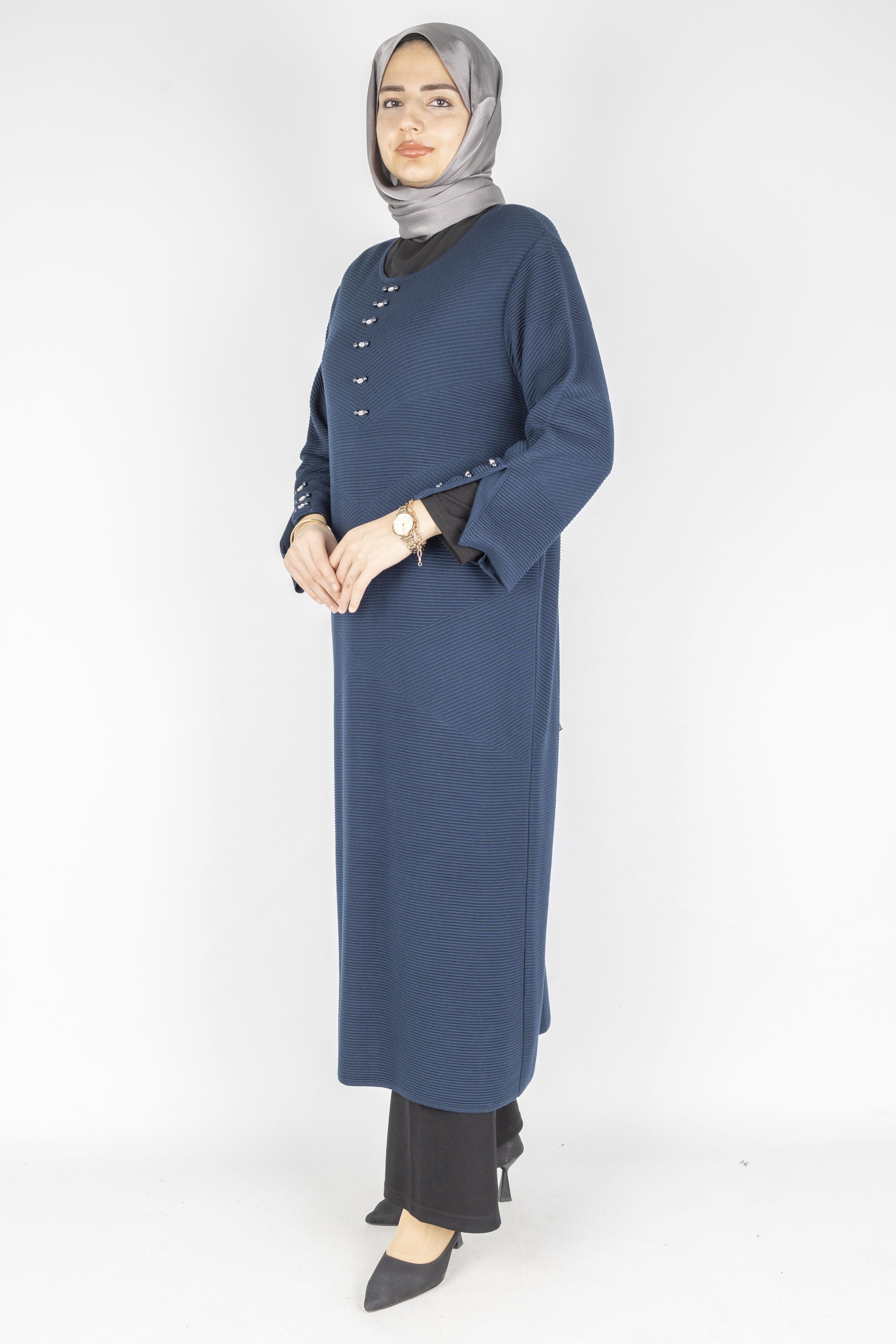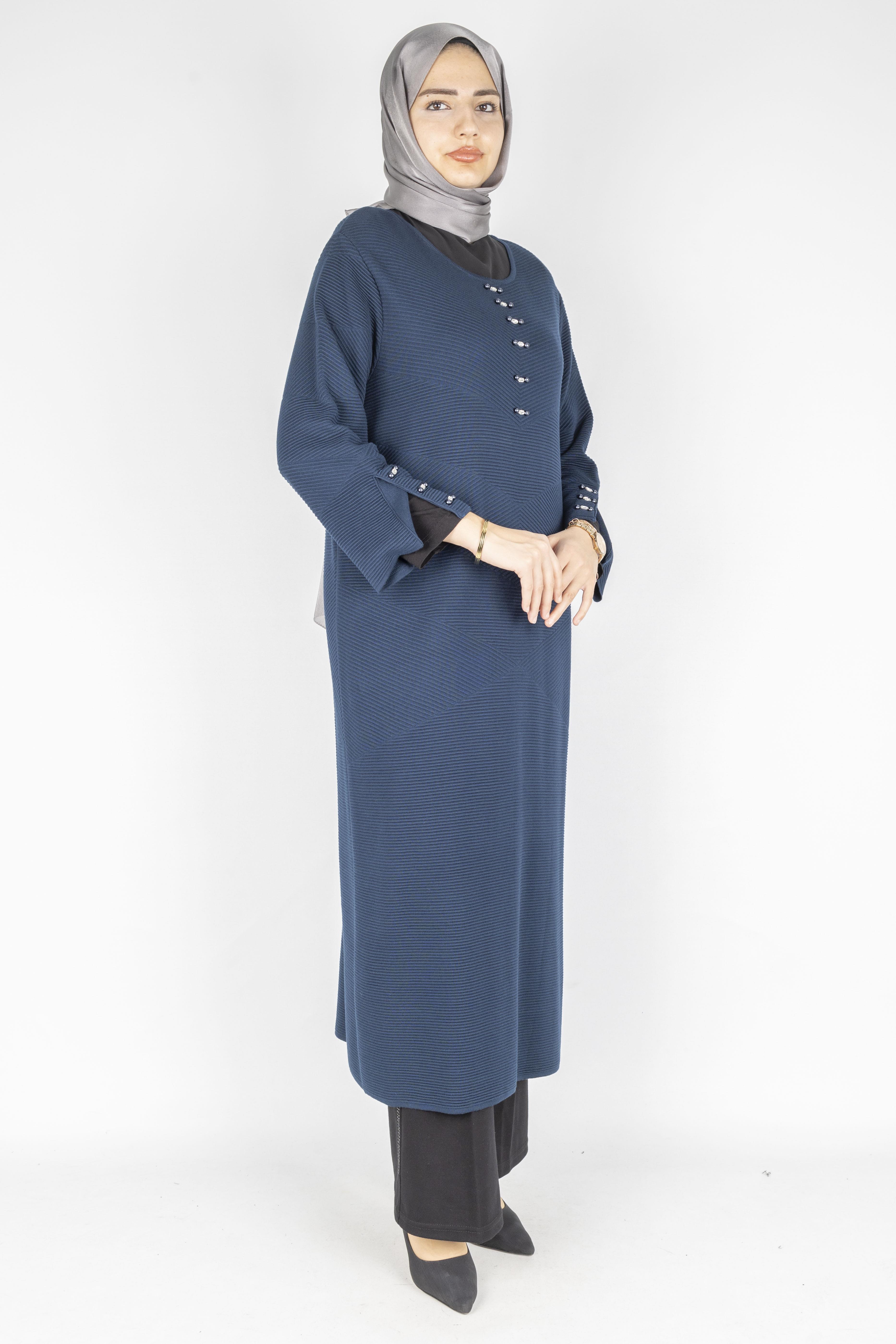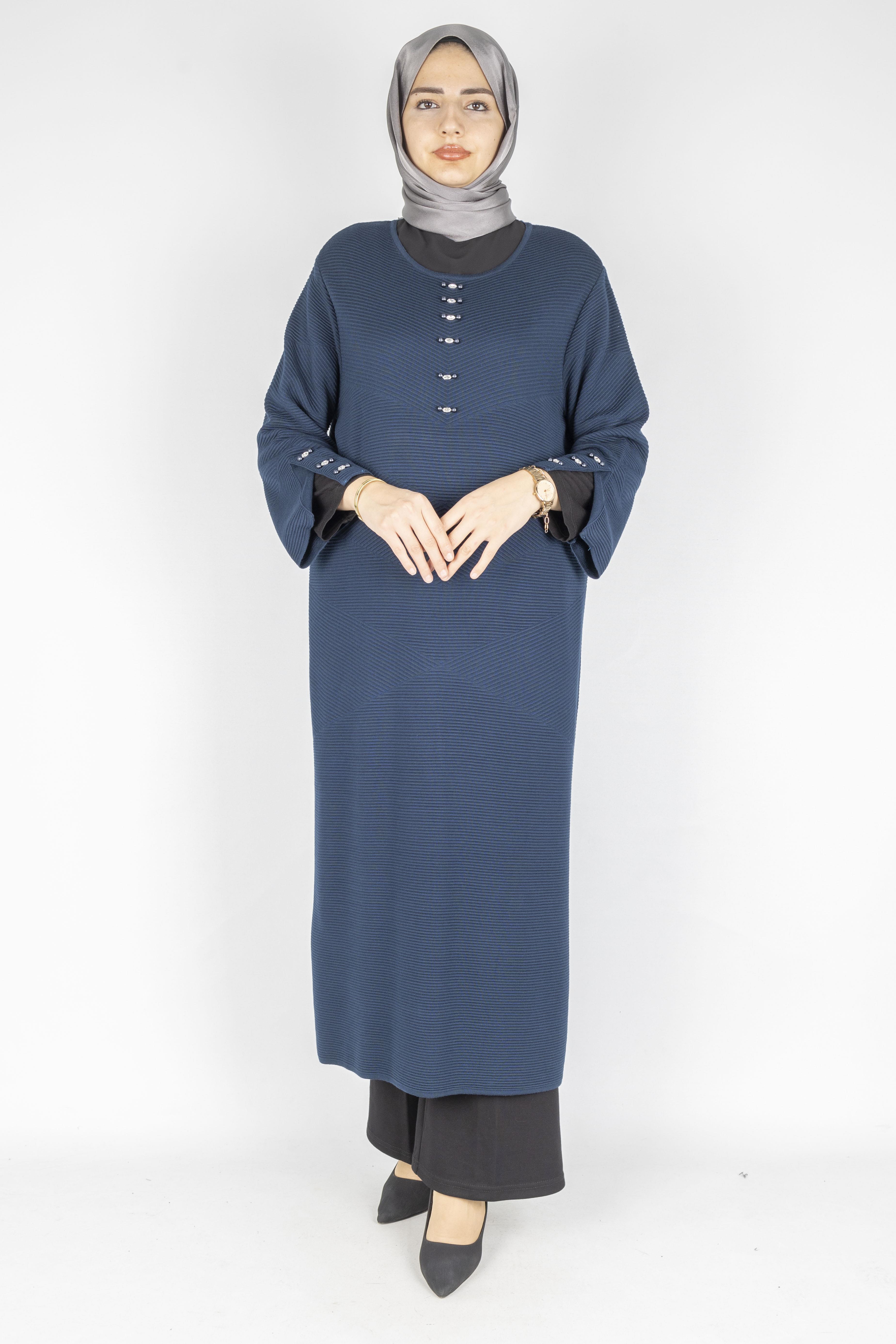 Tok ve esnek yapıya sahip fitilli örme kumaşı ile tasarlanan bu büyük beden elbise & tunik modeli, sade tasarımını zarif düğme detaylarıyla tamamlar. Dökümlü kesimi sayesinde vücuda yapışmadan rahat bir kullanım sunar ve büyük beden vücut tipleri için dengeli bir siluet oluşturur. Elbise olarak tek parça kullanılabildiği gibi, pantolon üzerine tunik formunda da tercih edilebilir. Günlük şıklık, ofis kombinleri ve şehir stiline uygun, tesettür giyime elverişli zamansız bir parçadır.