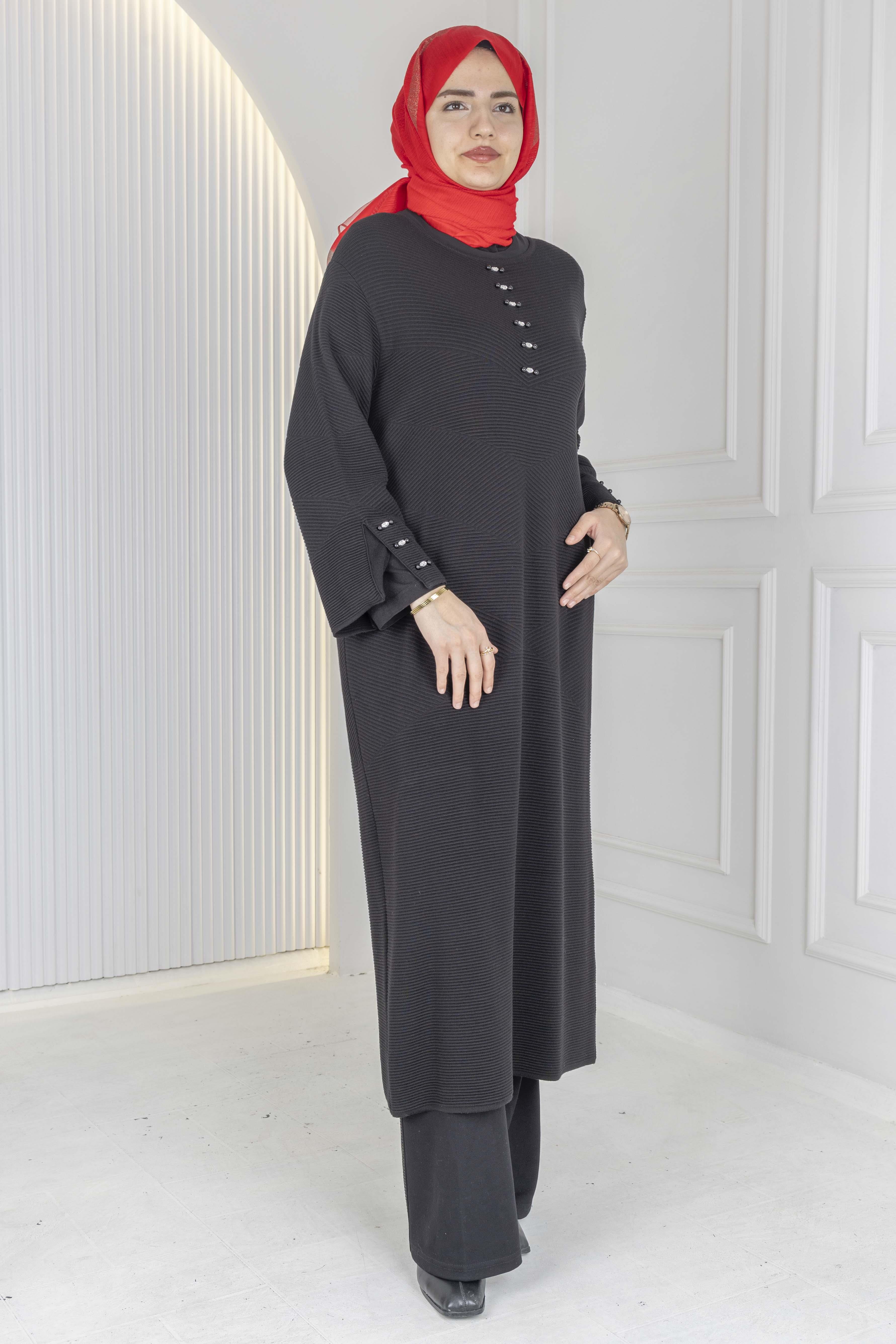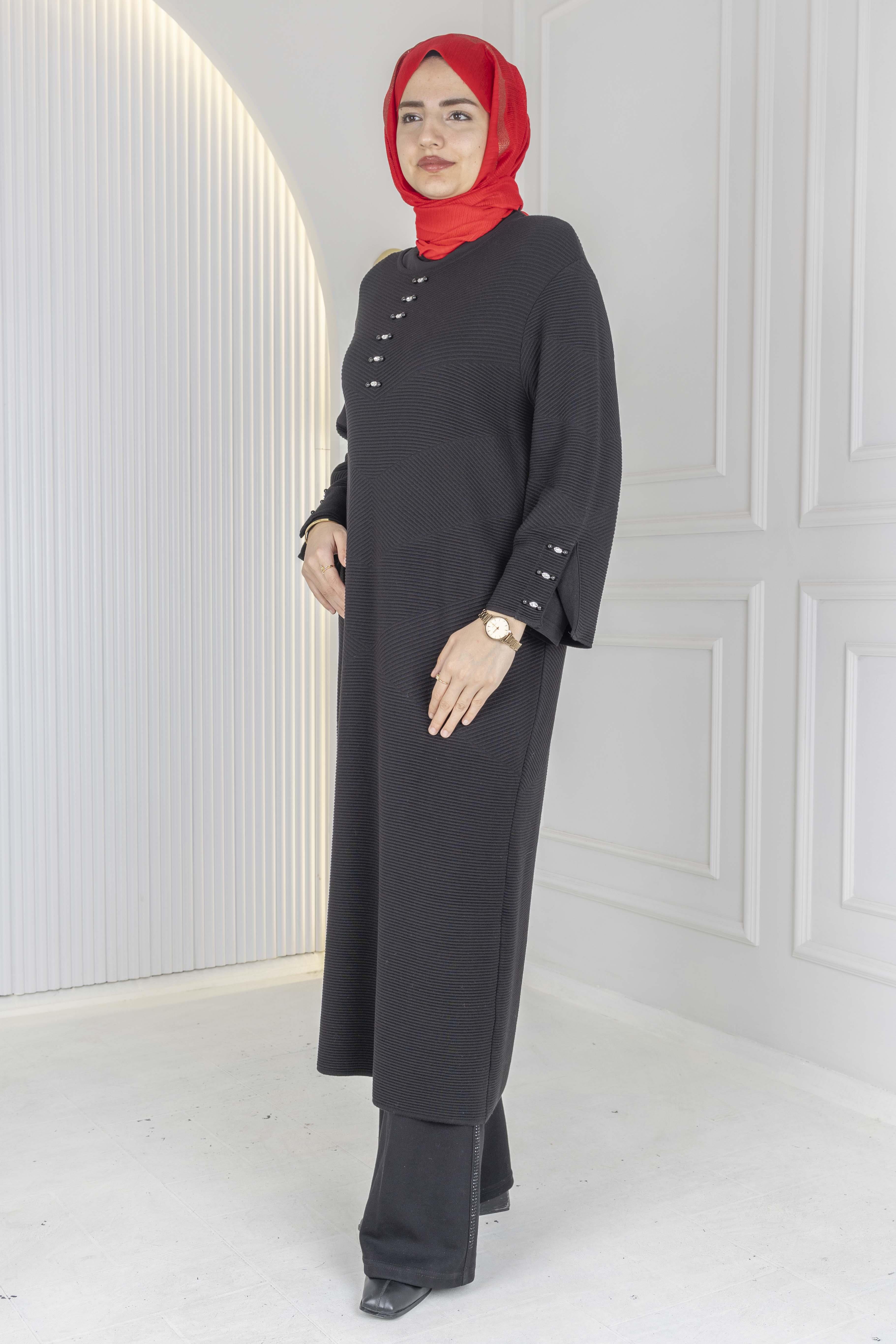 Düğme Detaylı Çelik Örme Uzun Büyük Beden Elbise&Tunik Siyah OTW14436