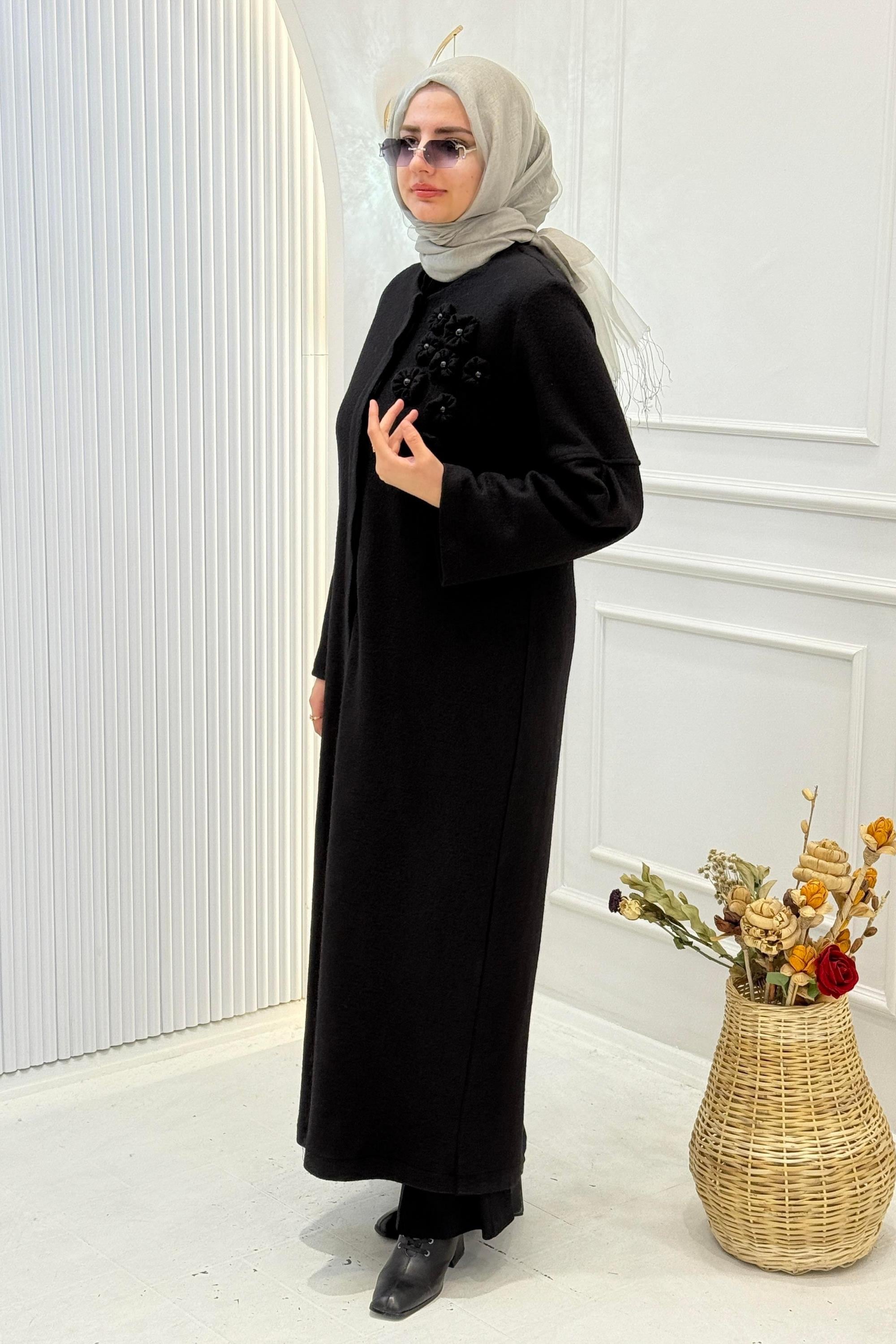 Ön yüzünde yer alan çiçek aplike detayları, feraceye zarif ve feminen bir dokunuş katar. Günlük kullanımda olduğu kadar özel gün kombinlerinde de tercih edilebilecek zamansız bir modeldir.