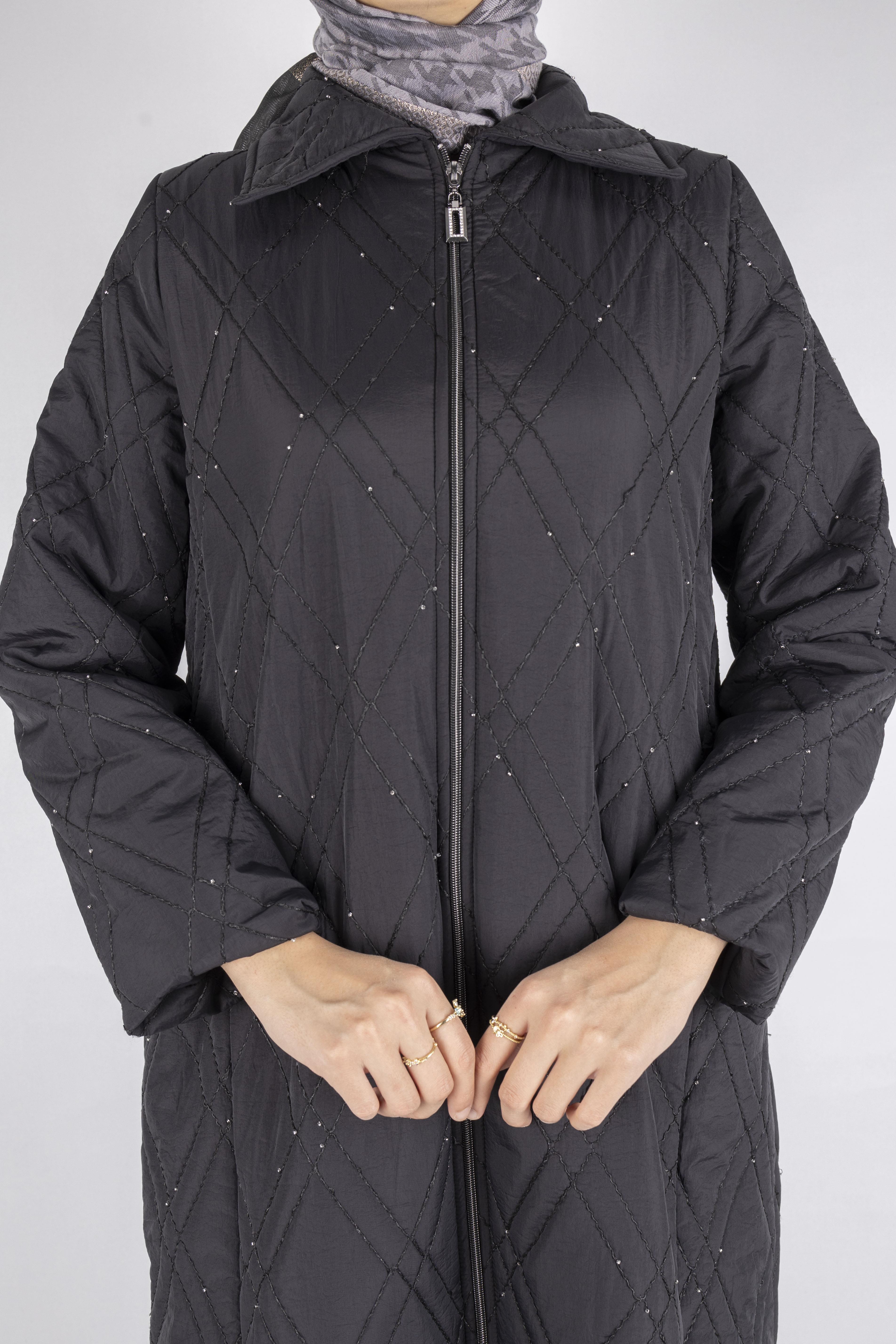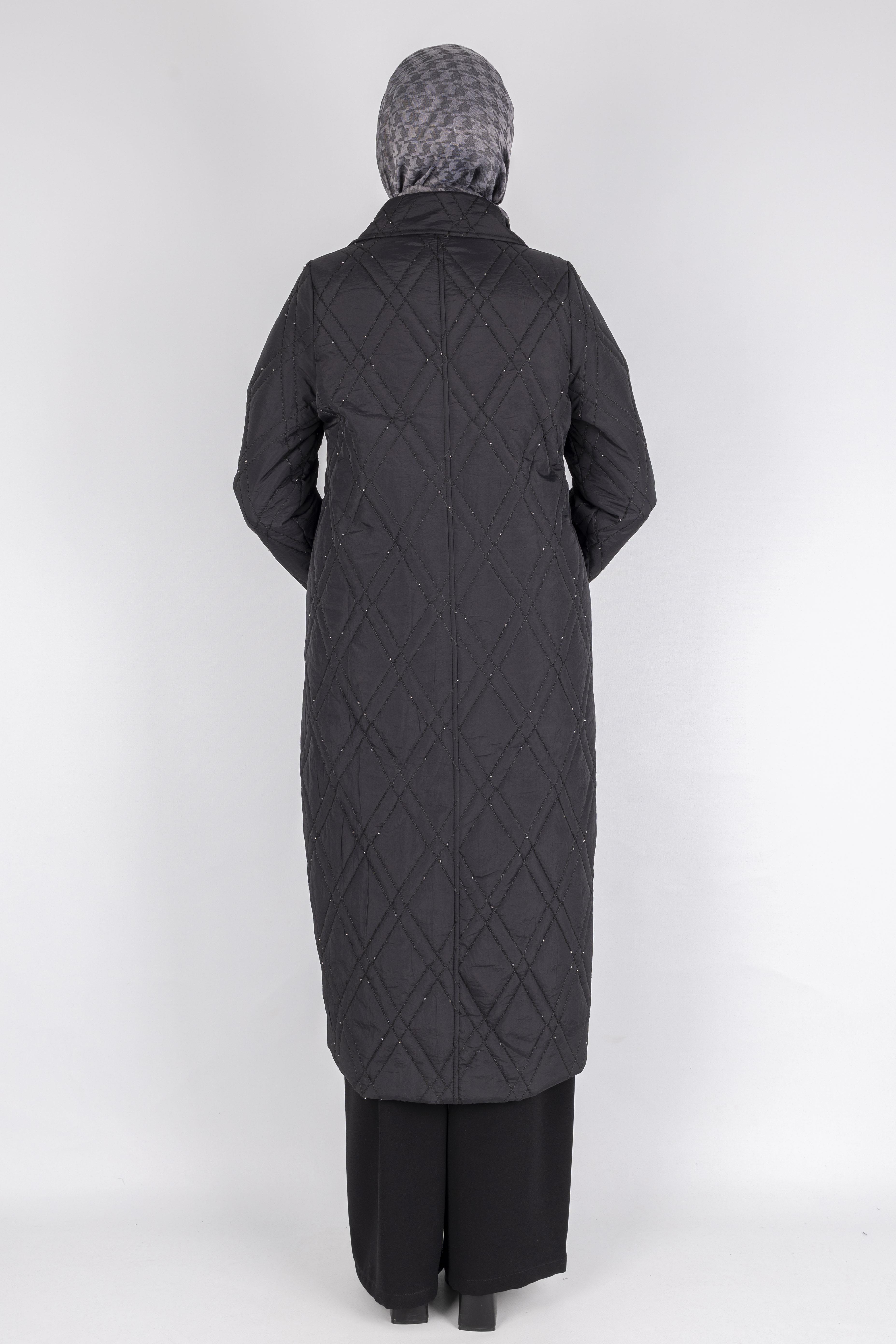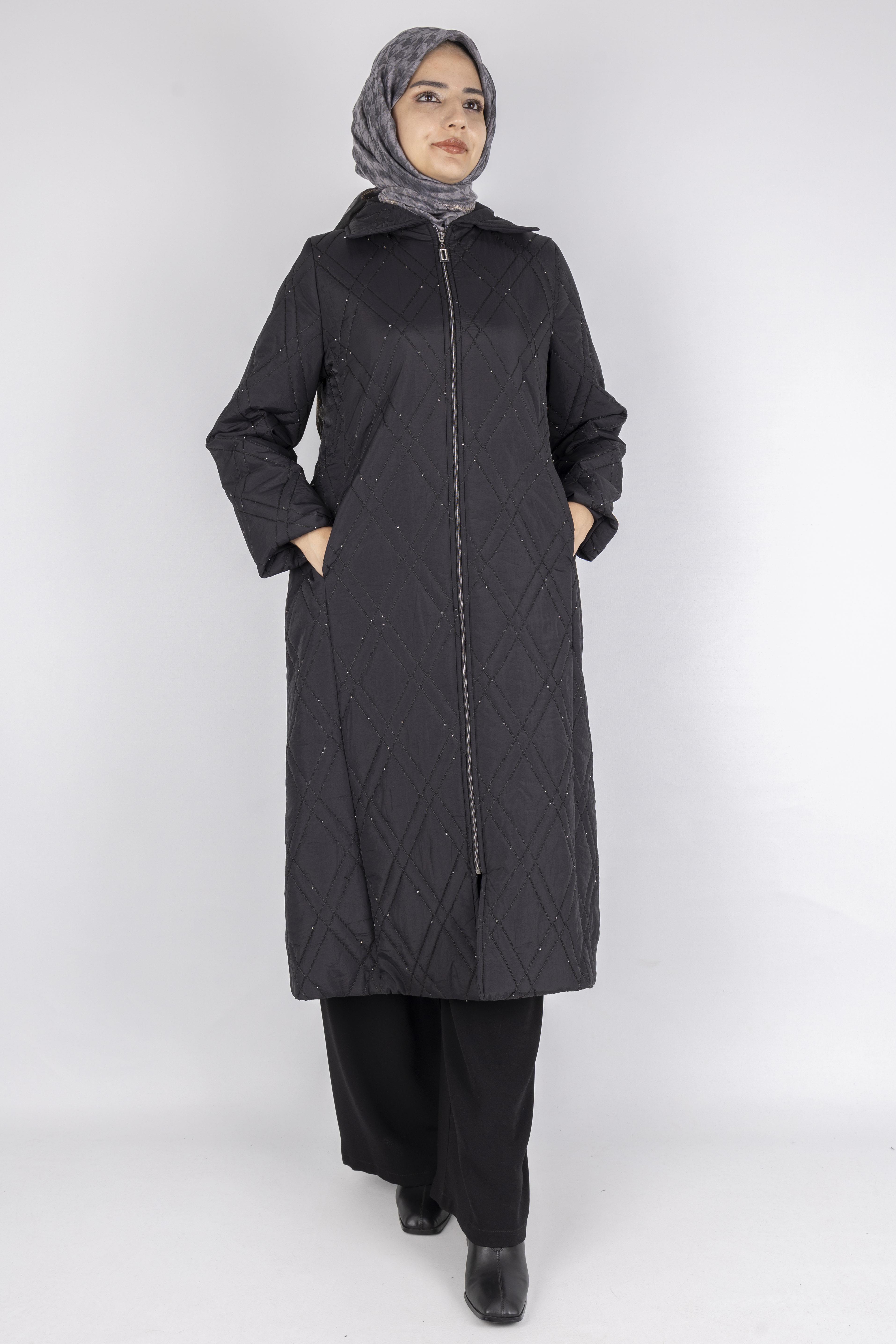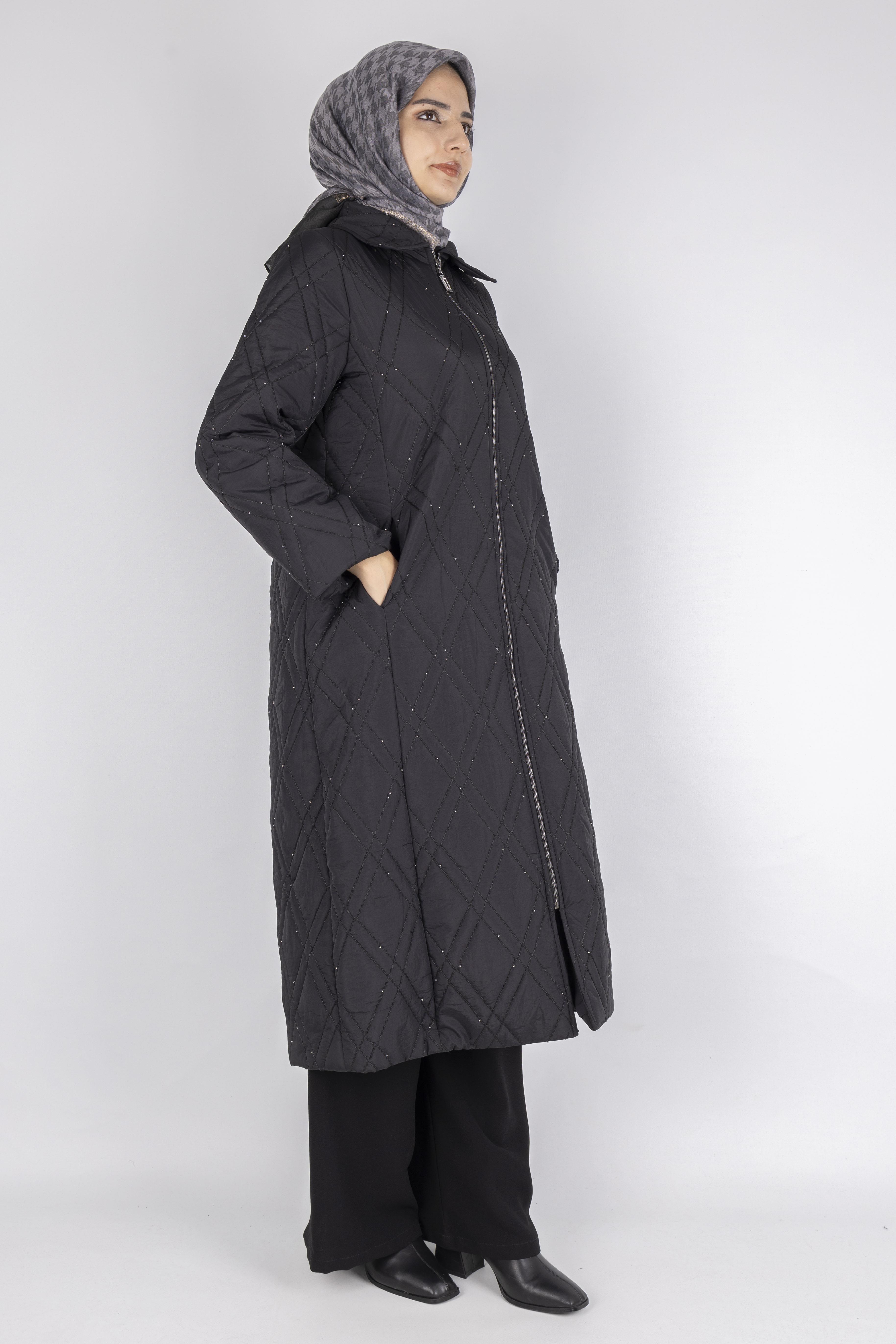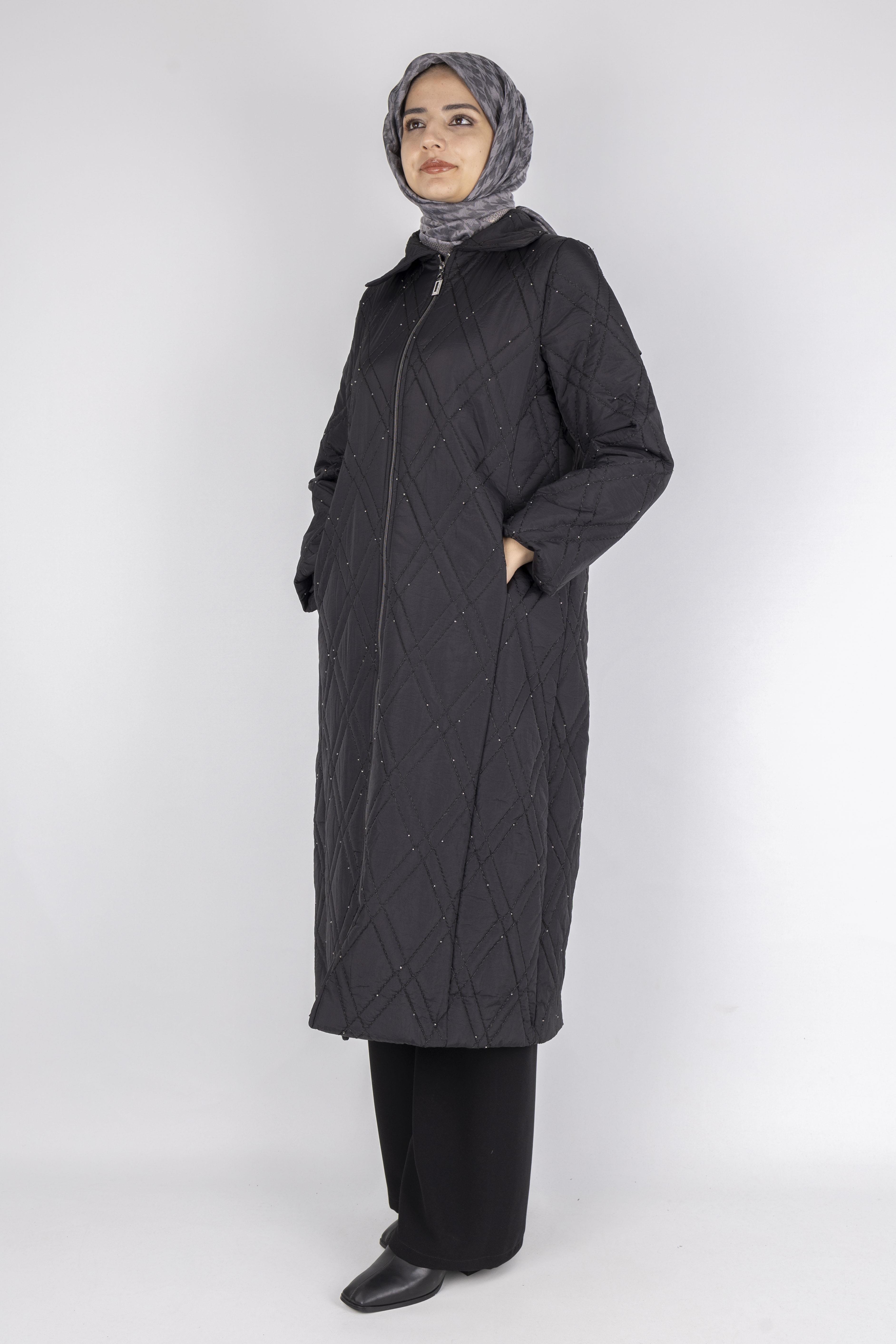 Elmas Kapitone Taş Serpme Fermuarlı Uzun Mont Siyah OTW557