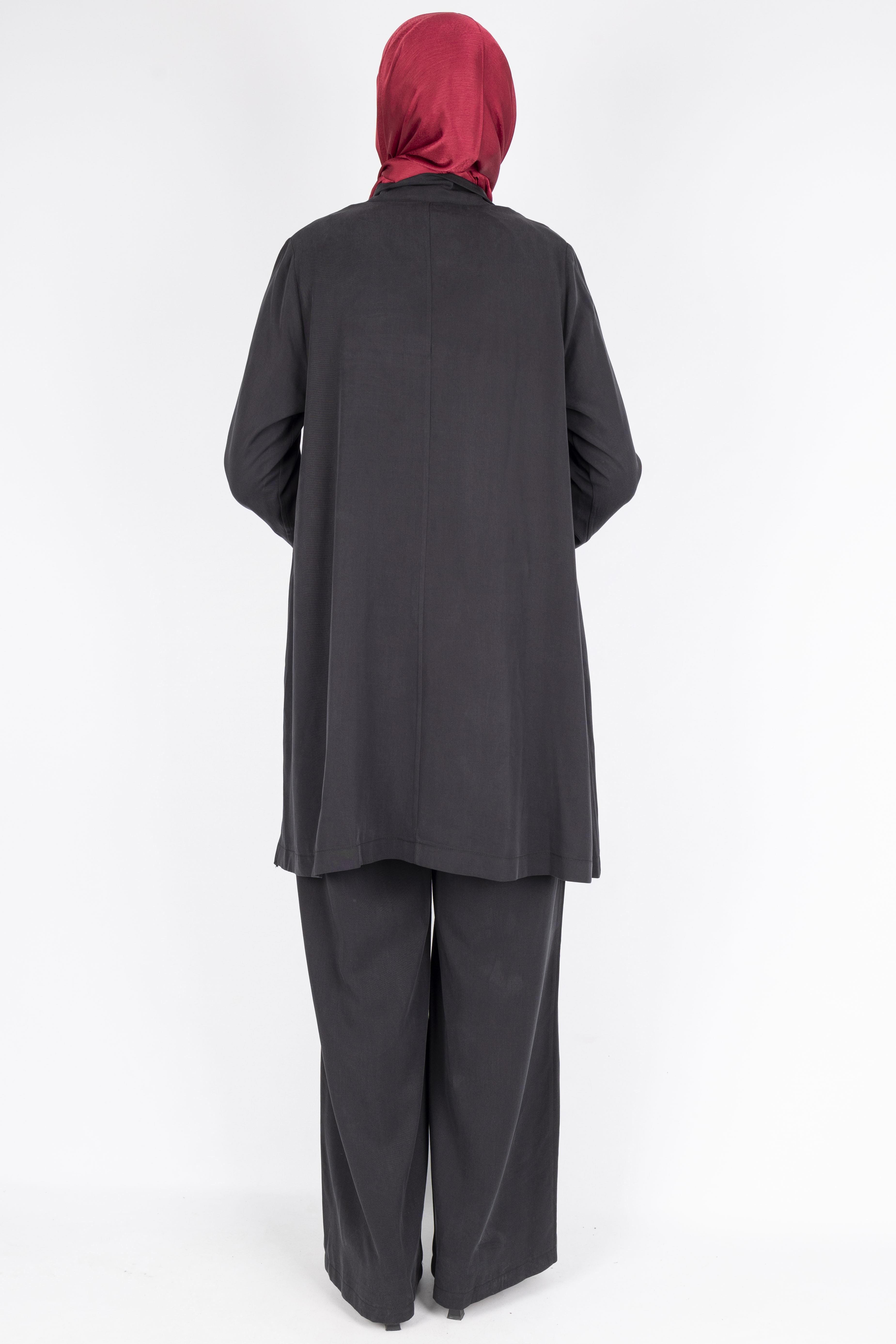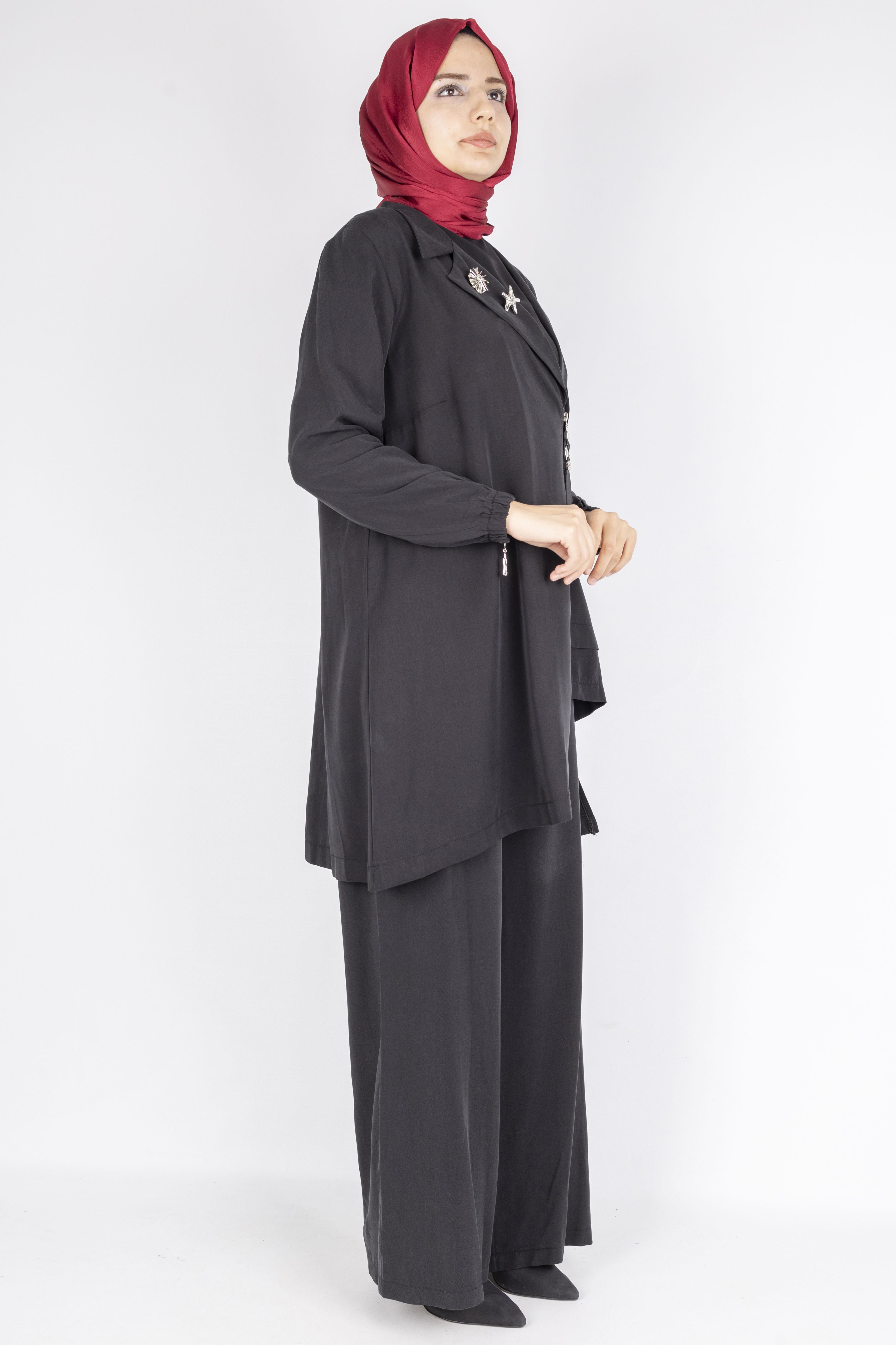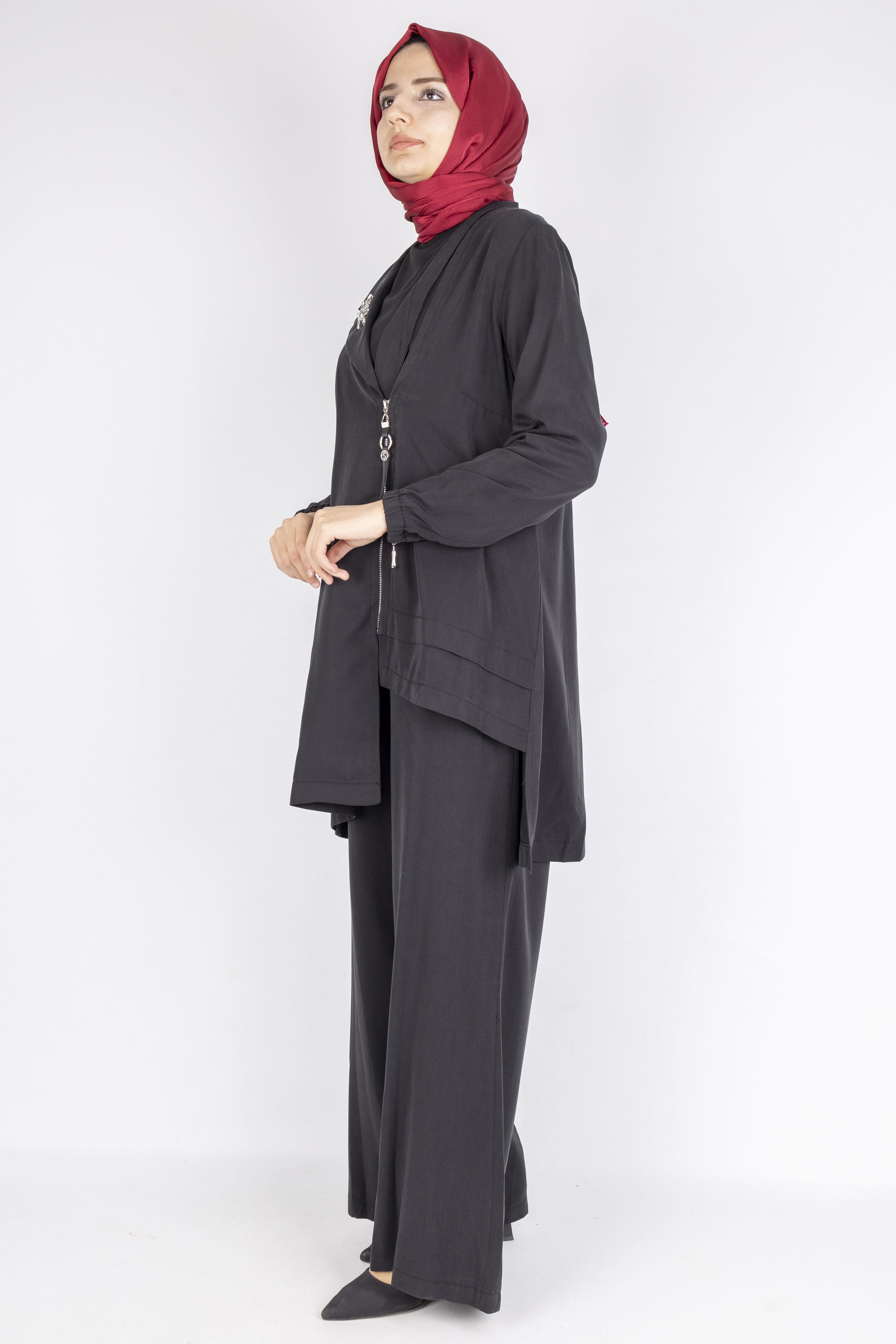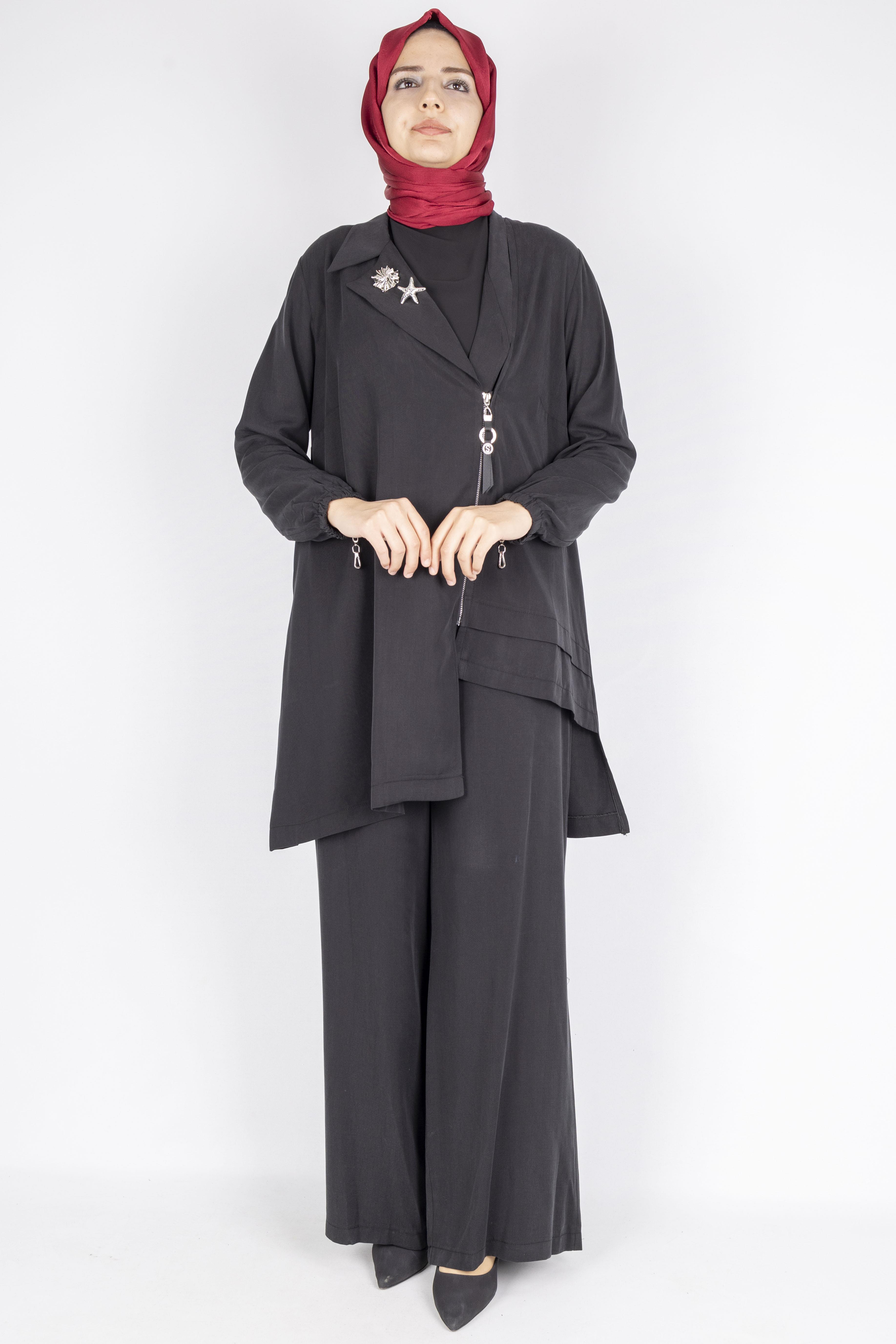 Fermuar ve Broş Detaylı Tunik Pantolon Tesettür İkili Takım Siyah OTW45832