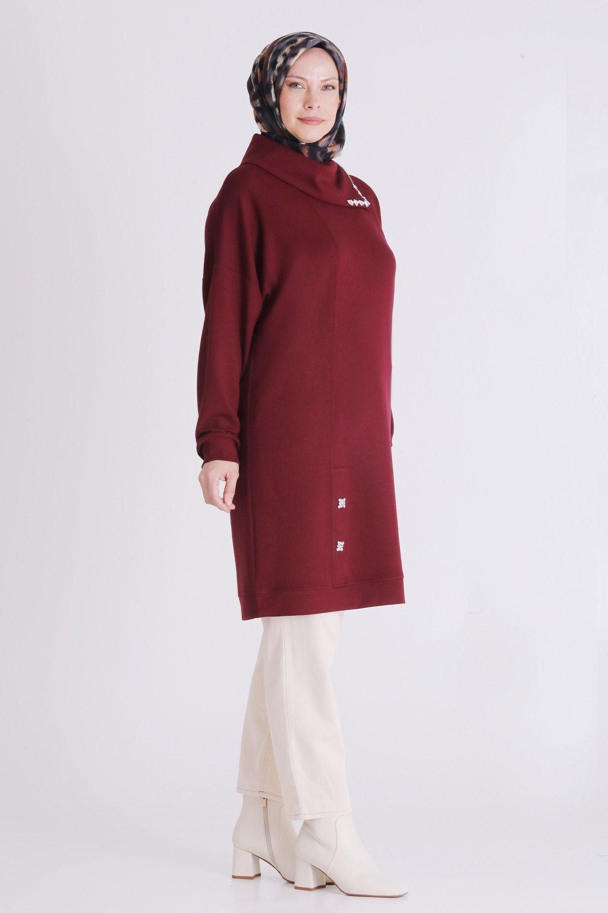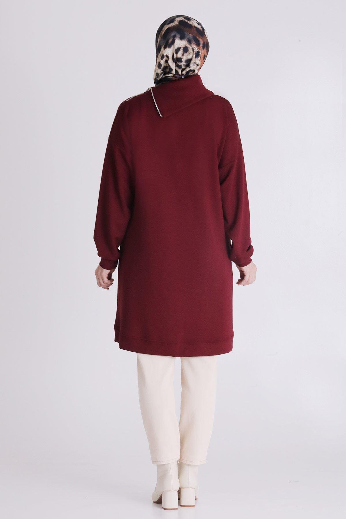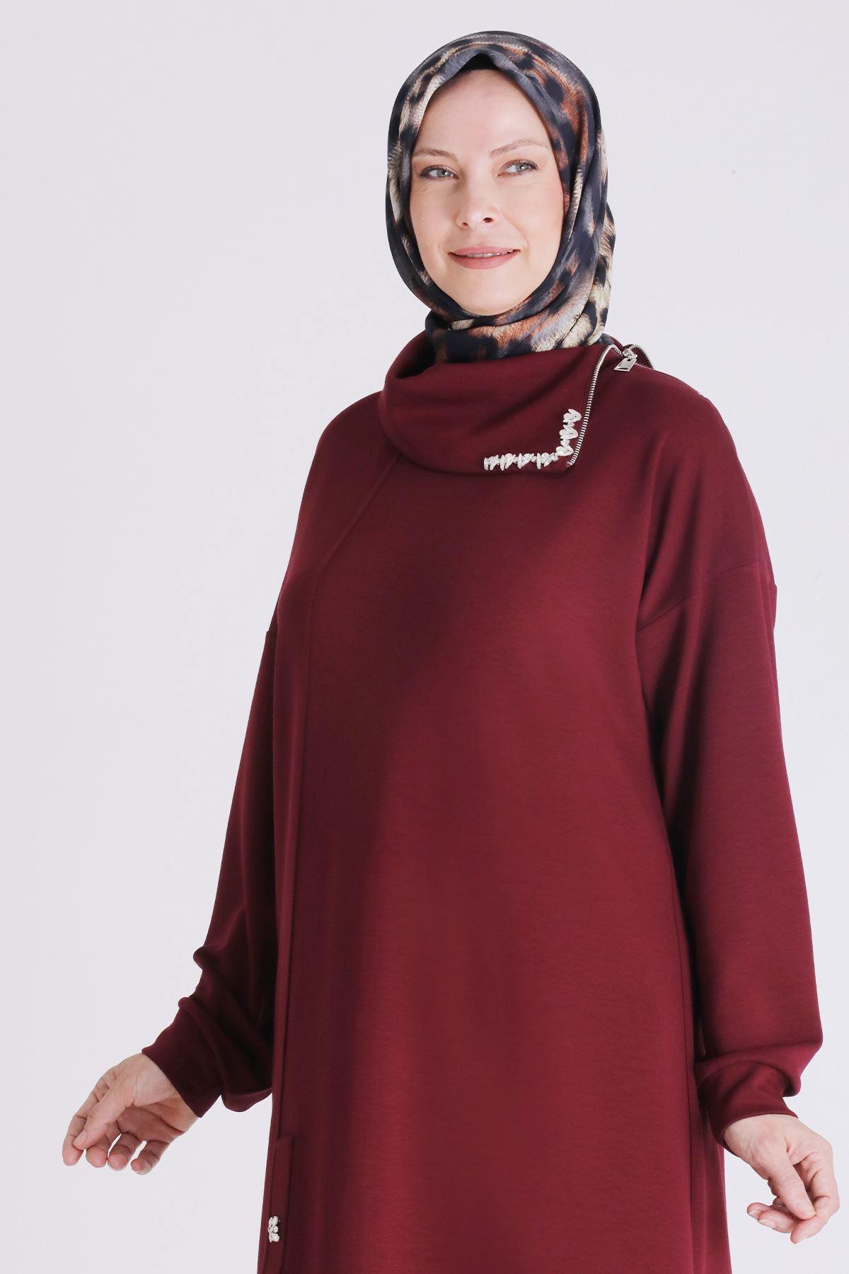 Fermuar ve Taş Detaylı Dik Yaka Tesettür Tunik Vişne OTWV2065