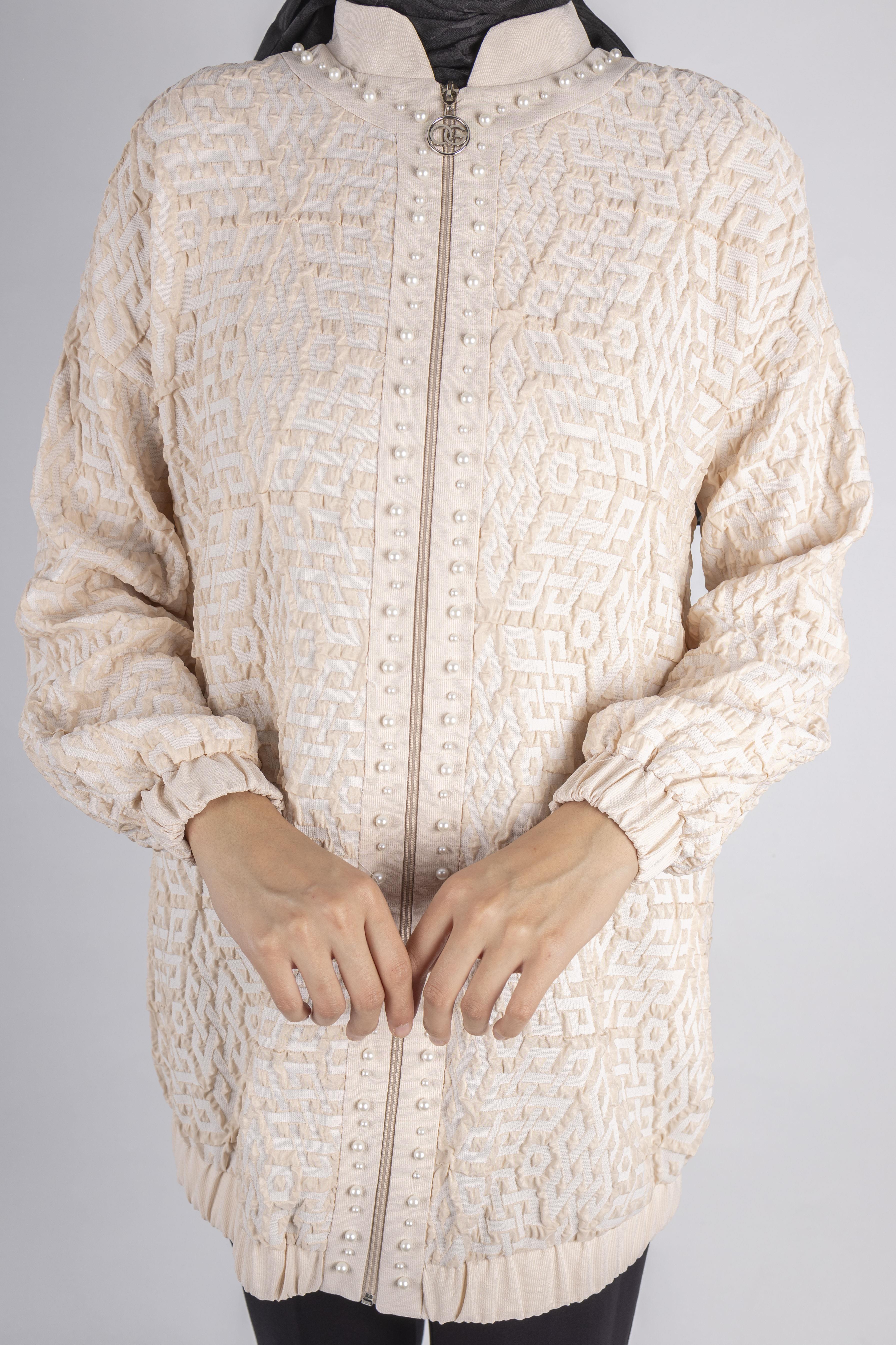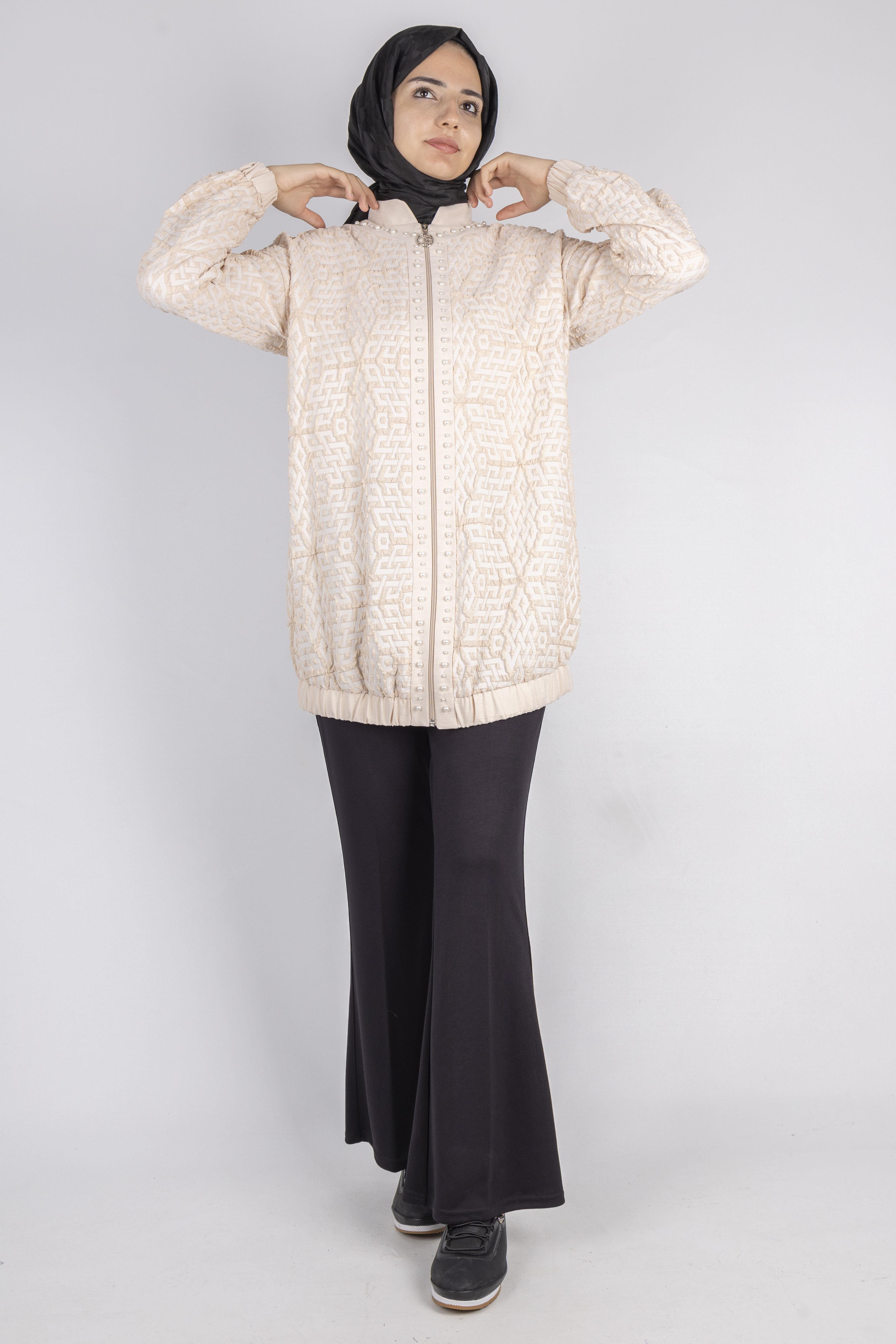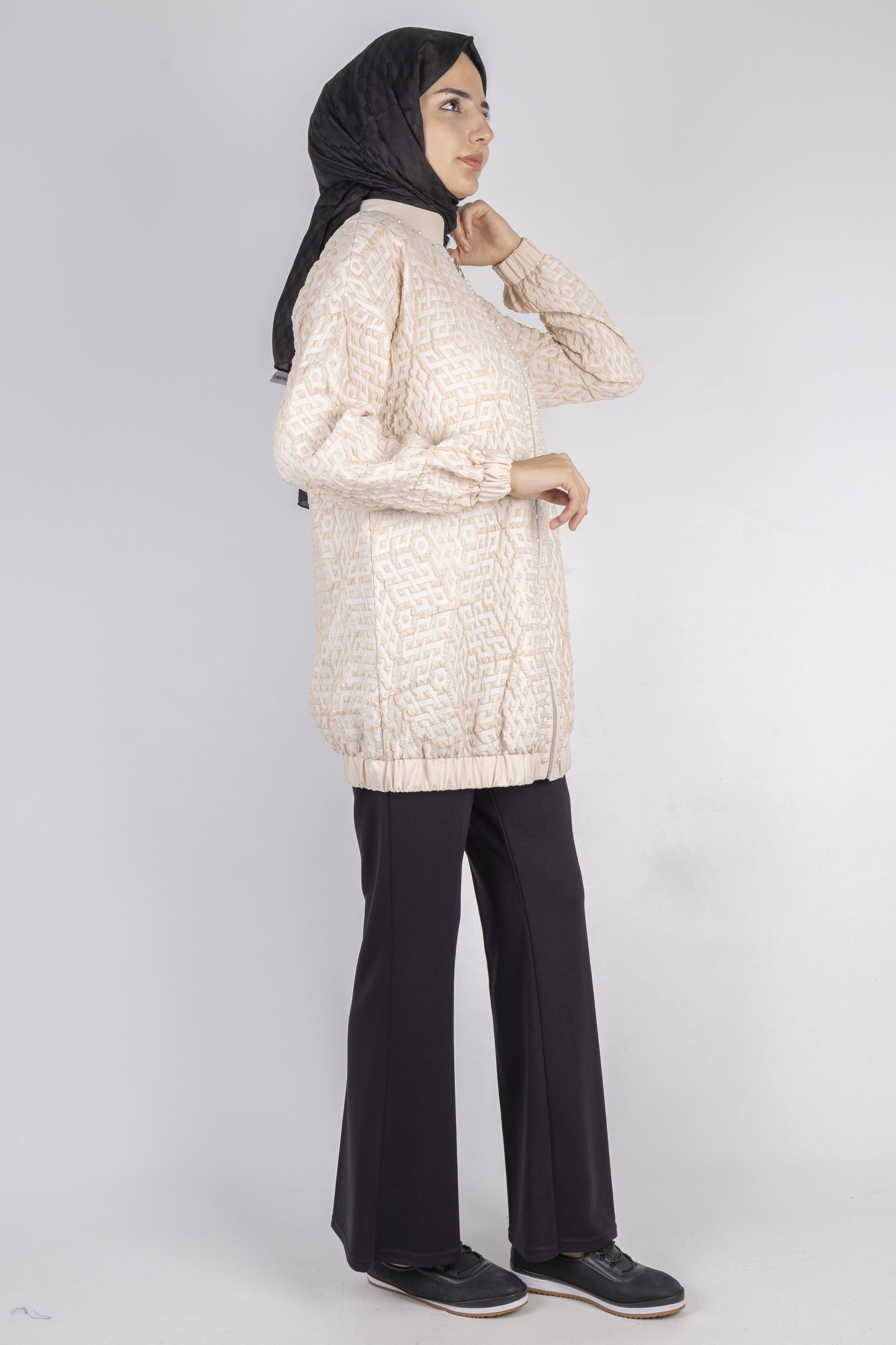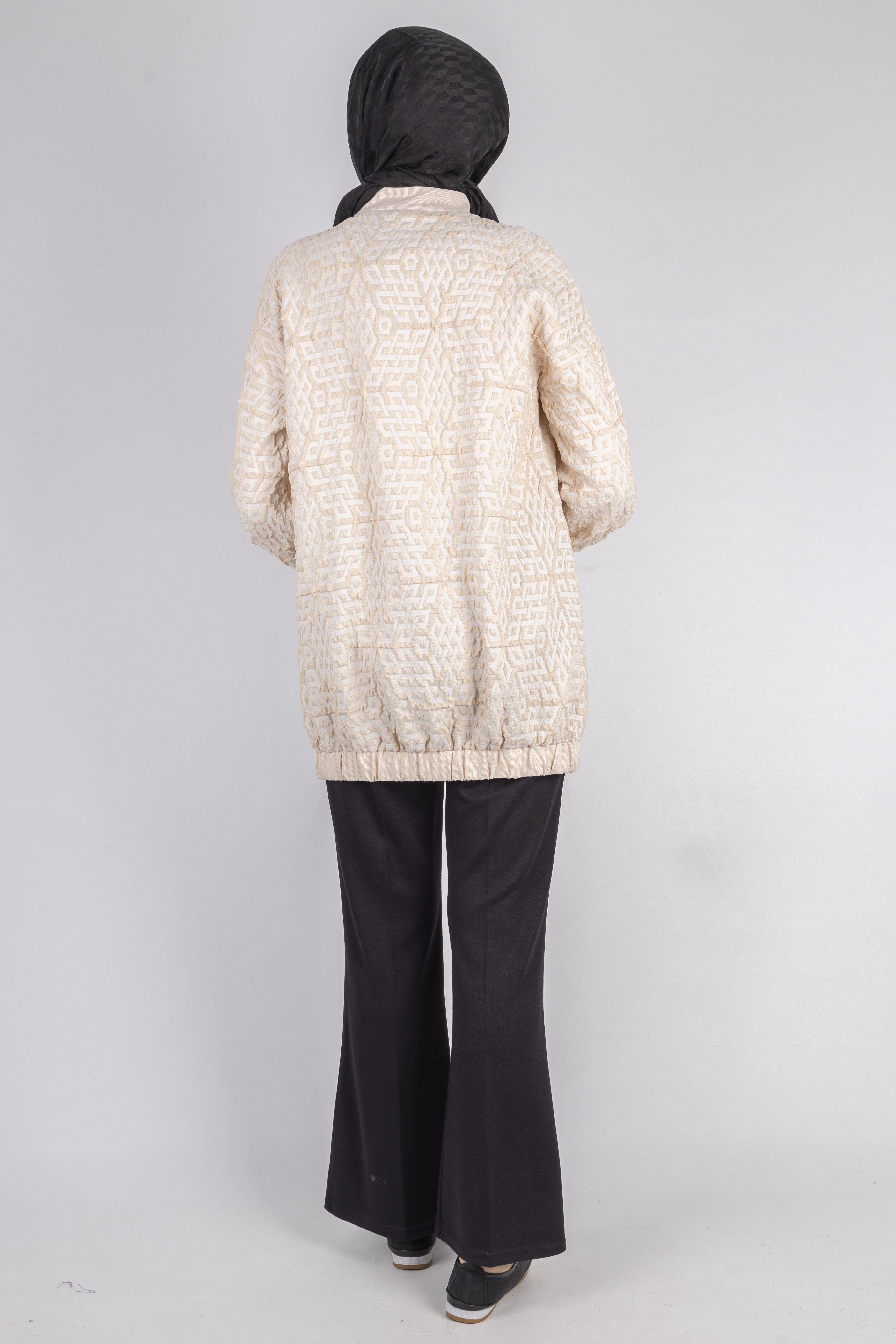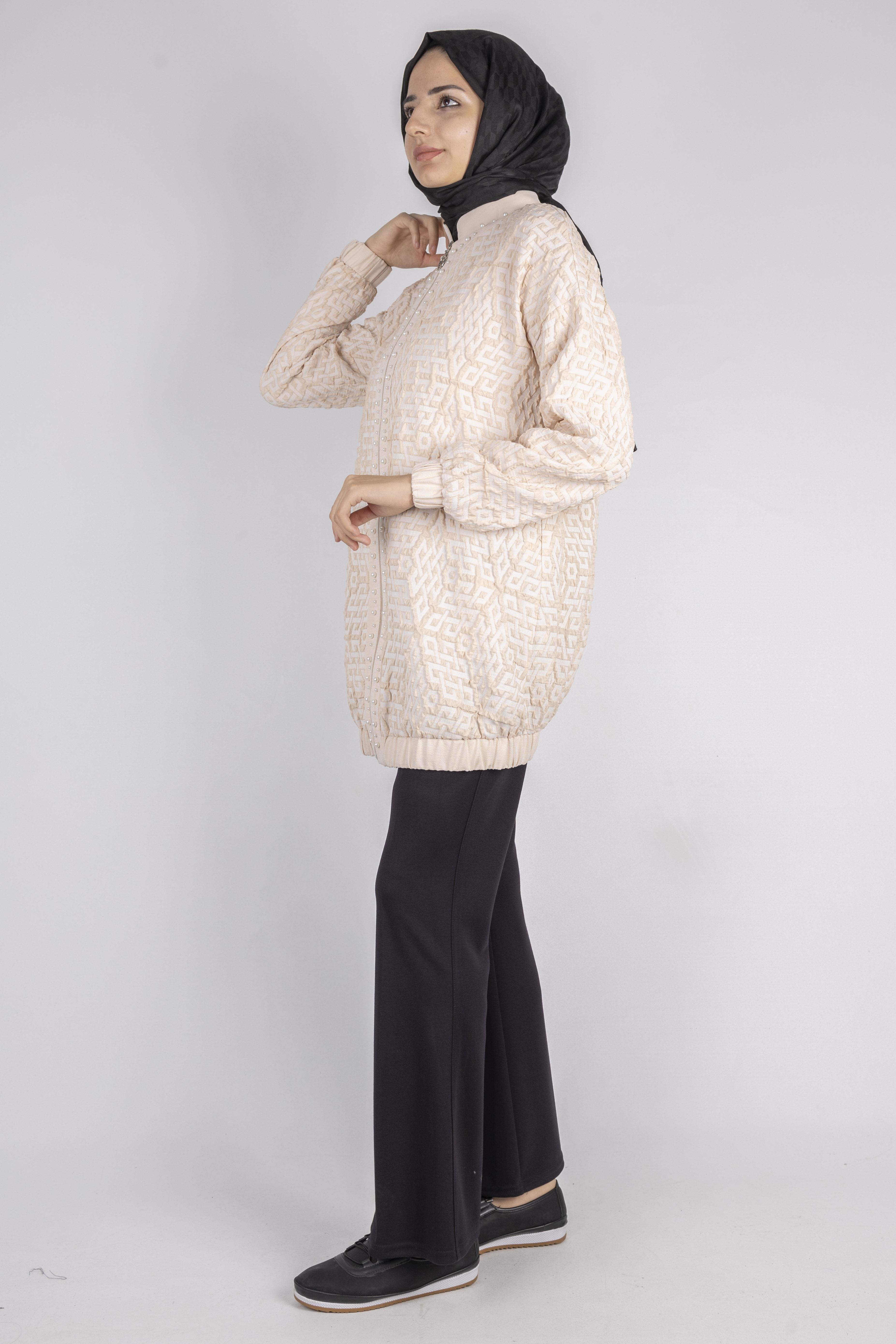 Desenli kumaşı ve modern görünümüyle öne çıkan bu astarsız ceket, hafif yapısıyla dört mevsime yakın kullanım sunar. Fermuarlı kapanışı pratiklik sağlarken, rahat kesimi vücudu sarmadan dökümlü durur. Pantolon, etek veya elbiselerle kolayca kombinlenebilen tek parça şık bir dış giyim alternatifidir.