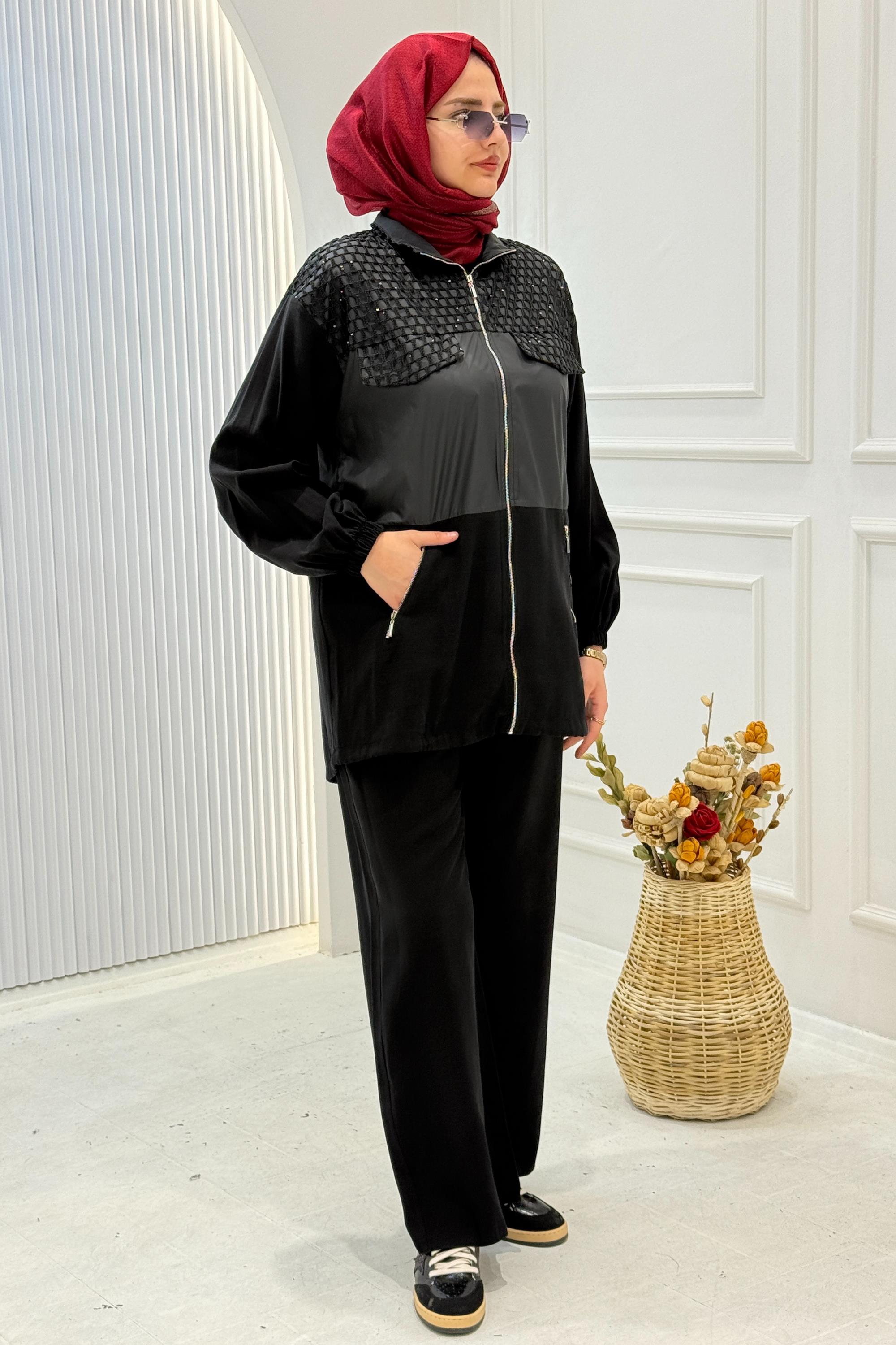 Modern file detaylı üst tasarımı ve rahat kesim pantolonu ile tasarlanan bu pantolonlu takım, günlük ve spor şık kombinler için ideal bir tercihtir.