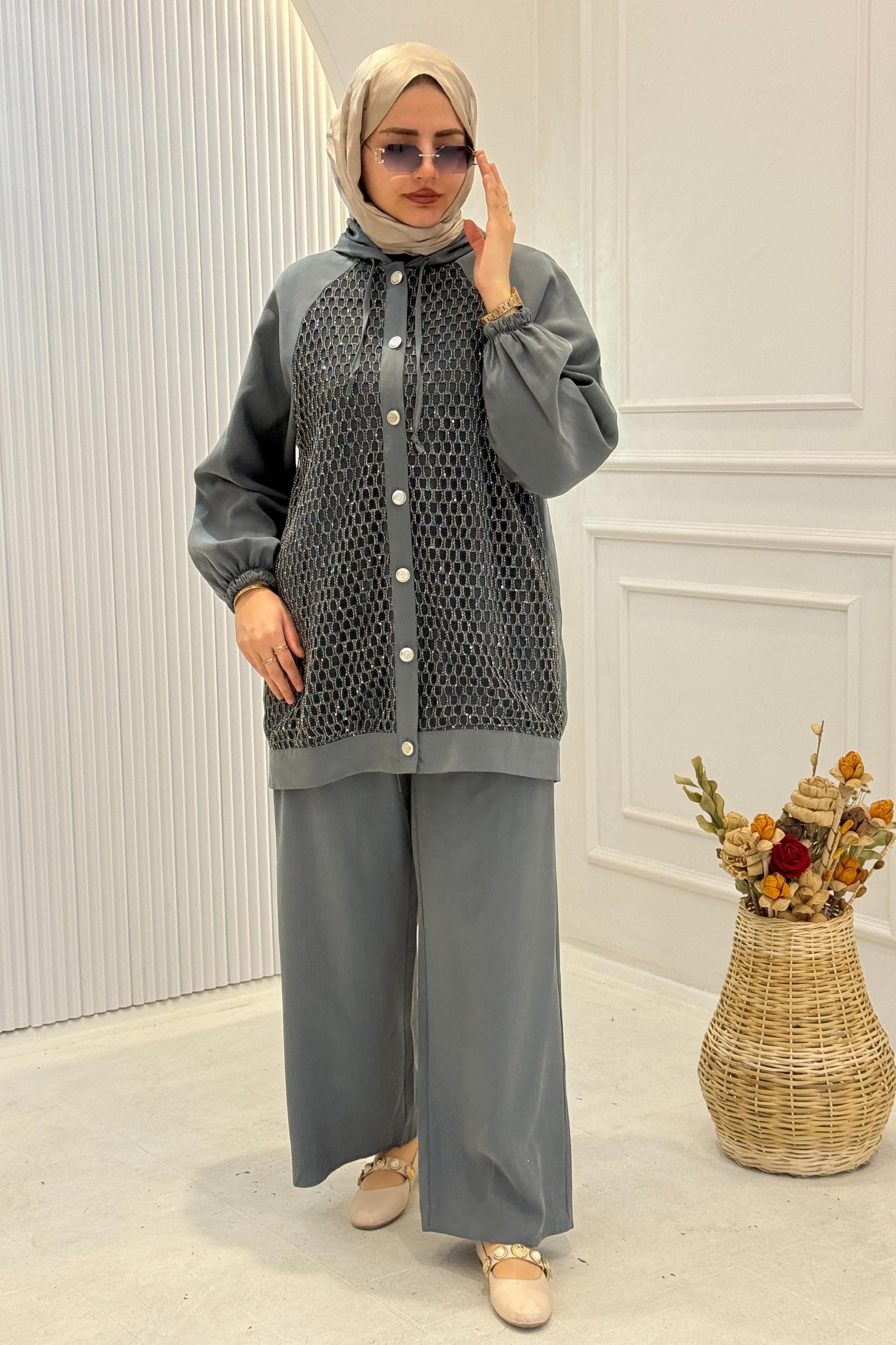 File detaylı tunik modeli takıma hareket ve şıklık kazandırırken, pantolon vücuda yapışmadan rahat bir kullanım sunar.