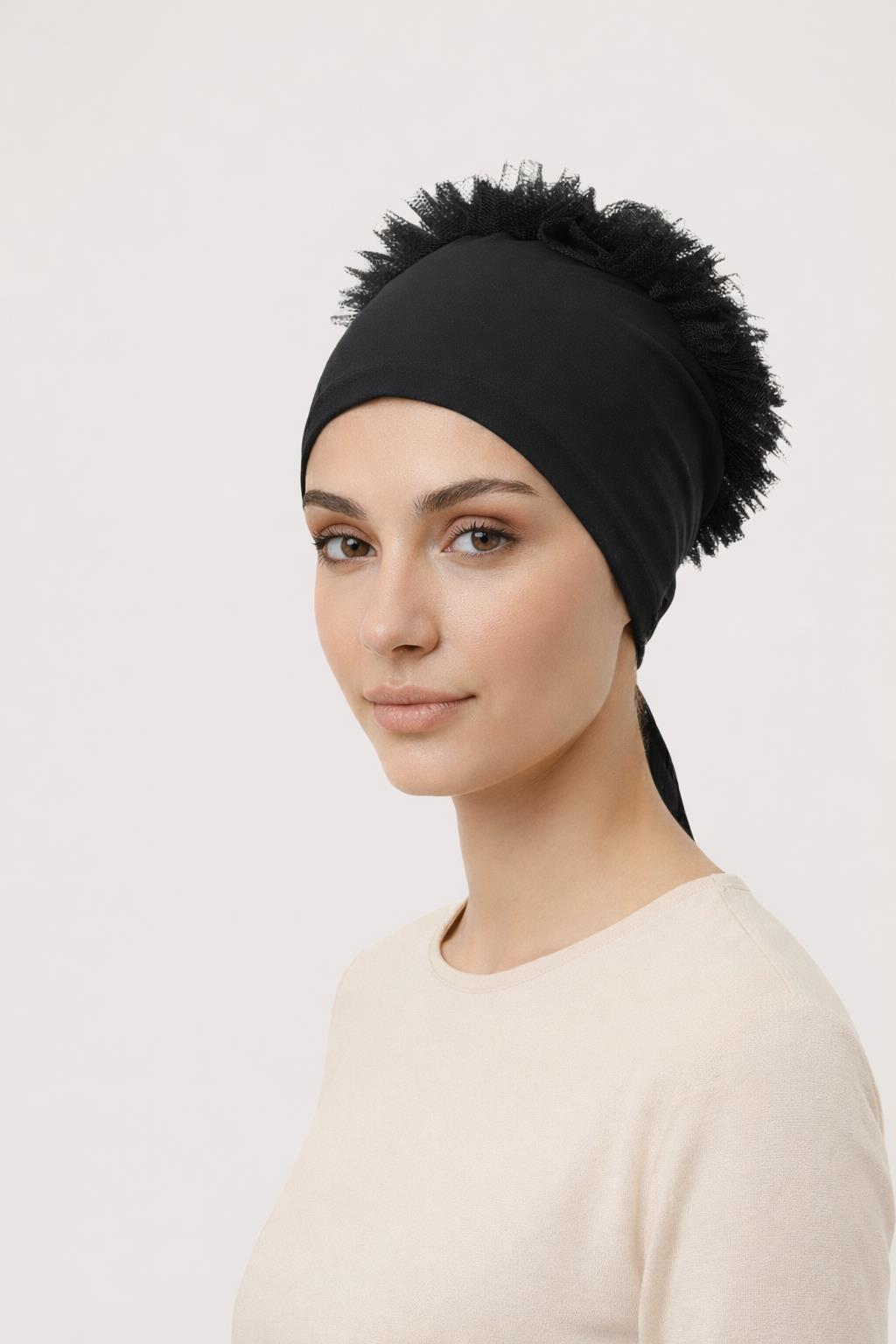 Yumuşak ve esnek penye kumaşı ile başı sıkmaz, nefes alır ve konforlu bir kullanım sunar. Fırfırlı tasarımı sayesinde topuz görünümü düzgün olur; şal ve eşarp altında kabarıklık yapmadan şık durur.