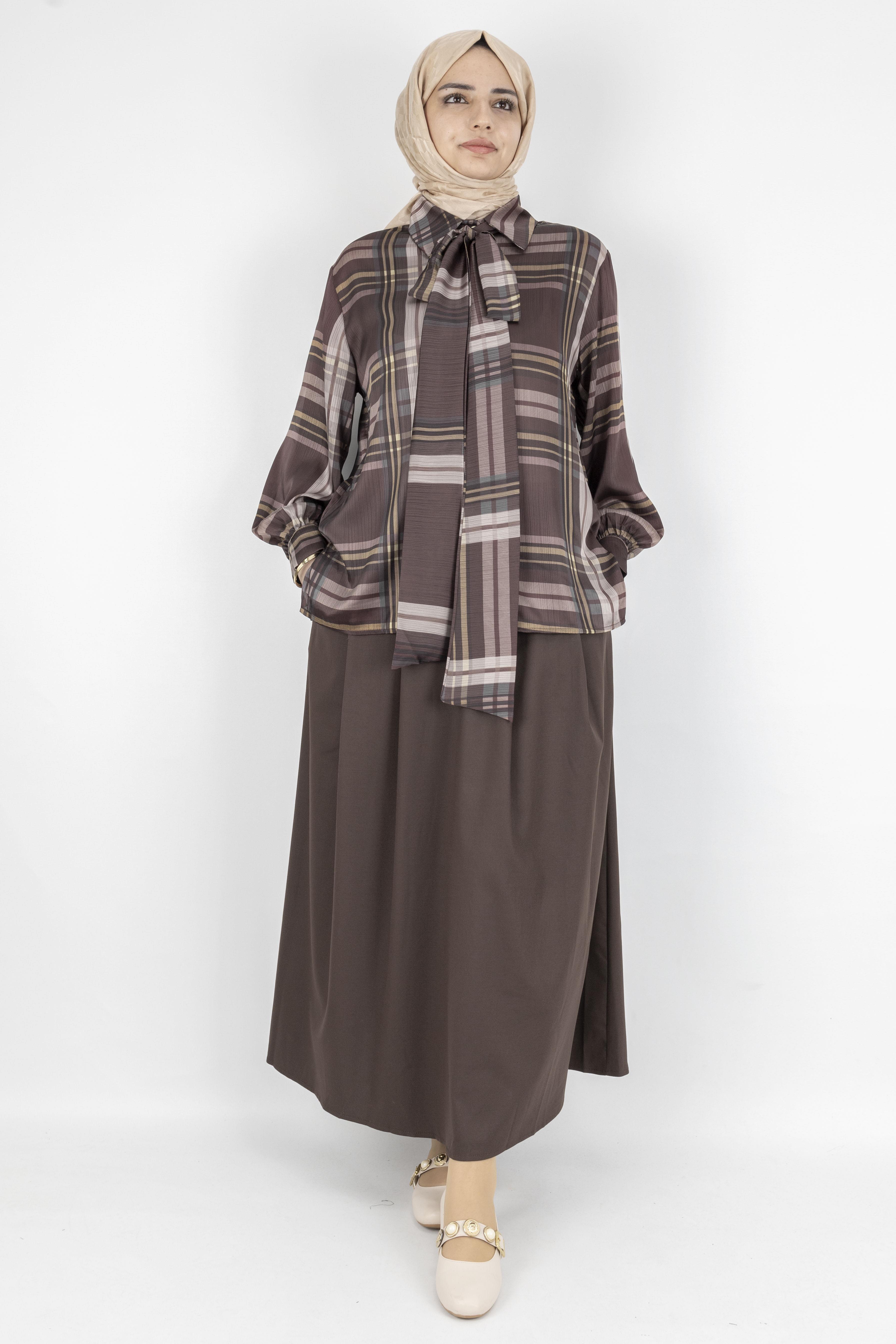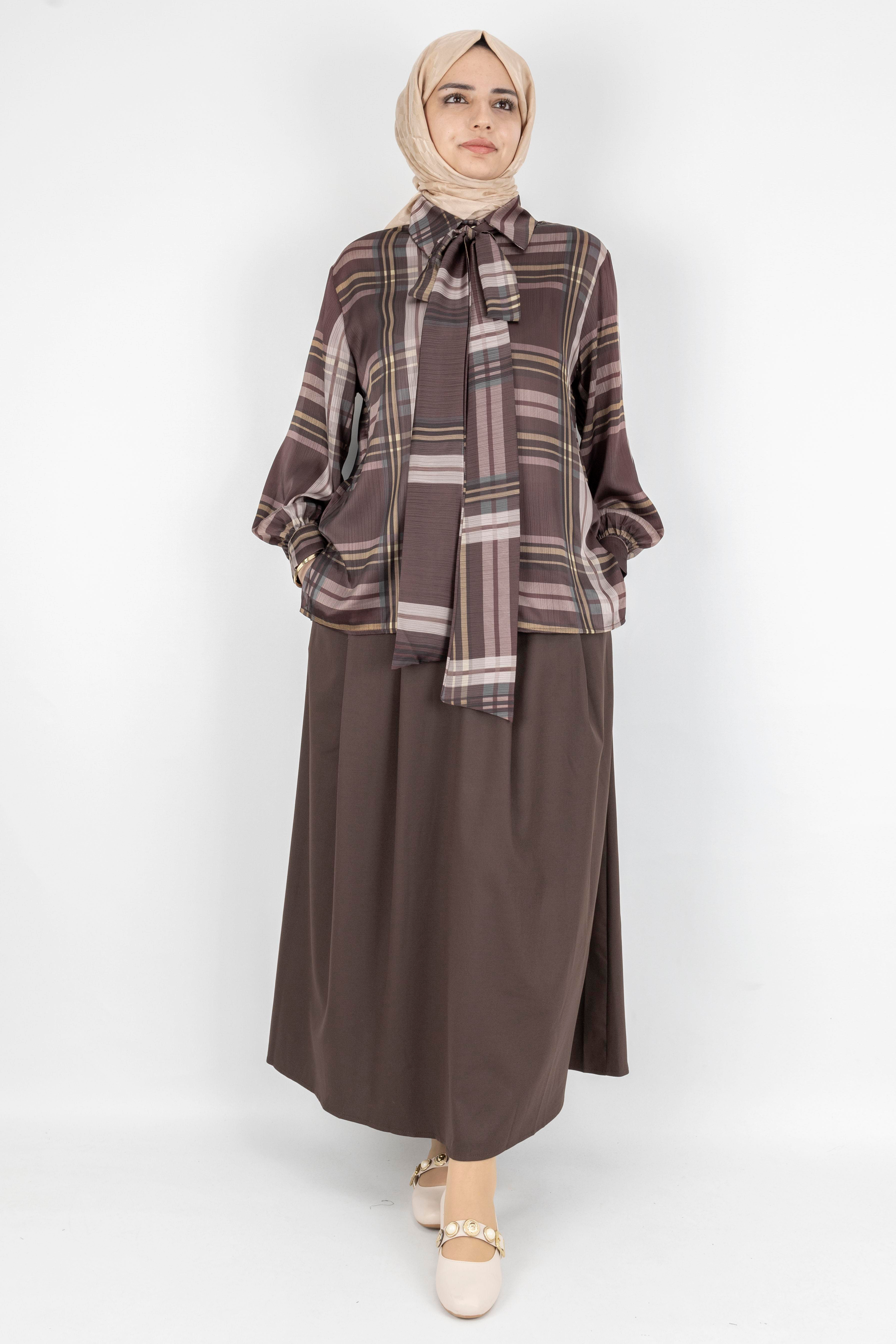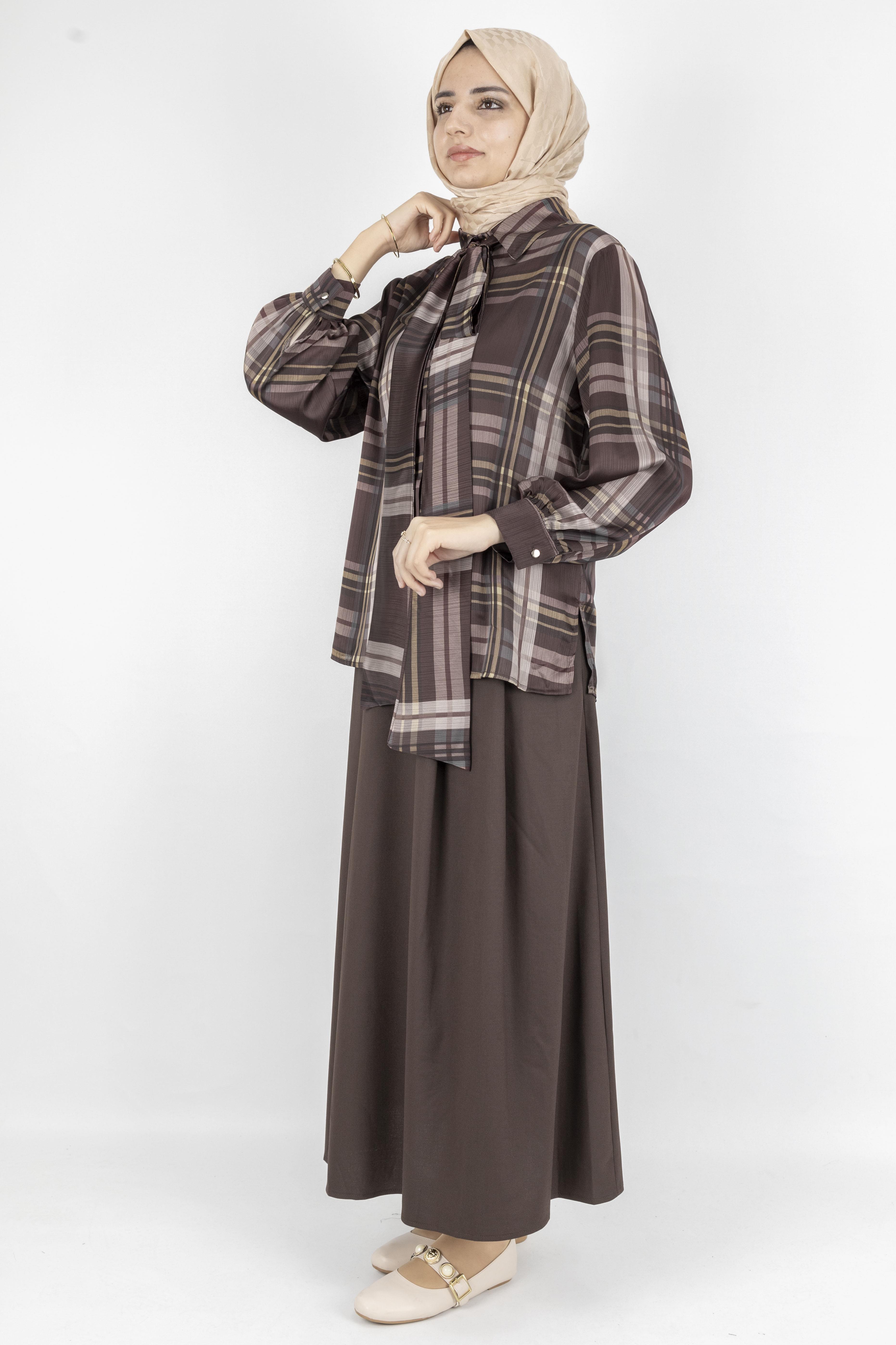 Fular Detaylı Kare Desen Bluz ve Uzun Etek Tesettür Takım Kahve OTW8576