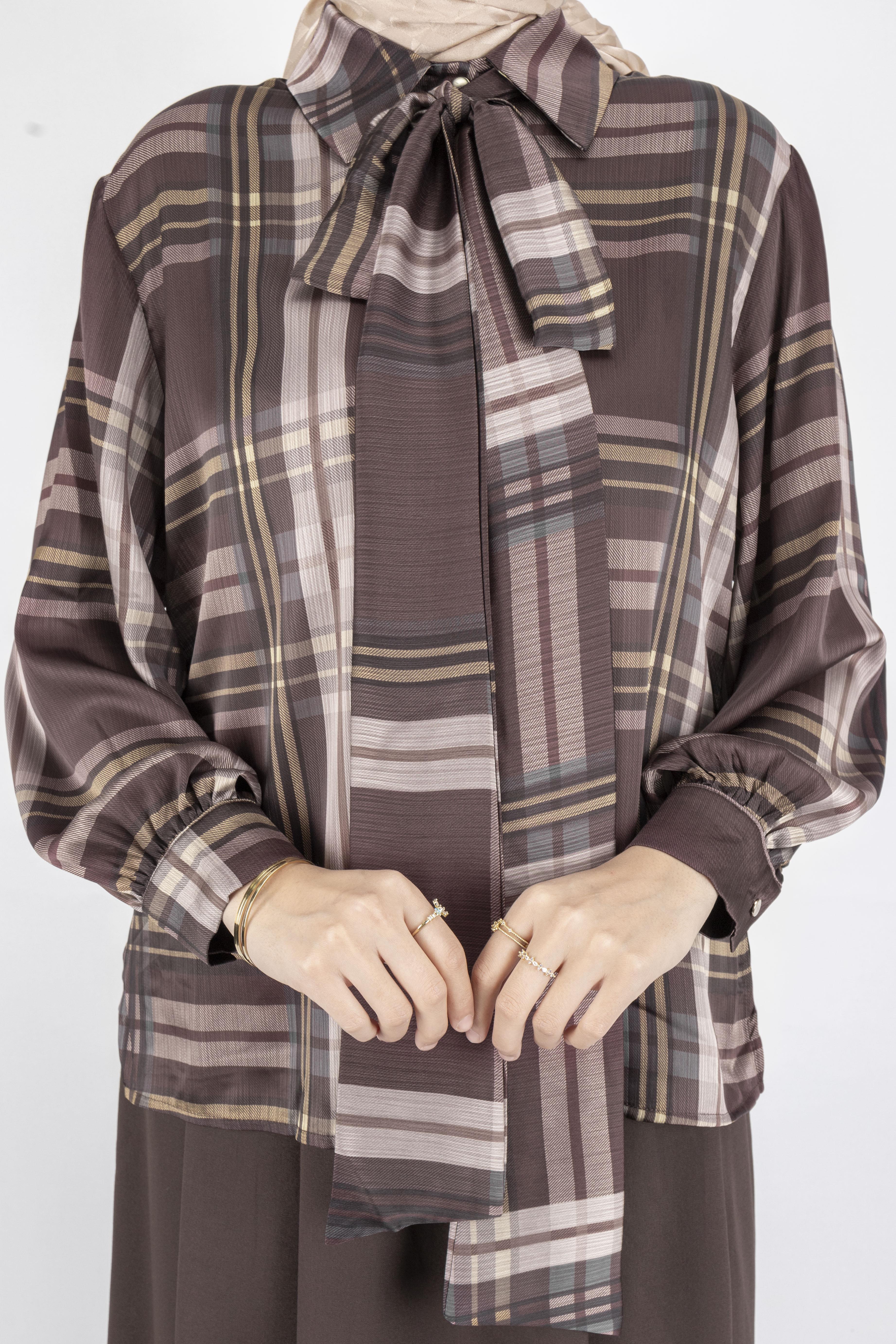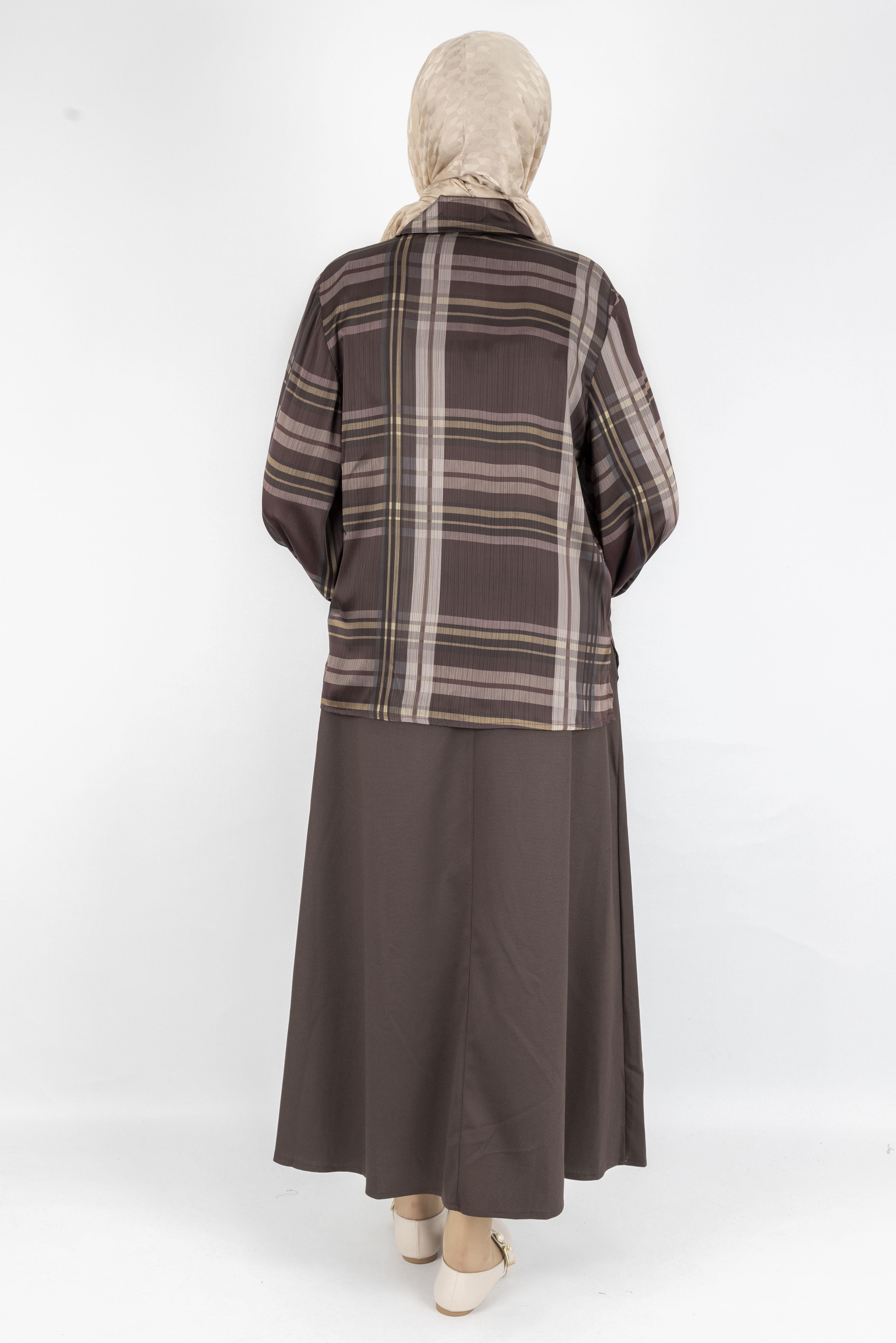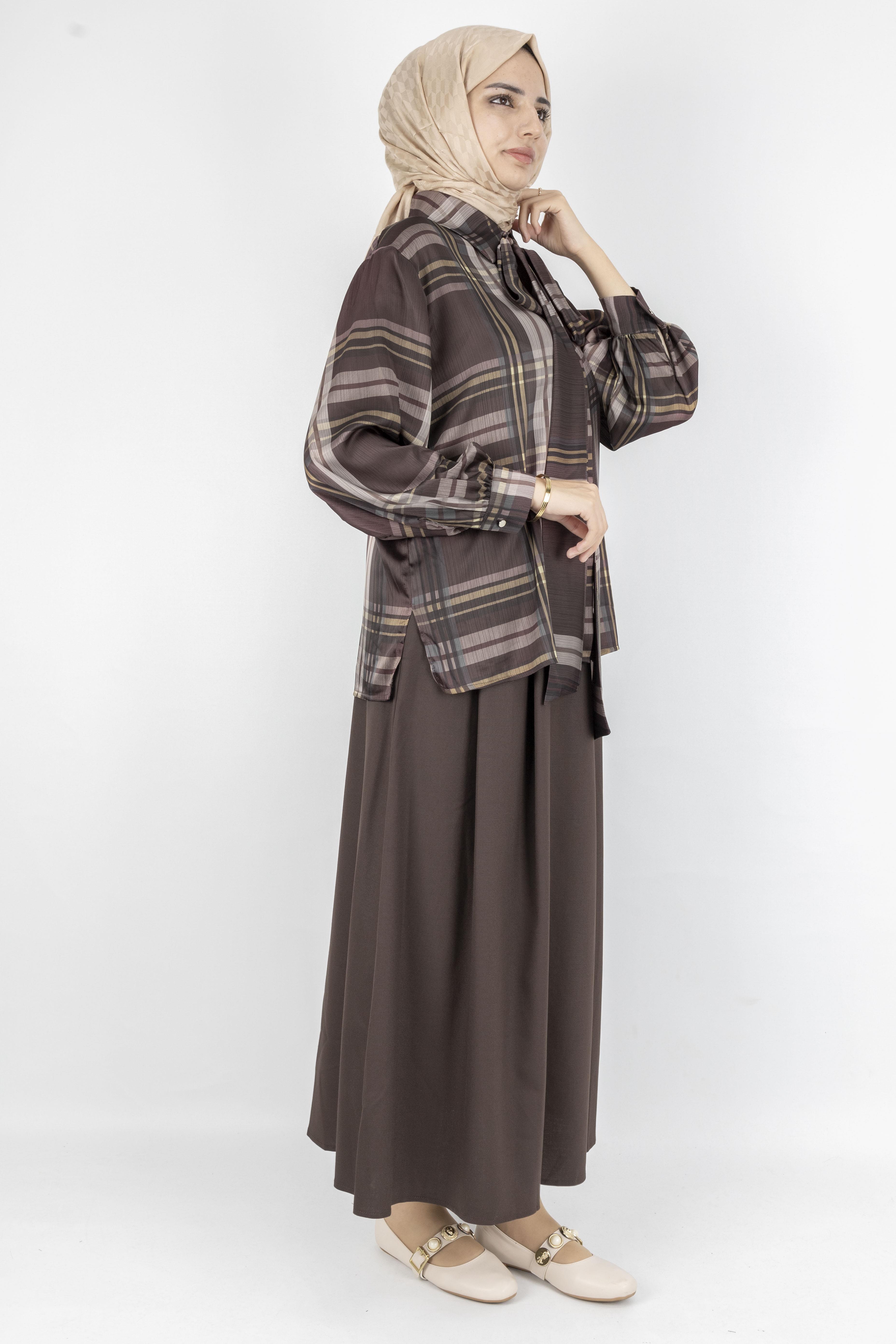 Fular Detaylı Kare Desen Bluz ve Uzun Etek Tesettür Takım Kahve OTW8576