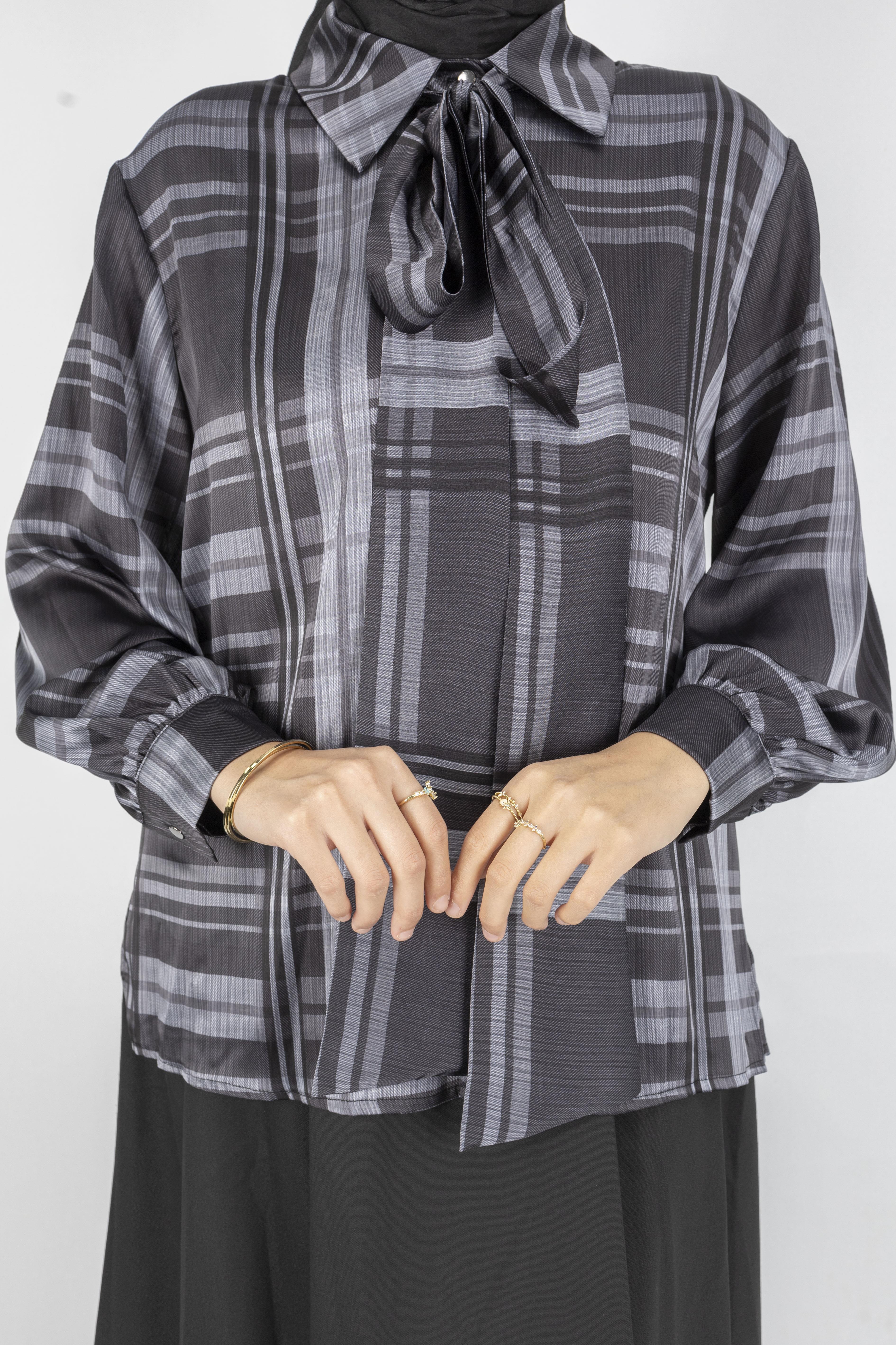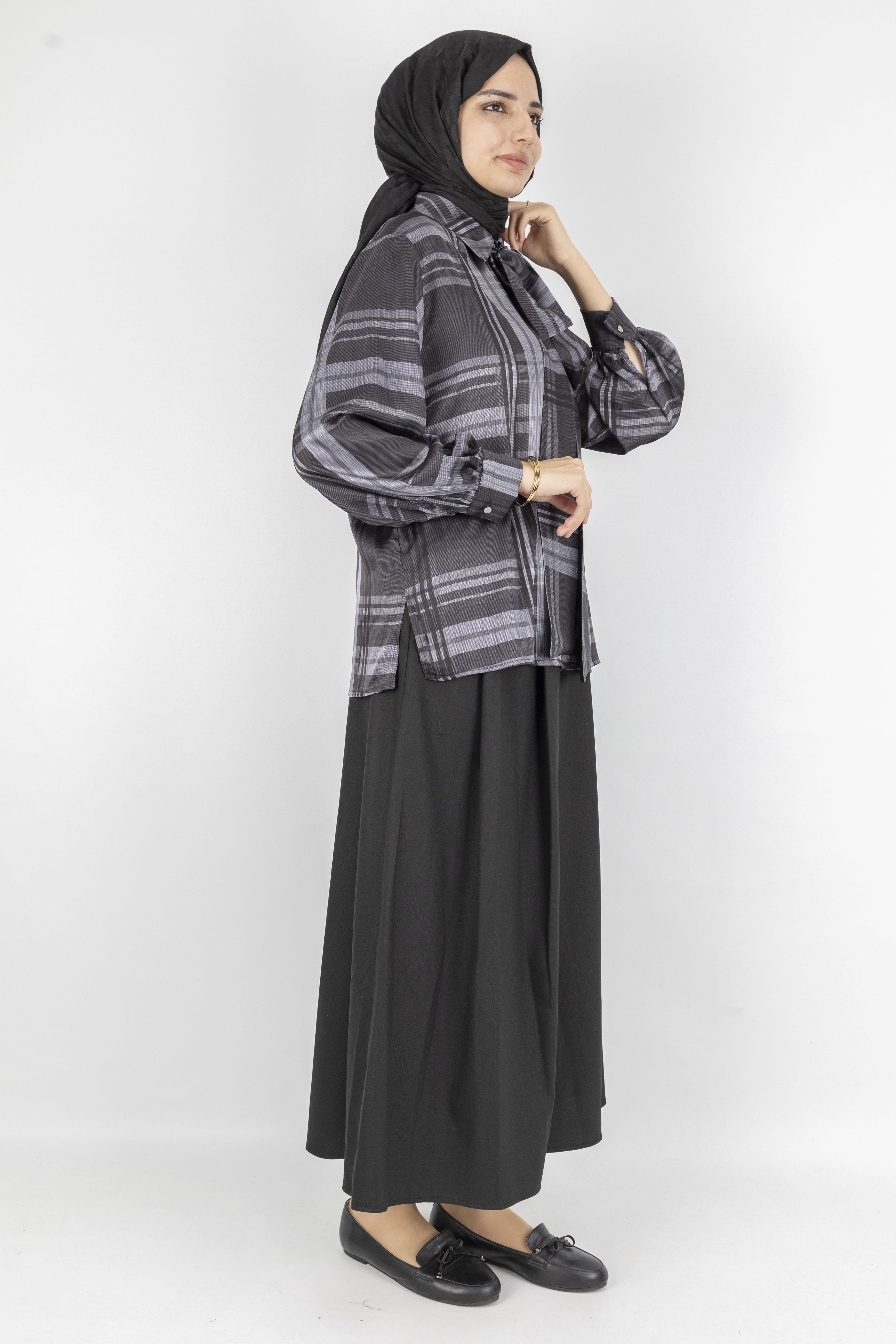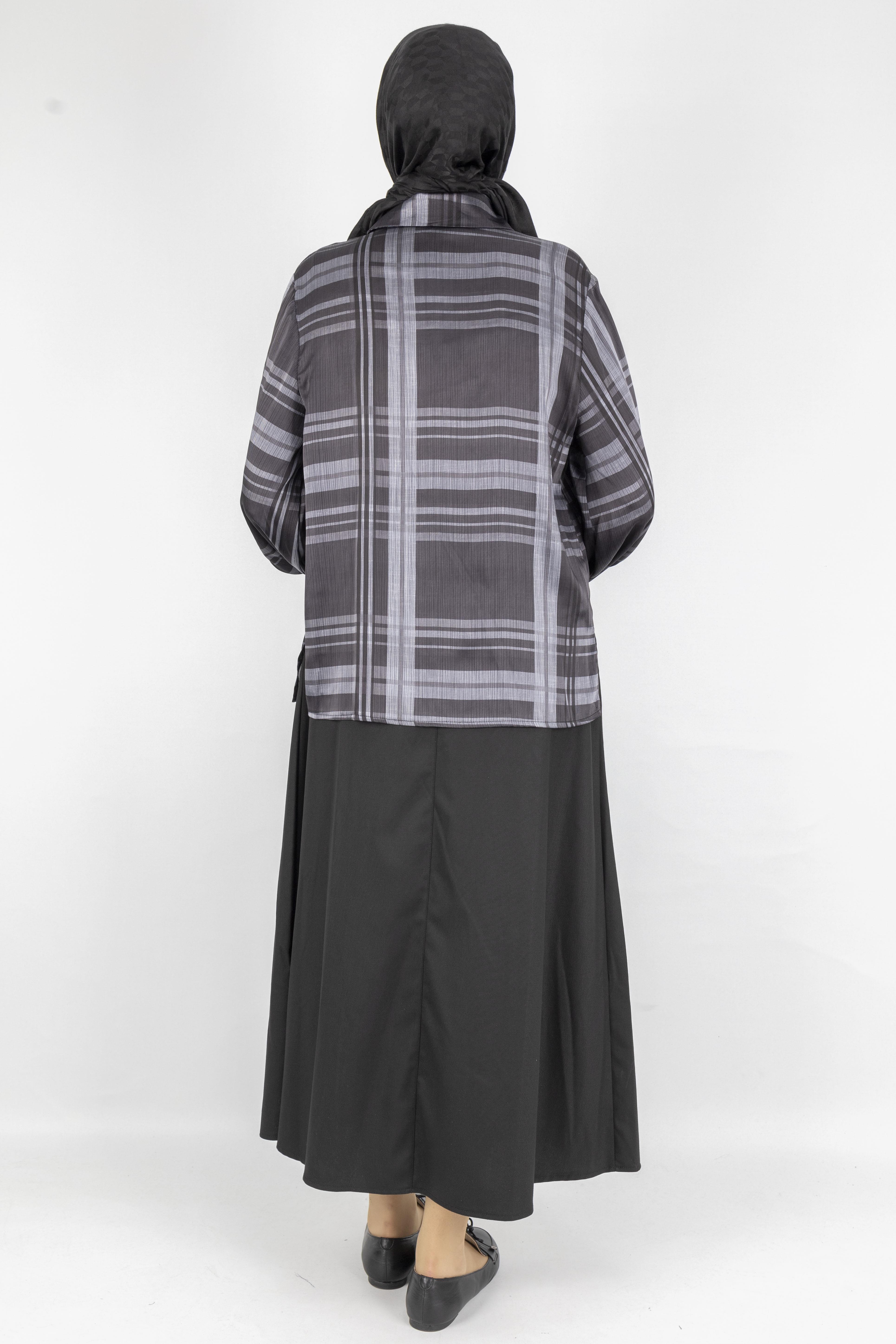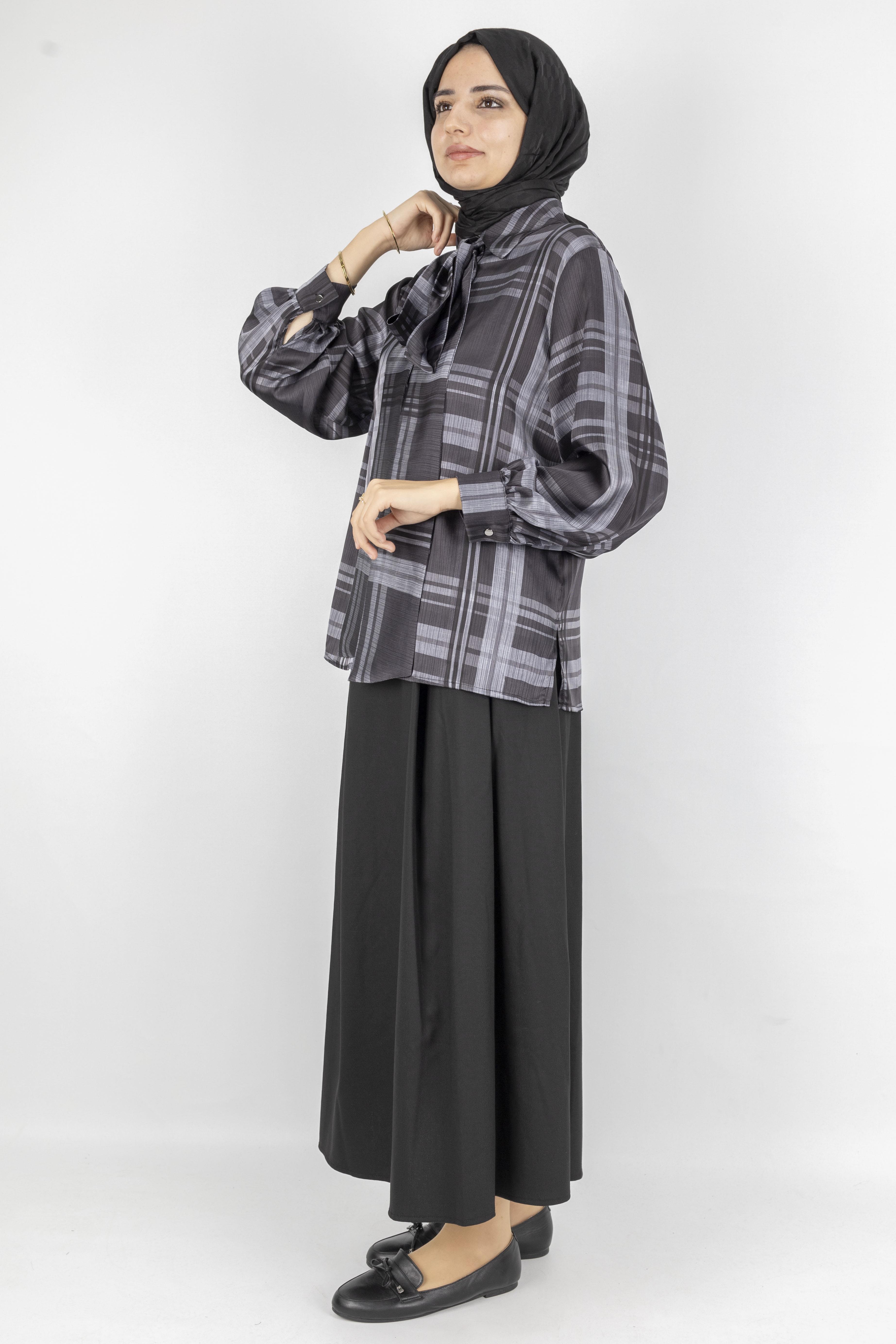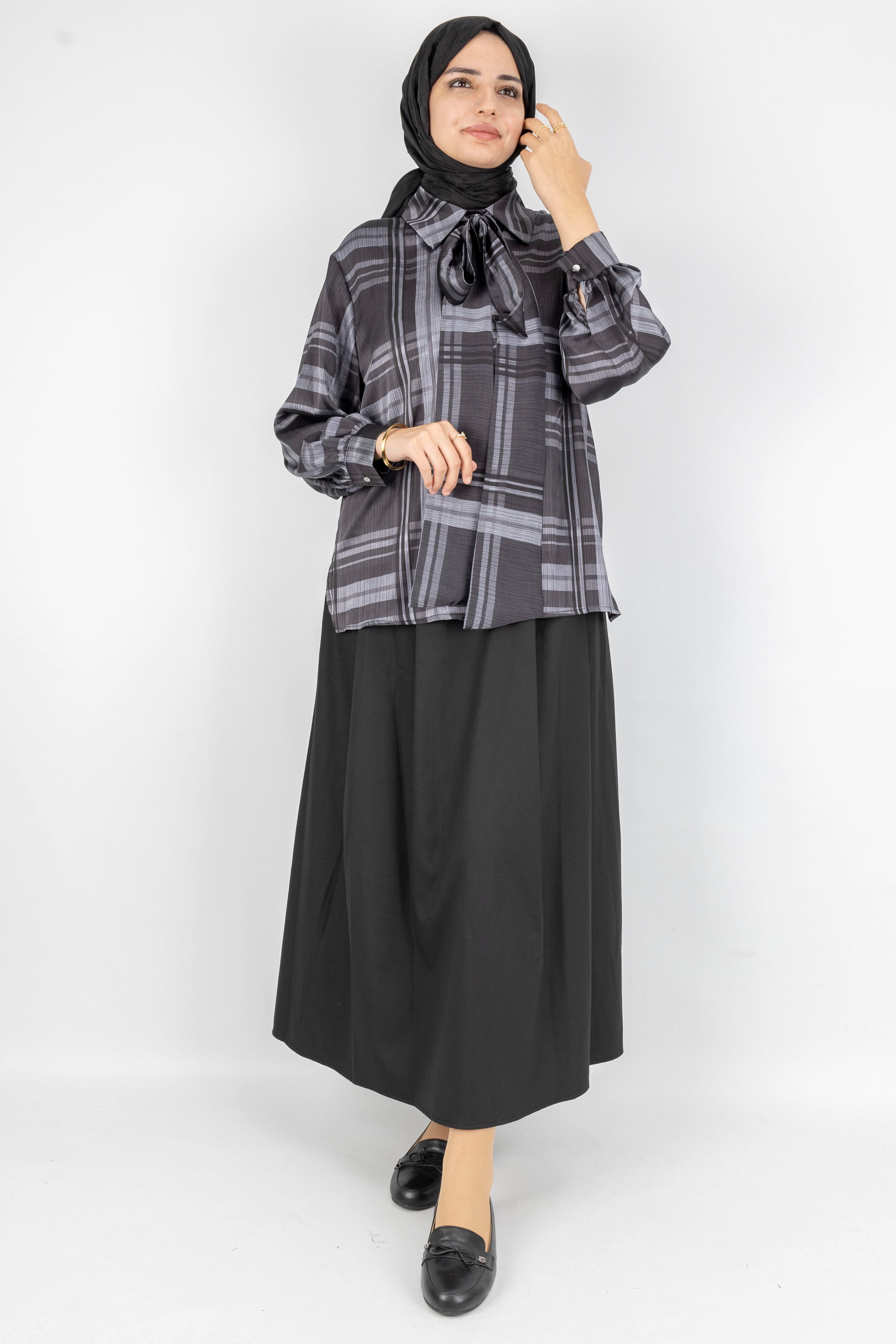 Fular Detaylı Kare Desen Bluz ve Uzun Etek Tesettür Takım Siyah OTW8576