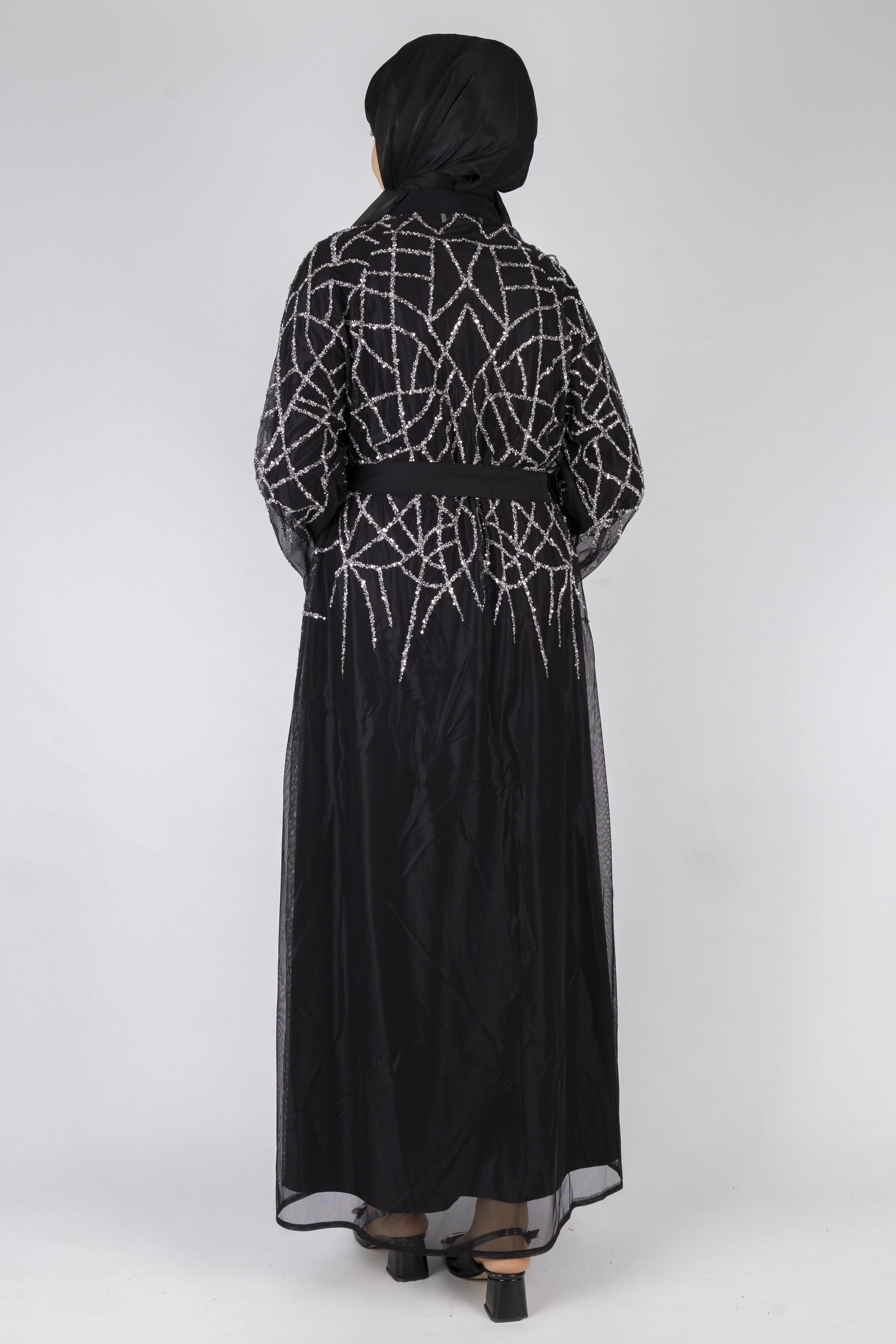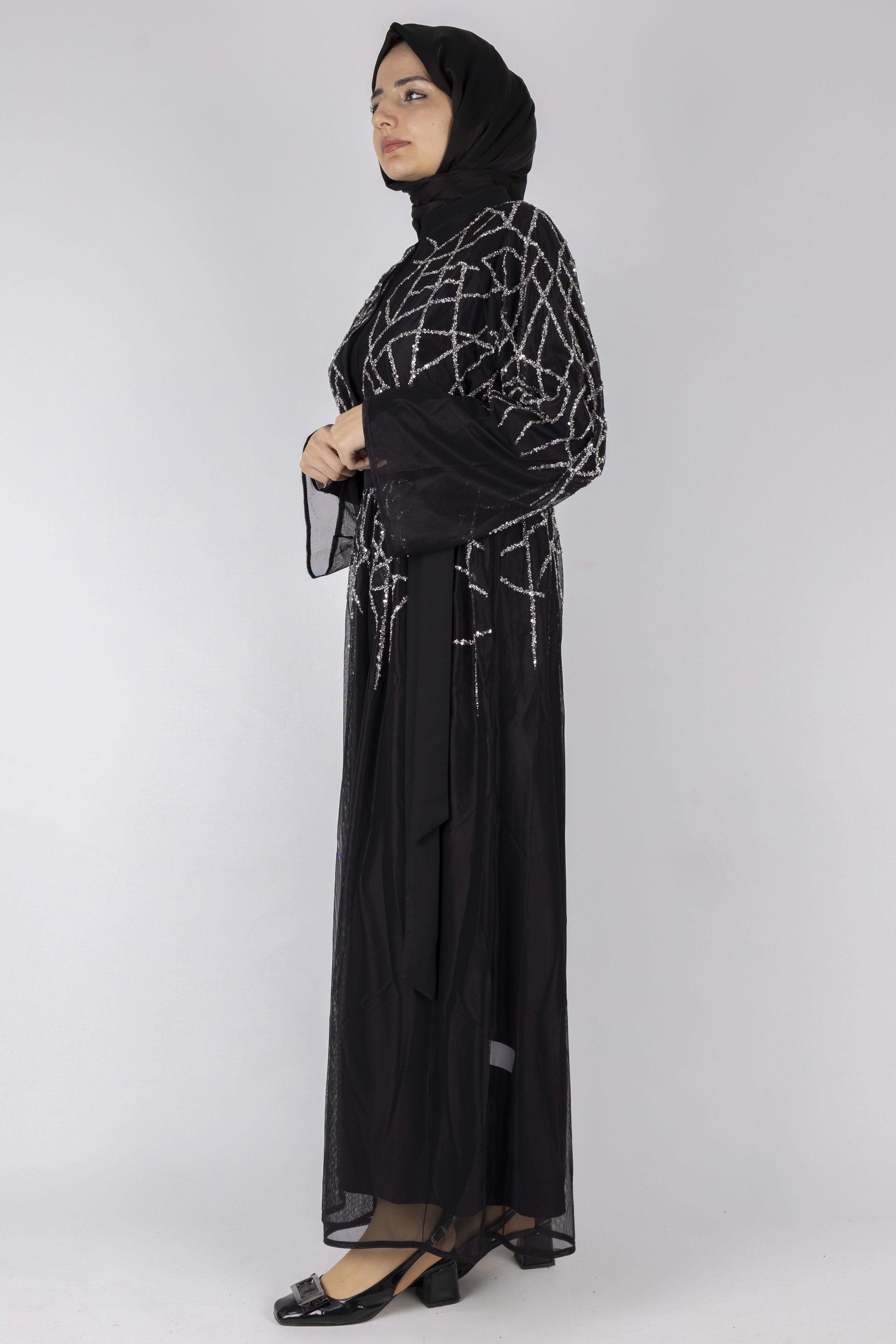 Zarif boncuk işlemeleri ile öne çıkan bu siyah abaya, hafif tül dokusu sayesinde dökümlü ve şık bir duruş sunar. Belden bağlamalı formu vücut oranını dengelerken, rahat kalıbı büyük beden kullanımına uygundur. Özel günler, davetler ve abiye kombinler için ideal bir tamamlayıcı parçadır.