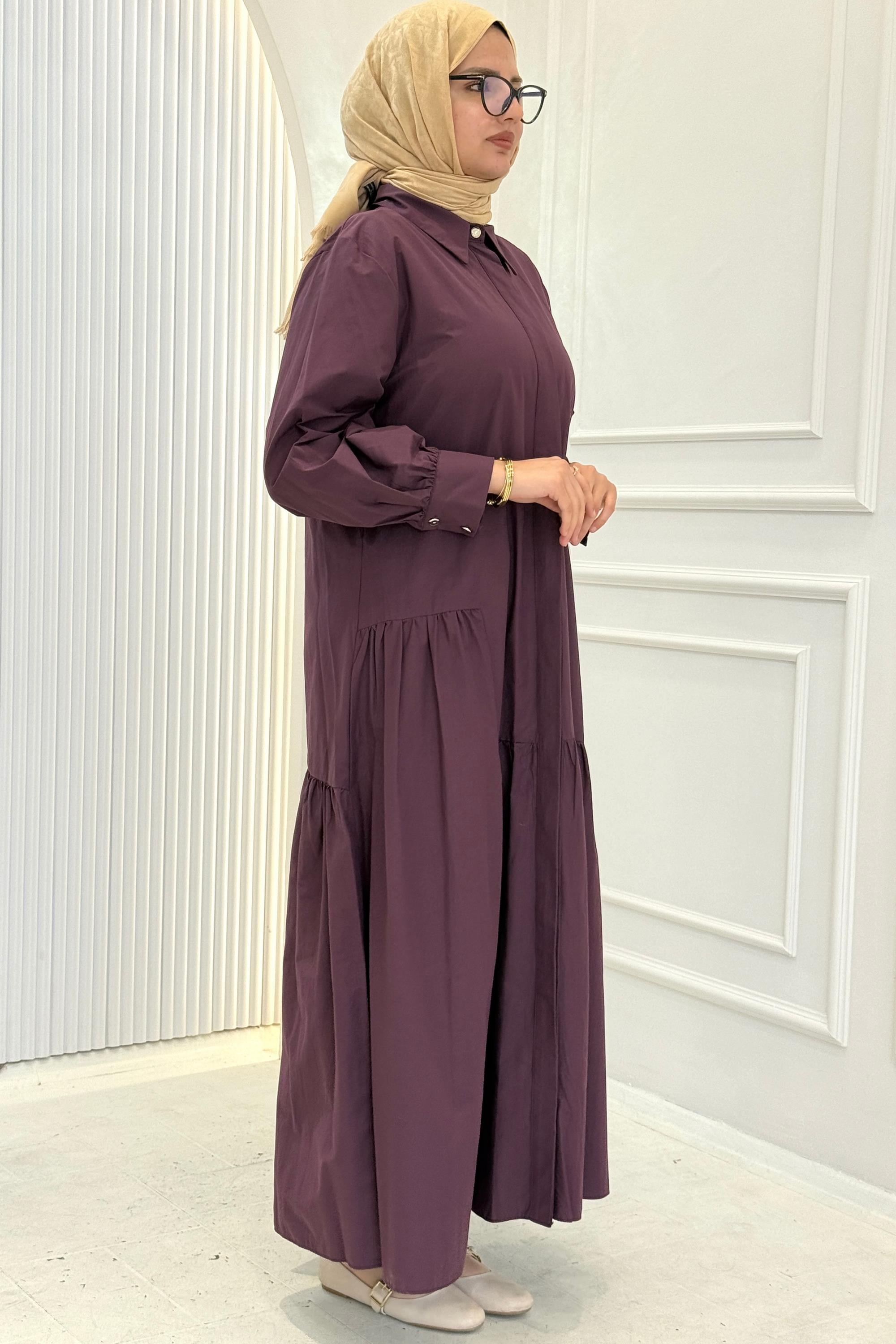 Gizli Pat Düğmeli Katlı Tesettür Elbise Mürdüm OTW5287