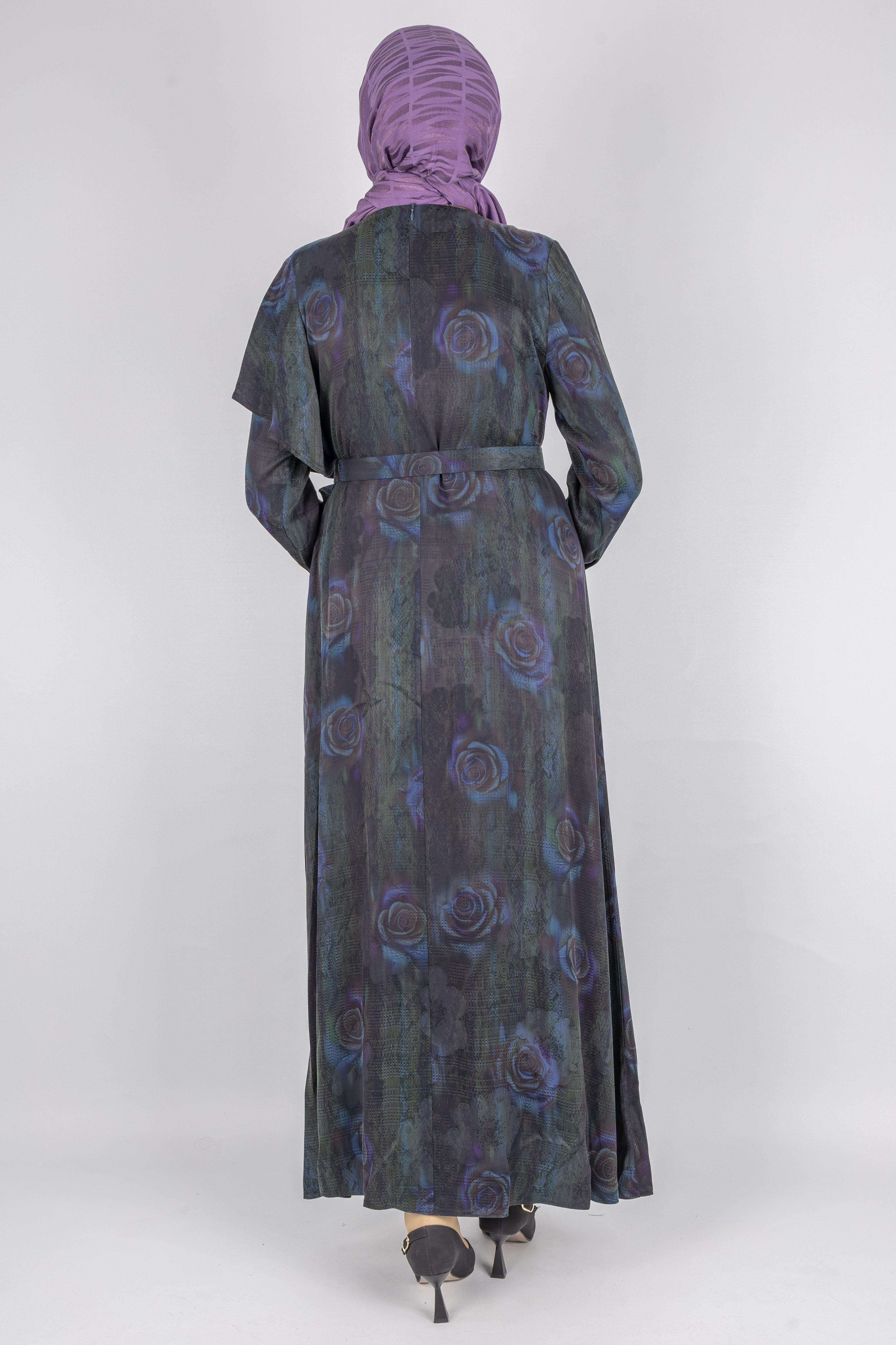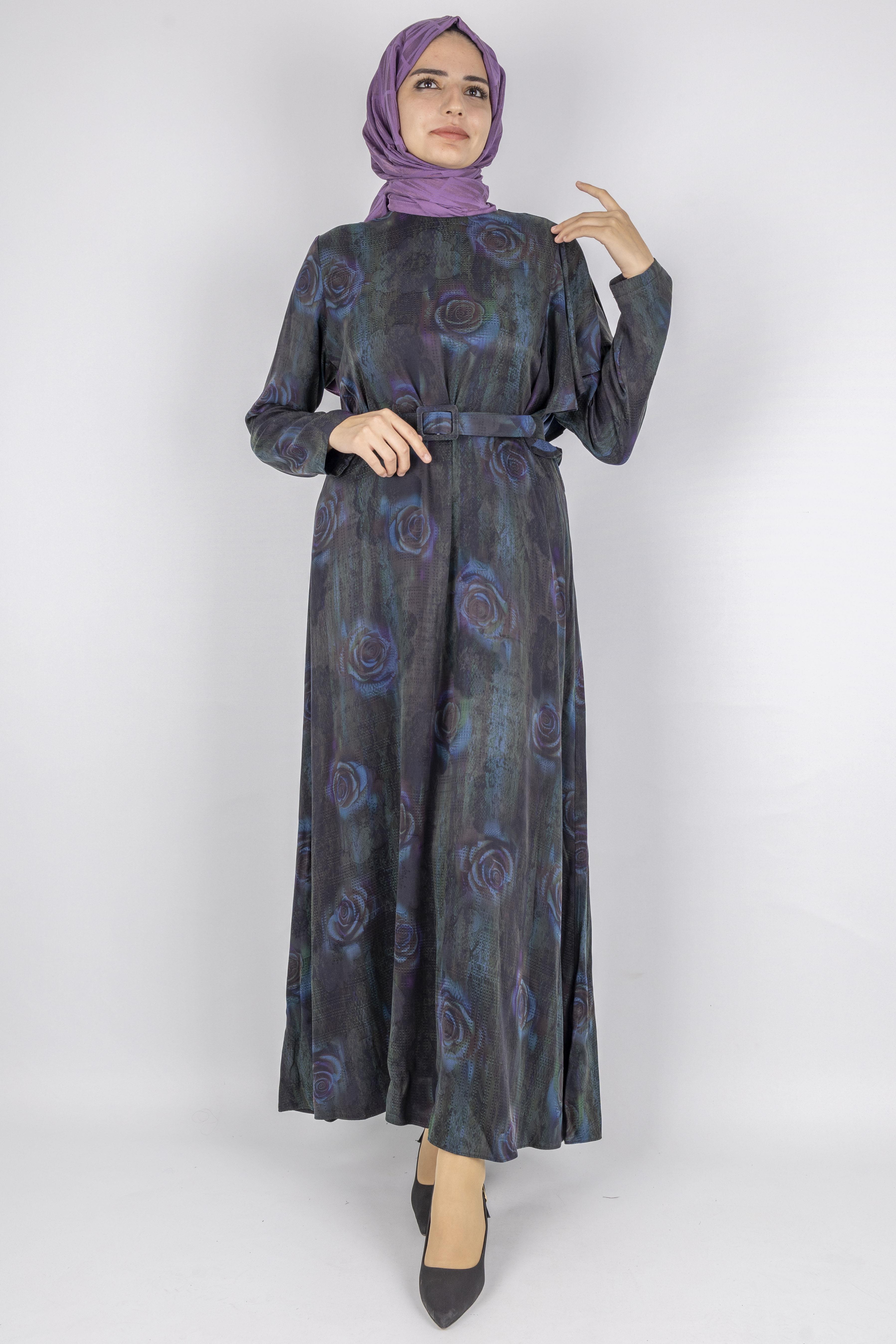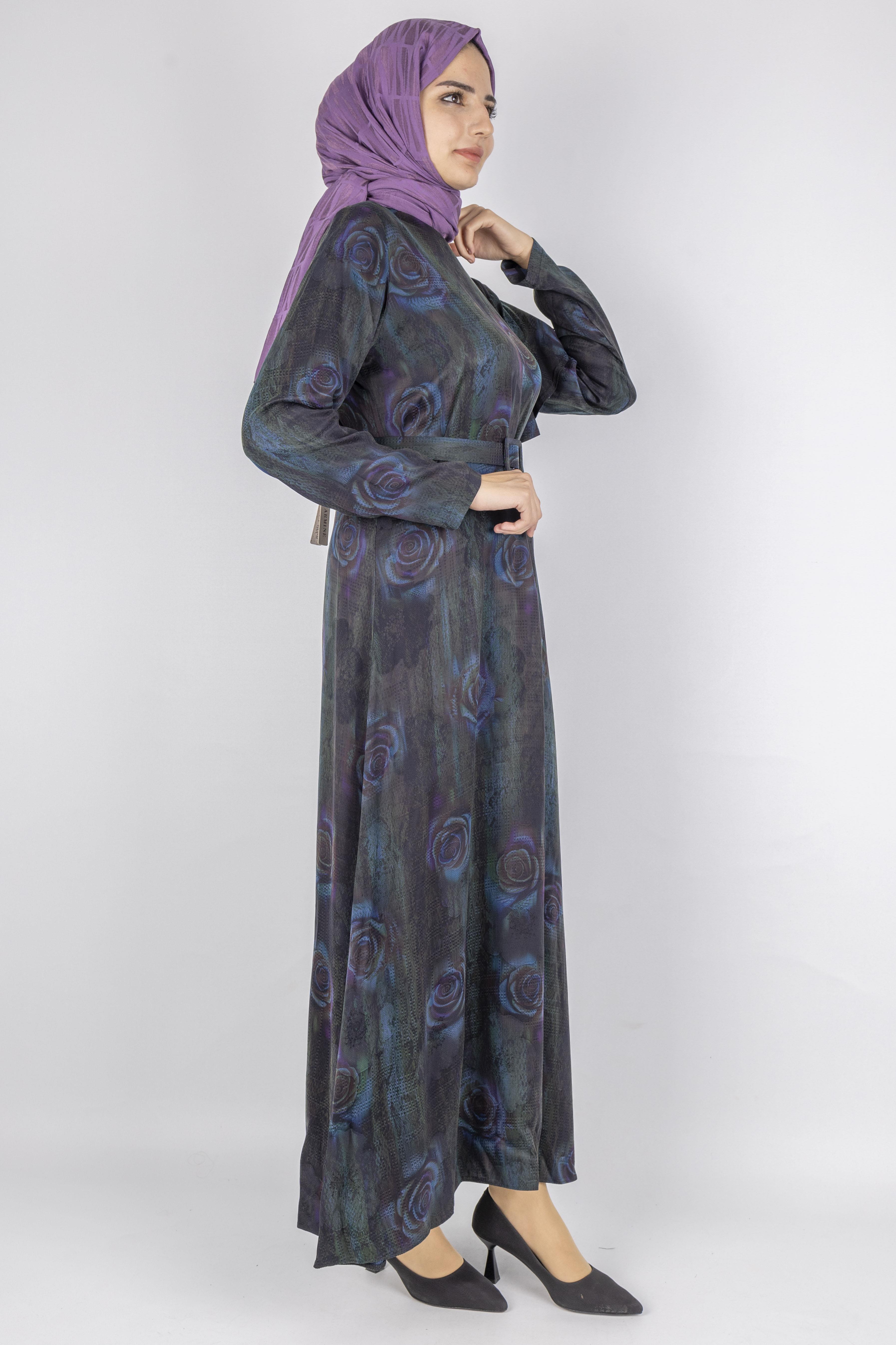 Orhan Store Qupra Kumaş Gül Desenli Kemer Detaylı Uzun Elbise Petrol OTW1752