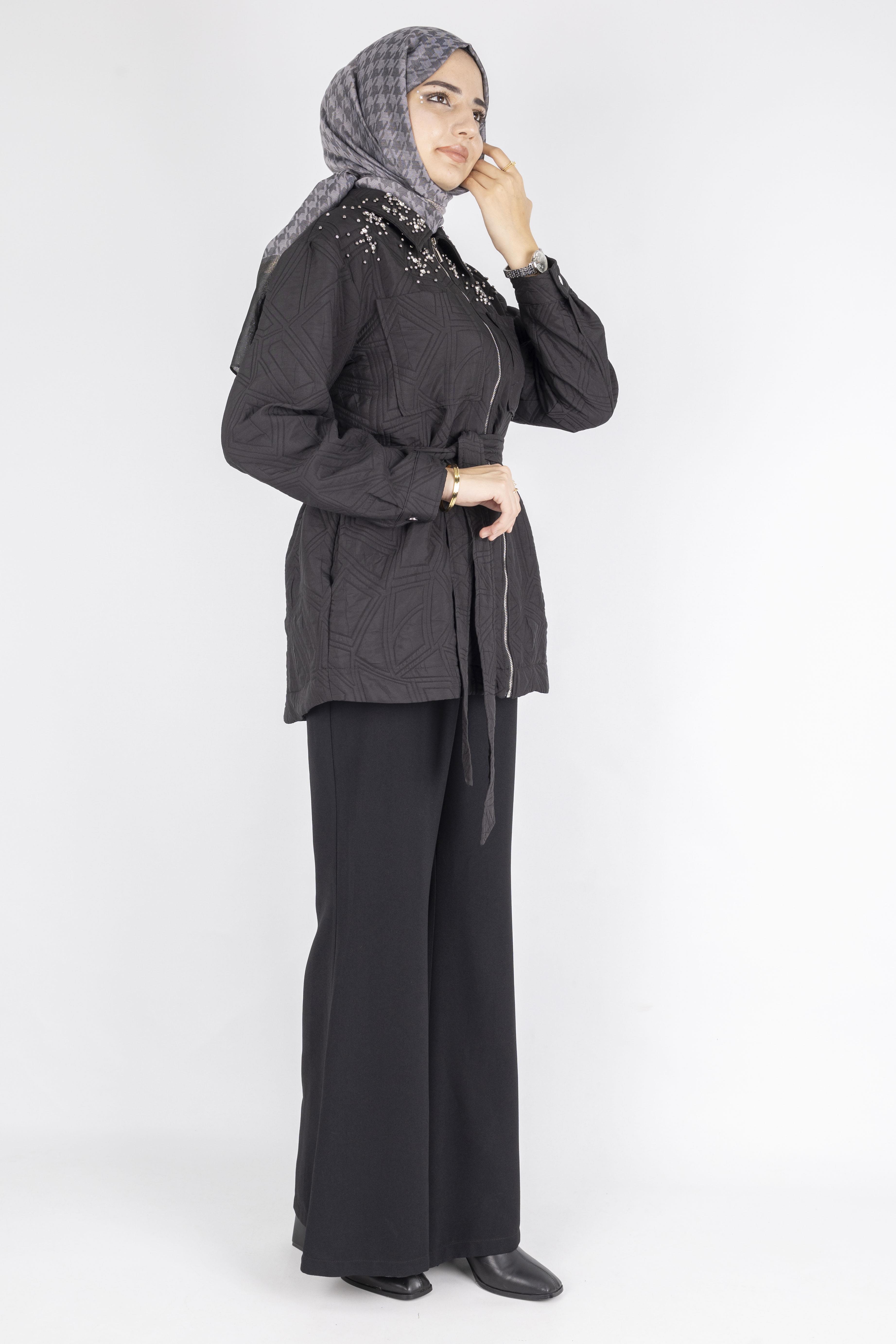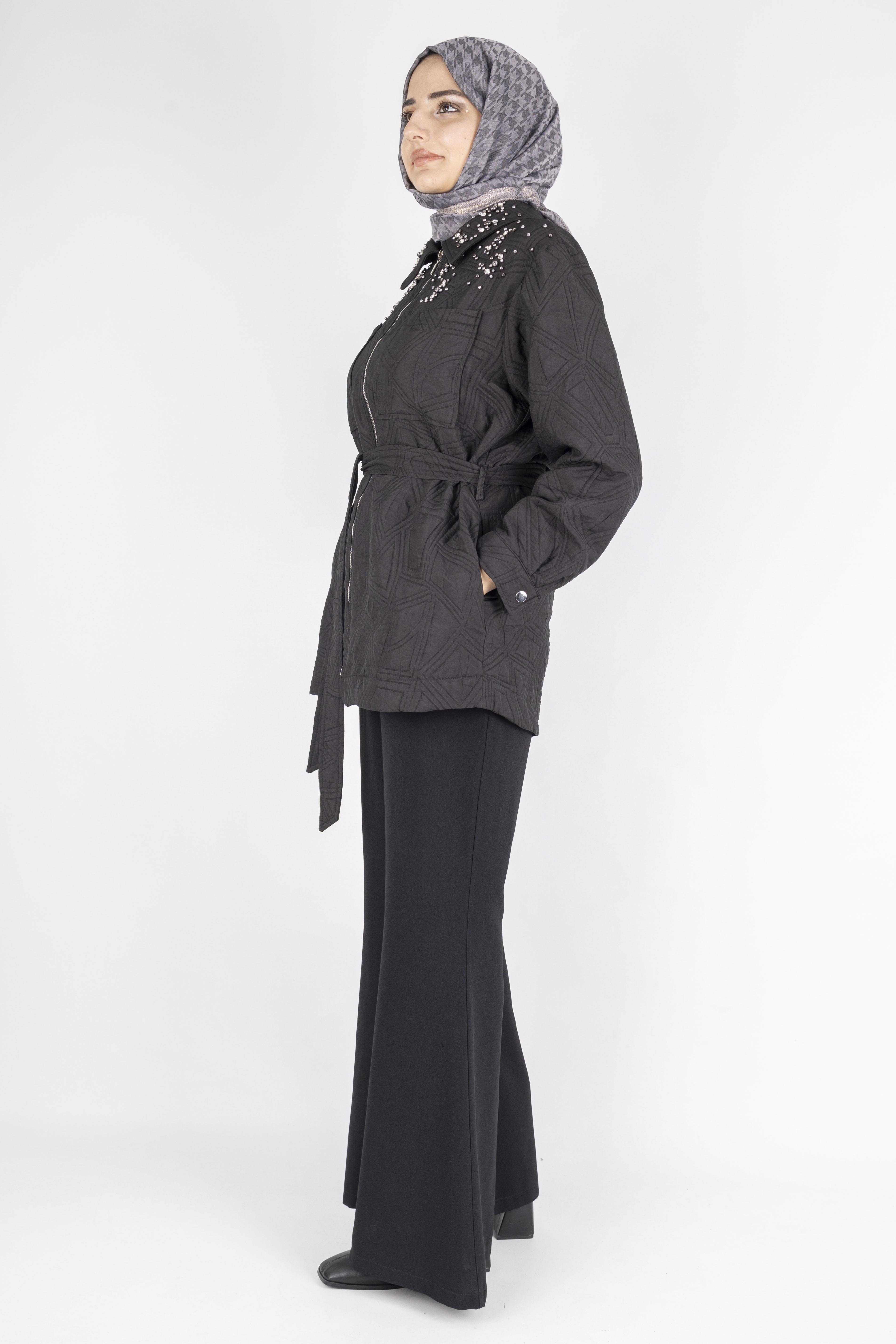 Şık taş işlemeleri ve modern desen dokusuyla tasarlanan bu kısa mont, hem günlük kombinlerde hem özel günlerde zarif bir duruş sunar.