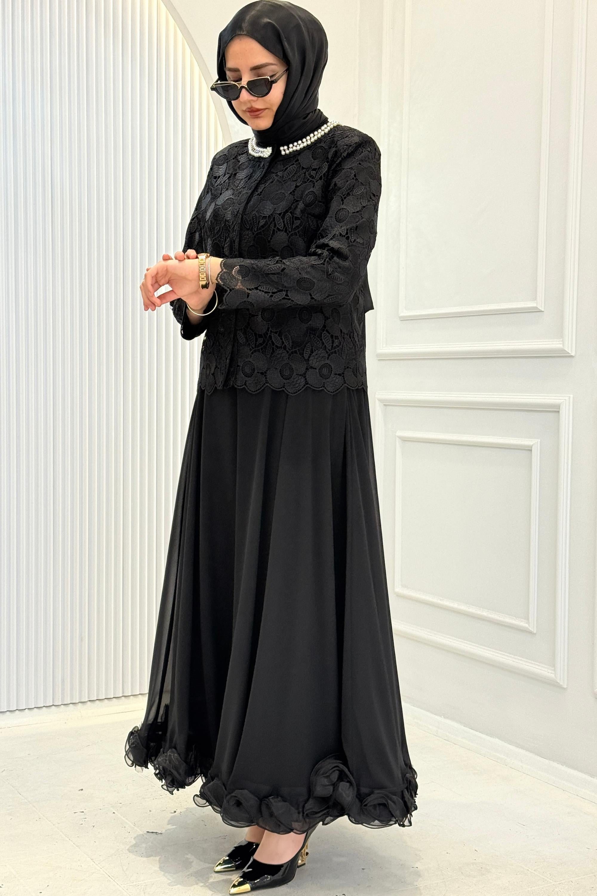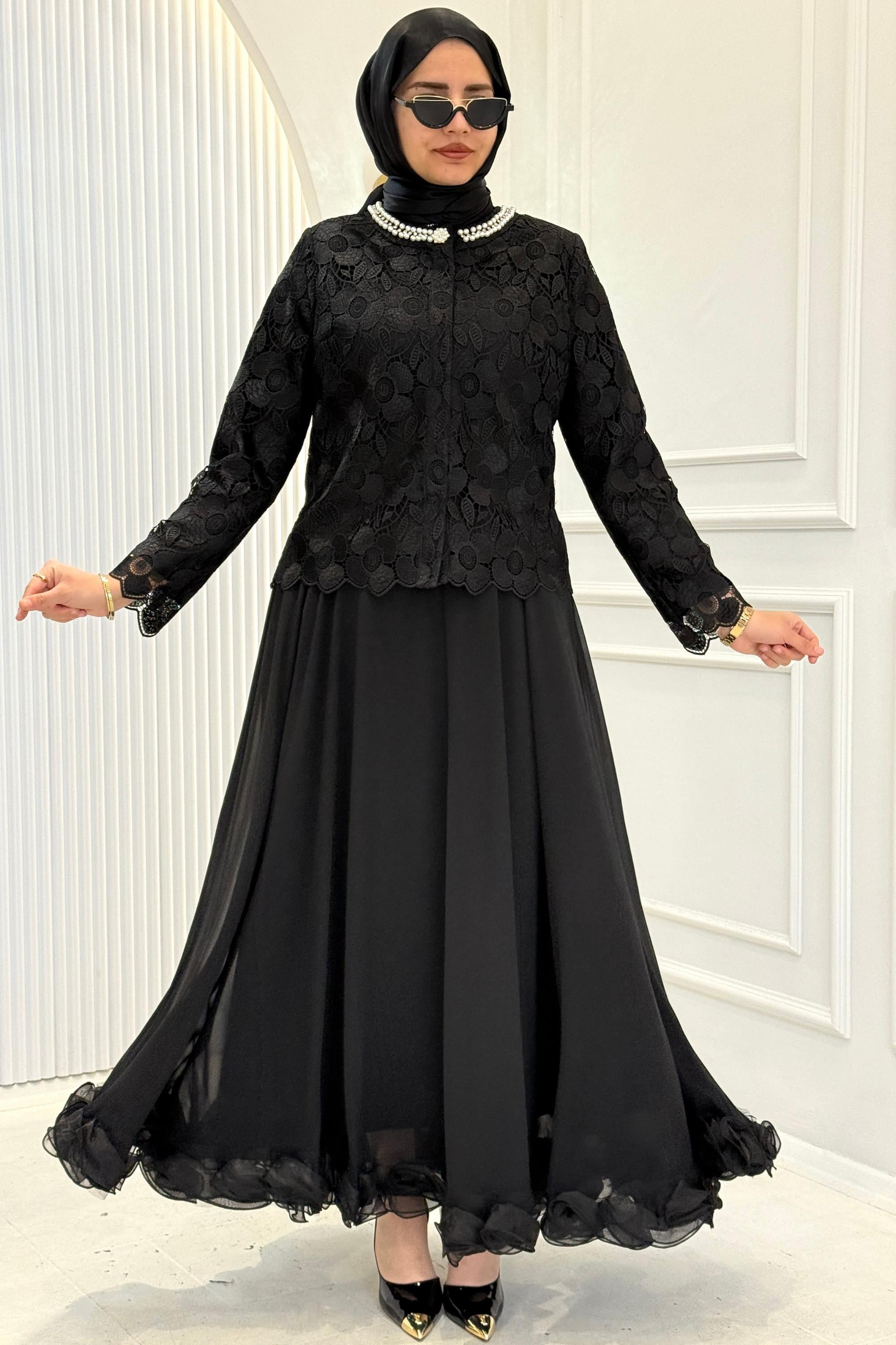 İnci Yaka Dantel Üstlü Şifon Etekli Tesettür Takım Siyah OTW45858