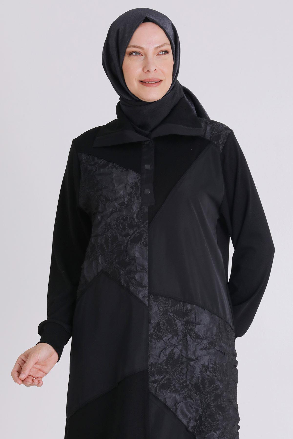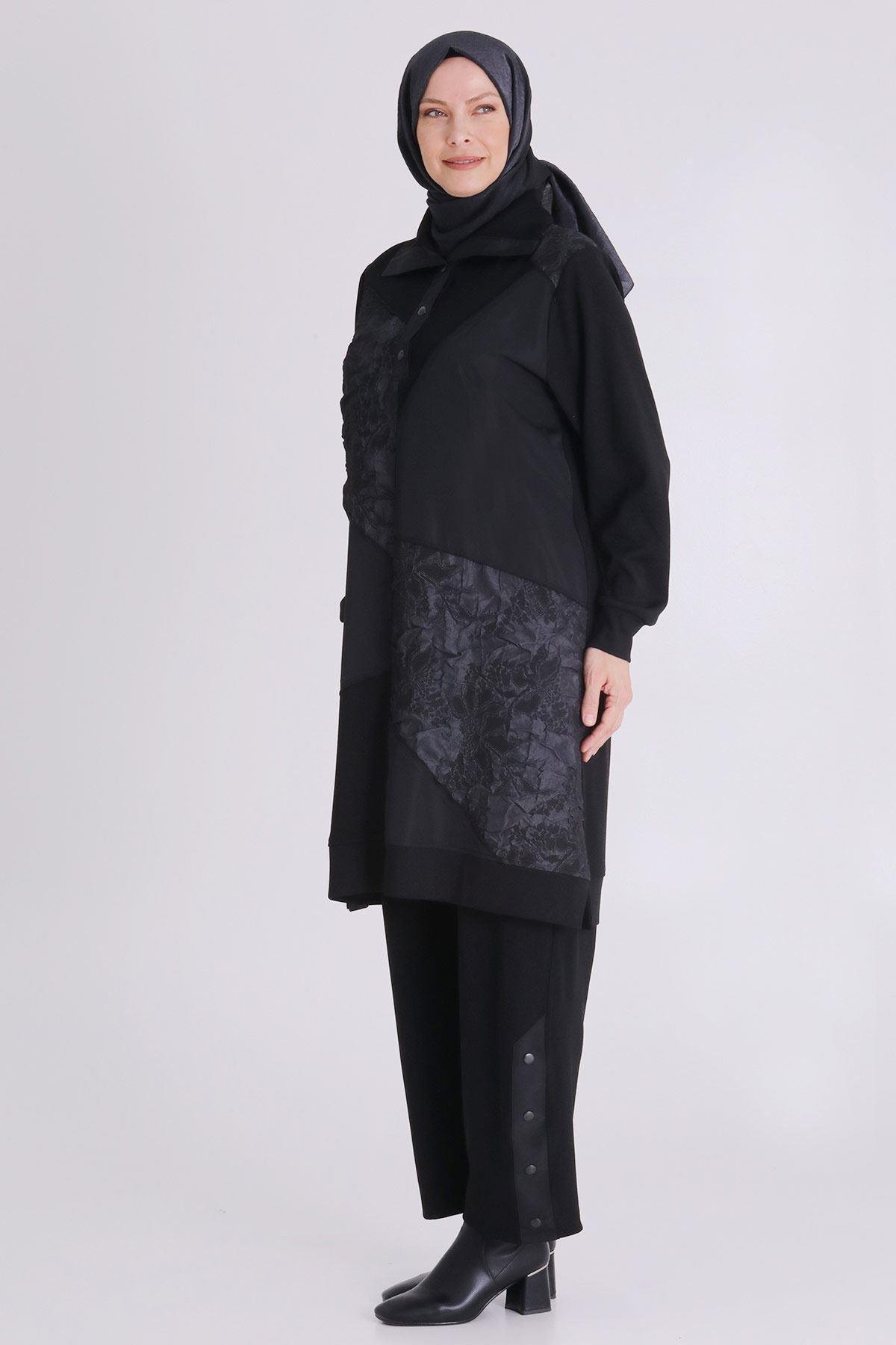 Ürün Detayları: Patcwork detaylı jakar kumaş kombinli modelimiz yarım patlıdır. Pantolon beli lastikli ve iki yandan ceplidir, paçası çıtçıt aksesuar detaylıdır..
