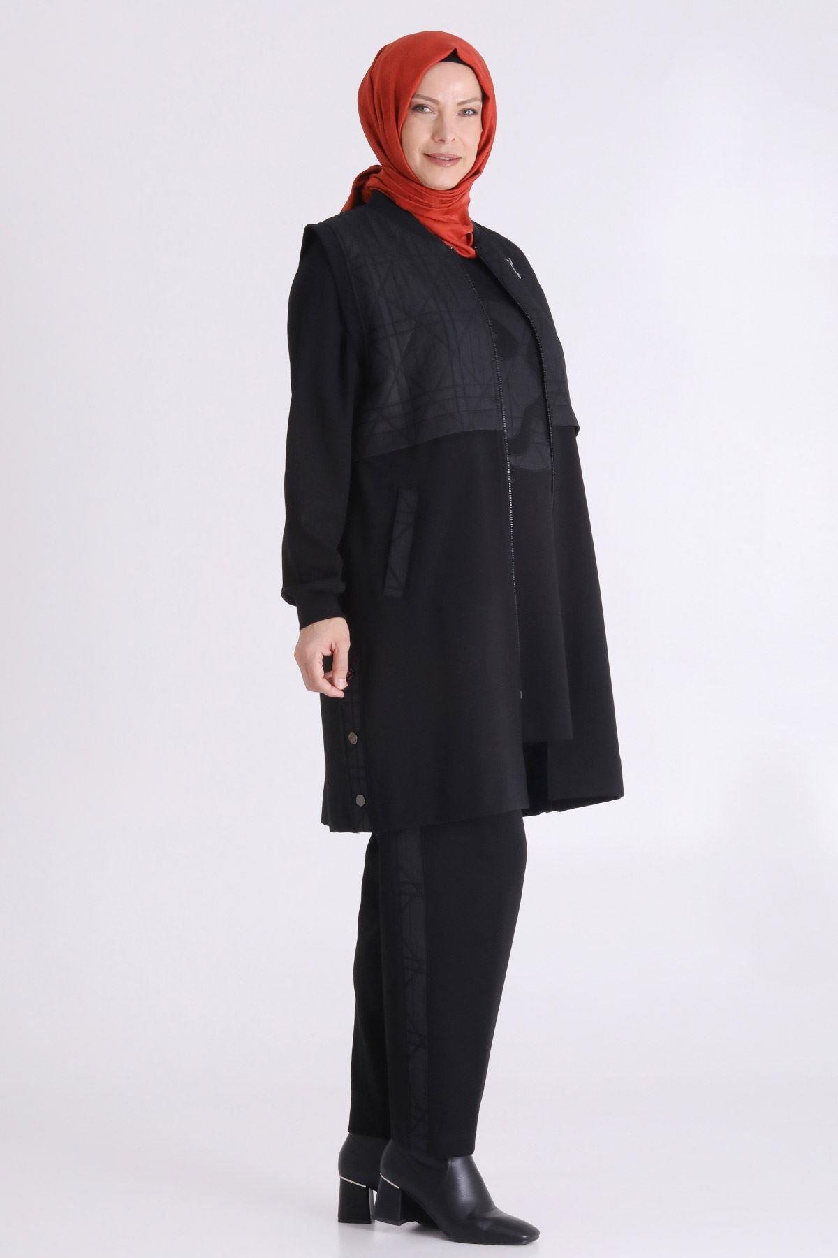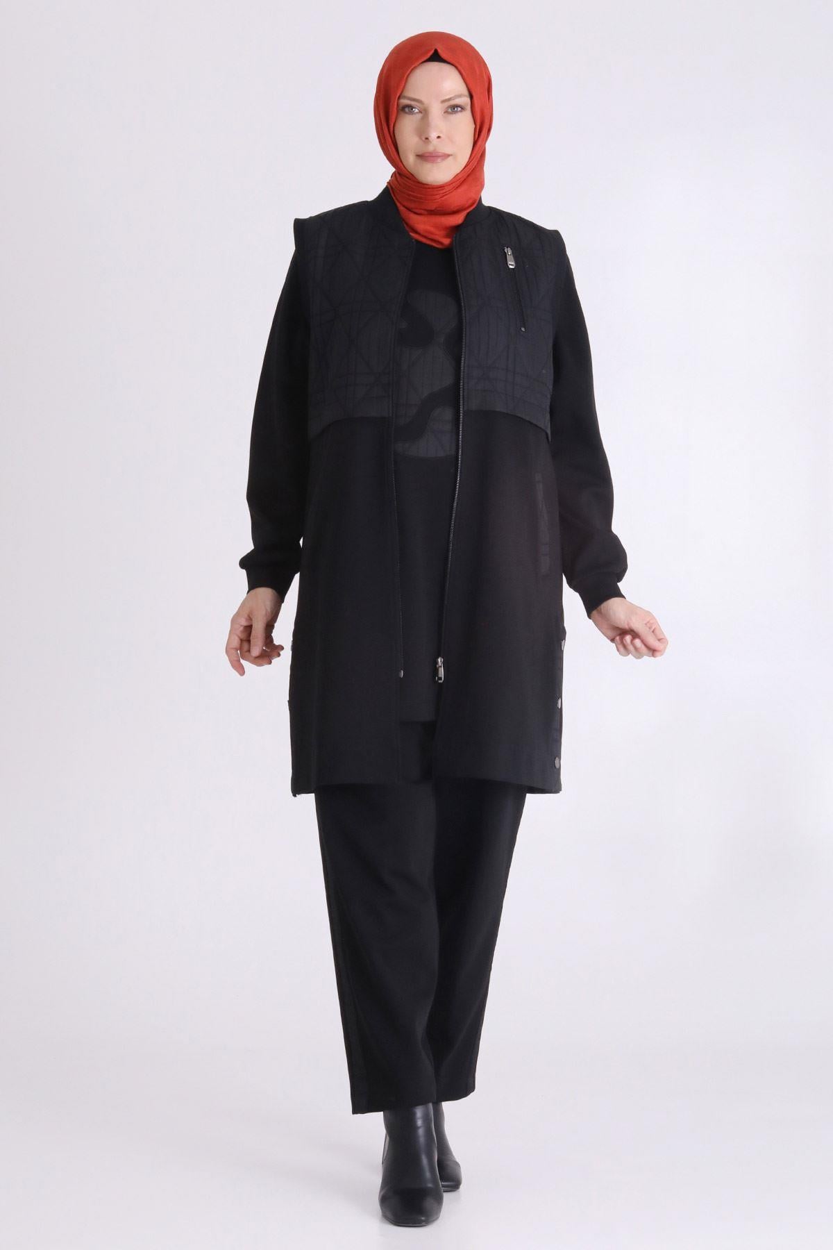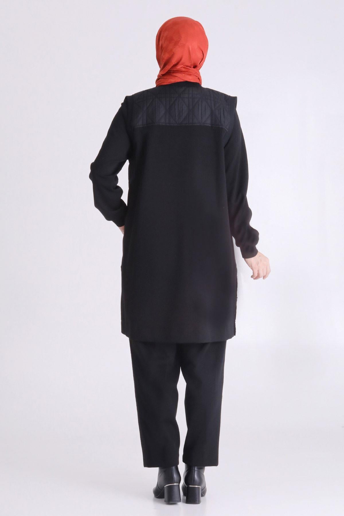 Ürün Detayları: Ürünümüz üç parçadan oluşmaktadır. Hakim yaka ve cepli yeleğimiz önden fermuarlı ve kapitone kumaş ile kombinlenmiştir. İç tuniğimiz sıfır yaka ve nakış detaylıdır. Pantolon beli lastiklidir.