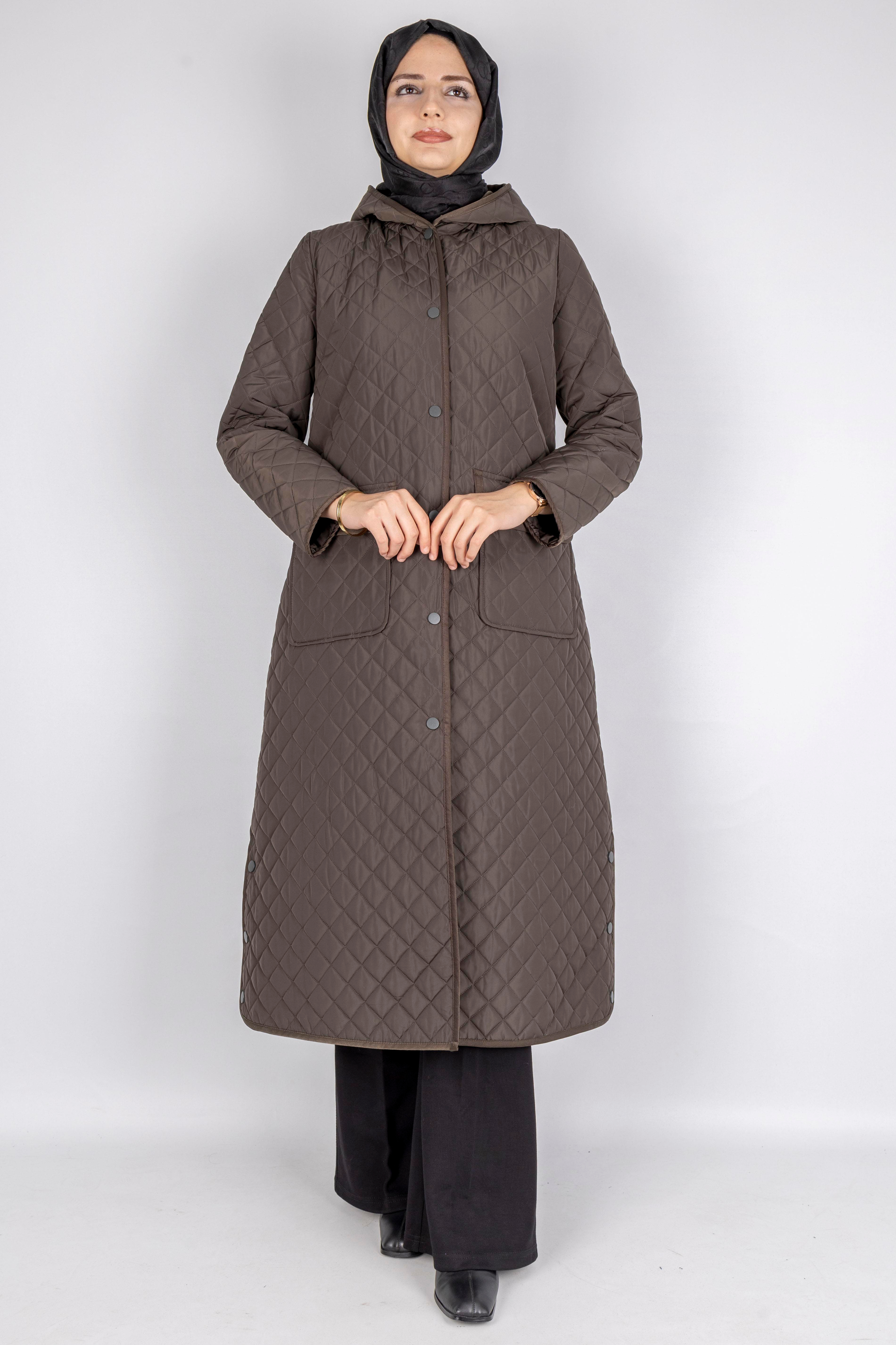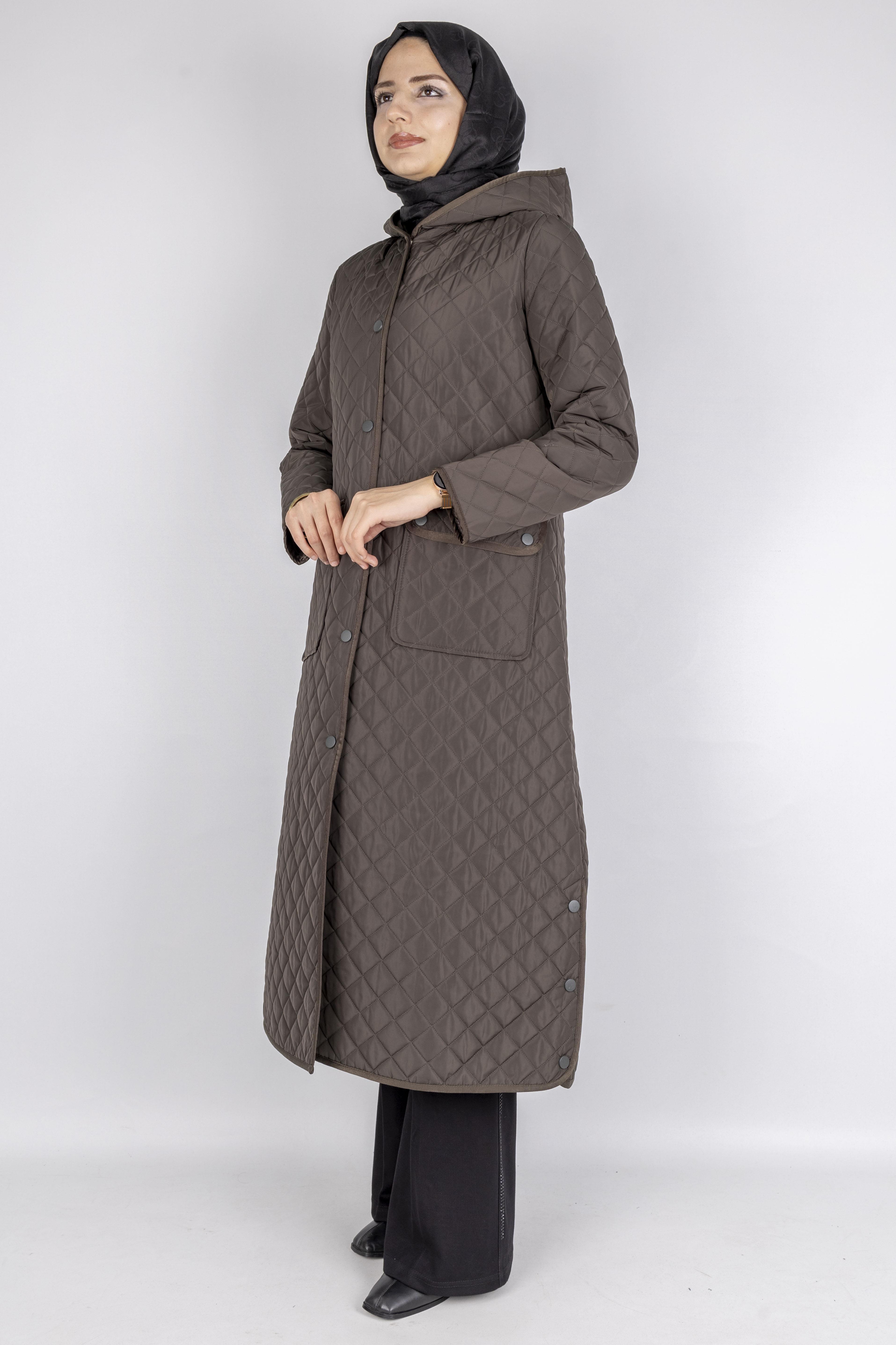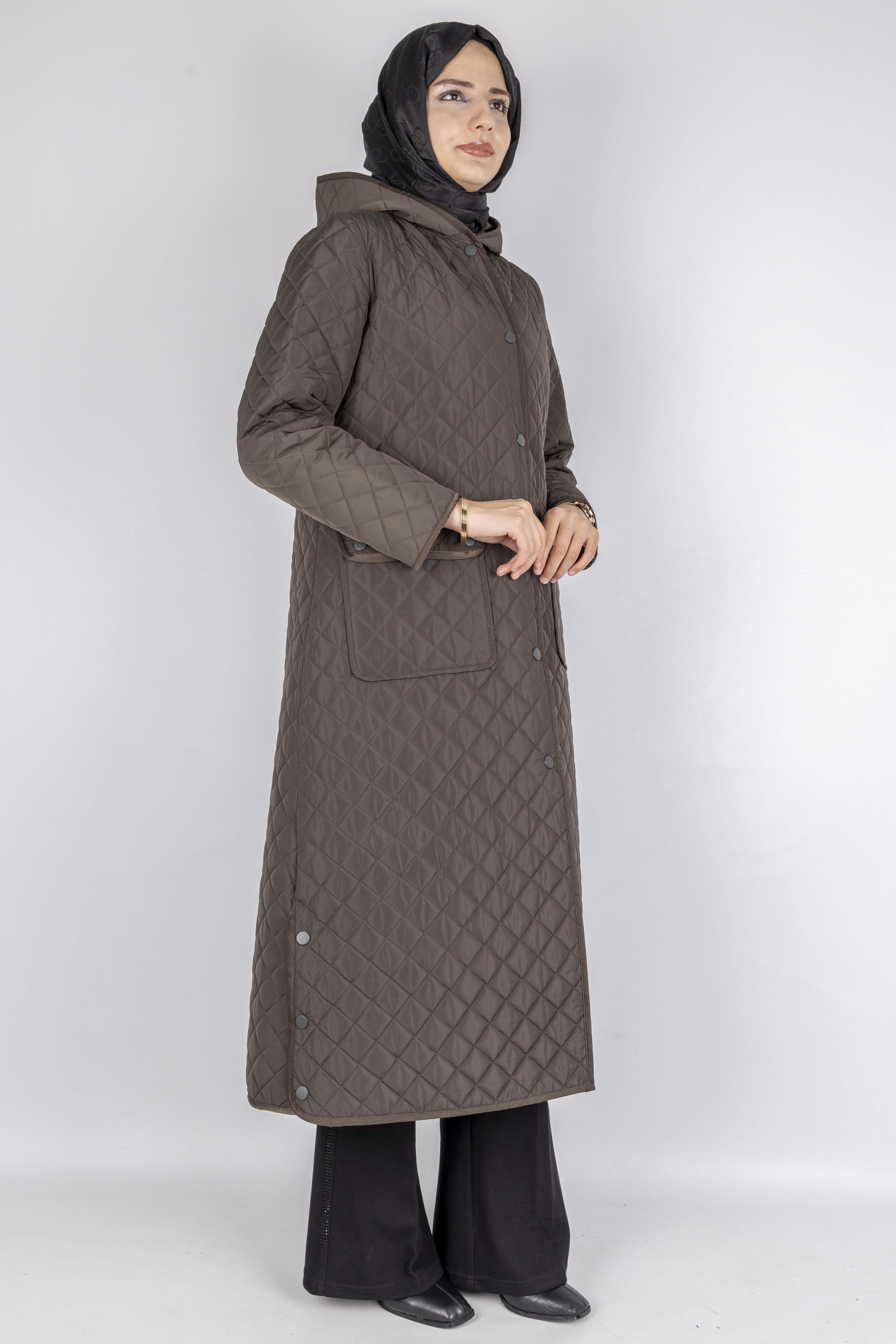 Ürün Detayları: Astarlı kapitone kumaştan üretilen uzun tesettür kap, kapüşonlu tasarımı ve yan cepleriyle kış aylarında rahat kullanım sağlar.