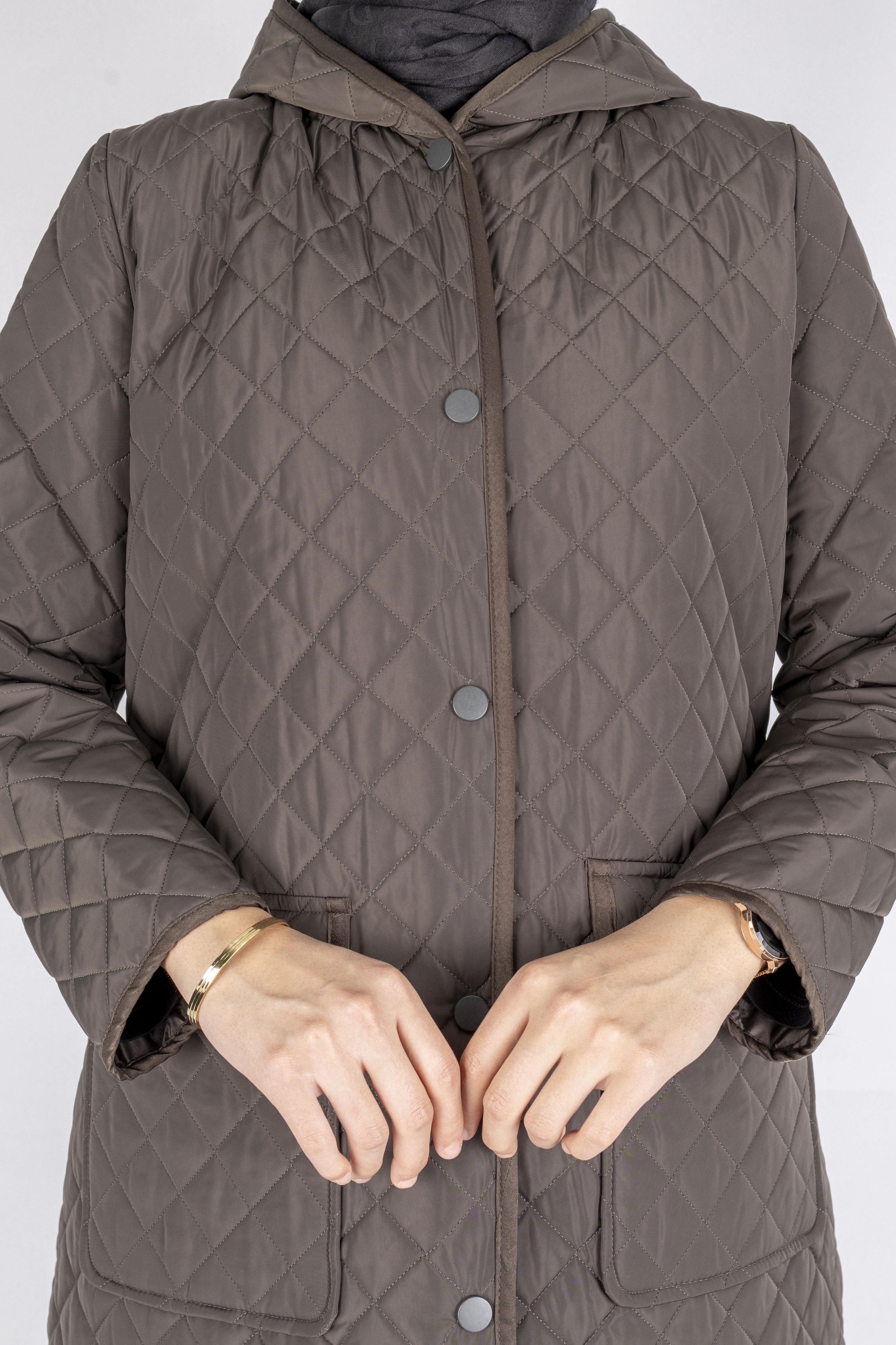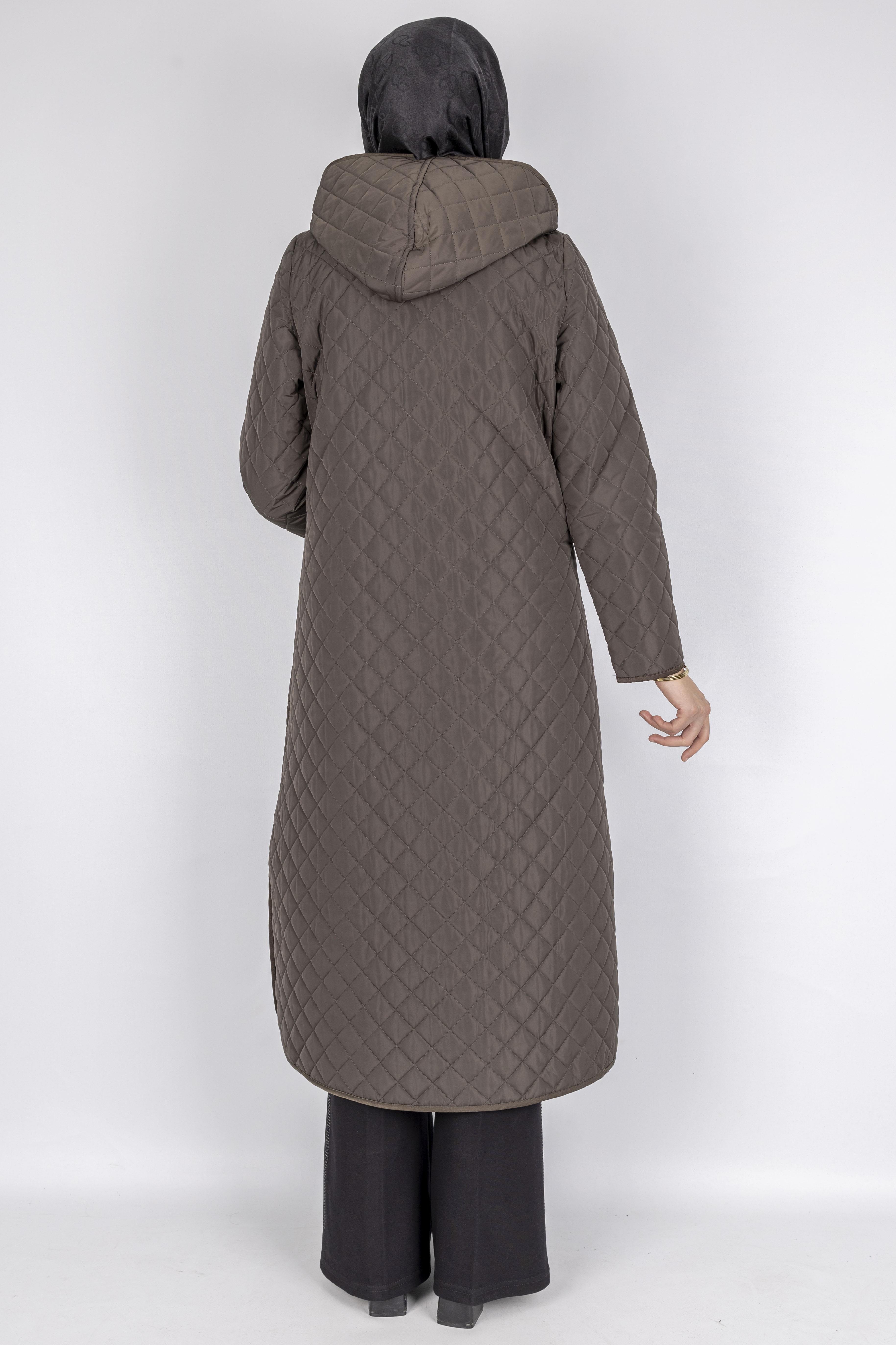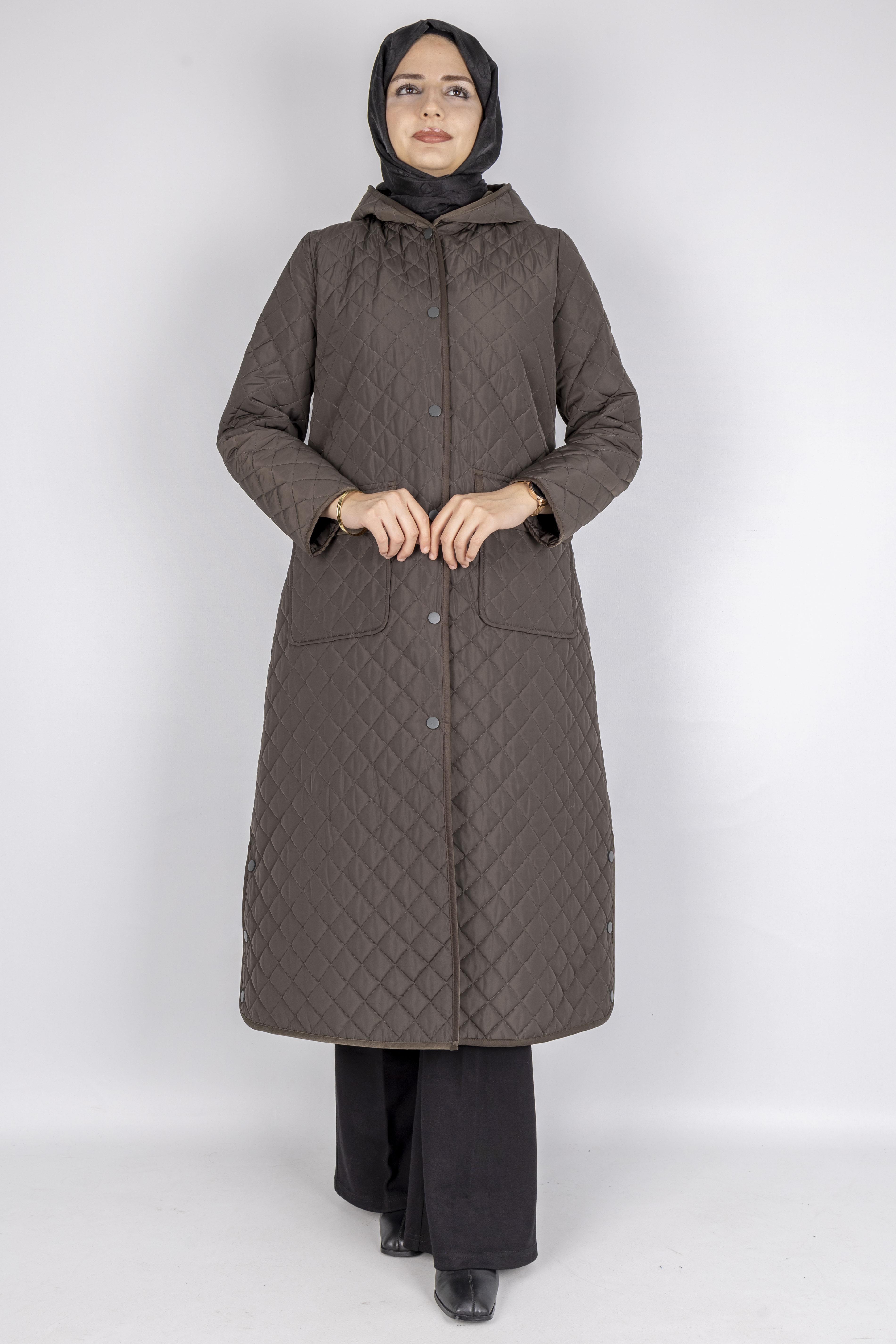 Ürün Detayları: Astarlı kapitone kumaştan üretilen uzun tesettür kap, kapüşonlu tasarımı ve yan cepleriyle kış aylarında rahat kullanım sağlar.