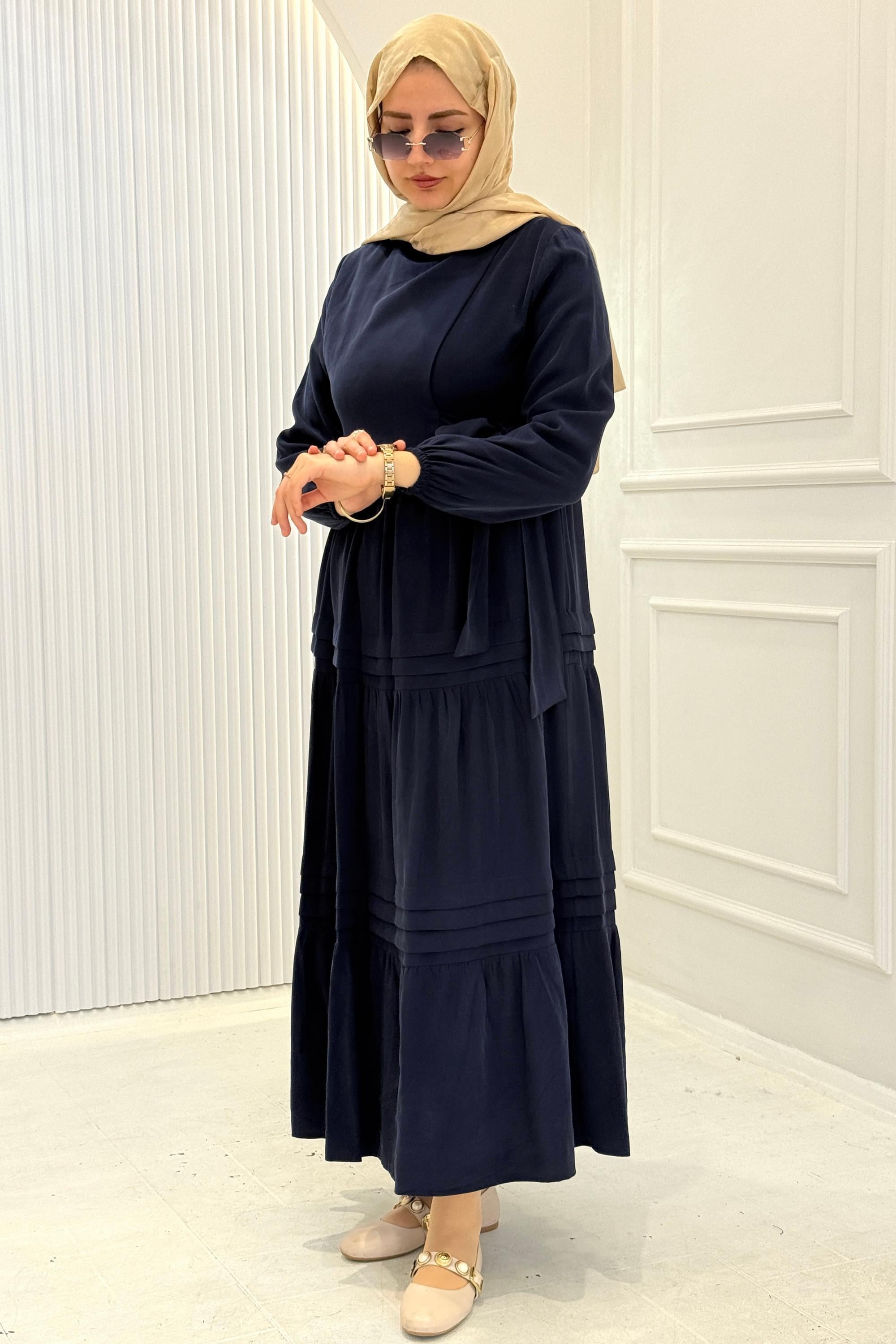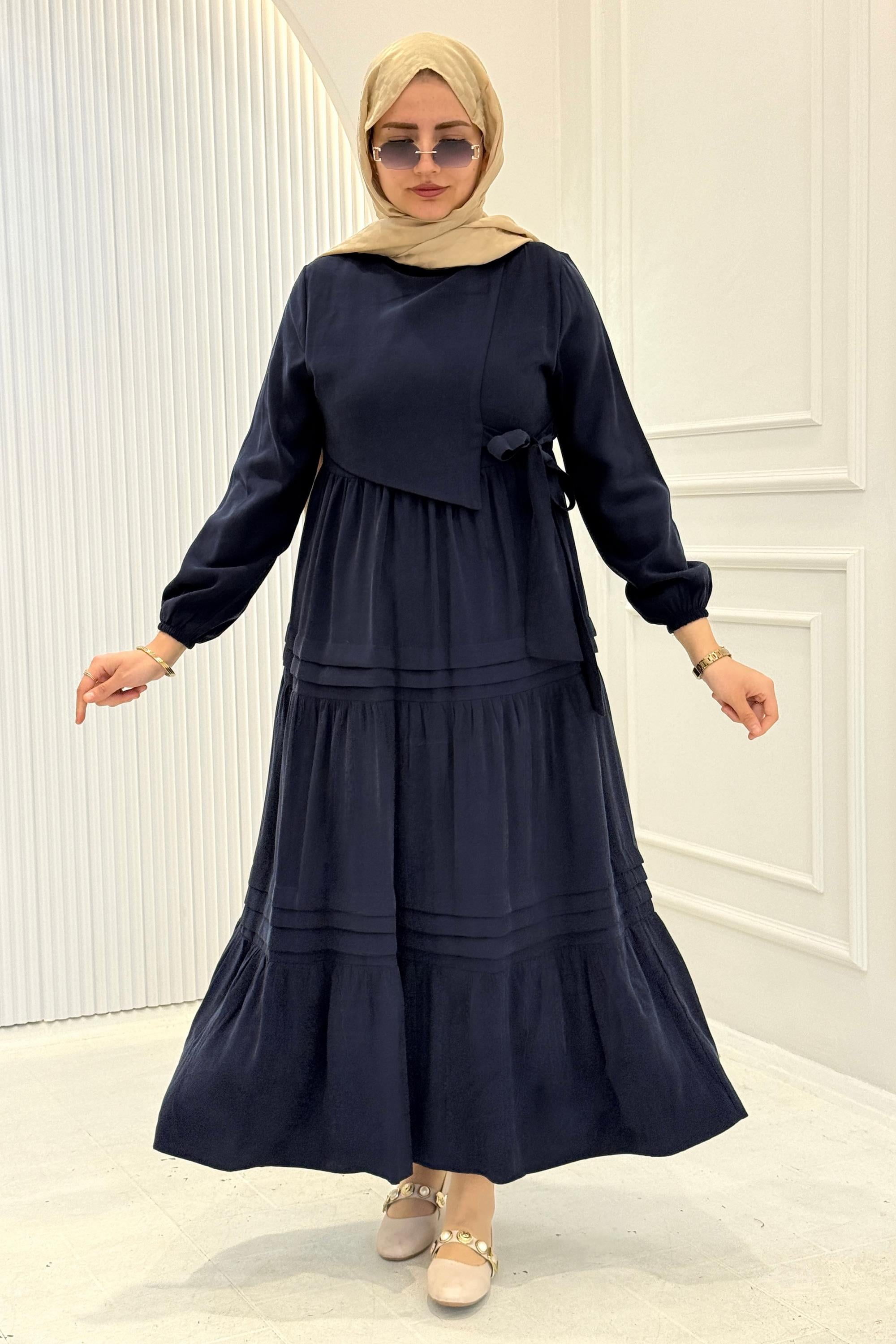 Kat Kat Pileli Yan Bağlamalı Tesettür Elbise Lacivert OTW5262