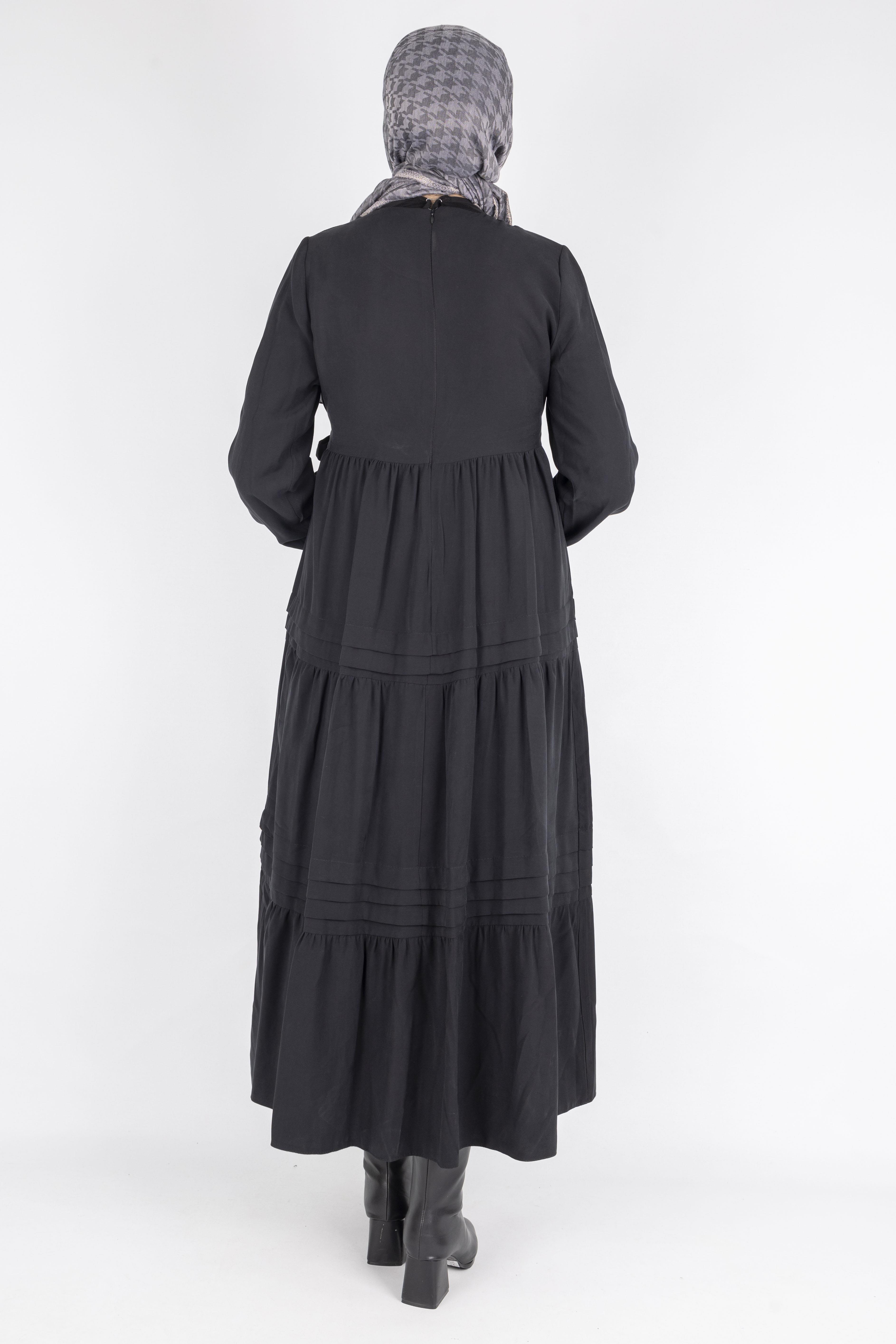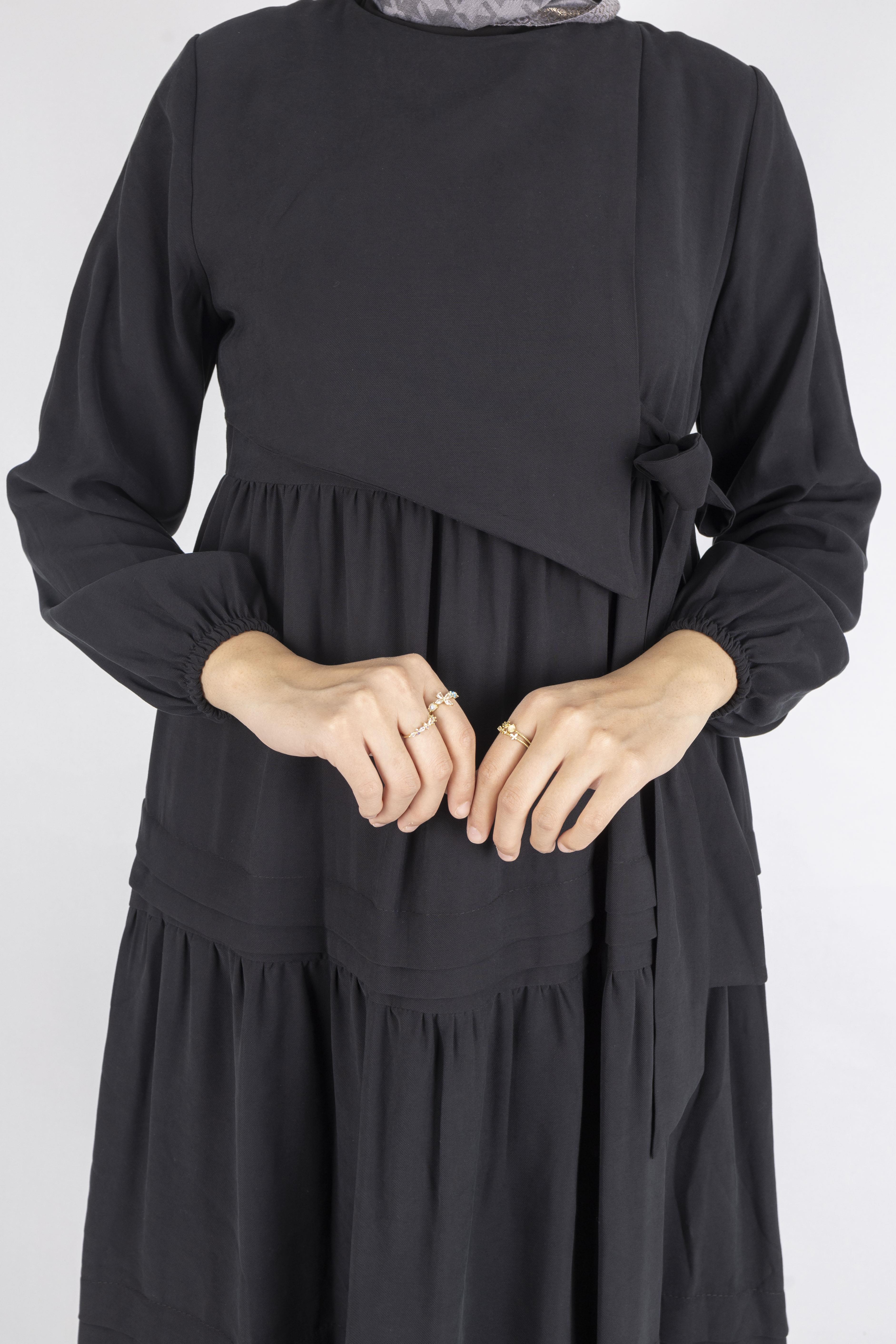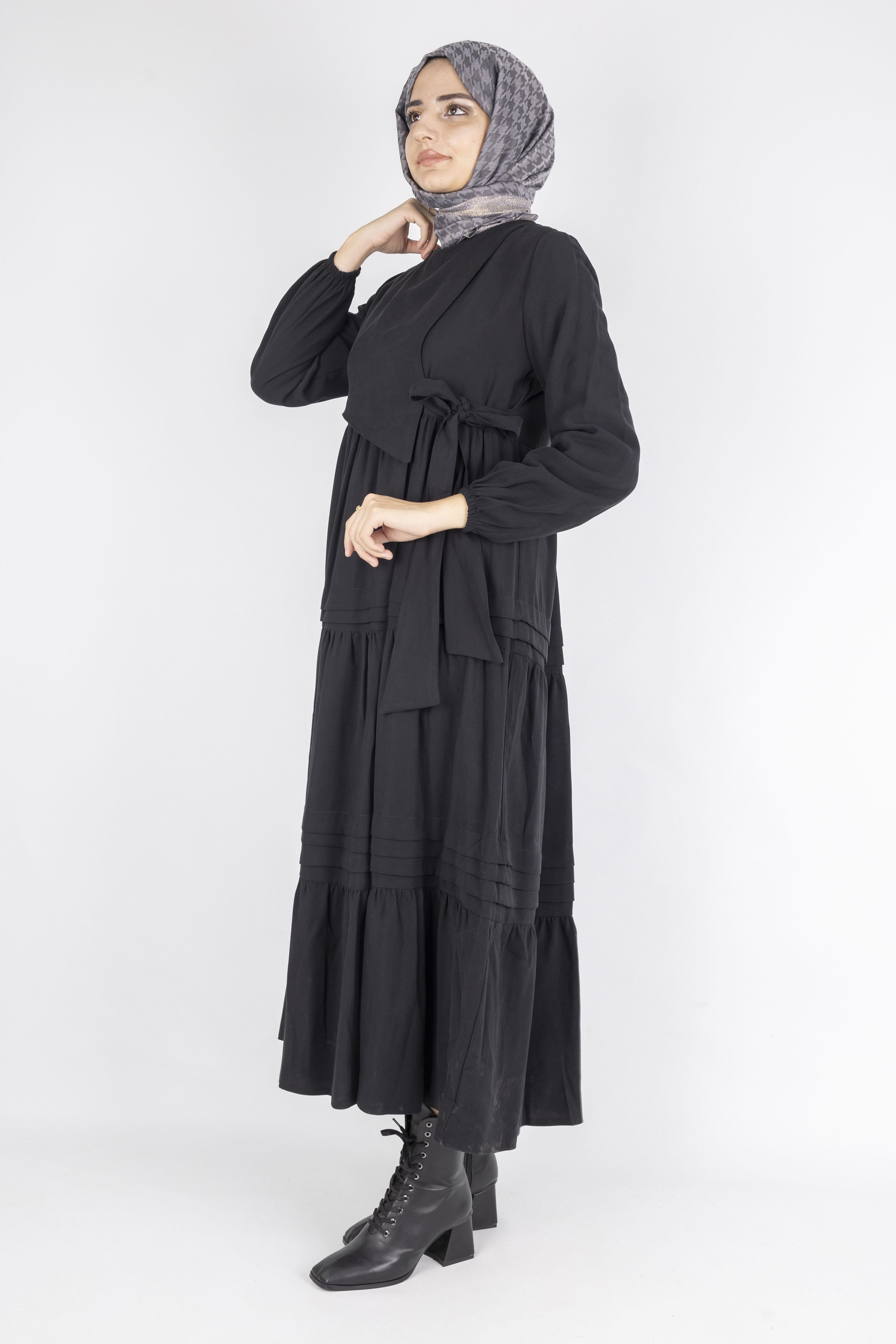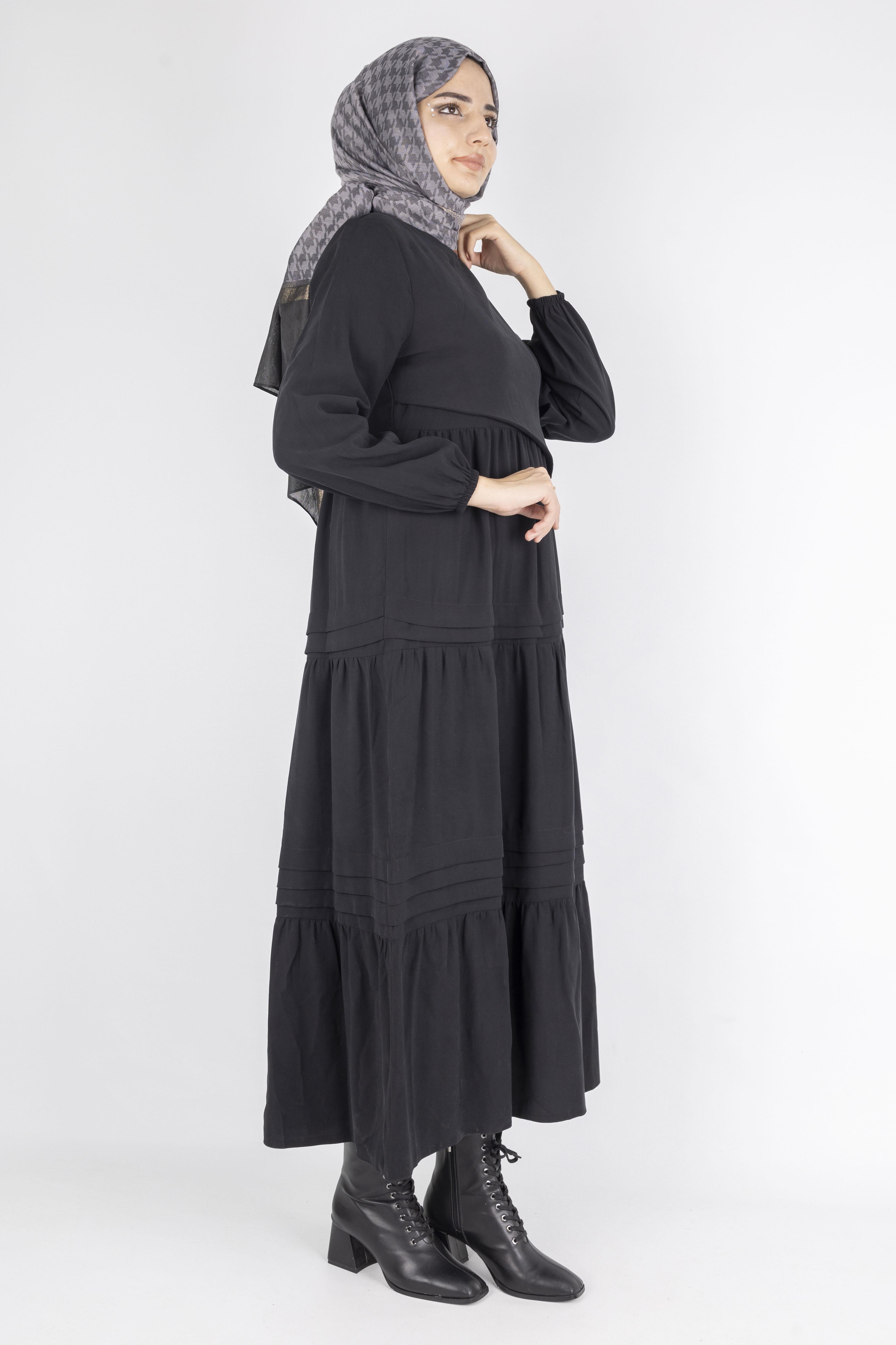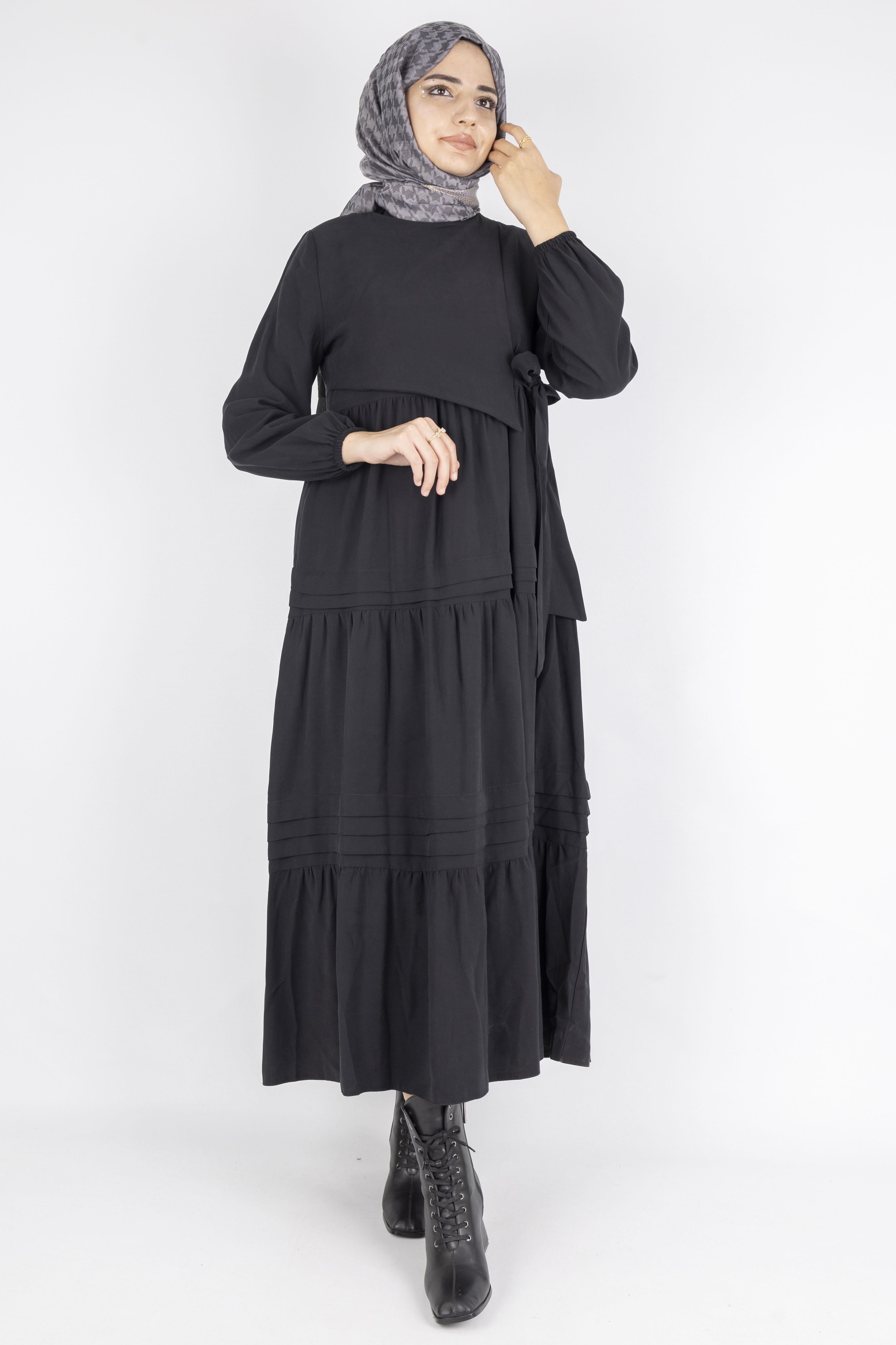 Kat Kat Pileli Yan Bağlamalı Tesettür Elbise Siyah OTW5262
