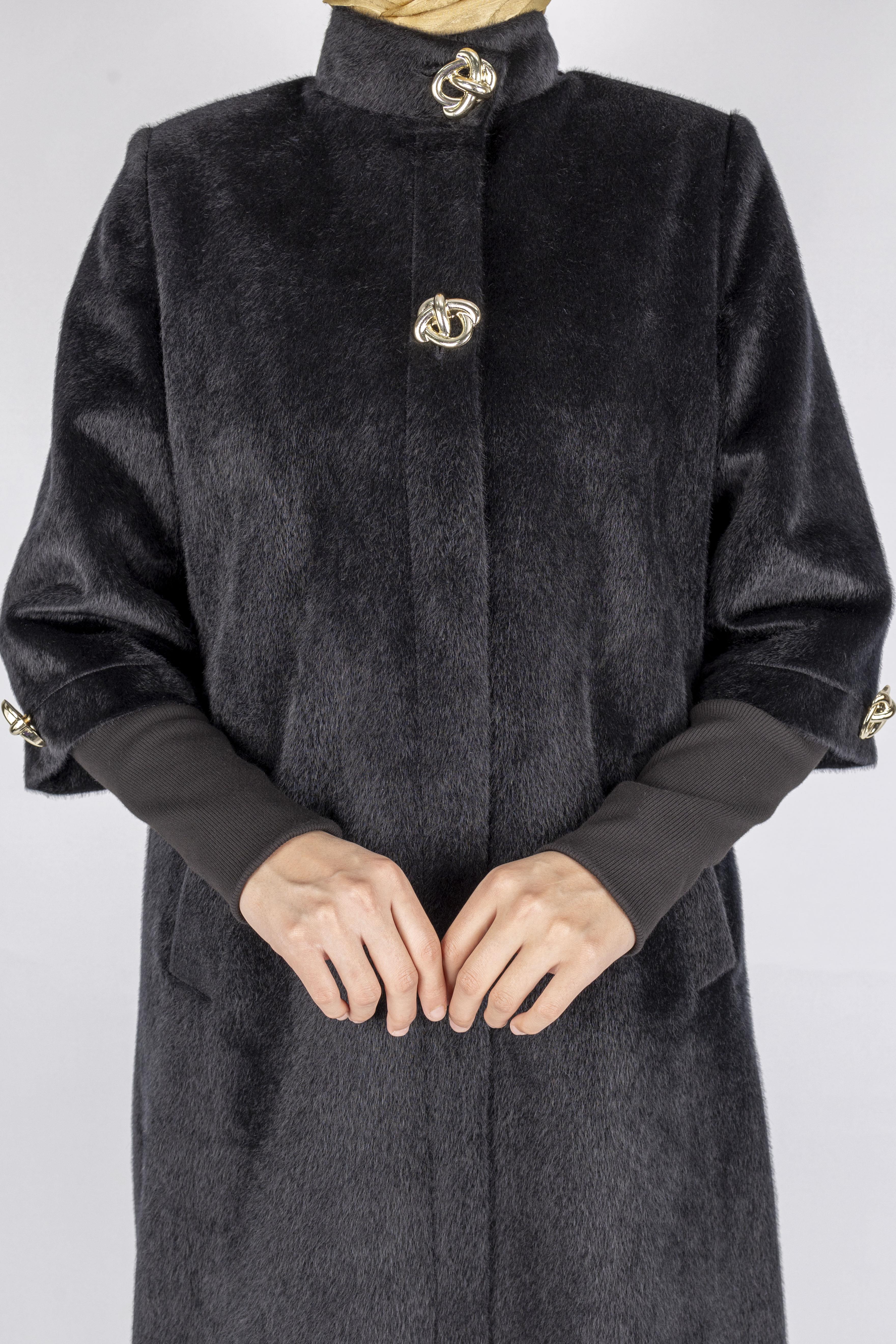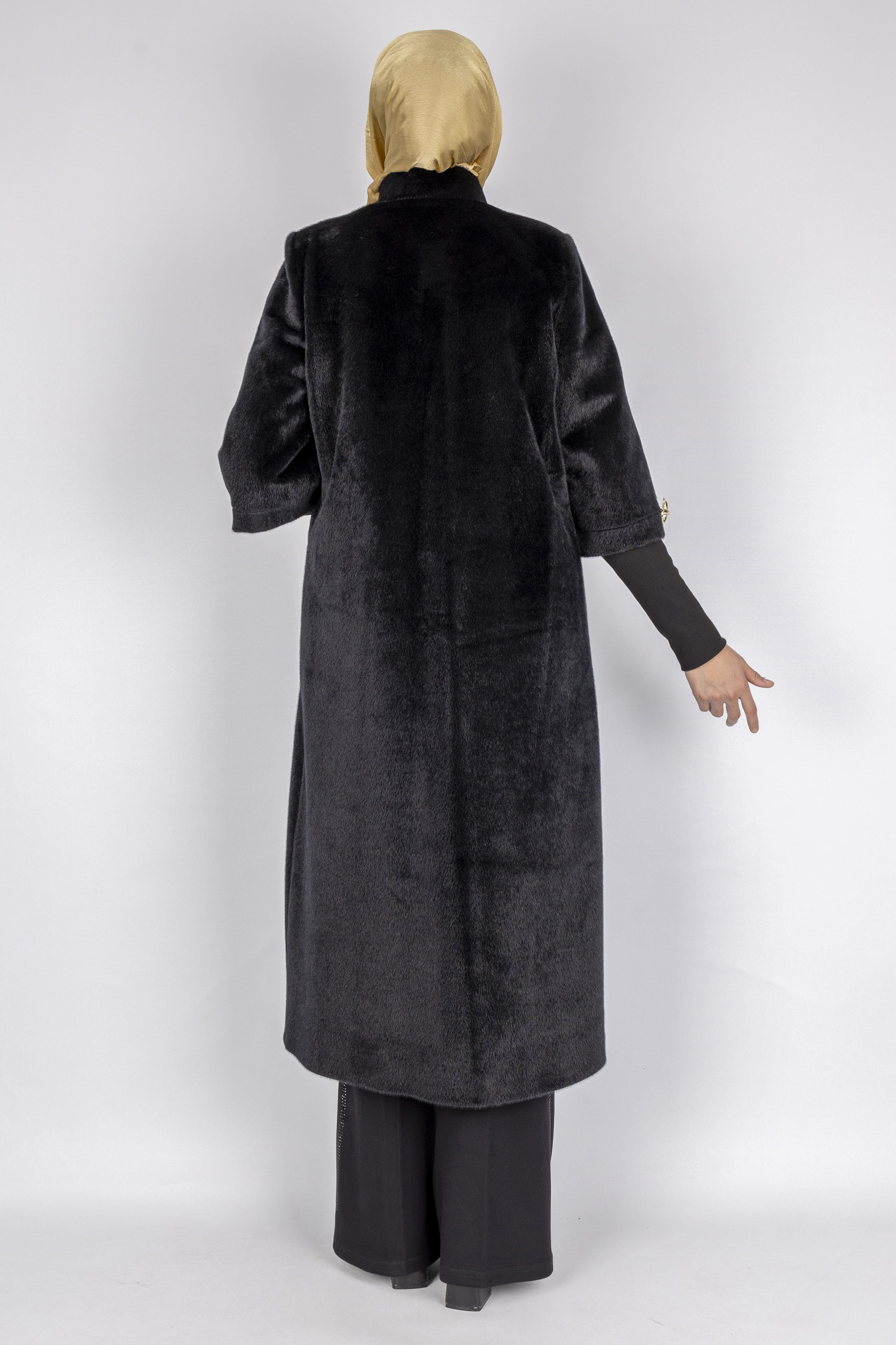 Ürün Detayları: Astarlı uzun kaban, yumuşak kürk görünümlü kumaşı, yan cepleri ve manşet kısmındaki triko ribana detayıyla tasarlanmıştır.