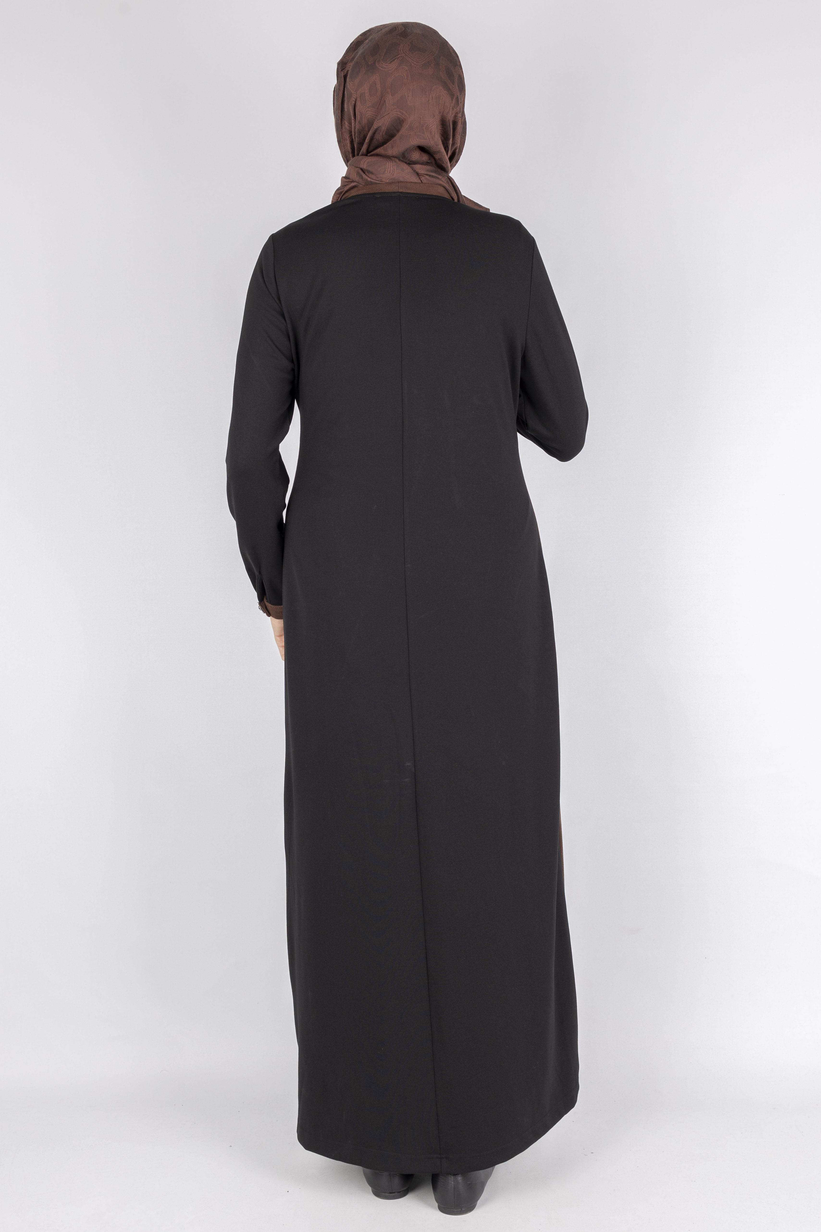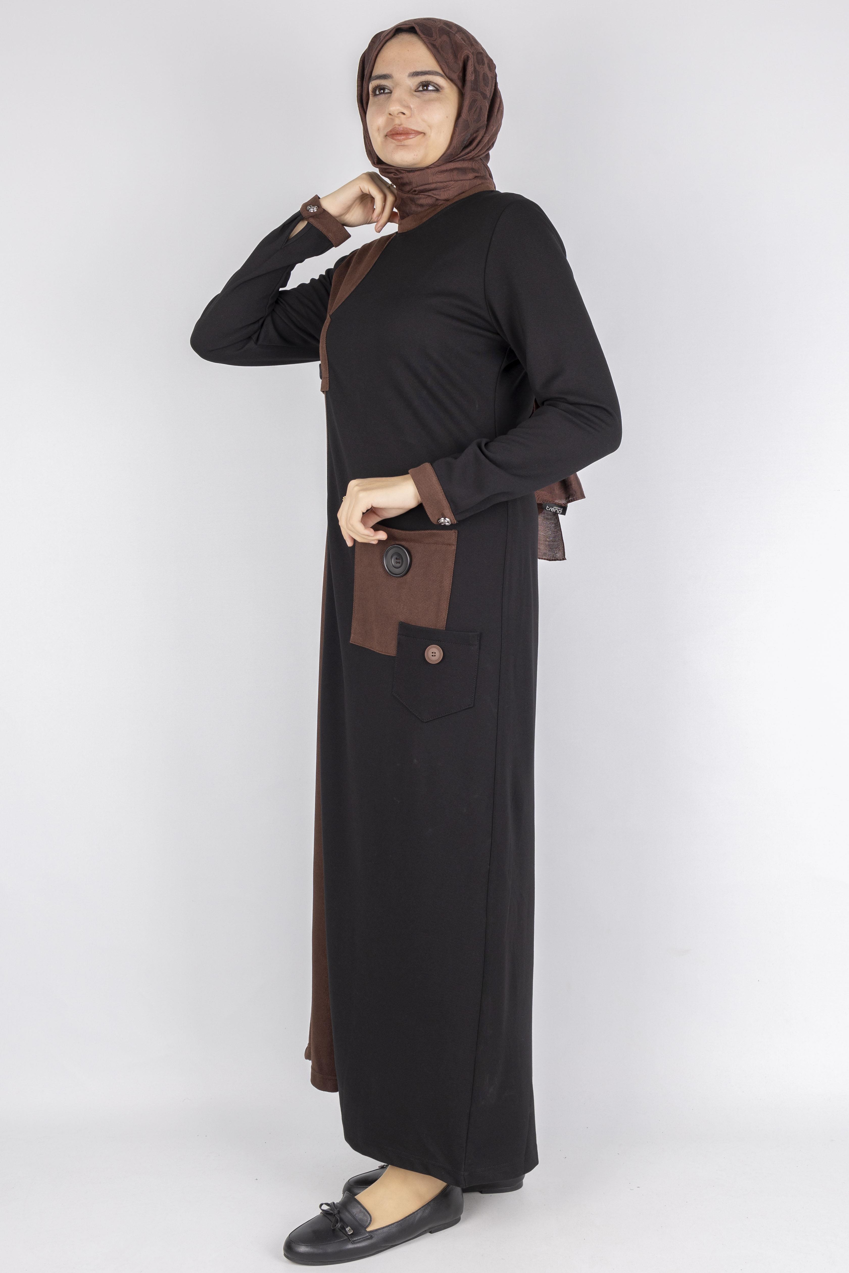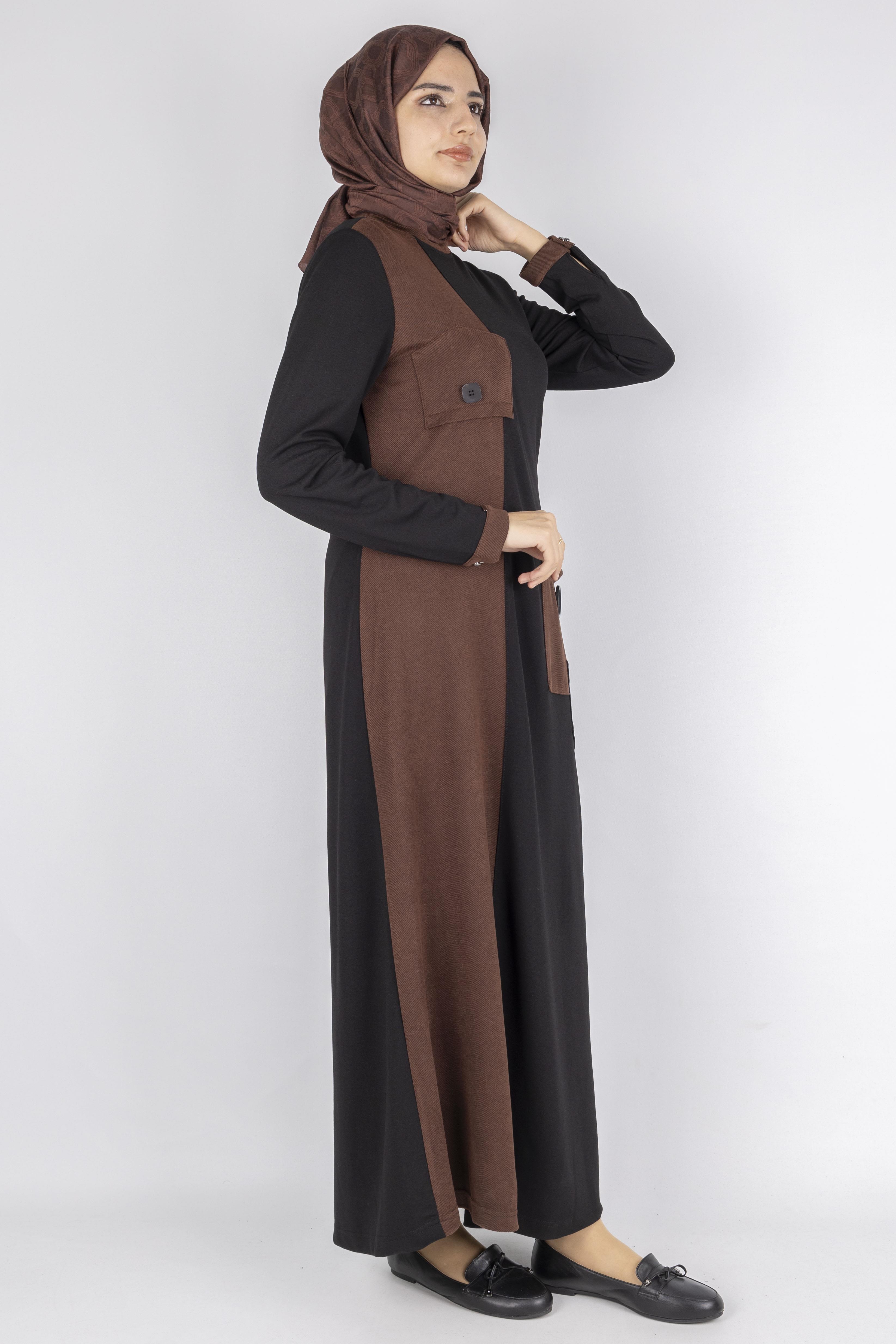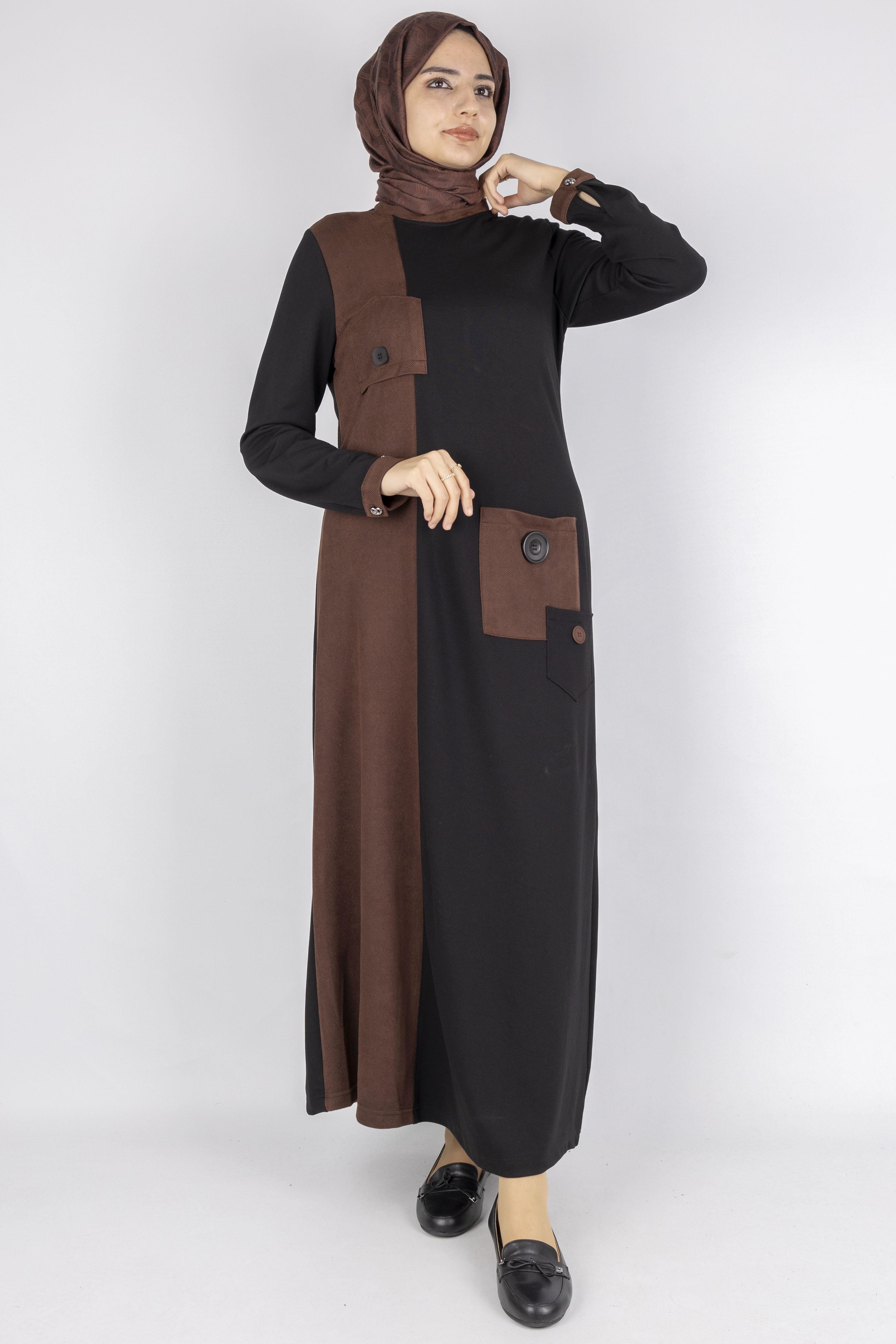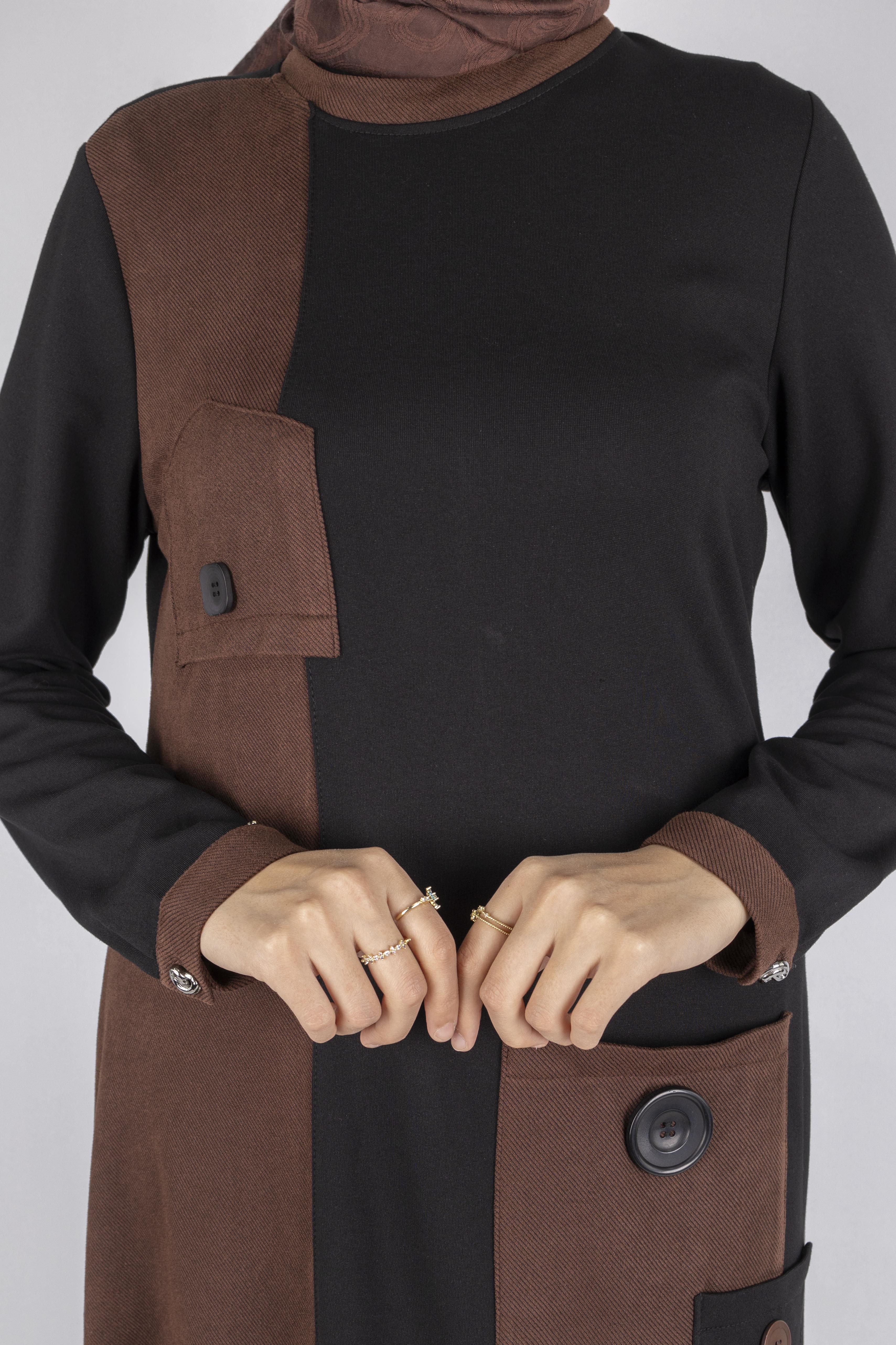 Kontrast Bloklu Patch Cepli Uzun Elbise Kahve OTW2062