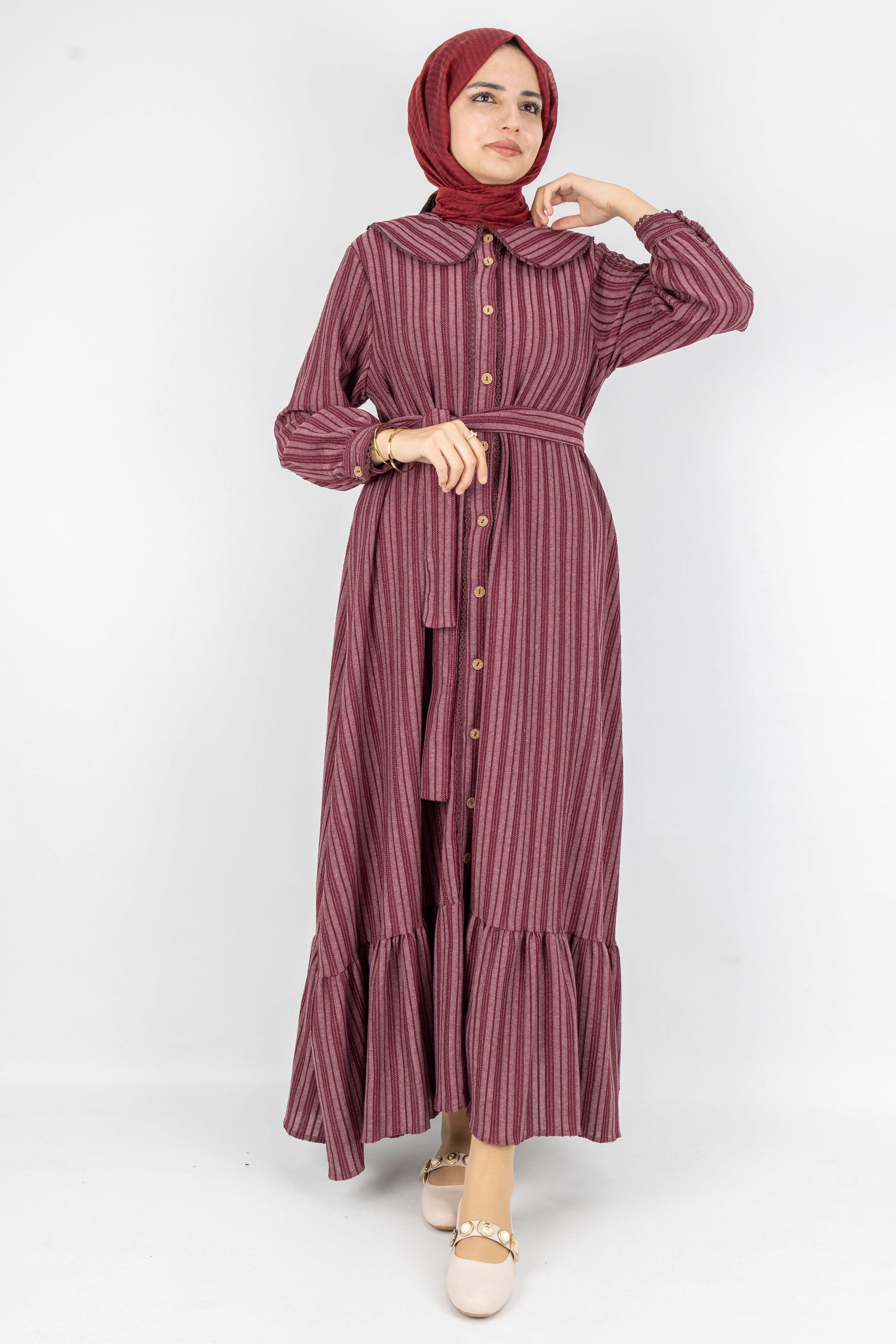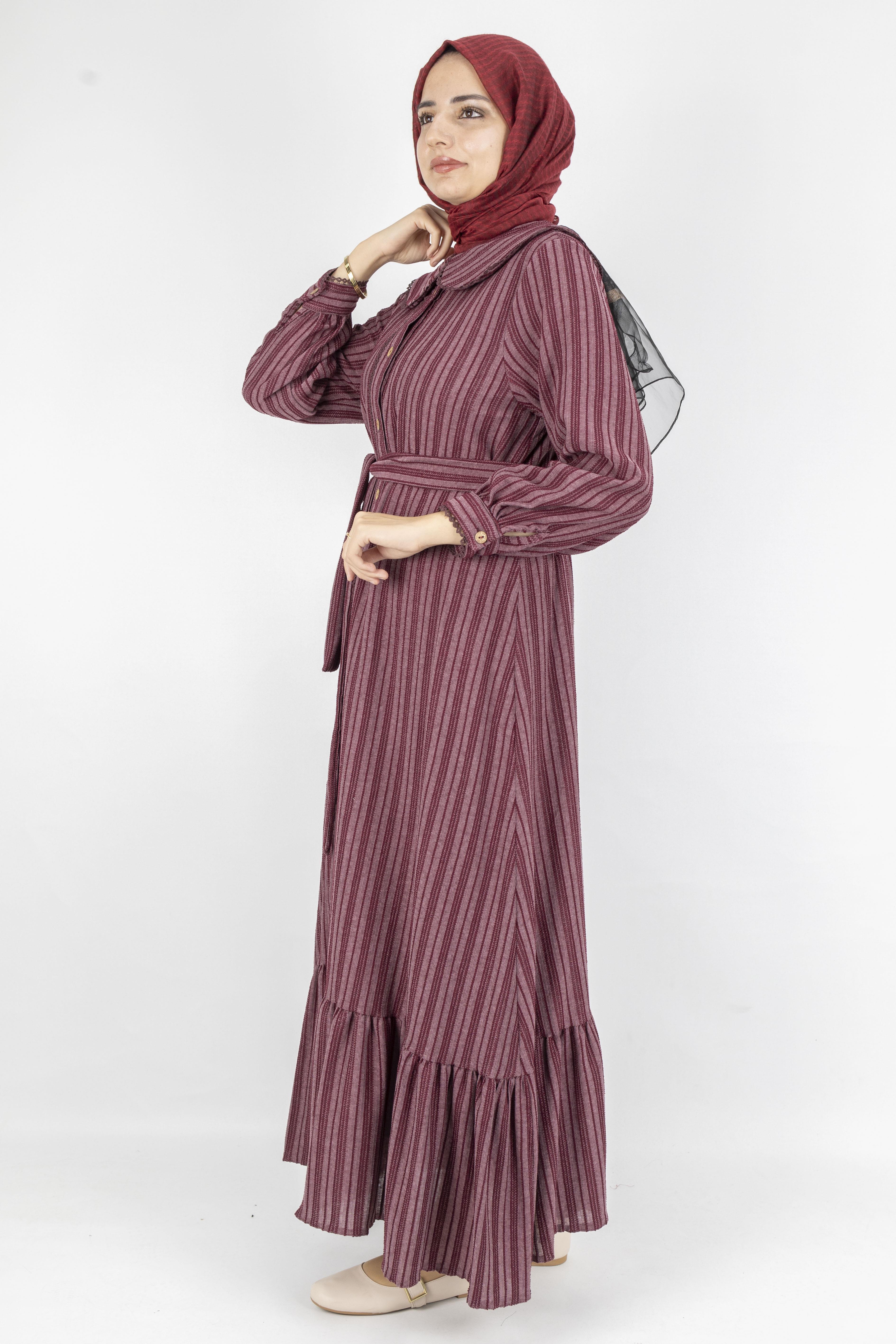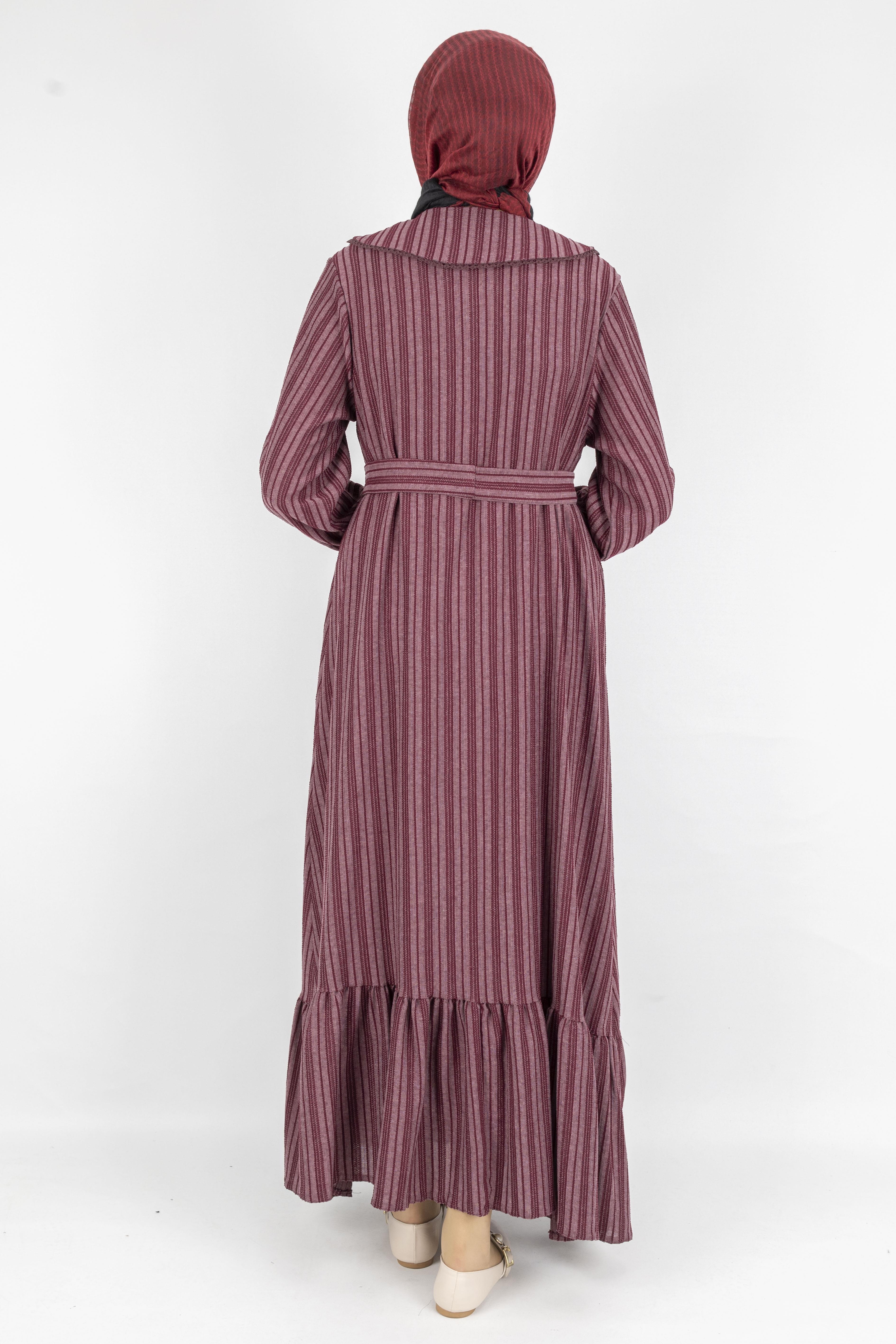 Kuşaklı Rahat Kesim Çizgili Bebe Yaka Elbise Bordo OTW7897