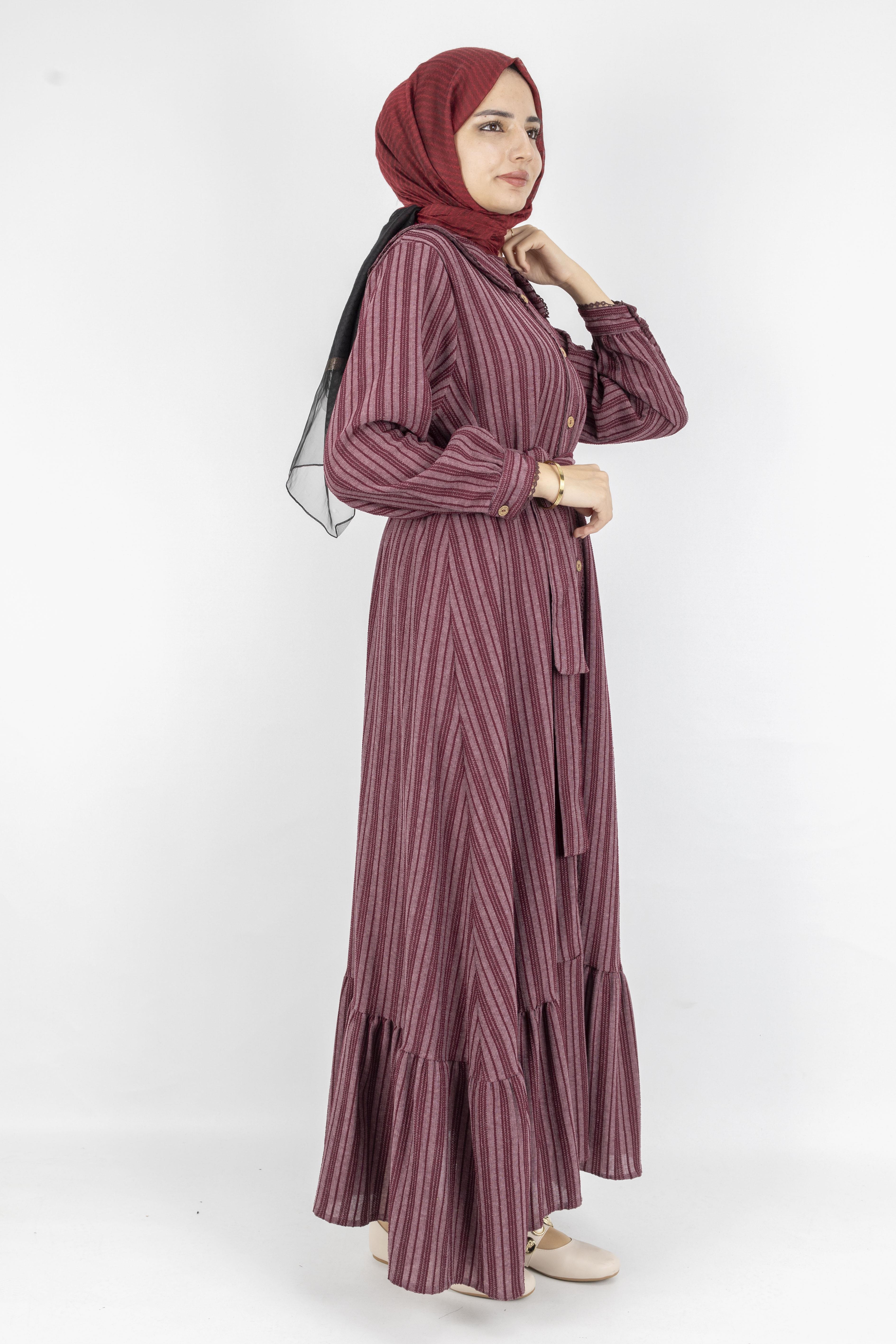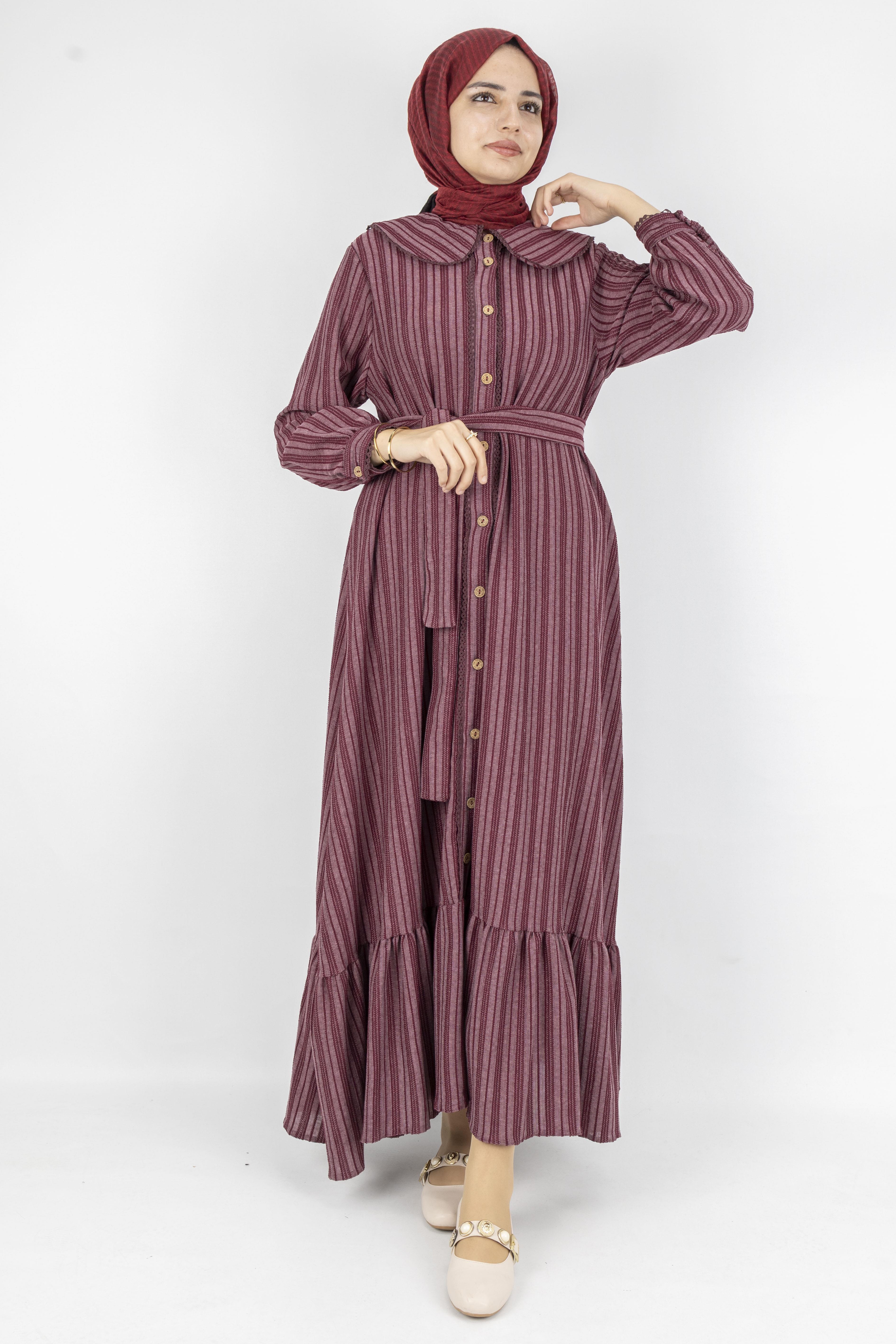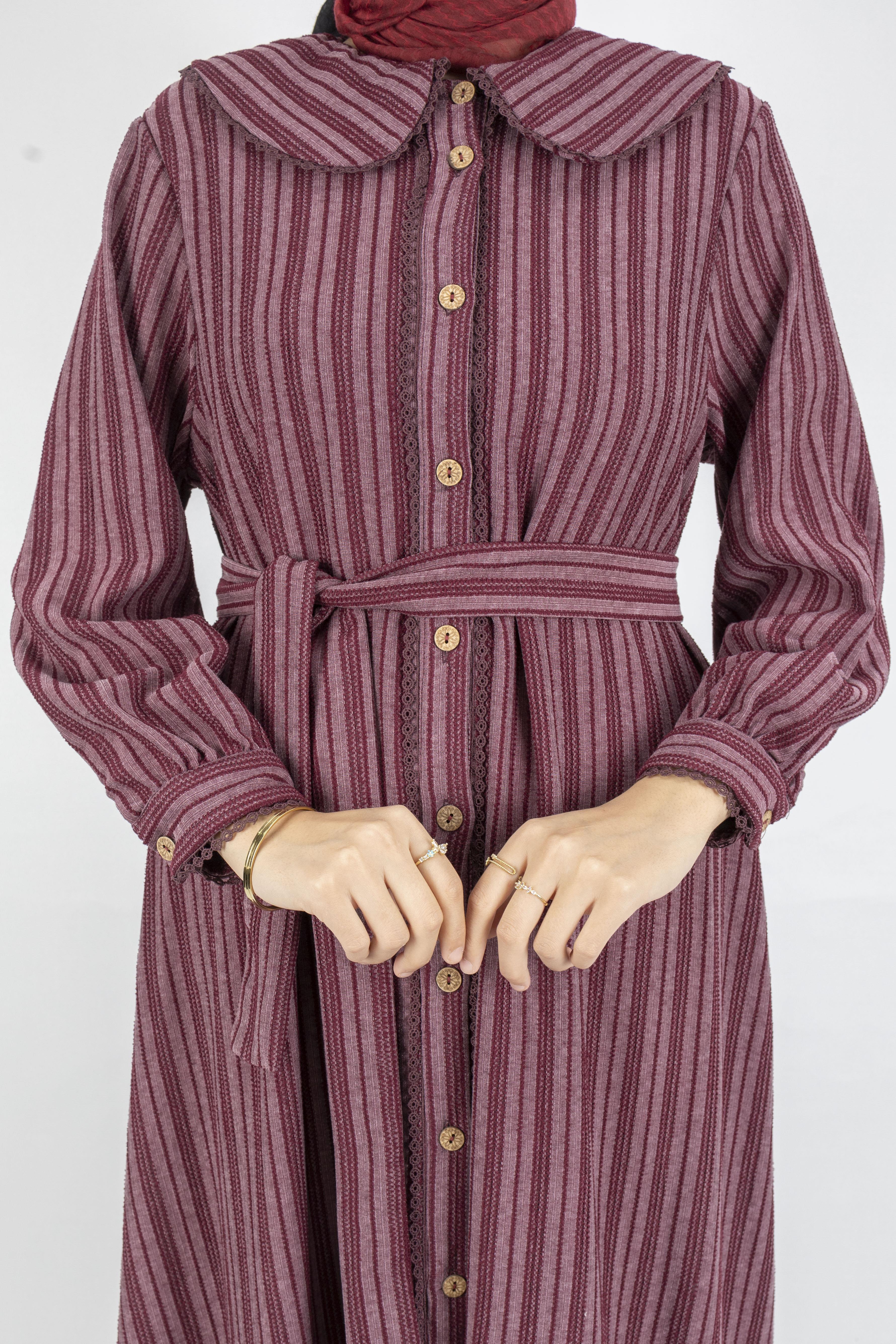 Kuşaklı Rahat Kesim Çizgili Bebe Yaka Elbise Bordo OTW7897