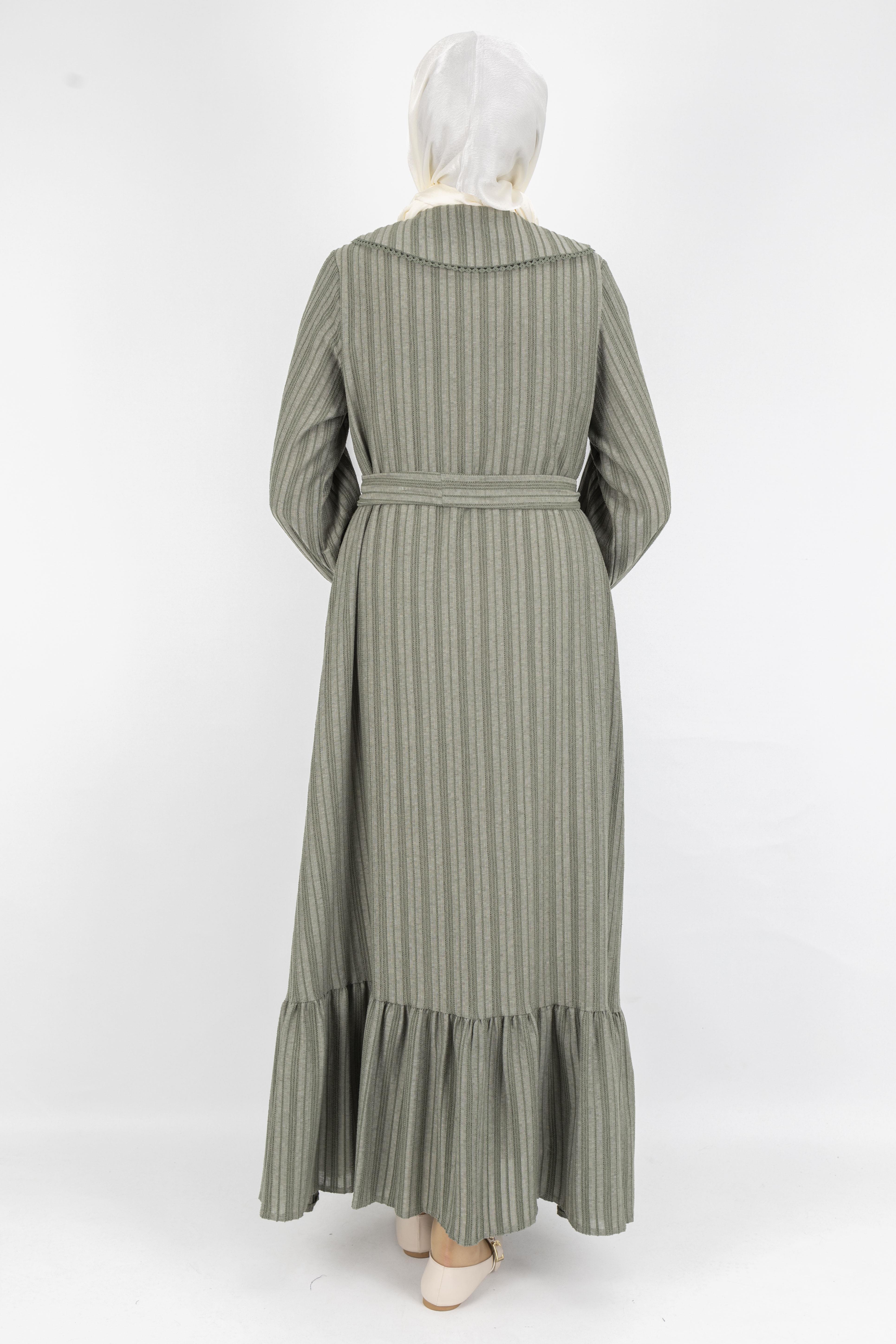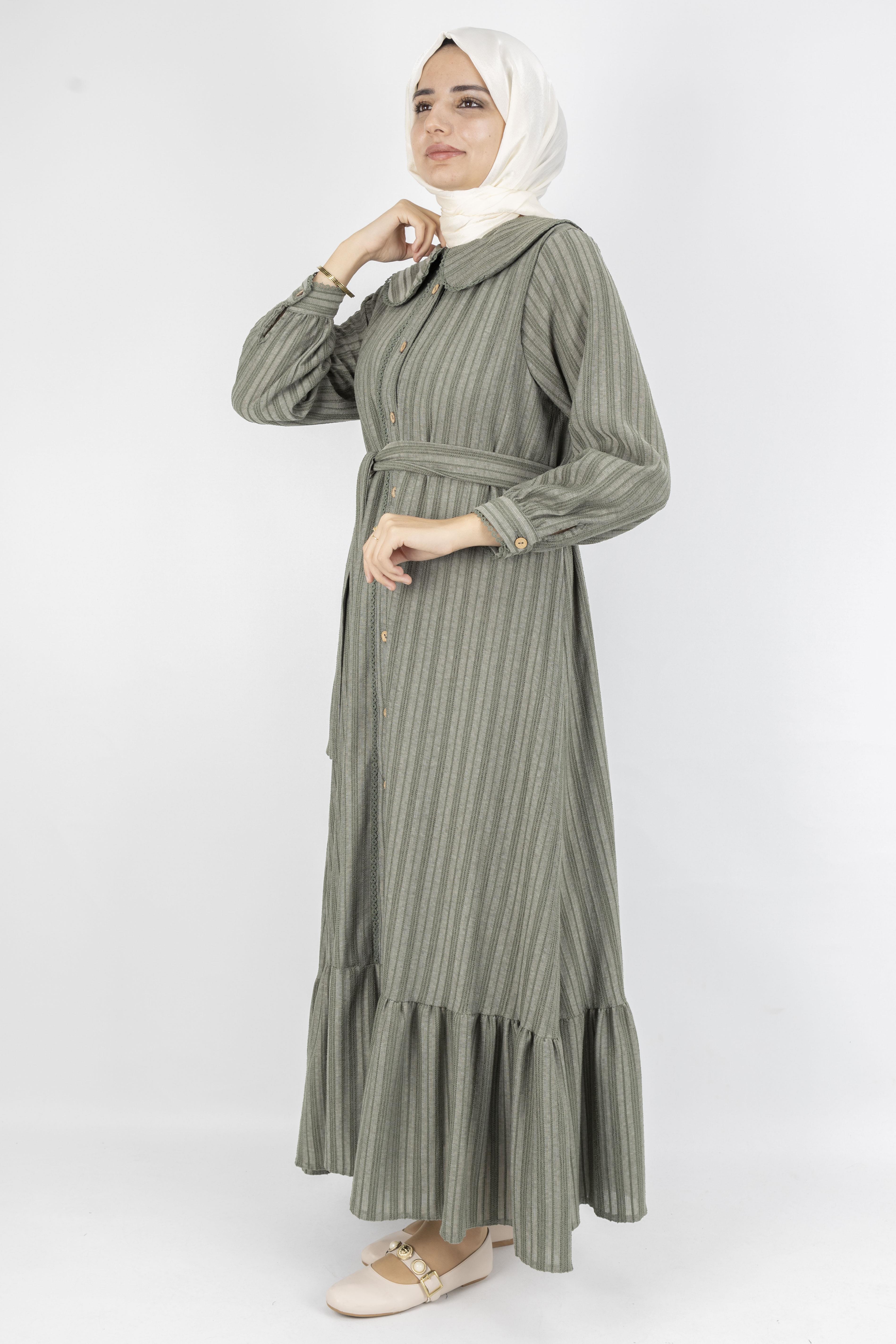 Ön kısmındaki açılabilir düğme detayı, elbiseye hem kullanım kolaylığı hem de şık bir görünüm kazandırır. Belden bağlamalı kuşak detayı vücut oranlarını dengelerken, alt kısmındaki volanlı etek formu elbiseye feminen ve hareketli bir hava katar. 140 cm boy uzunluğu ile tesettür giyime tam uyum sağlar.