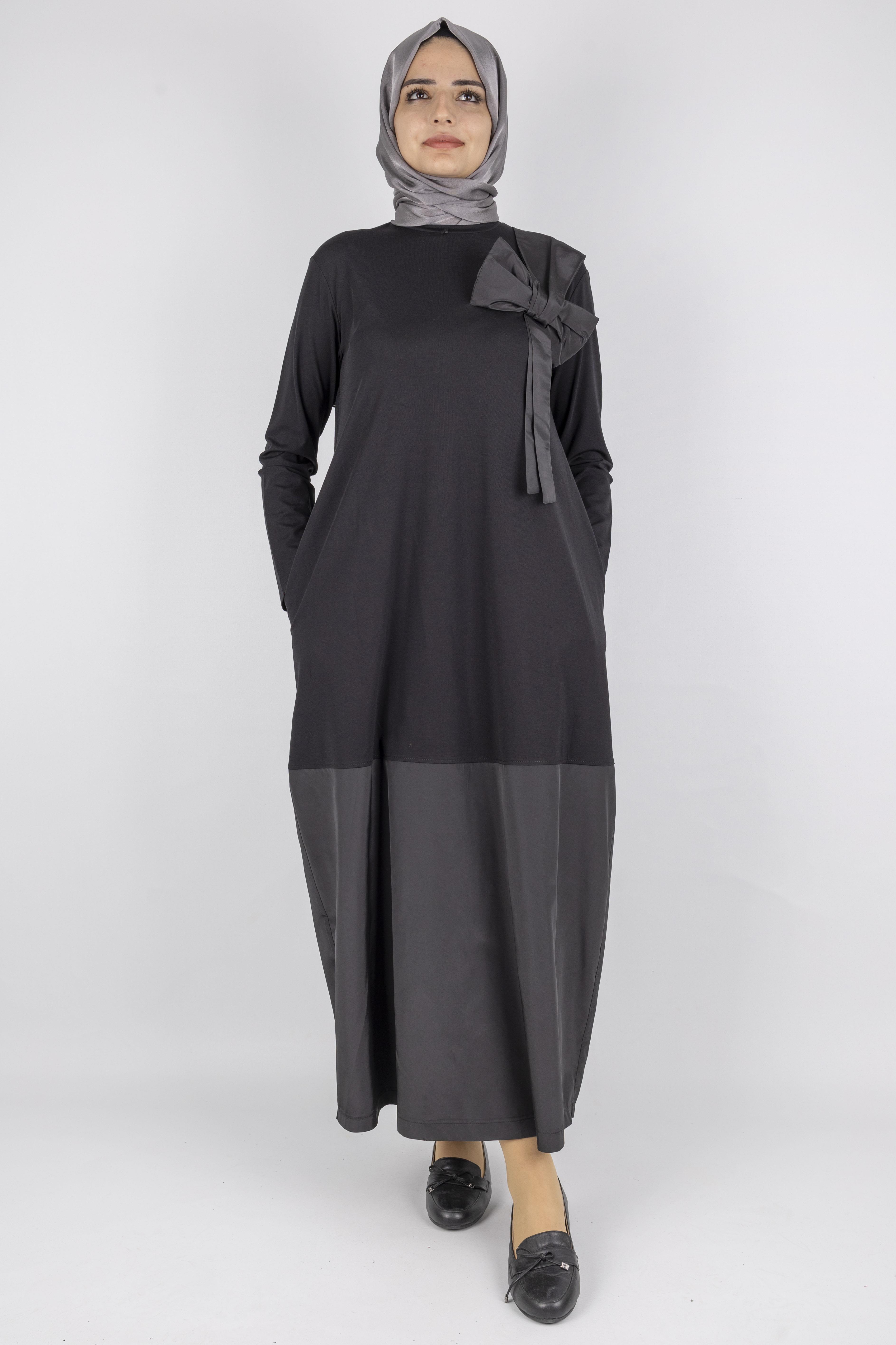Göğüs kısmında yer alan büyük fiyonk detayı, tasarıma feminen bir hava katarak sadeliği şıklığa dönüştürür. Yumuşak dokulu, dökümlü formuyla hem günlük hem de şehir stiline uyum sağlar. Ürün cepleriyle de fonksiyonel hale getirilmiştir.