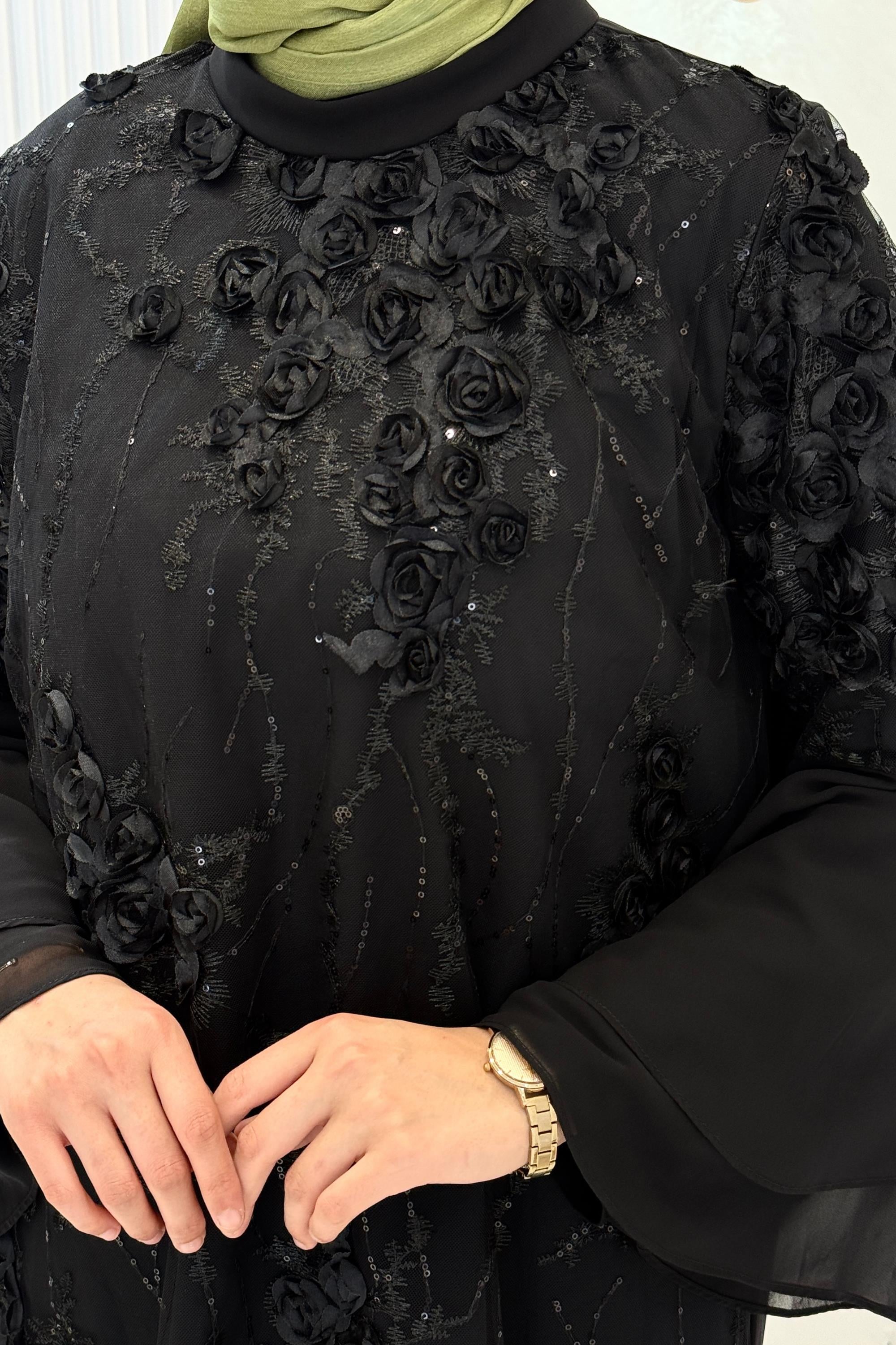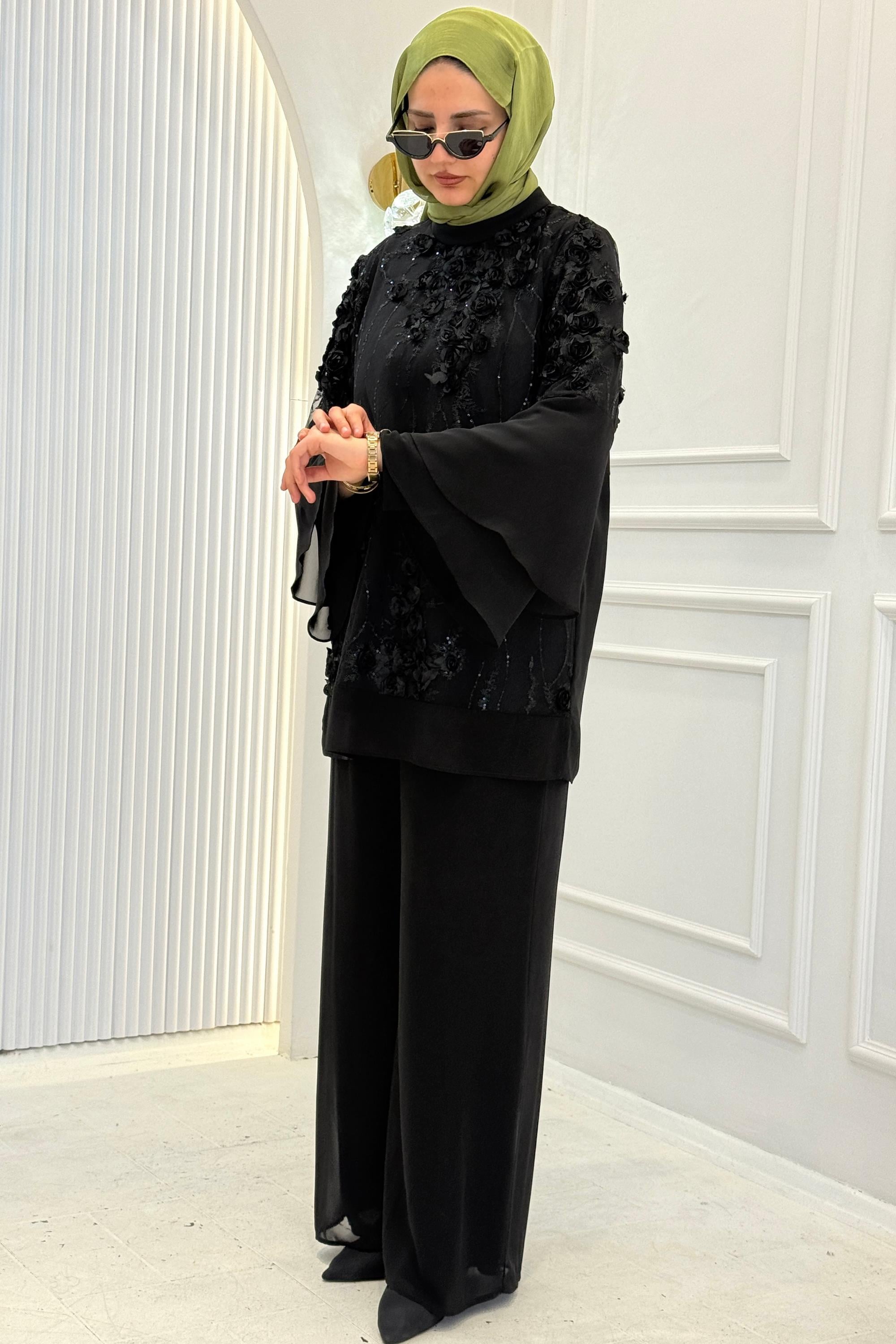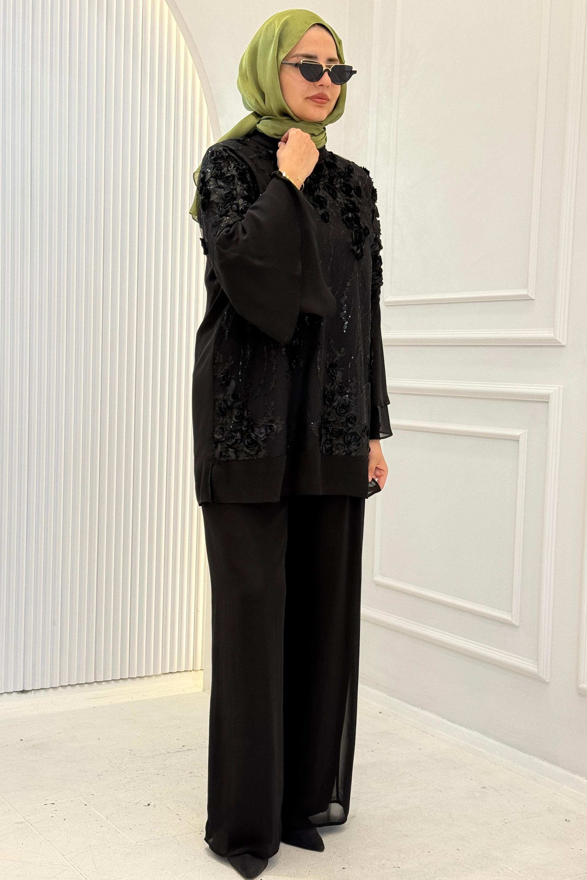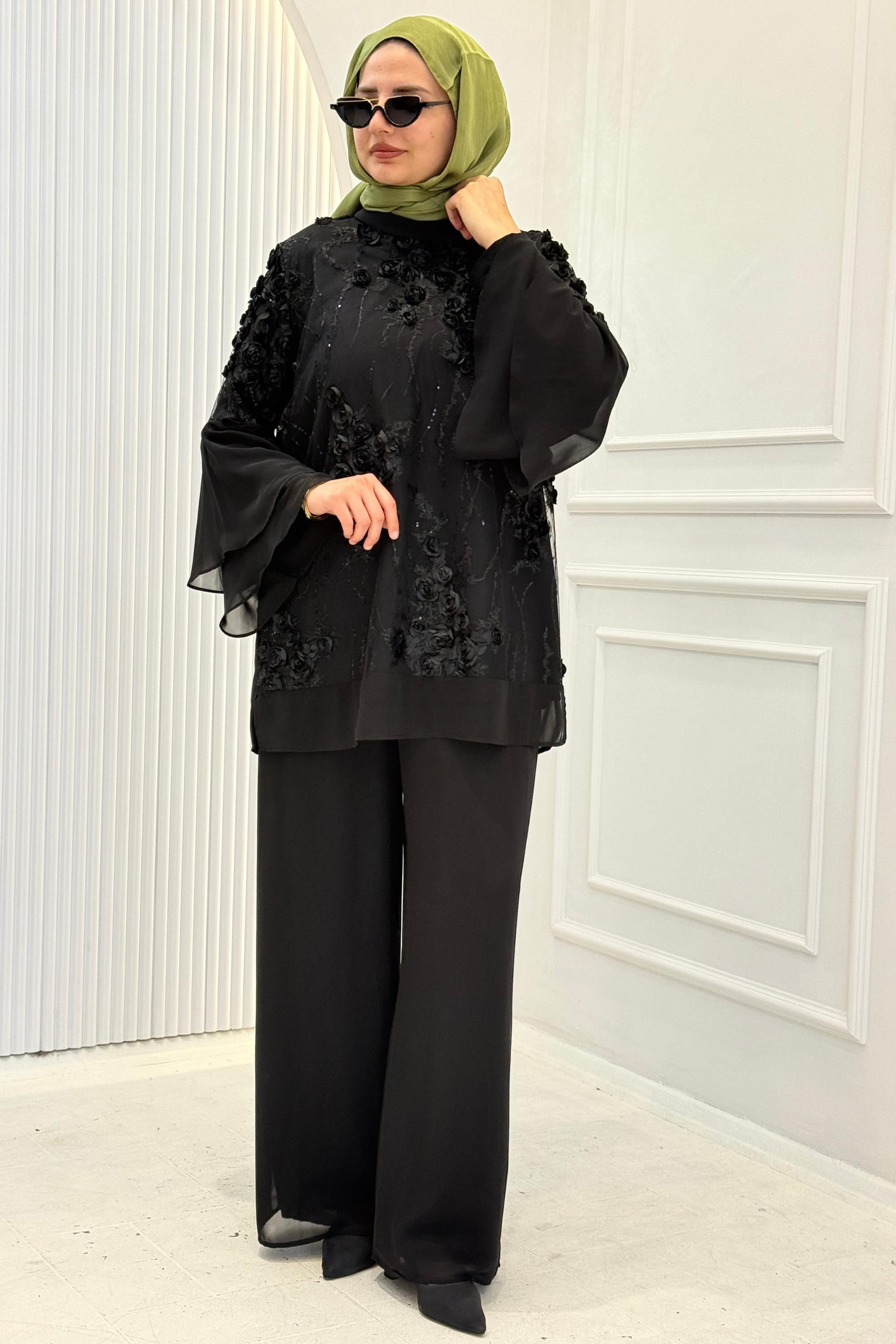 Orhan Store Çiçek Aplikeli Şık Tunik Pantolon Takım Siyah OTW2892