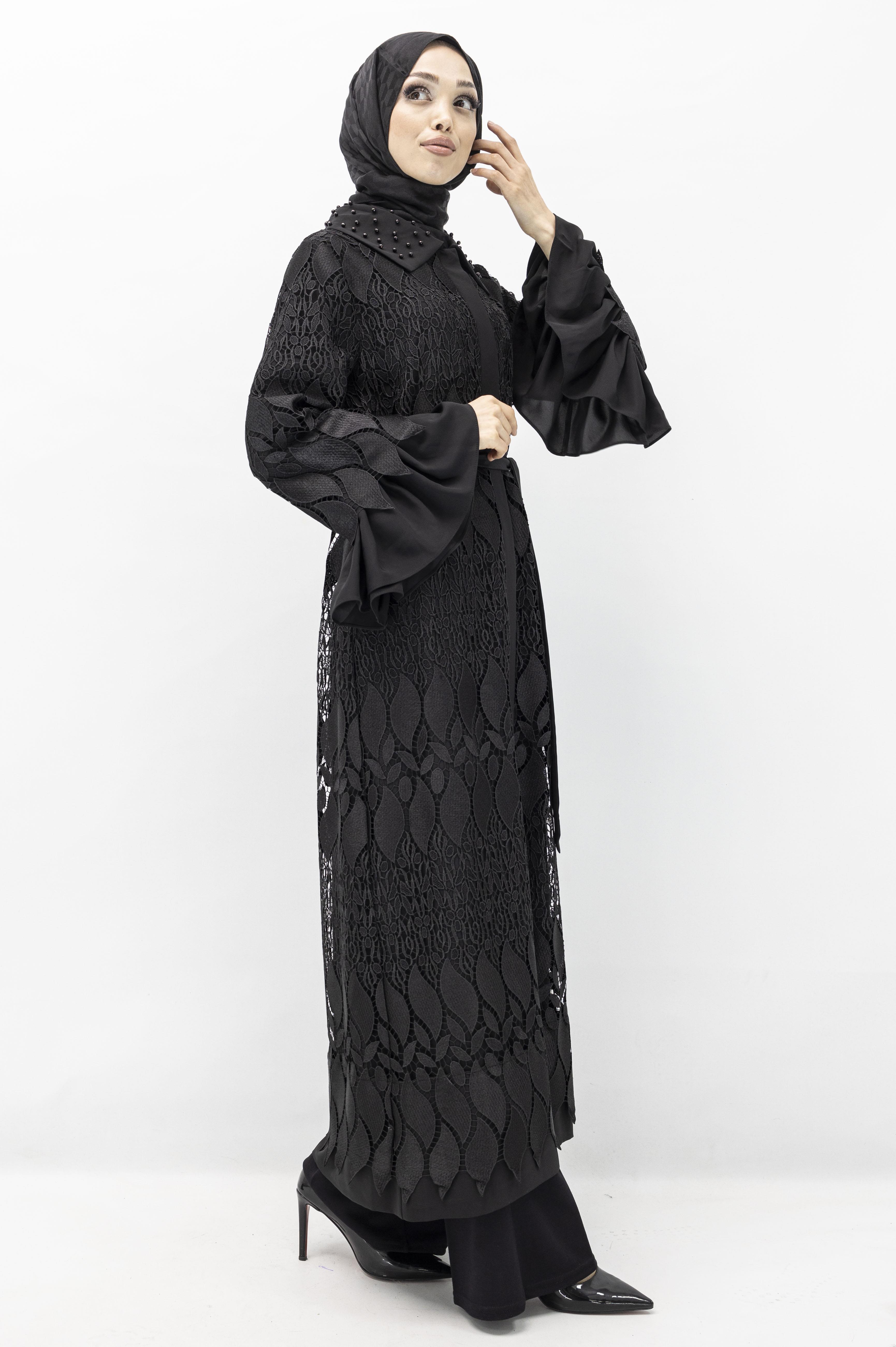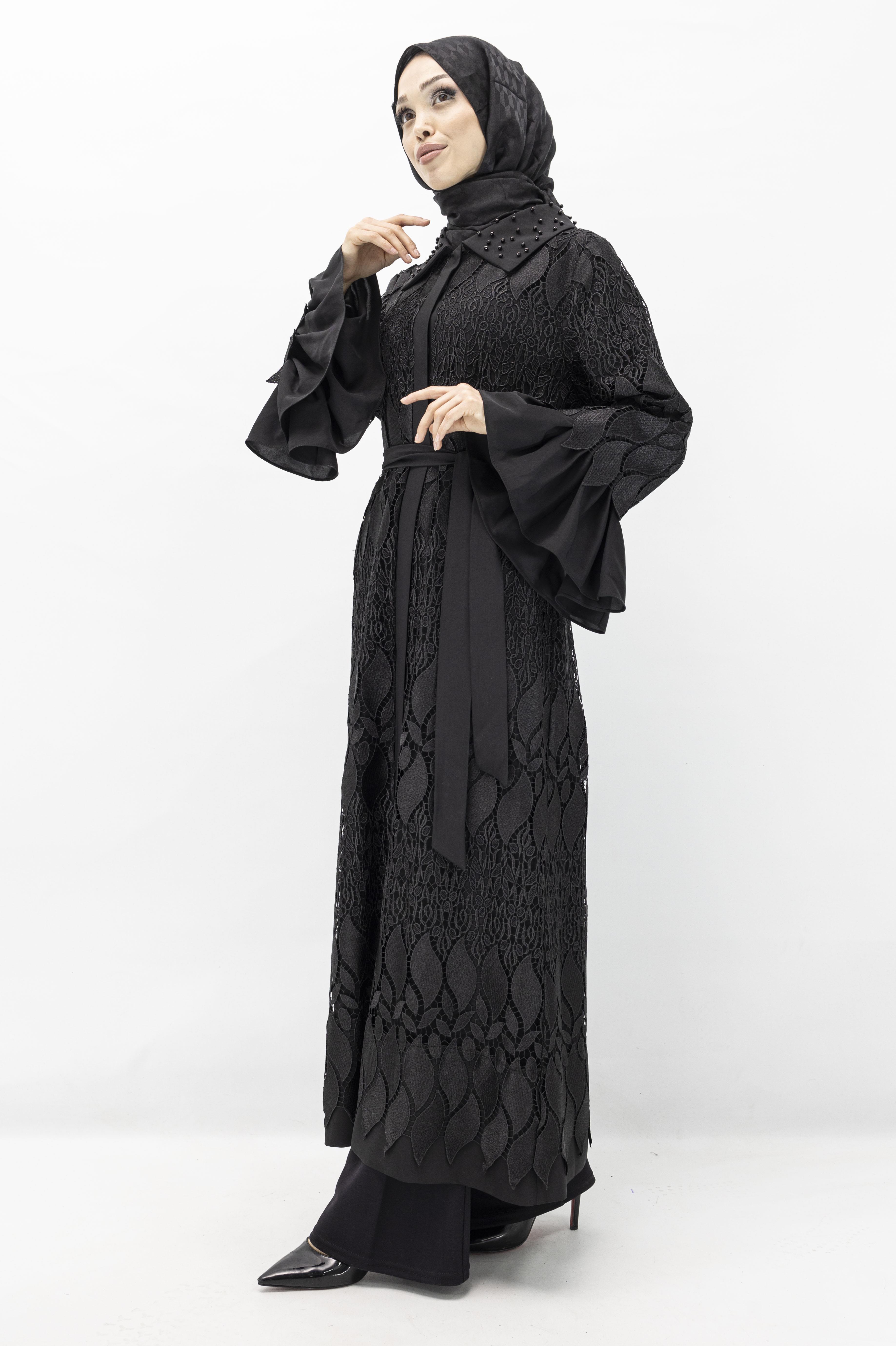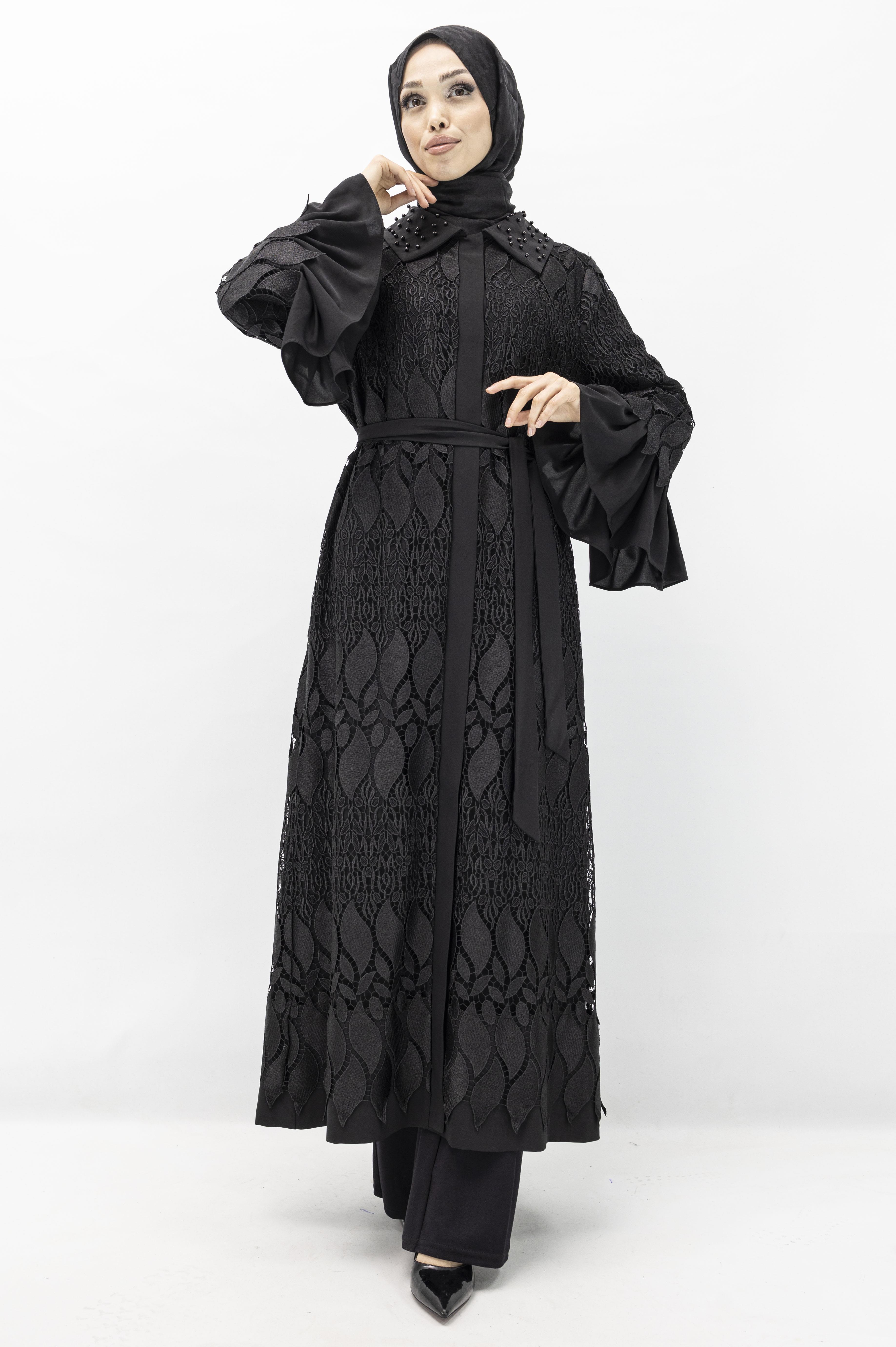 Kollarındaki volan form ve yaka bölümündeki inci detaylar, tasarıma feminen ve asil bir duruş kazandırır. Boyu 140 cm olan bu model, tesettür giyime tam uyum sağlar. Düğün, nişan, davet ve özel organizasyonlar için şık ve güvenli bir tercihtir.
