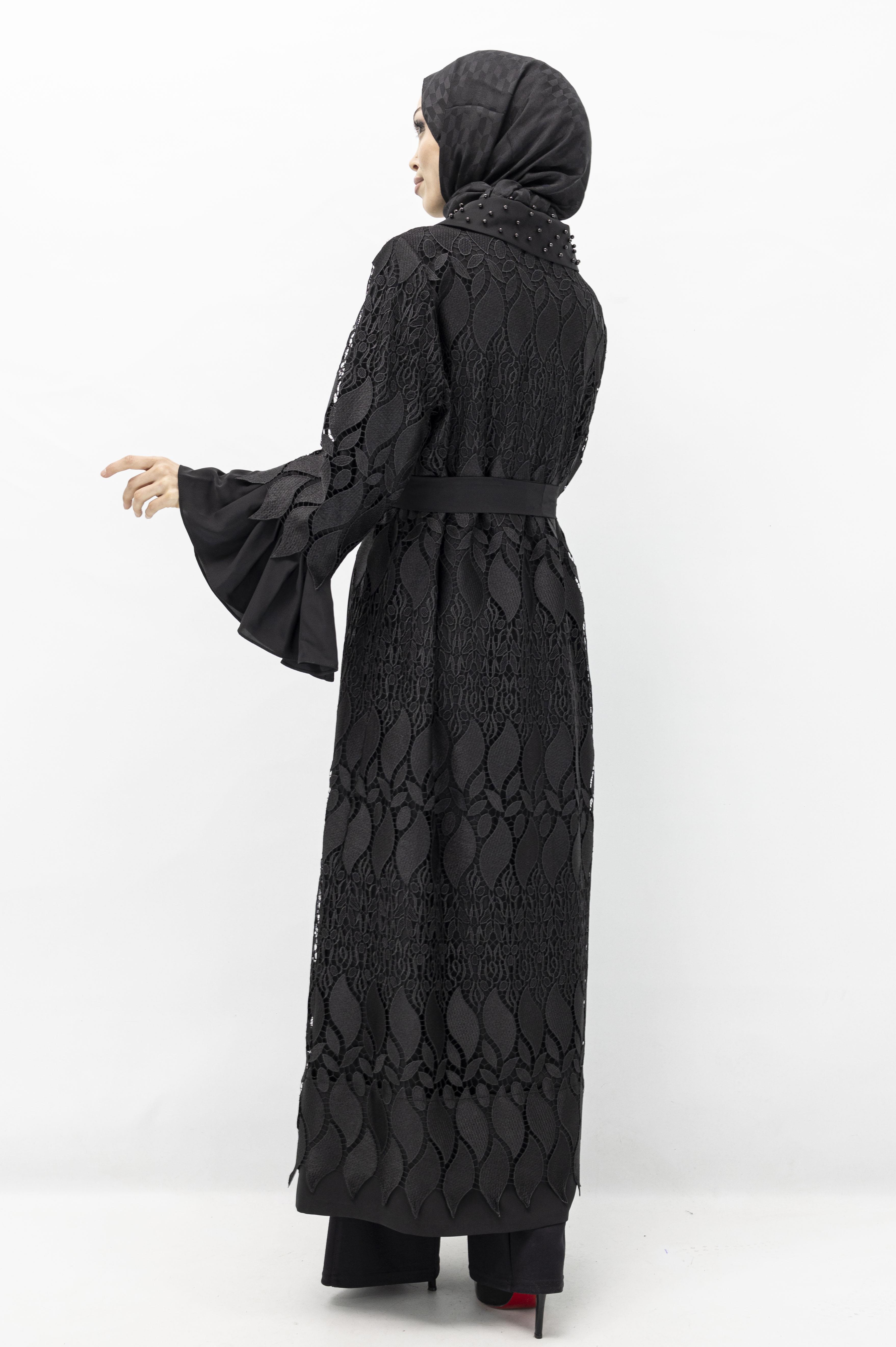 Zarif dantel dokusu ve şık kuşak detayıyla öne çıkan bu büyük beden tesettür ferace, özel gün ve davet şıklığını konforla birleştirir. Gövde boyunca kullanılan dantel desen, feraceye sofistike bir hava katarken; belden bağlamalı kuşak detayı vücut oranlarını dengeler ve toparlayıcı bir siluet sunar.