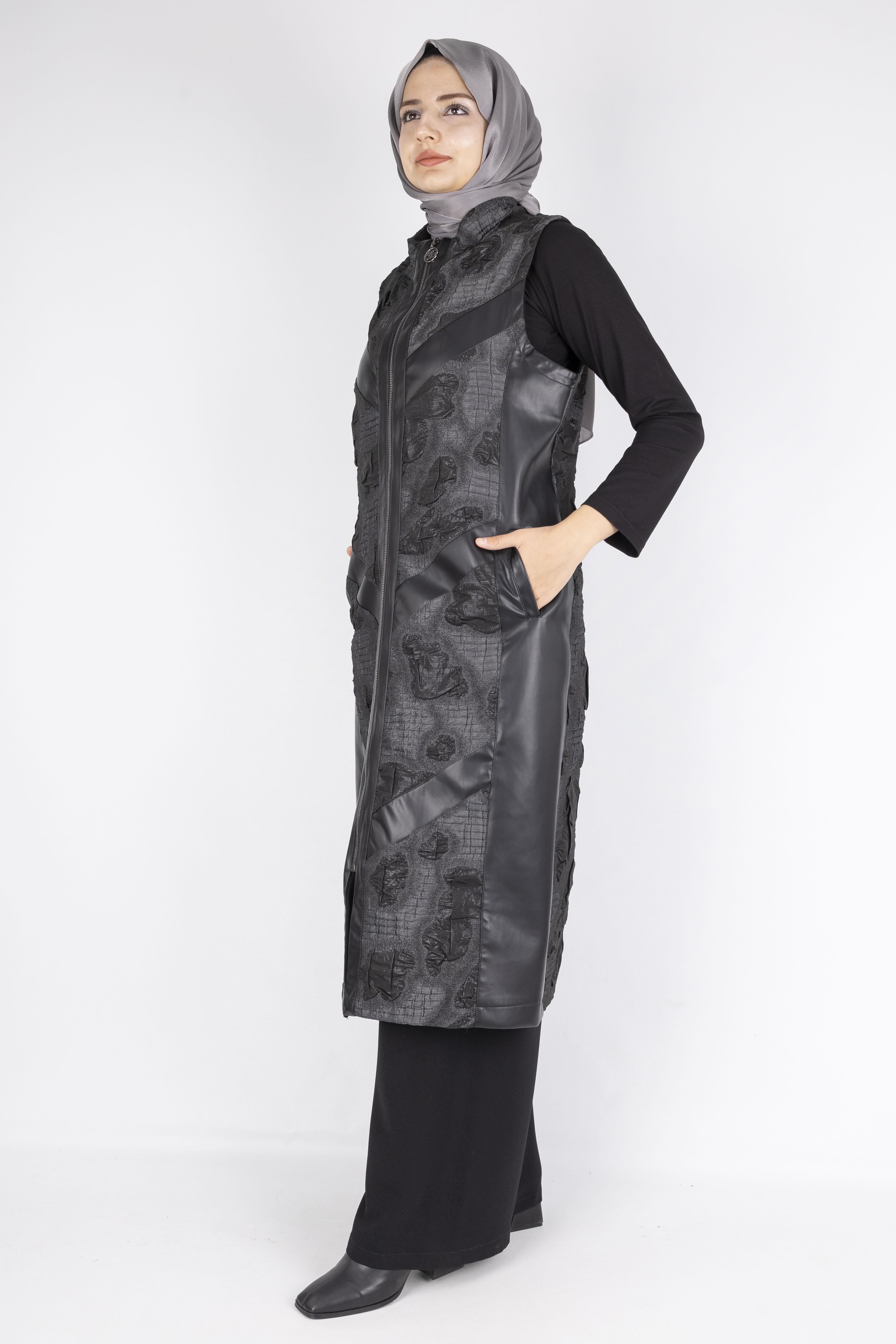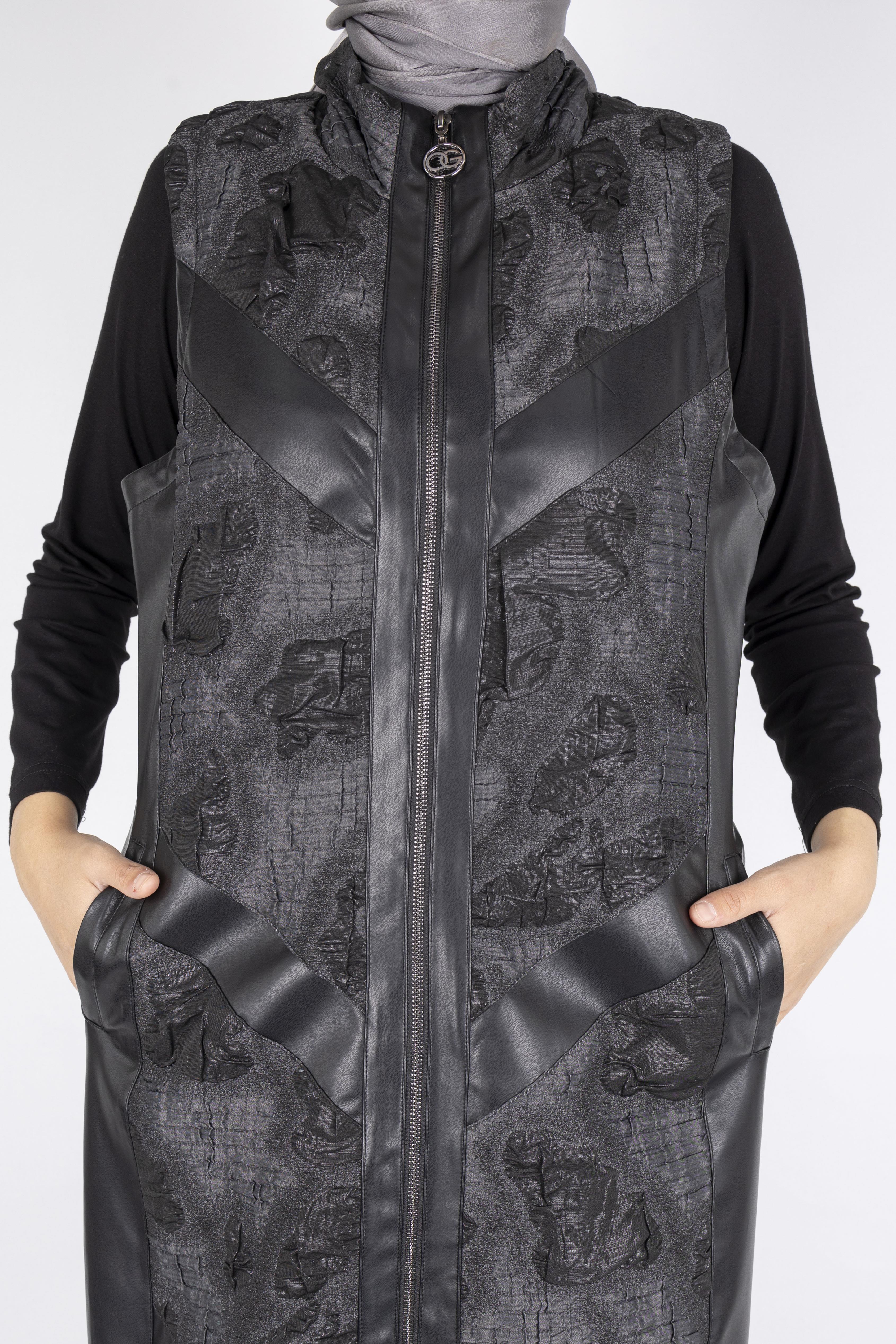 Şıklığı ve rahatlığı bir arada sunan jakar kumaş detaylı deri yelek. Günlük kombinlerde, tesettür dış giyimde ve modern stillerde vazgeçilmez bir parça.