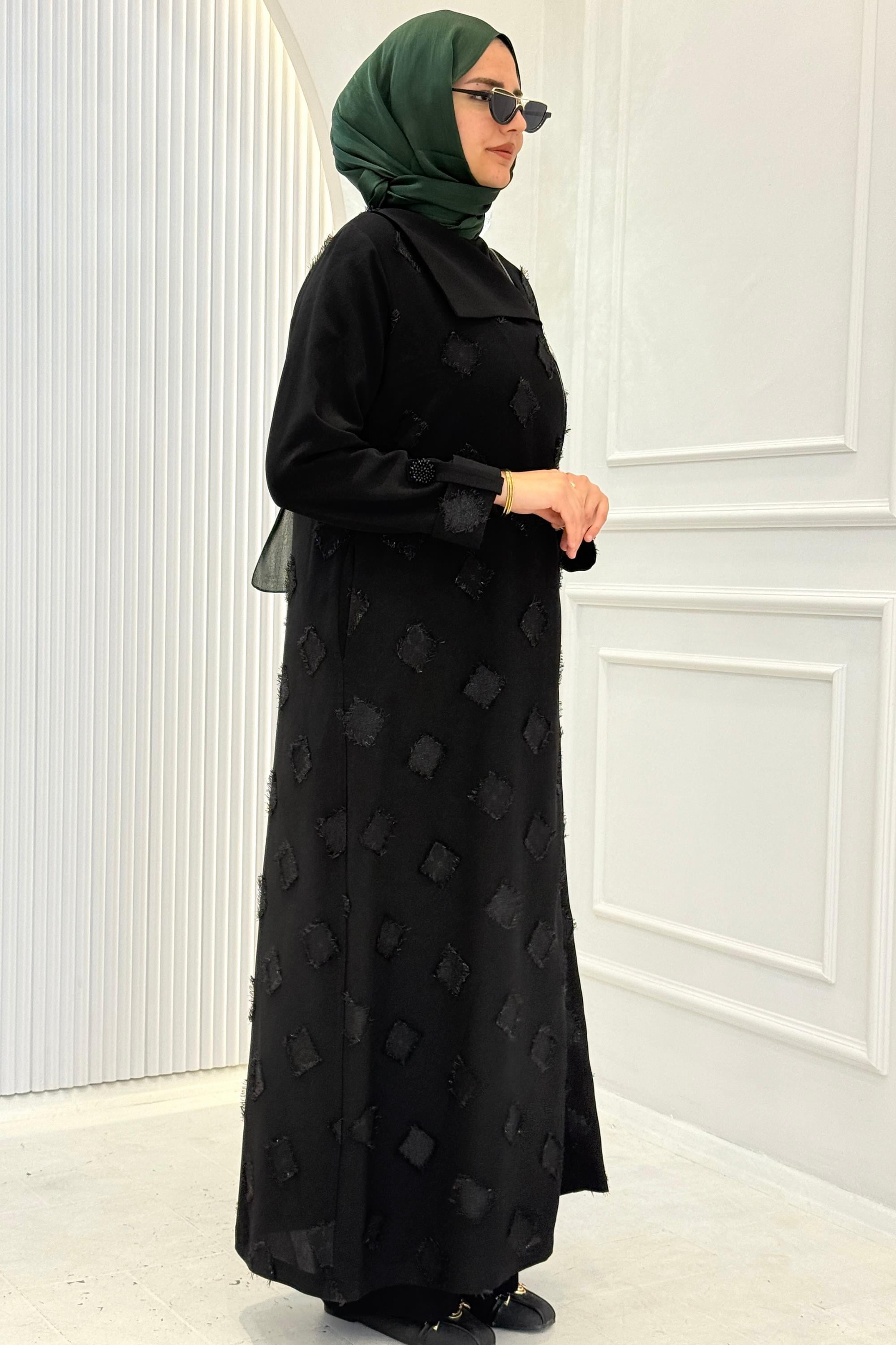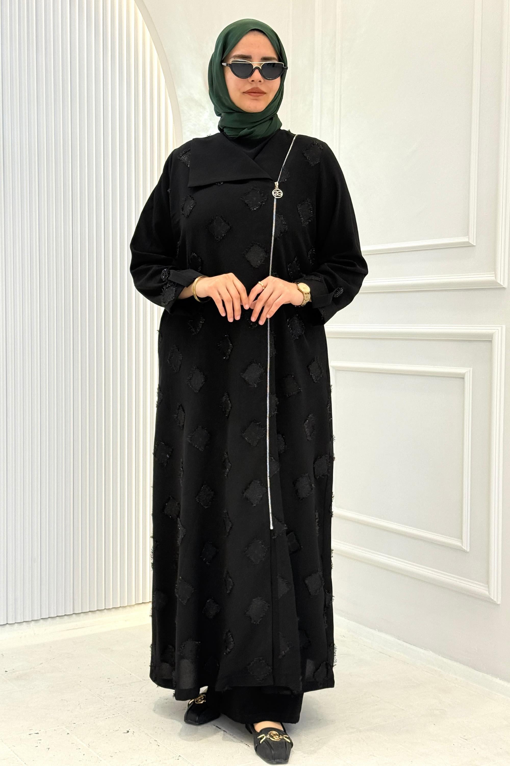 Önden fermuar detayı ile pratik kullanım sunarken, tam boy kesimiyle tesettür şıklığını tamamlar.