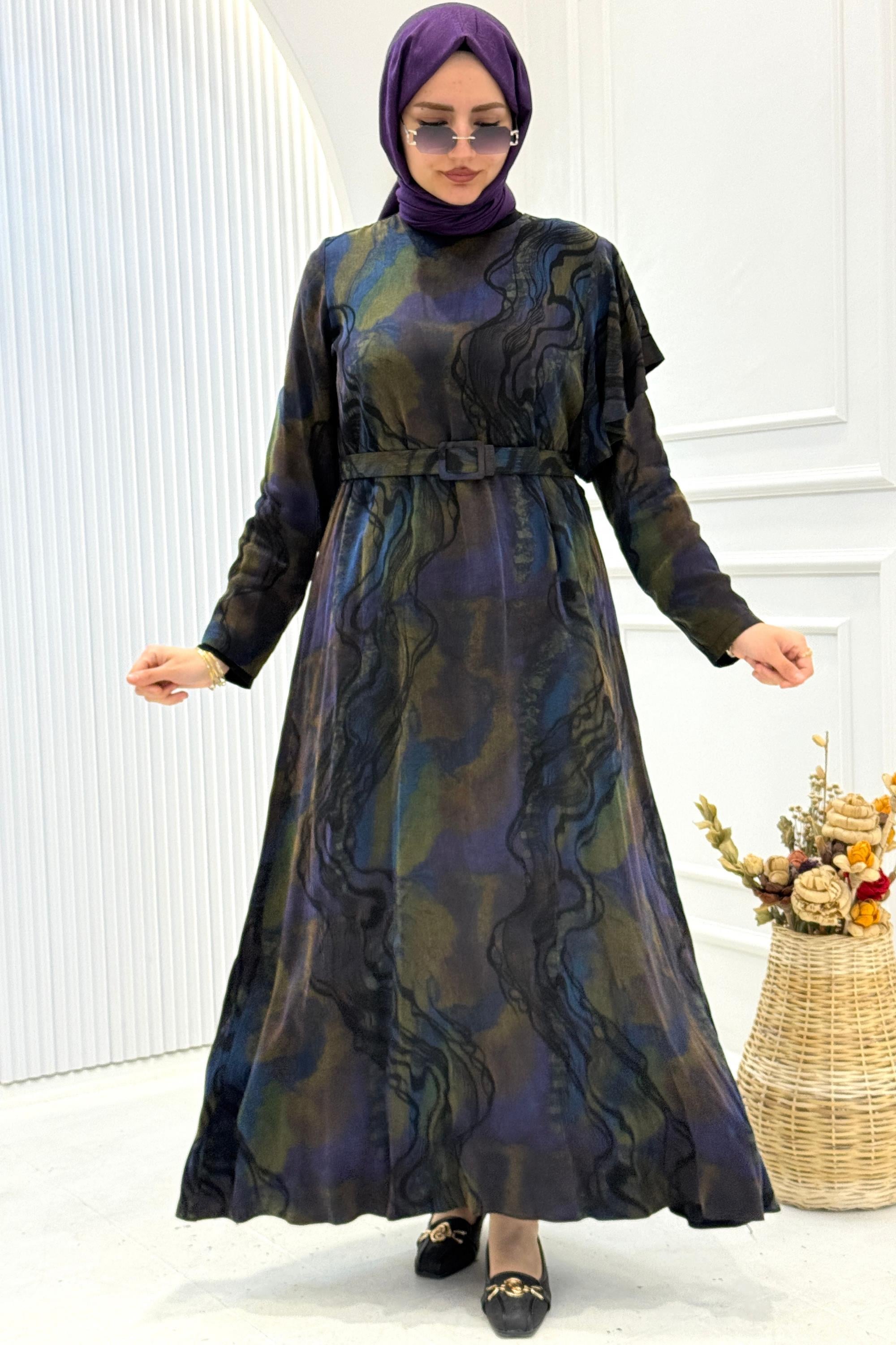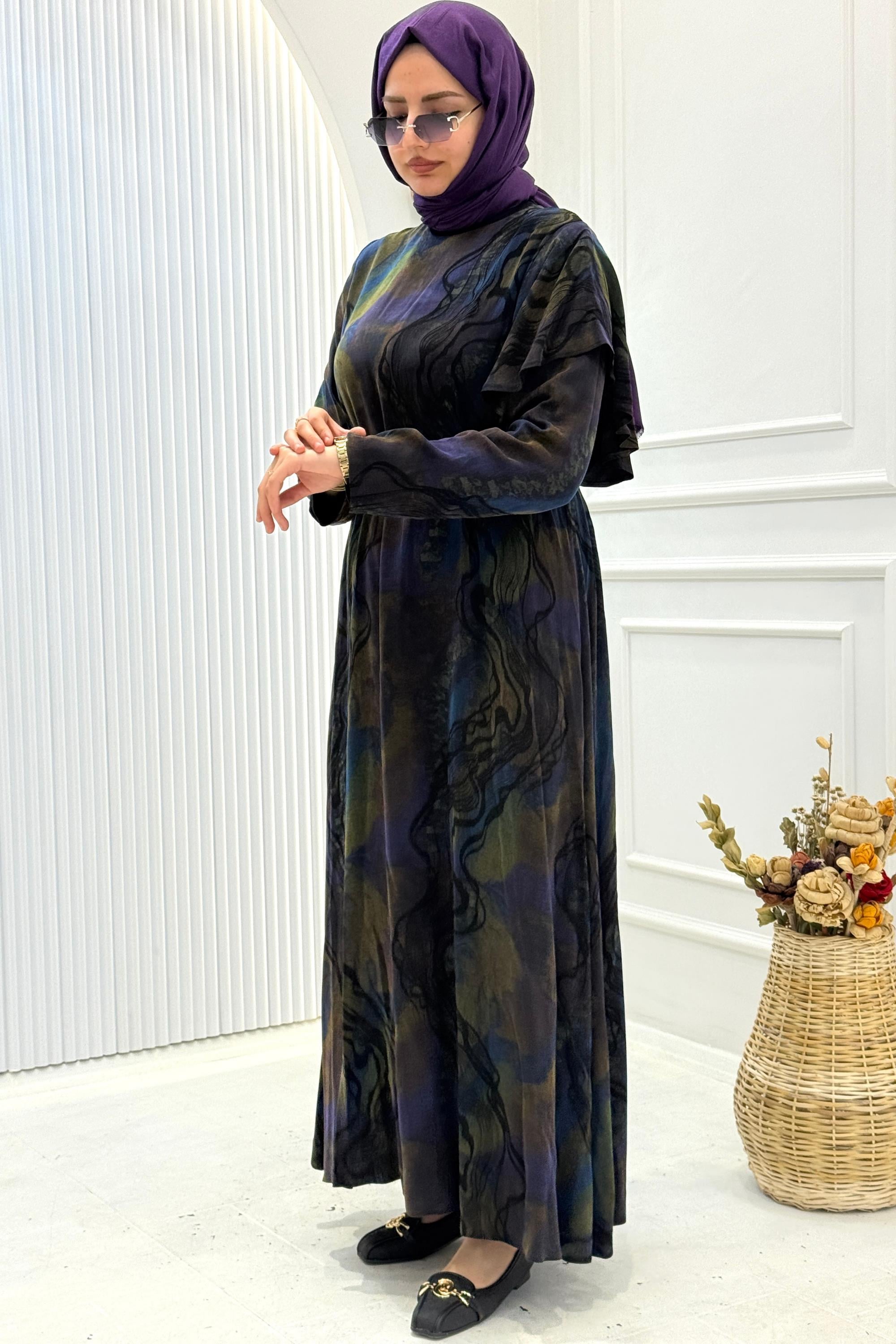 İpek Qupra kumaşın akıcı ve hafif dokusuyla tasarlanan bu uzun tesettür elbise, modern desen geçişleriyle zamansız bir şıklık sunar.