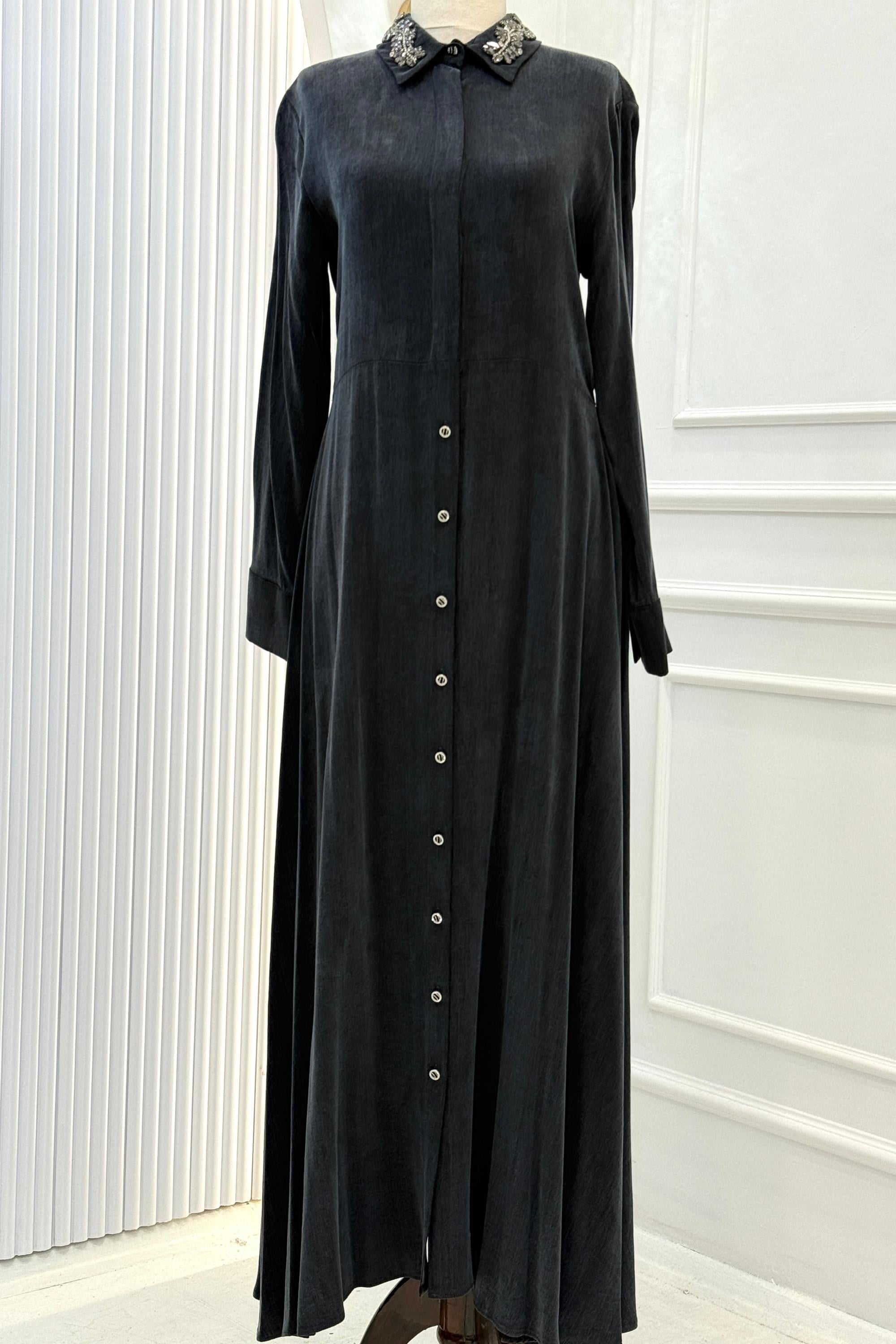 Orhan Store İpek Qupra Taşlı Yaka Detaylı Uzun Elbise Siyah OTW1785