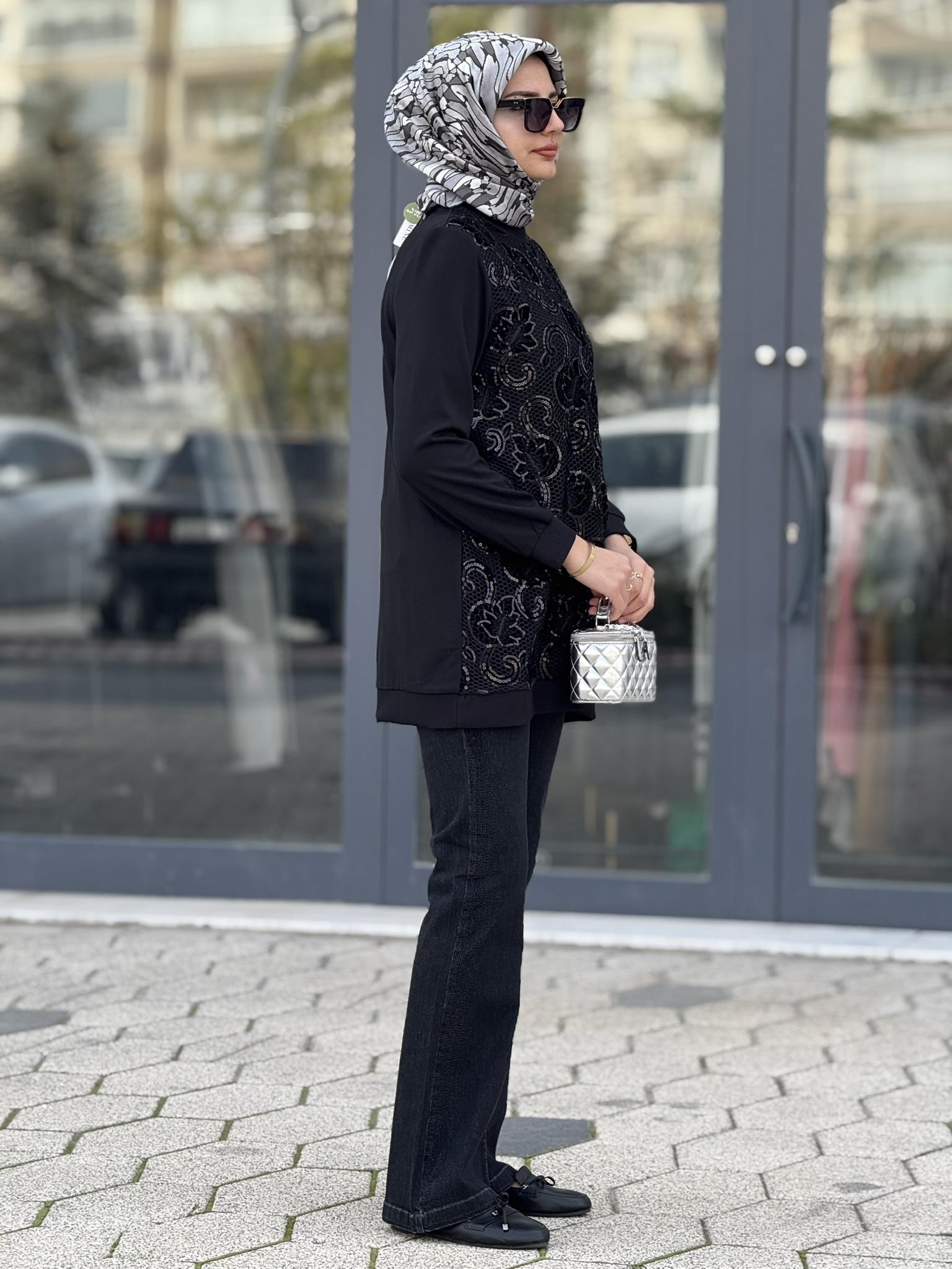 Şık işlemeleriyle dikkat çeken bu tunik, çelik örme kumaşın esnek yapısı ve zarif duruşuyla hem günlük hem de özel kombinlerde rahatlıkla kullanılabilir. Ön panelindeki parlak işlemeler modern bir görünüm sunarken, kolların ve arka kısmın sade oluşu ürüne dengeli bir şıklık kazandırır. Yumuşak dokusu sayesinde gün boyu rahatlık sağlar, kırışma yapmayan yapısıyla pratik kullanıma uygundur.